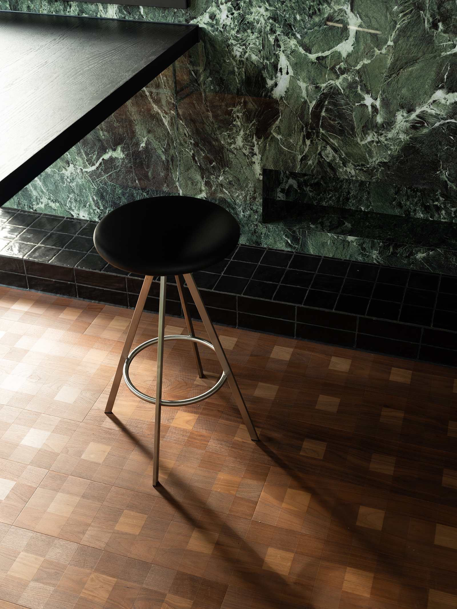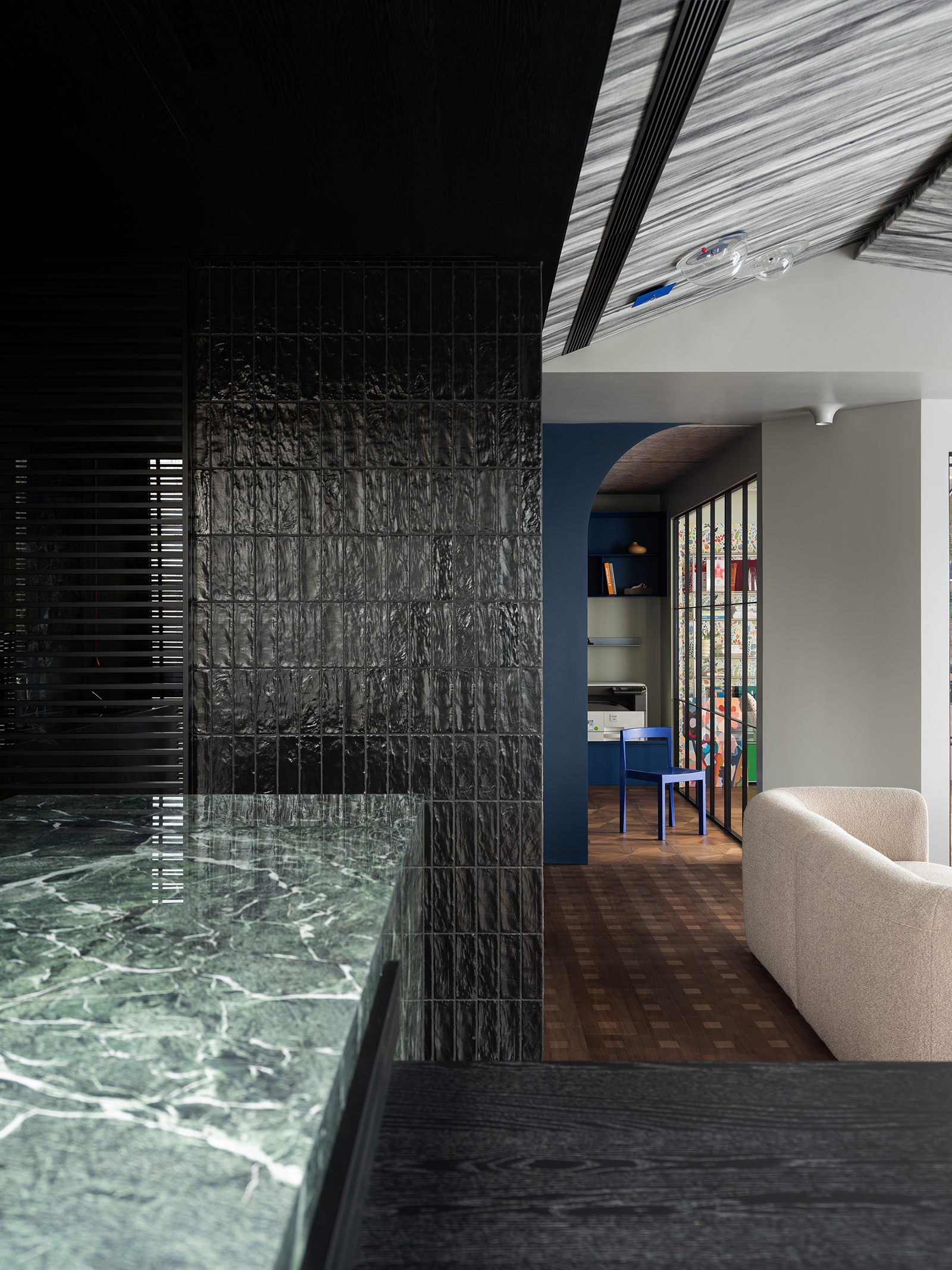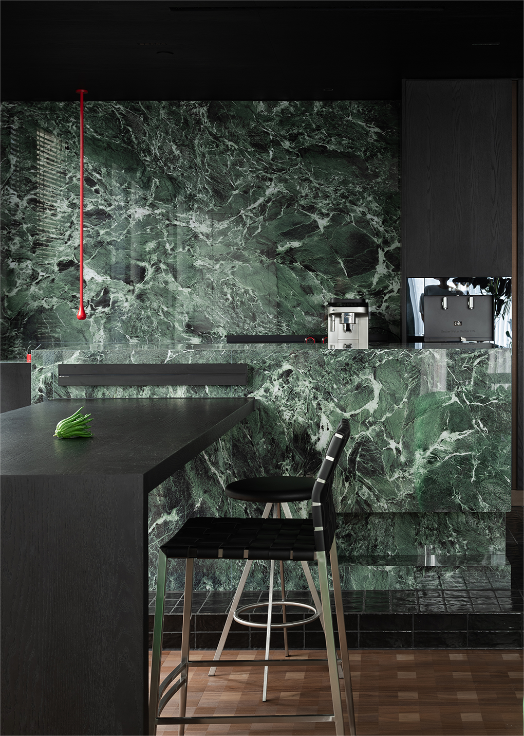茶吧区选用水吧用一款幽山黛绿岩板做台面和背景,红色点缀恰到好处地平衡视觉,带来空间的另一种丰富感。