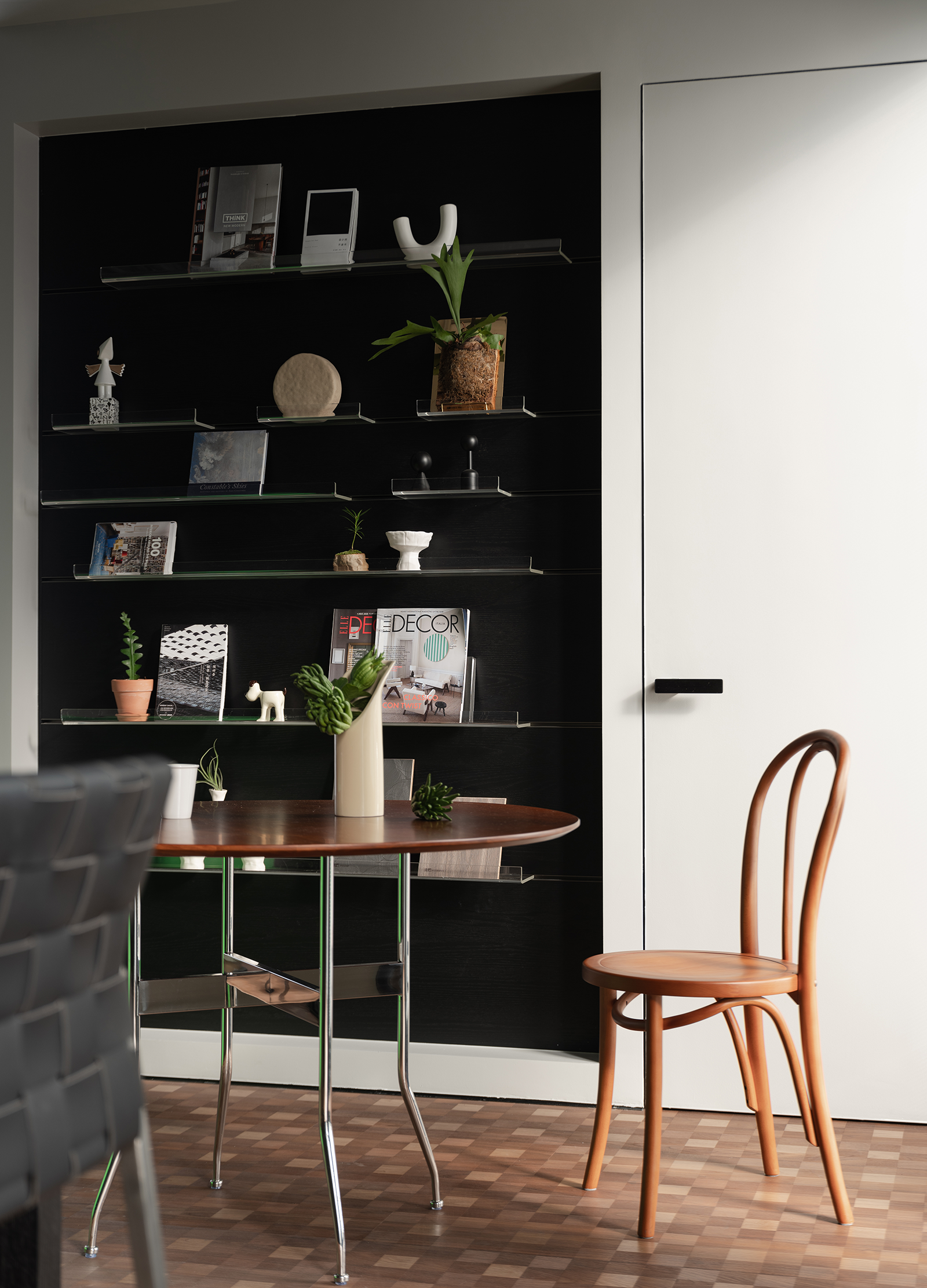 选用小格子棕色地板提升空间的趣味性,透过黑色框纹的玻璃隔断,分离出独立的空间,并将各自的特征和色彩显露和融合。
