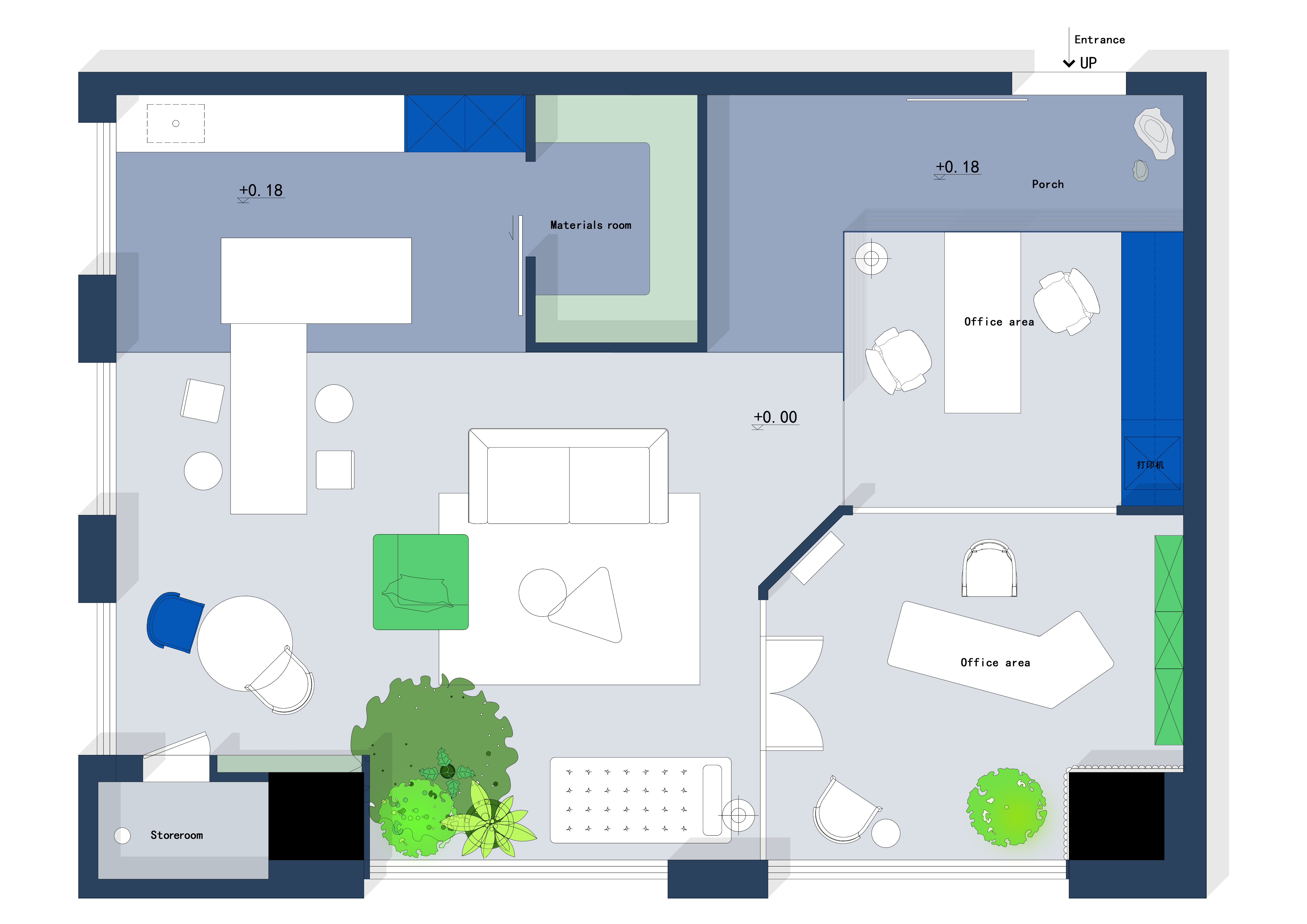 本案是斐蓝设计事务所的办公空间。设计师希望在朝夕相伴的空间中打造一个能够承载个性、安防灵魂的秘密花园,留一方自留地,回归内心。