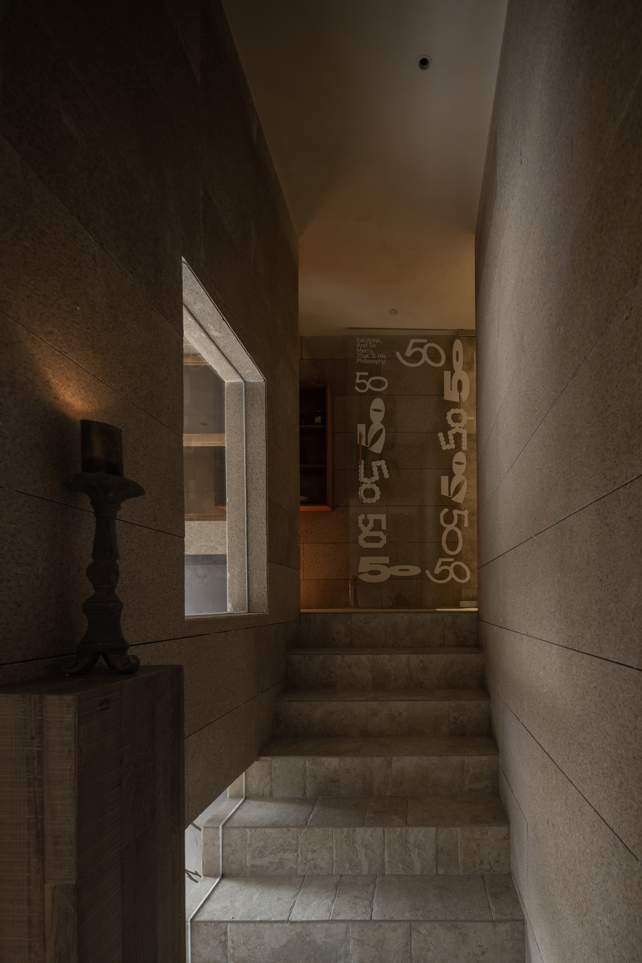 该项目在建筑表现上拥有一个方形外立面,它是我们以另一种方式对石头古城街巷生活一种语汇的再现,将传统与现代巧妙融合,创造出一个独特的餐饮空间。如楼梯间的设计思考,一方面希望延续石头城的街巷和洞穴感,另一方面是希望在有限的4平米的空间里作出更丰富的体验维度。