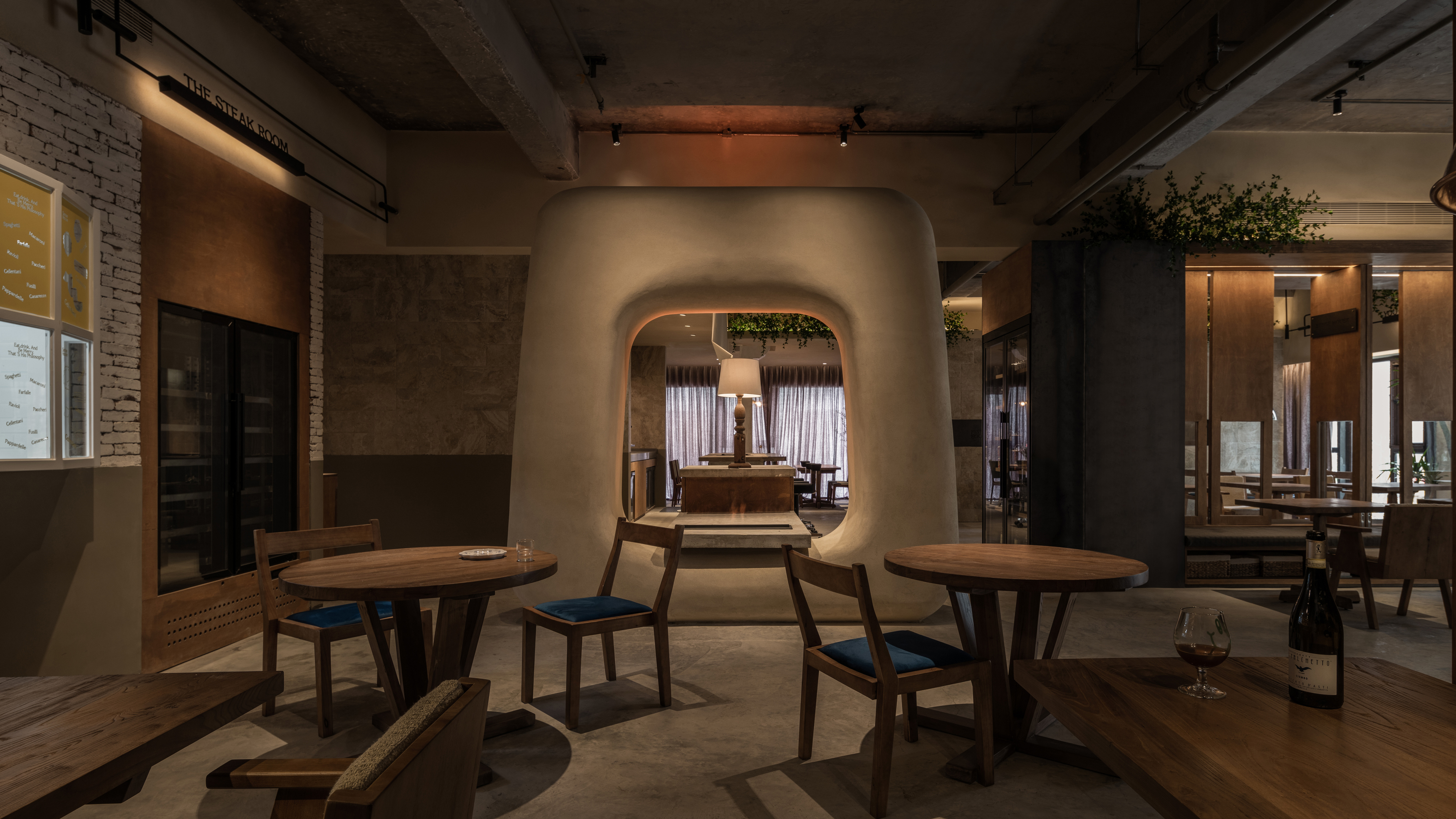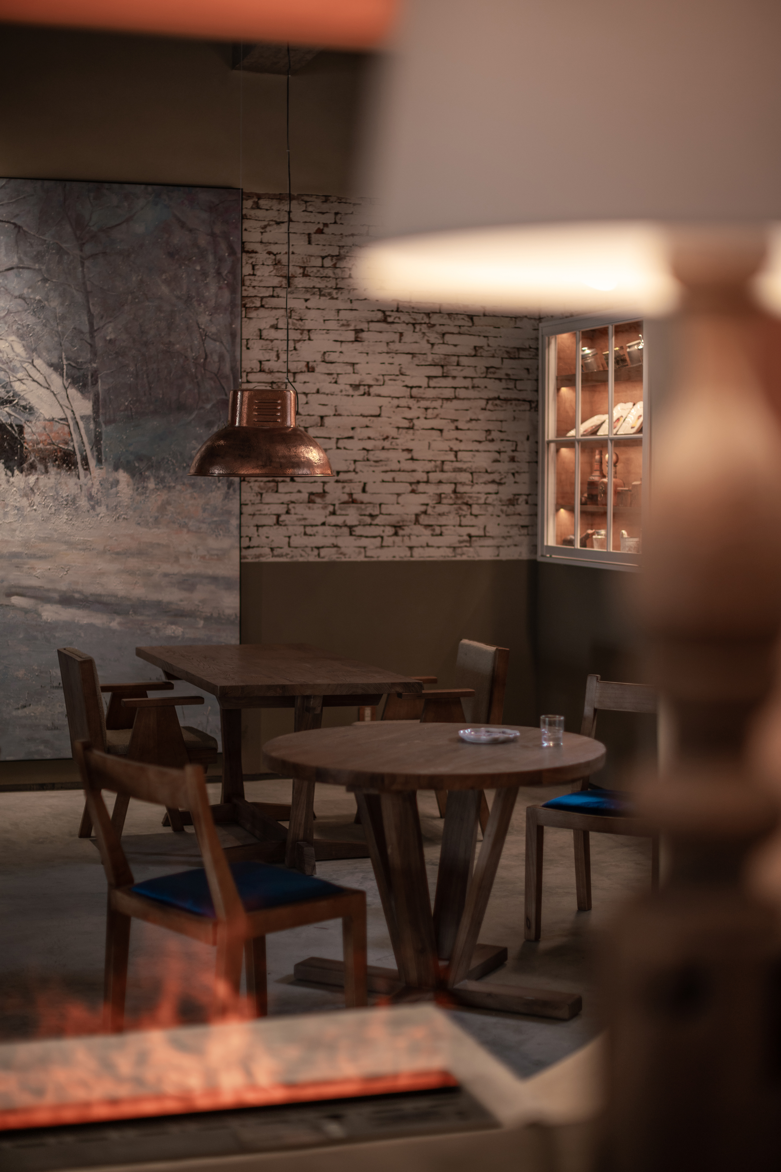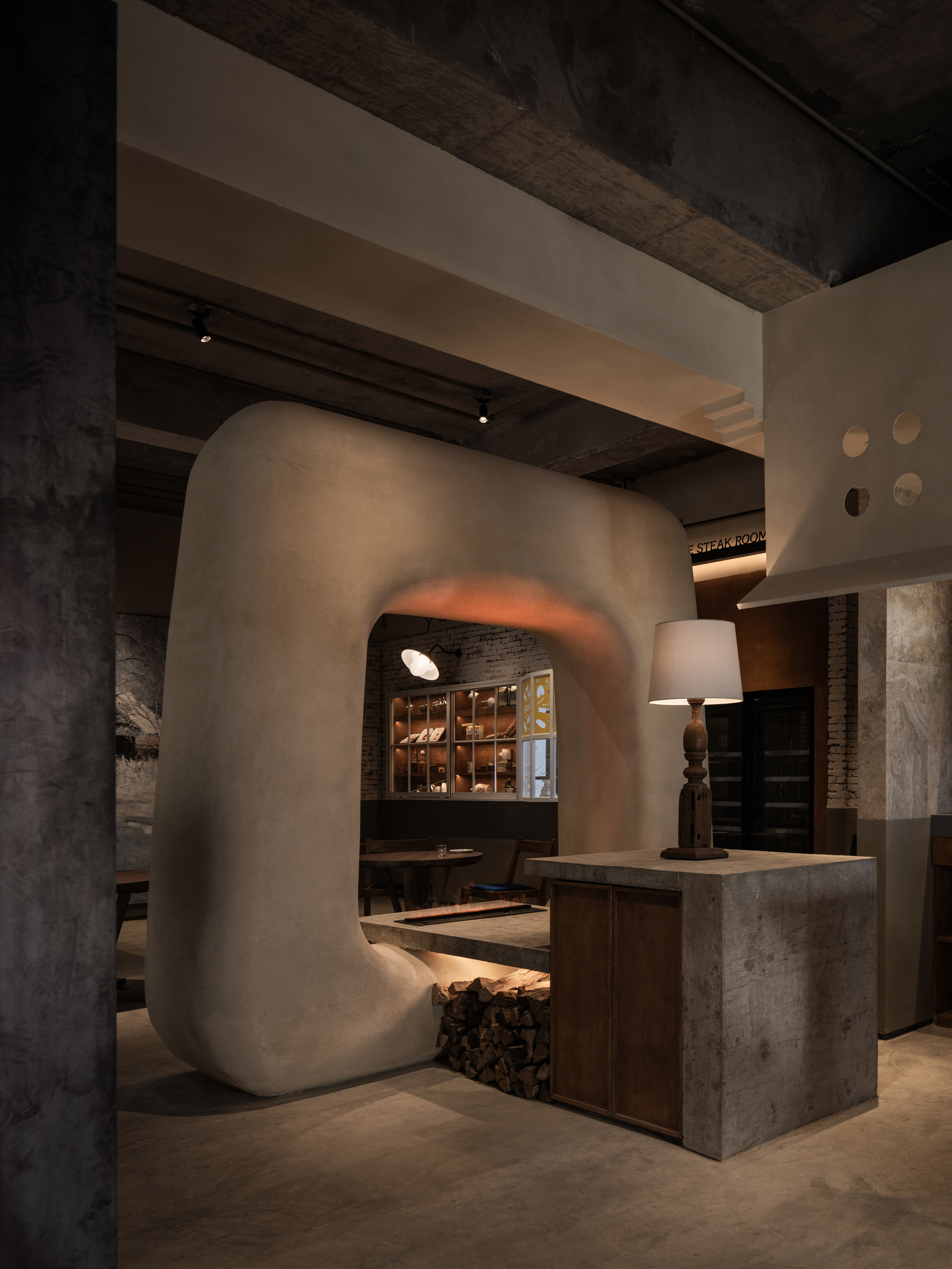 餐吧得益于中庭活动旋板和吧台将左右侧空间前后分隔开,使得四个独立就餐区的设计满足了不同顾客的个性化空间体验需求。半开放式厨房环绕中央炉火的设计,不仅展示了烹饪的艺术,为用餐者提供了生动的视觉焦点,也增强了餐厅的社交氛围,激发了顾客的兴奋感,营造出更加丰富、温暖的整体环境。 -
