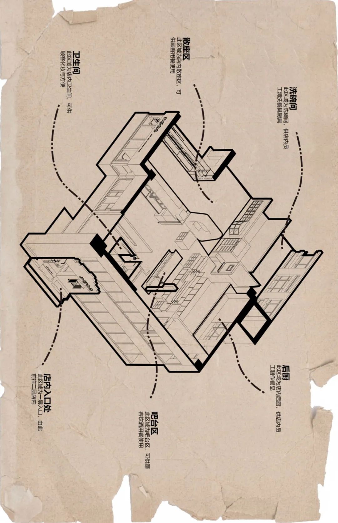餐吧的空间布局采用方形流线作为主要动线,引导顾客的自然流动。空间被划分为吧台和四个落座区,注重每个小空间的适宜尺度,以确保舒适性和私密性。