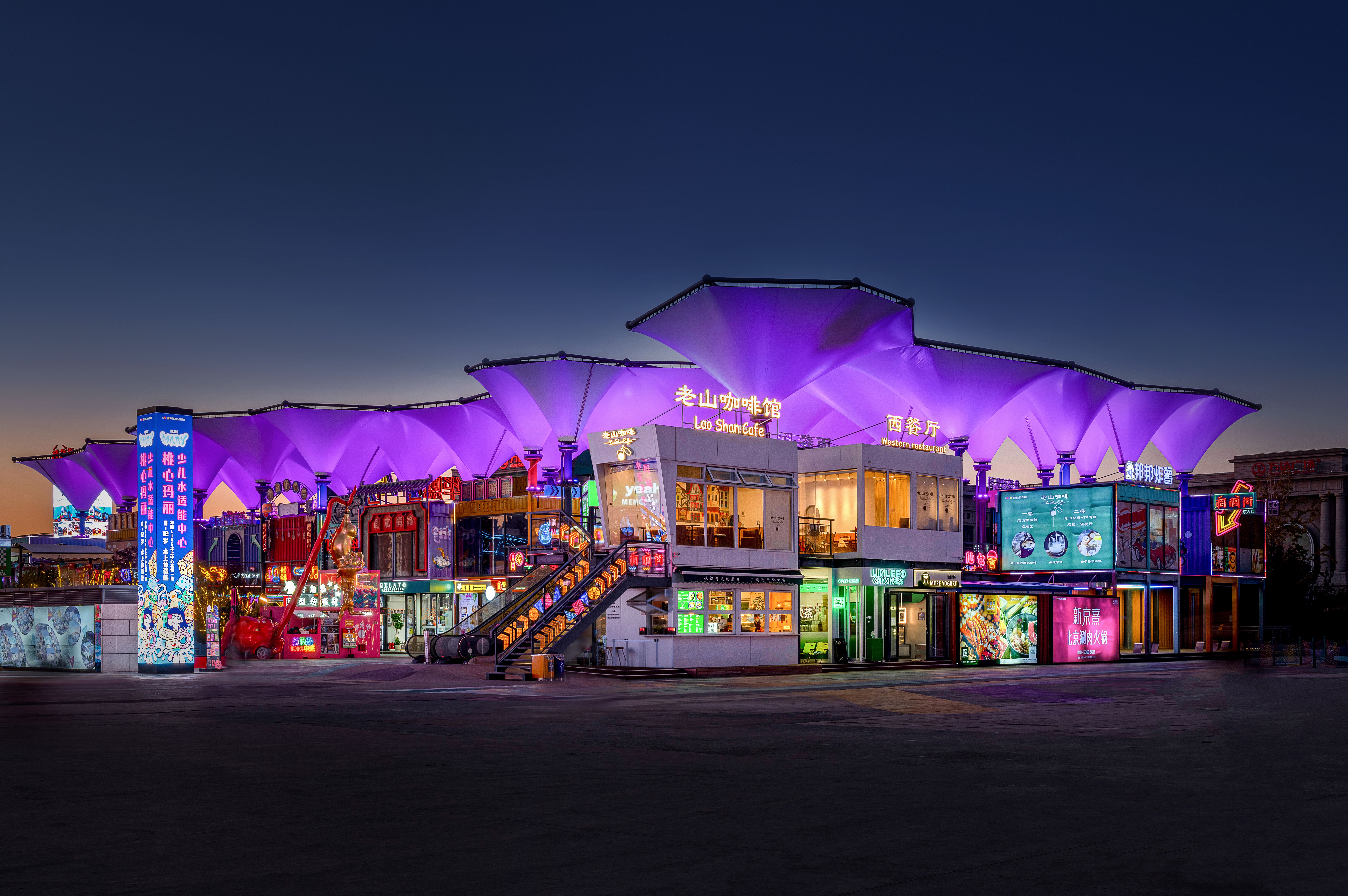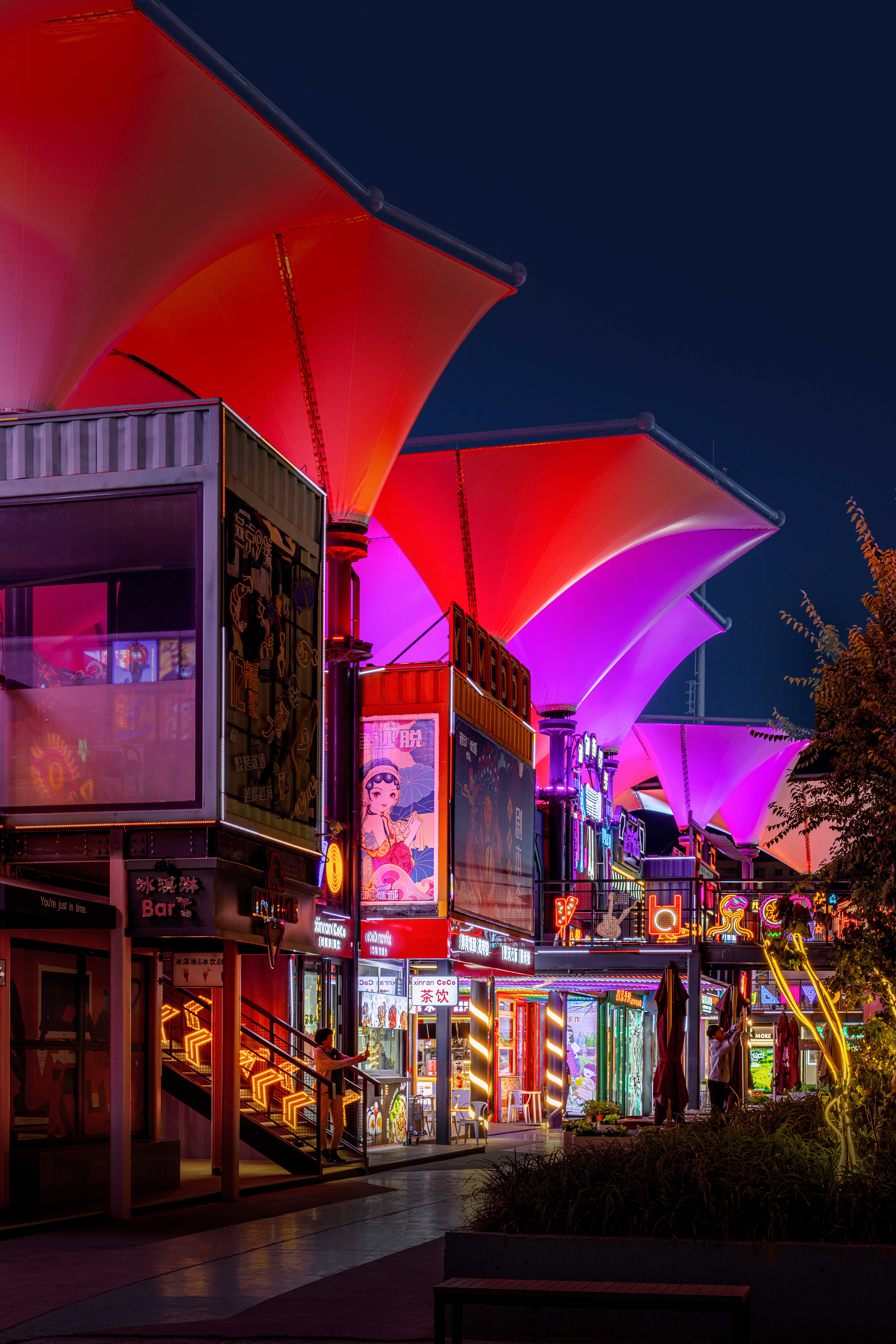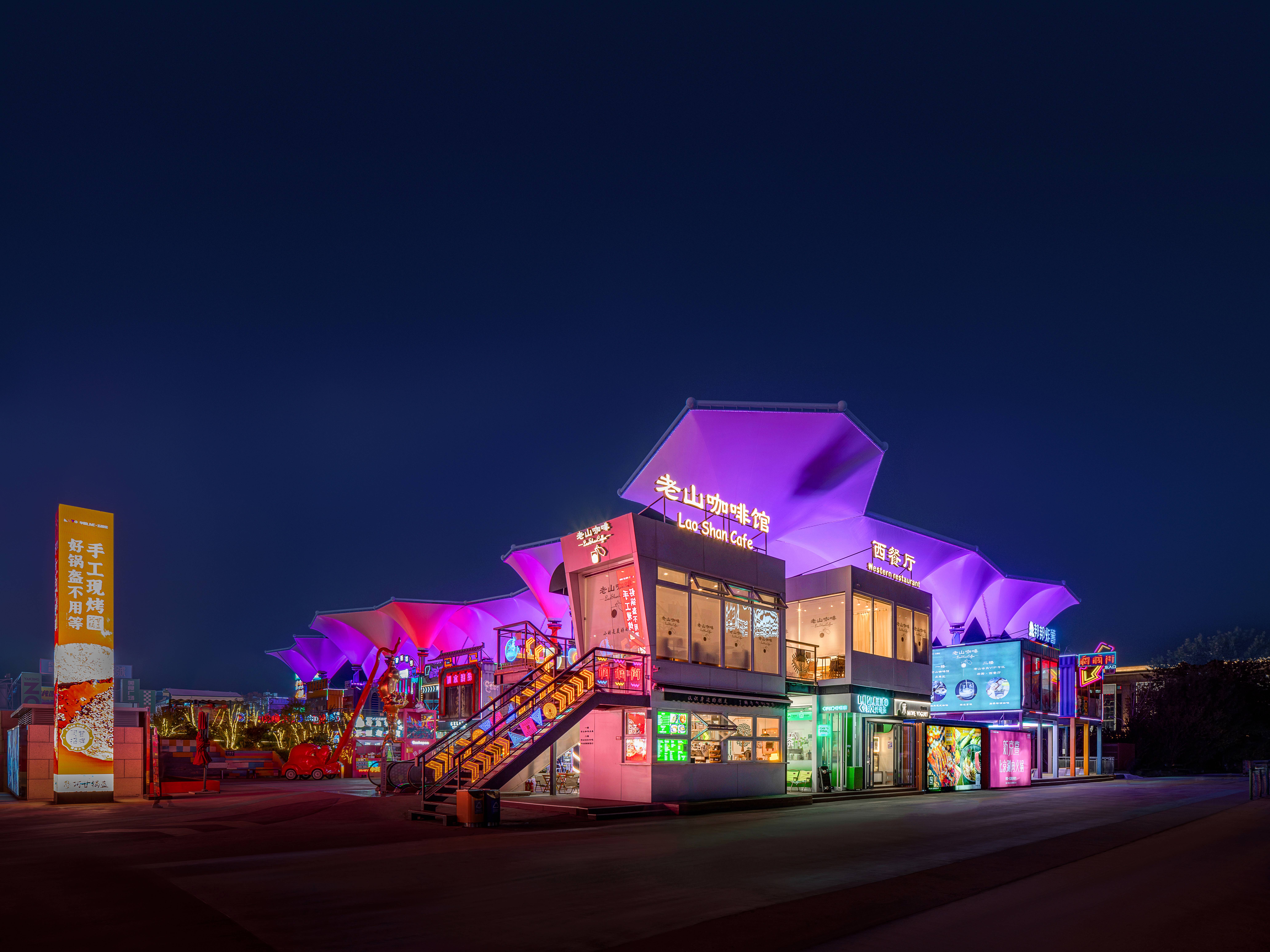 中心广场的核心是一座开放式钢结构框架,既作为大型活动的主会场,又是冬季趣味冰场的主要场地,通过对钢结构整体轮廓的亮化设计手法使其在夜晚呈现出科幻效果。动态水景喷泉变幻出各种色彩,好似一场水与光的盛宴。周边店铺和摊位如散落的岛屿,烘托出开放而包容的商业氛围。巨大的张拉膜结构好似漂浮在半空中的莲花,渲染出调调街夜晚的奇幻色彩。错落有致的集装箱建筑和转角处的楼梯增添了节点处的景观,创造出多维环绕、富于吸引力的都市场所感。咖啡馆、餐厅、各类精品小店鳞次栉比,复古与现代交织,传统与创新并存。沉浸在多感官体验的都市画卷中,每一个角落都充满了发现的惊喜。夜幕降临,酒吧街迎来了最璀璨的时刻。建筑设计以复古风格为主,红色灯笼、古色古香的屋顶和满墙的霓虹灯广告牌,无不散发浓厚的怀旧氛围。巧妙的布局营造人流动线和视觉焦点,人们不断被新的视觉元素吸引,保持着探索的兴趣。