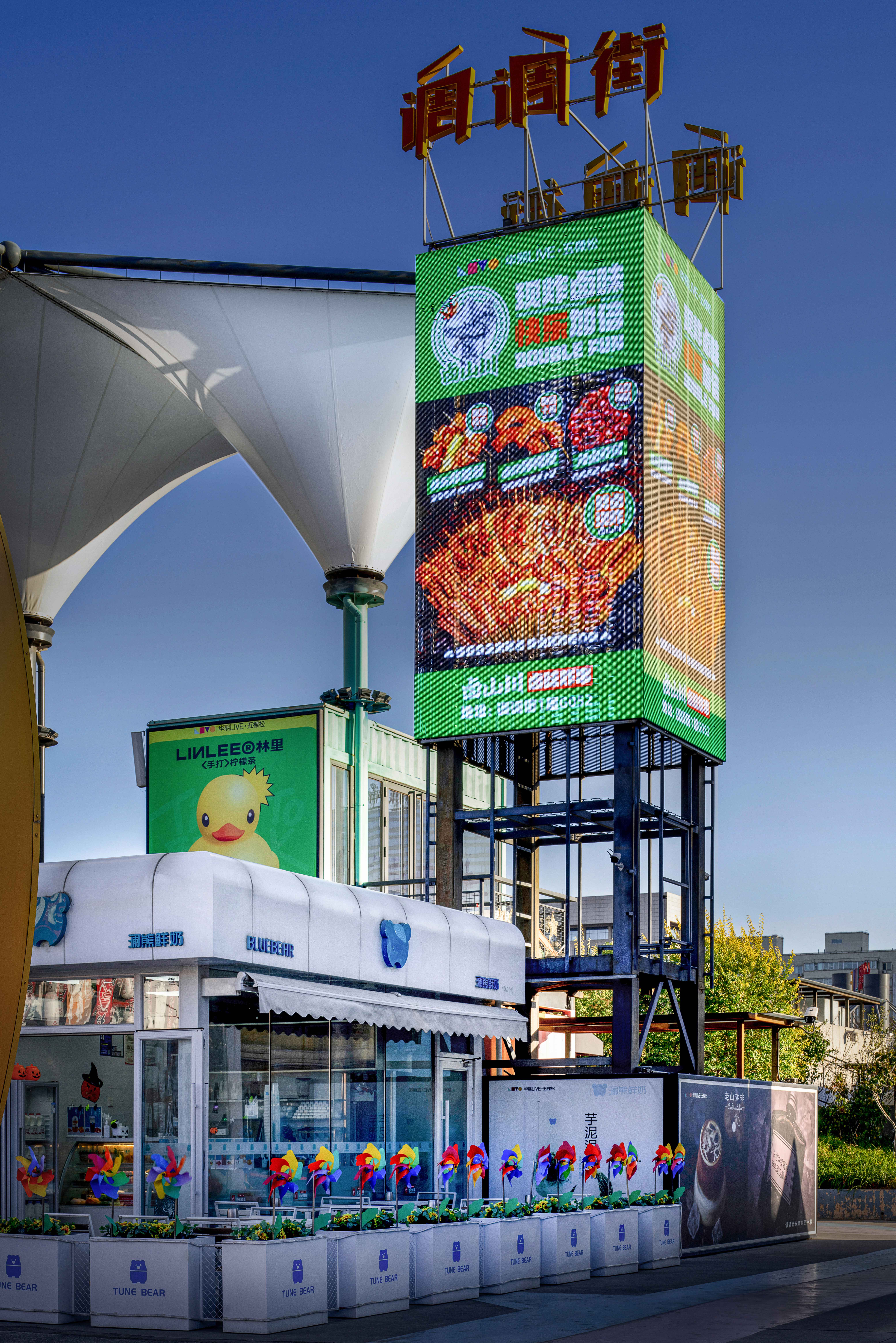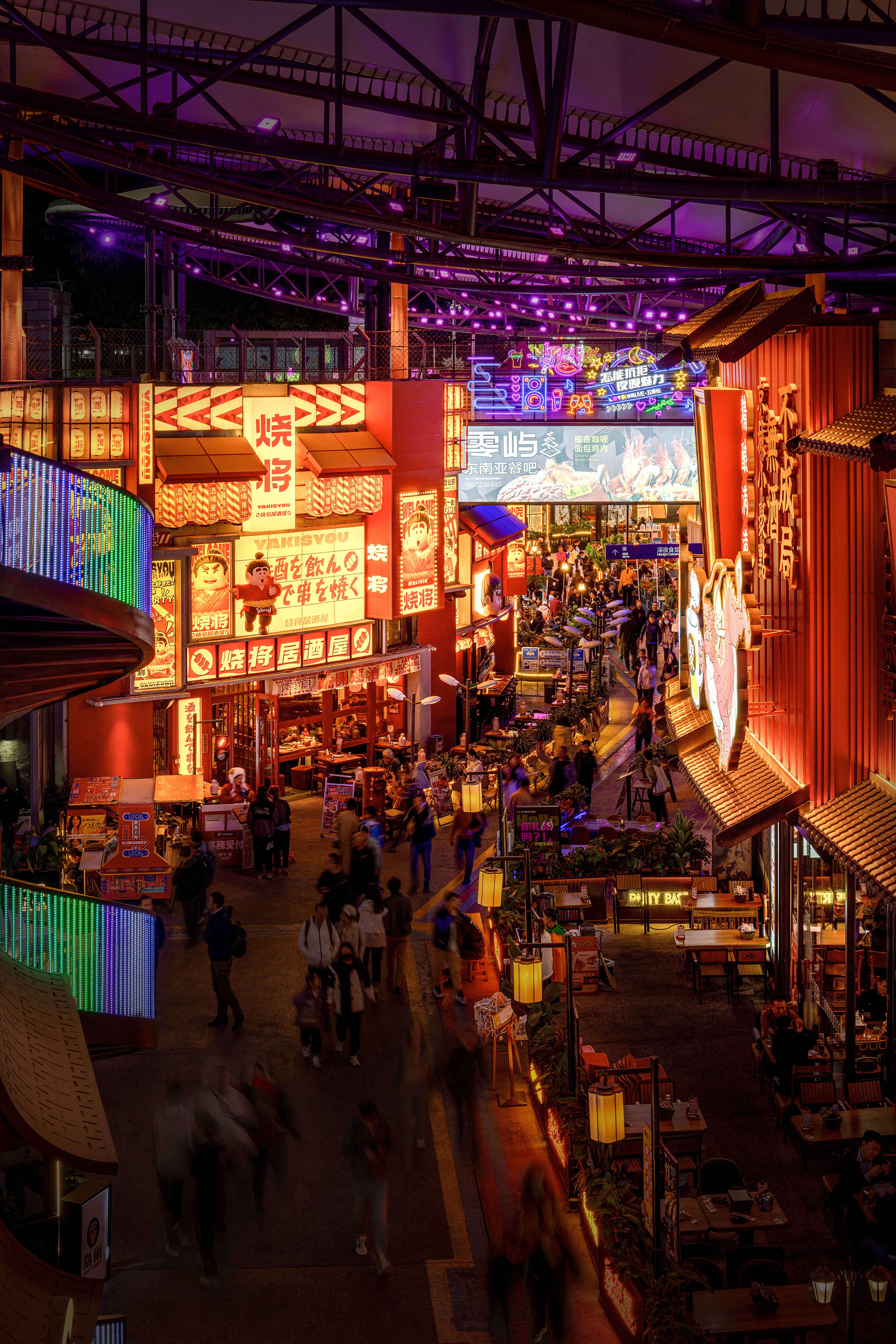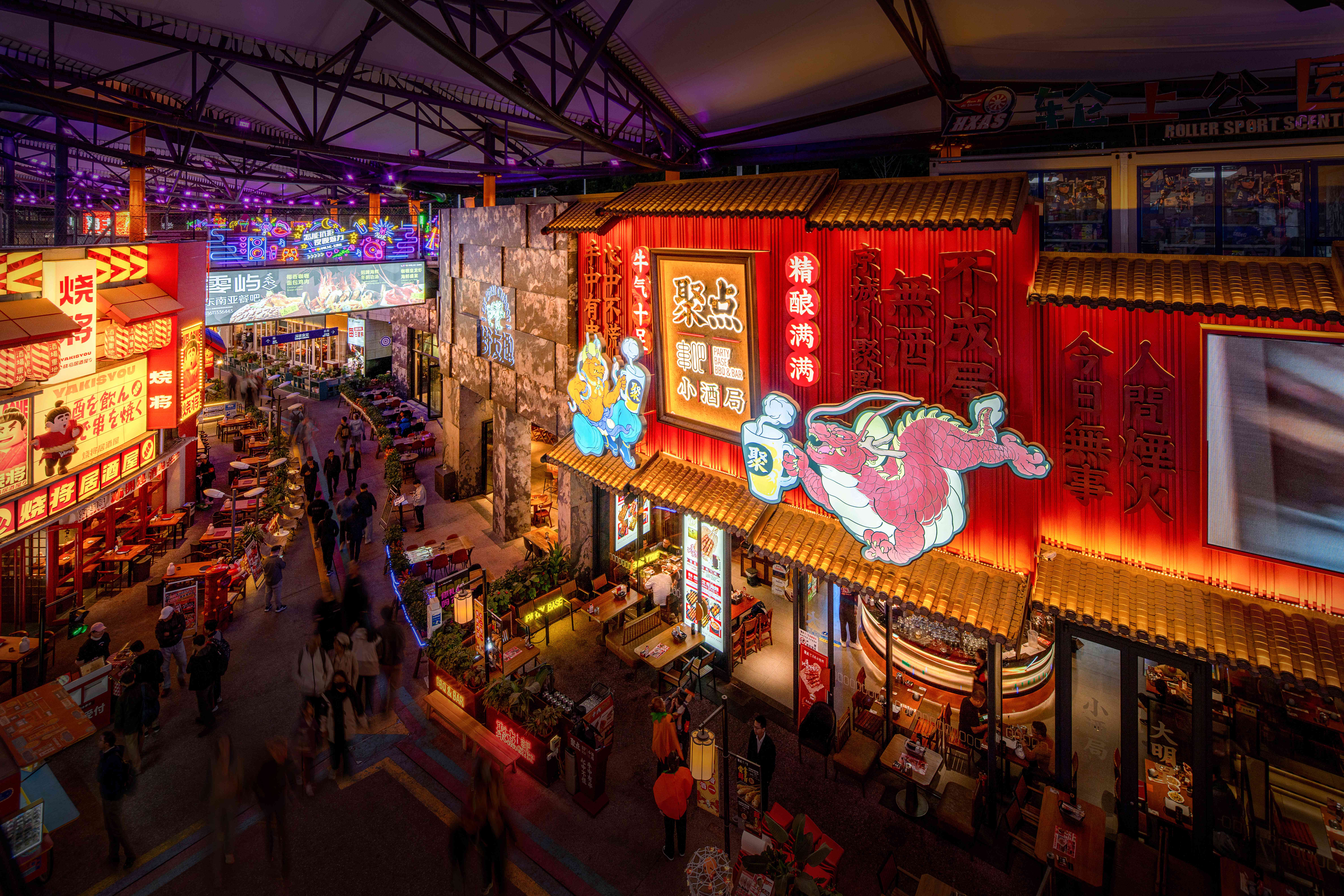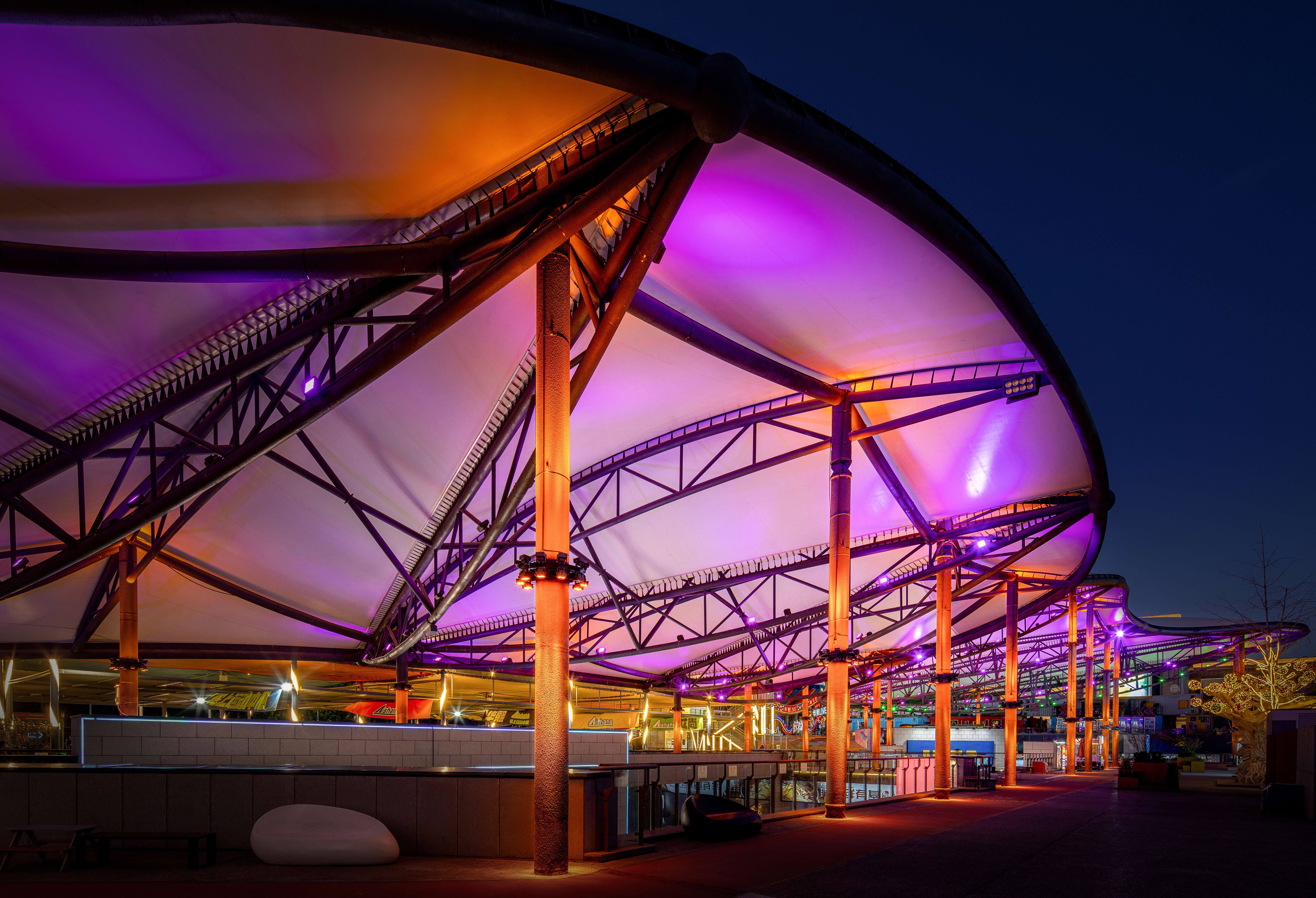 中心广场的核心是一座开放式钢结构框架,既作为大型活动的主会场,又是冬季趣味冰场的主要场地,通过对钢结构整体轮廓的亮化设计手法使其在夜晚呈现出科幻效果。动态水景喷泉变幻出各种色彩,好似一场水与光的盛宴。周边店铺和摊位如散落的岛屿,烘托出开放而包容的商业氛围。巨大的张拉膜结构好似漂浮在半空中的莲花,渲染出调调街夜晚的奇幻色彩。错落有致的集装箱建筑和转角处的楼梯增添了节点处的景观,创造出多维环绕、富于吸引力的都市场所感。咖啡馆、餐厅、各类精品小店鳞次栉比,复古与现代交织,传统与创新并存。沉浸在多感官体验的都市画卷中,每一个角落都充满了发现的惊喜。夜幕降临,酒吧街迎来了最璀璨的时刻。建筑设计以复古风格为主,红色灯笼、古色古香的屋顶和满墙的霓虹灯广告牌,无不散发浓厚的怀旧氛围。巧妙的布局营造人流动线和视觉焦点,人们不断被新的视觉元素吸引,保持着探索的兴趣。