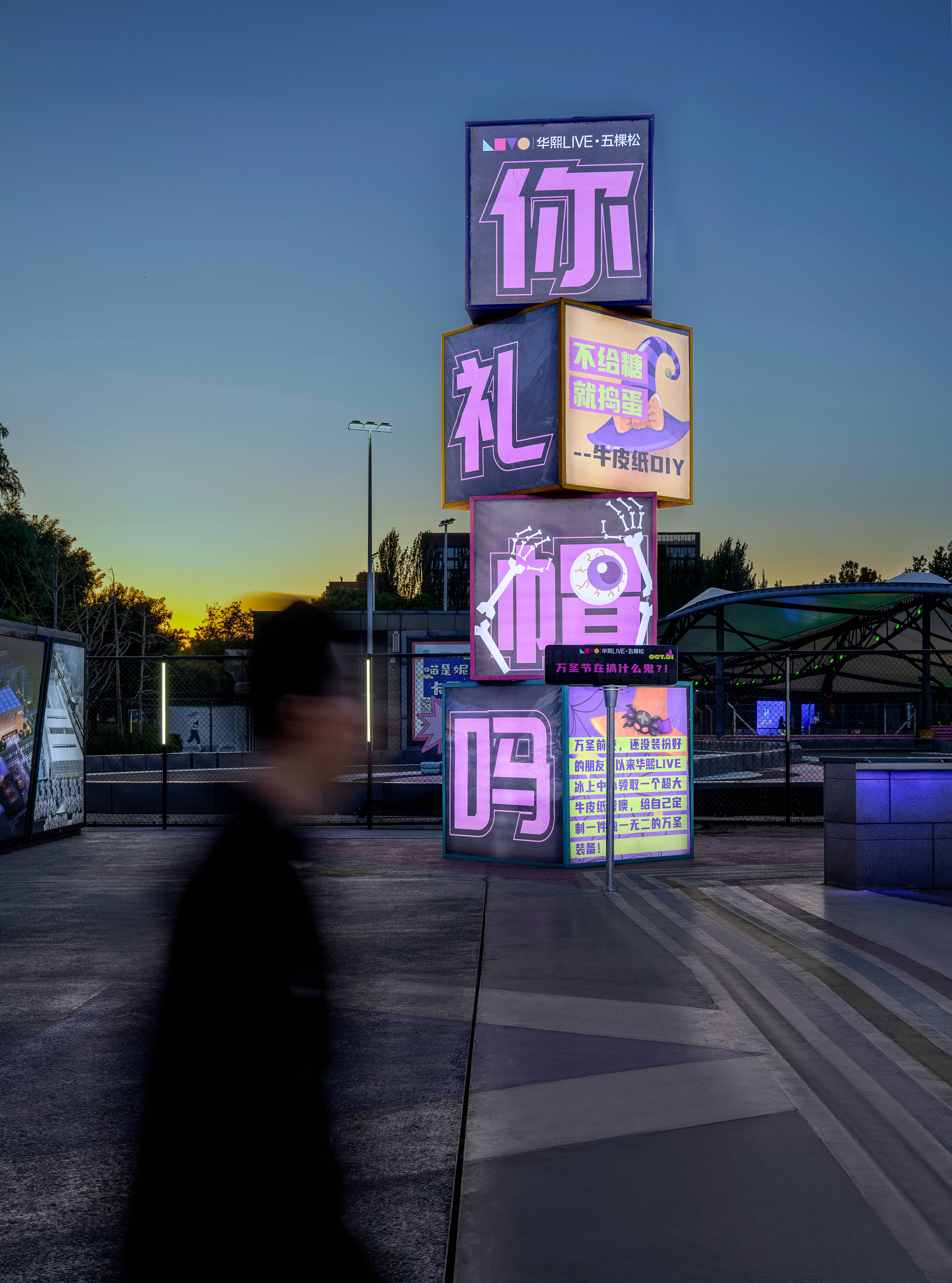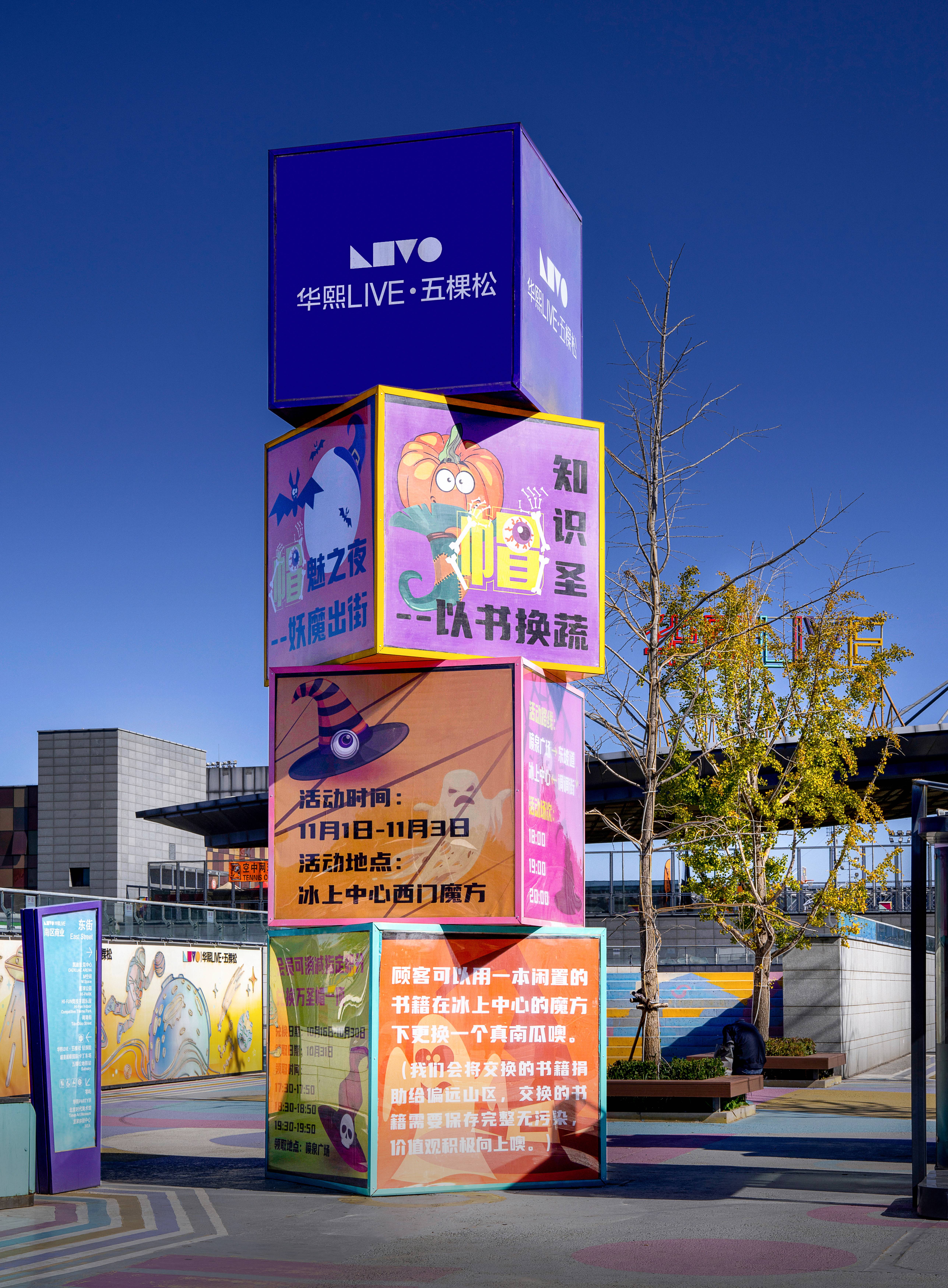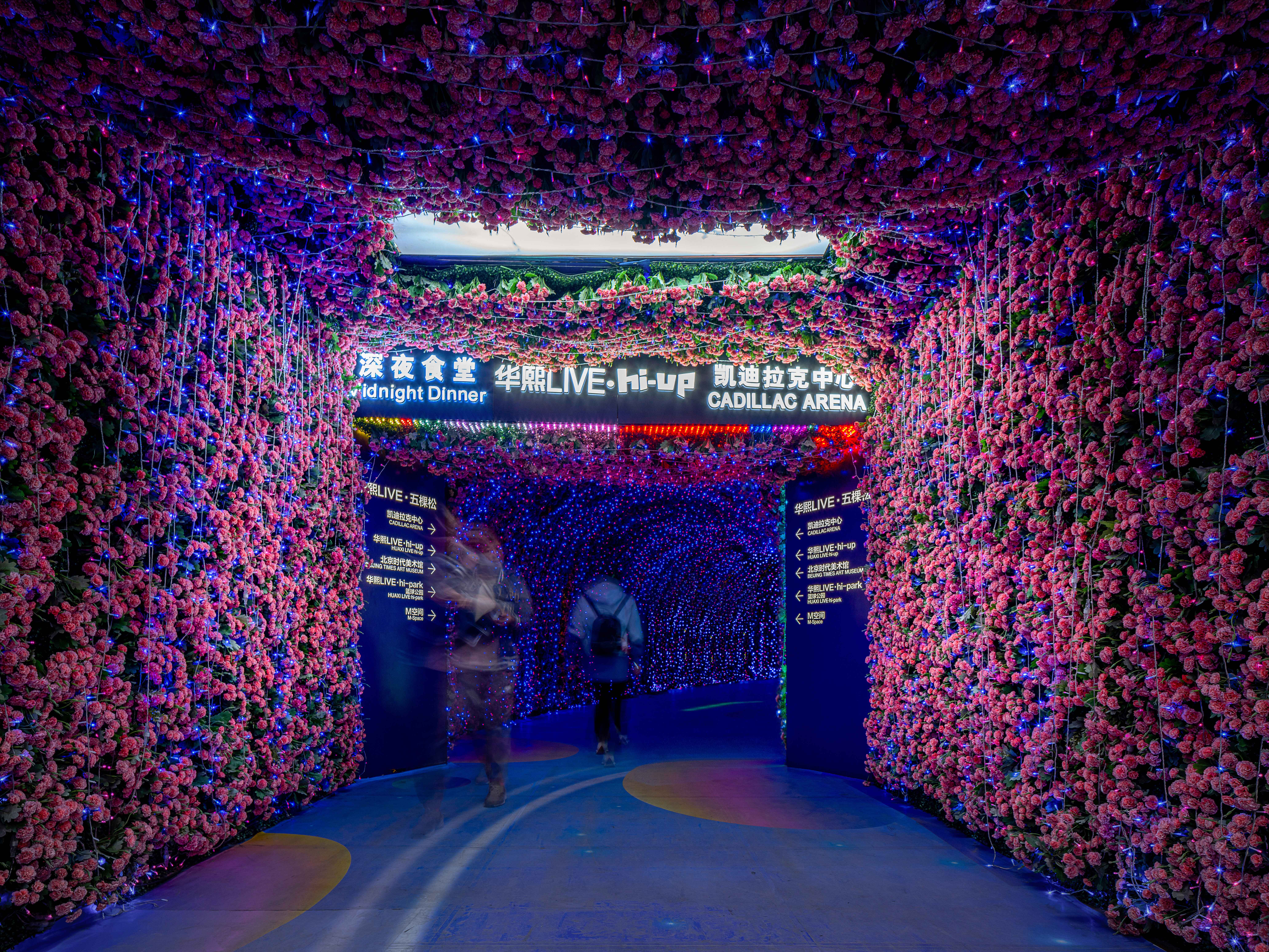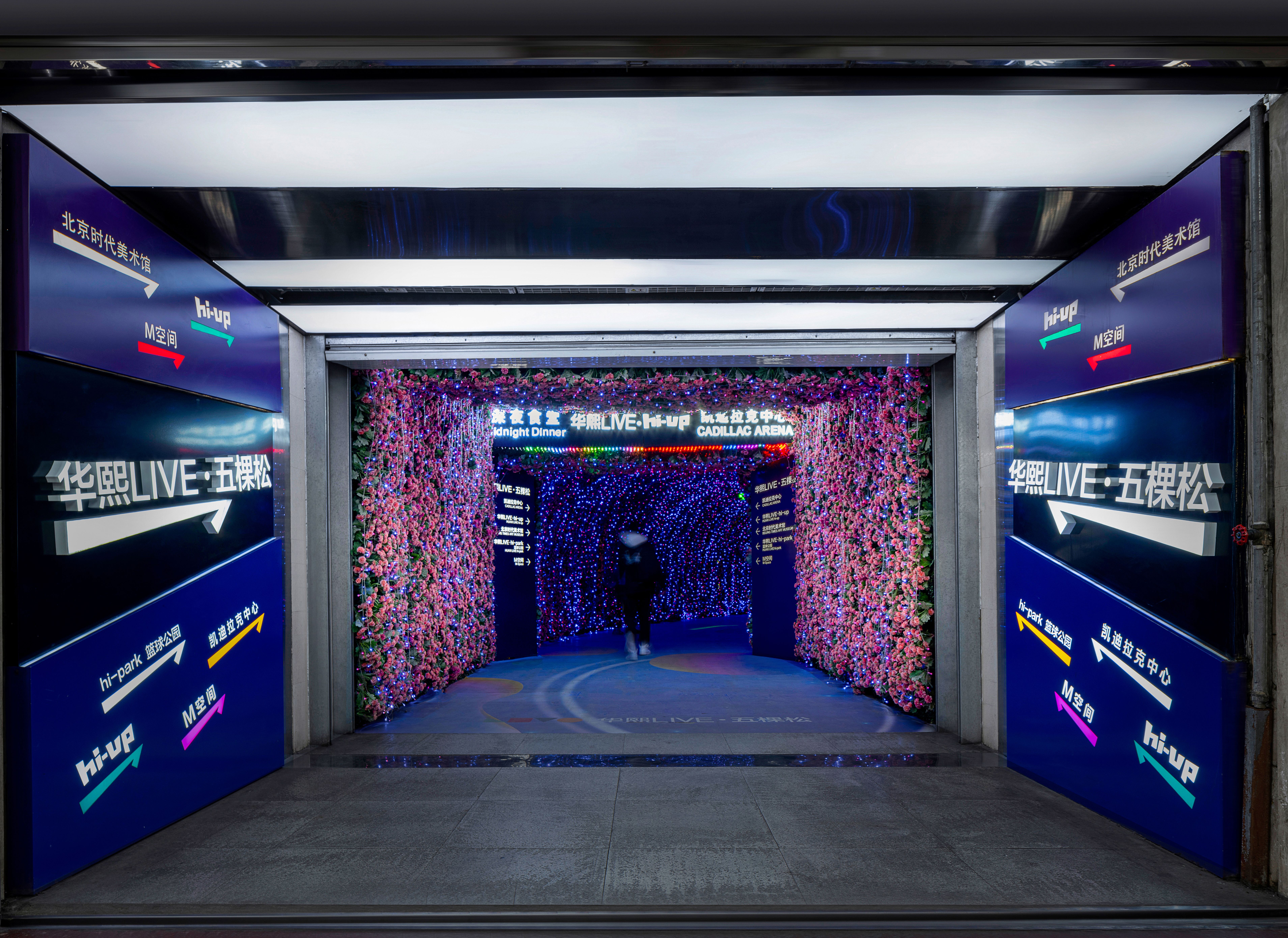 穿越这条地铁连廊,恍若踏入梦幻花海。连廊顶壁与两侧布满的无数花朵,与酷炫的灯光相互交织,仿佛时空交错瞬间跨入梦幻奇境一般。在连接现实与幻想的连廊中,日常通勤变成了一次心灵的洗礼。北侧入口的巨大张拉膜结构在夜色中被彩色灯光映照得如梦似幻,创造出充满未来感的视觉体验。醒目而炫酷的“华熙LIVE·五棵松”品牌标识牌通过光影设计和结构布局与现场的氛围亮化彼此衬托,共同营造出商业之美,进一步提升了访客对这个潮流商业品牌的认知。南侧入口矗立着由立方体堆叠而成的导视塔,立体造型赋予标识牌雕塑般的美感。塔上的每一面传递出不同信息,明亮色彩和趣味文字增强了信息传达的有效性和辨识度。