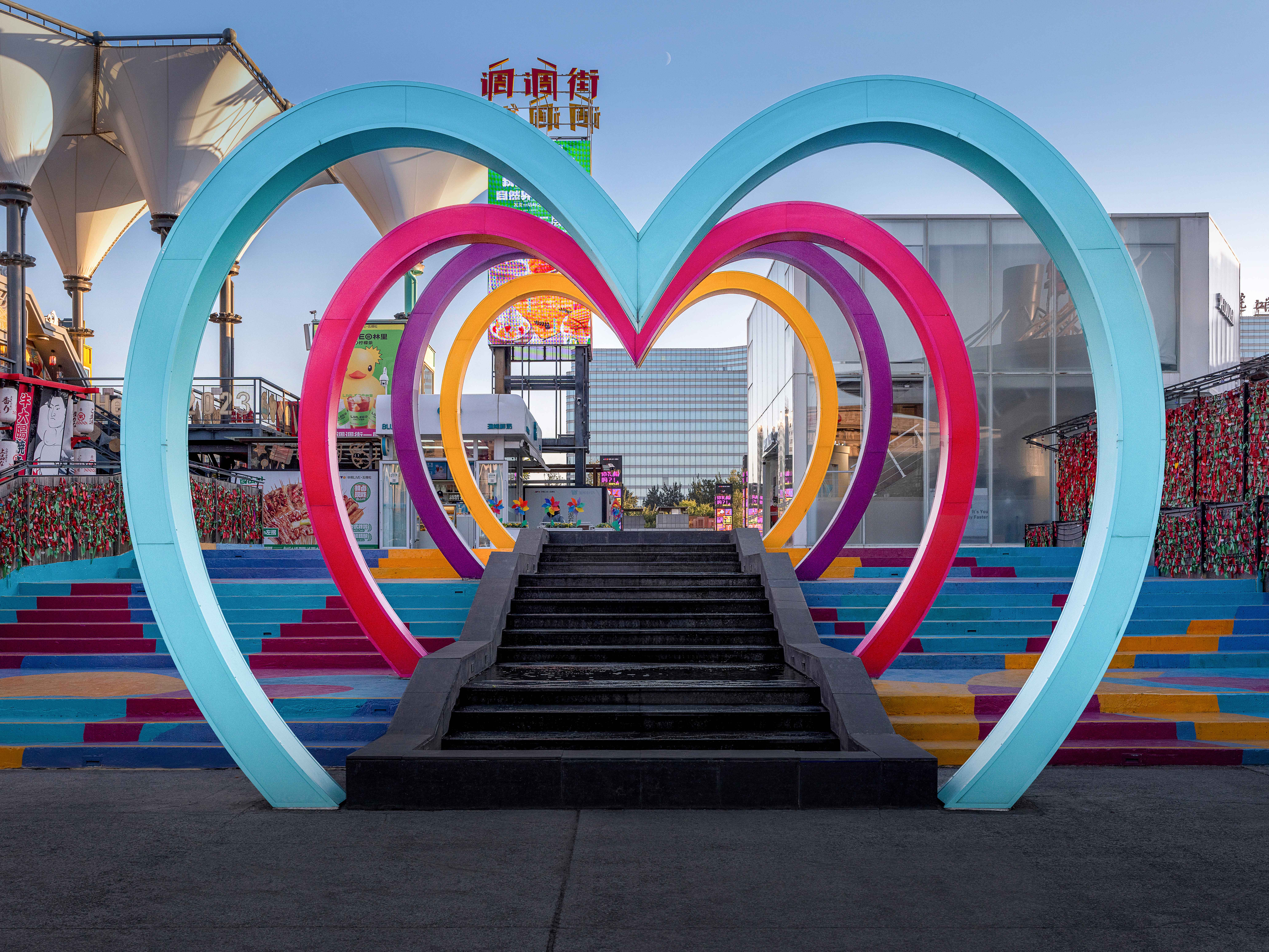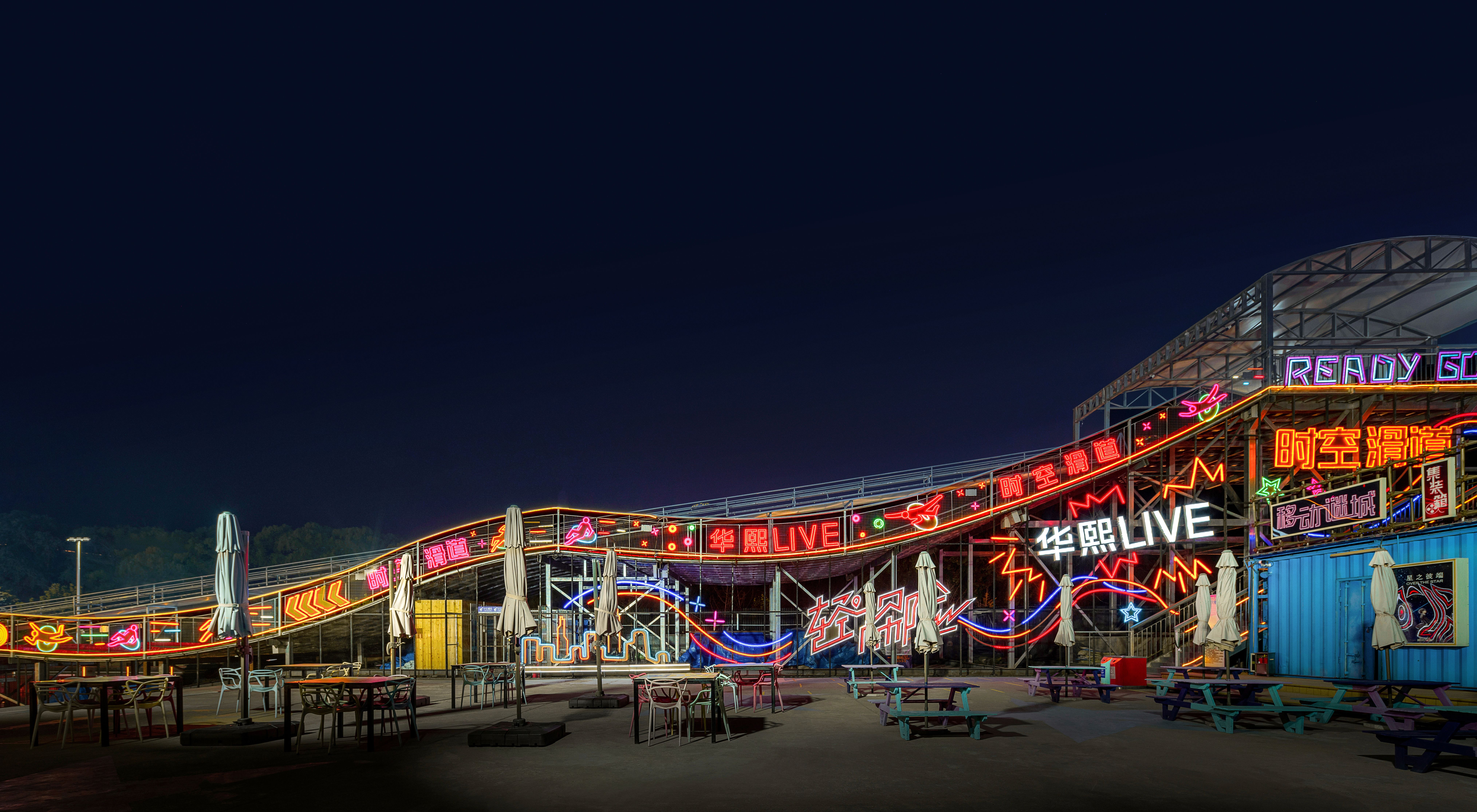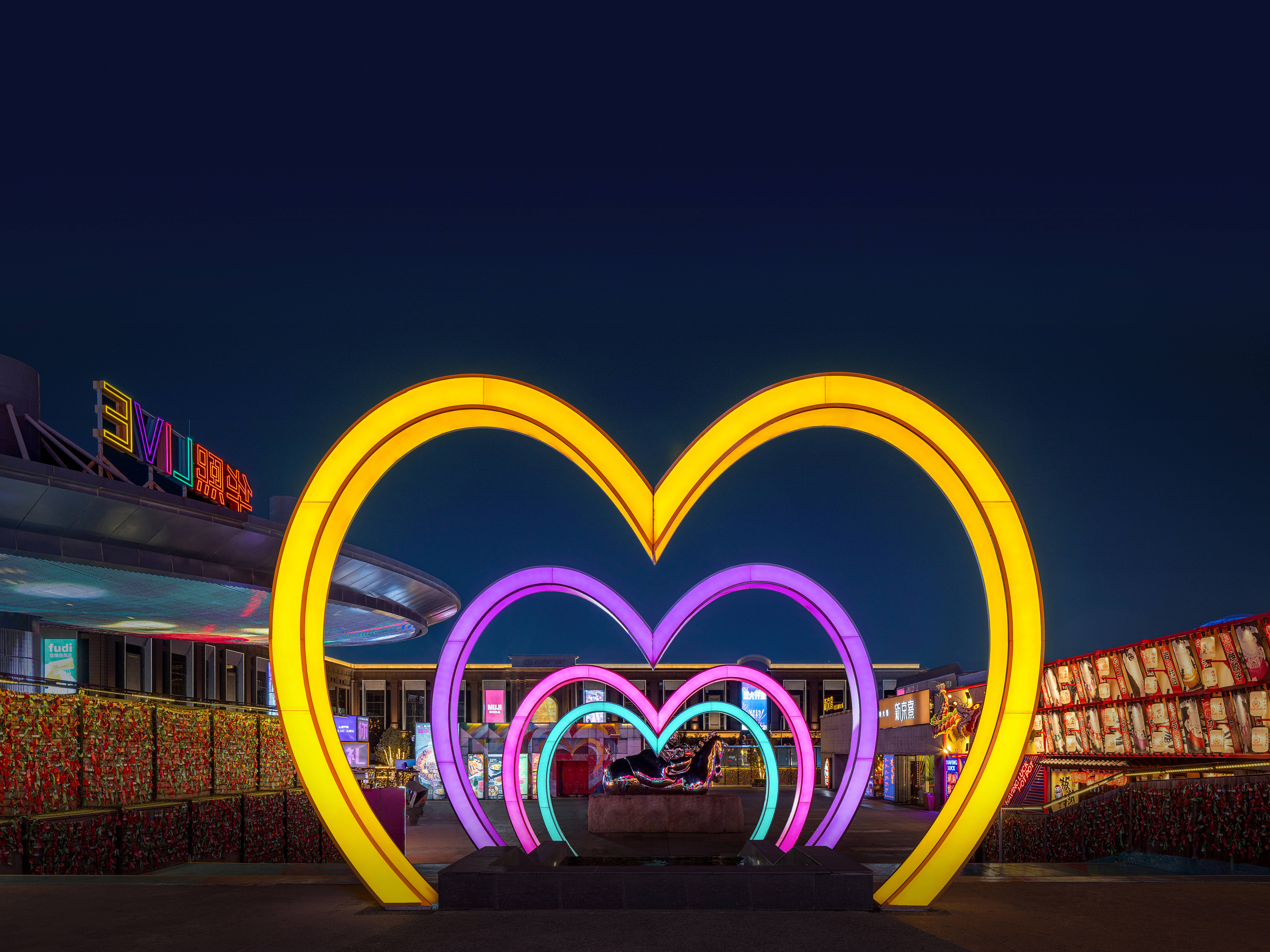 从传统中式元素到现代艺术表达,每一个招牌都像独立的艺术品。精心绘制的图案和文字,在传递商业信息的同时也表达文化与情感。霓虹灯交织成五彩斑斓的光幕,人们或徜徉或静坐,尽享美食美酒与氛围场景的双重盛宴。爱情广场赋予了商业空间情感与温度。温暖的光晕柔和洒下,人们置身光影编织的爱情隧道。人性化的装置场景打造爱与连接的情感汇聚点,层叠交织出浓浓的浪漫氛围。集趣味与挑战于一体的探险乐园邀请着人们感受速度与激情的双重快感。轻探险·时空滑道以动静结合、彩色灯光的对比,为年轻人创造了释放能量和挑战自我的场所。霓虹灯带勾勒出滑道流畅的结构曲线,仿佛时光隧道引领人们进入一个充满未知与探索的世界。从多彩的主题街区到炫酷的数字化互动体验,多维度的品牌视觉记忆不断回响在消费者心中。华熙LIVE·五棵松以极致姿态再次闪耀京西,成为活力时尚的聚集地和夜生活的体验胜地。