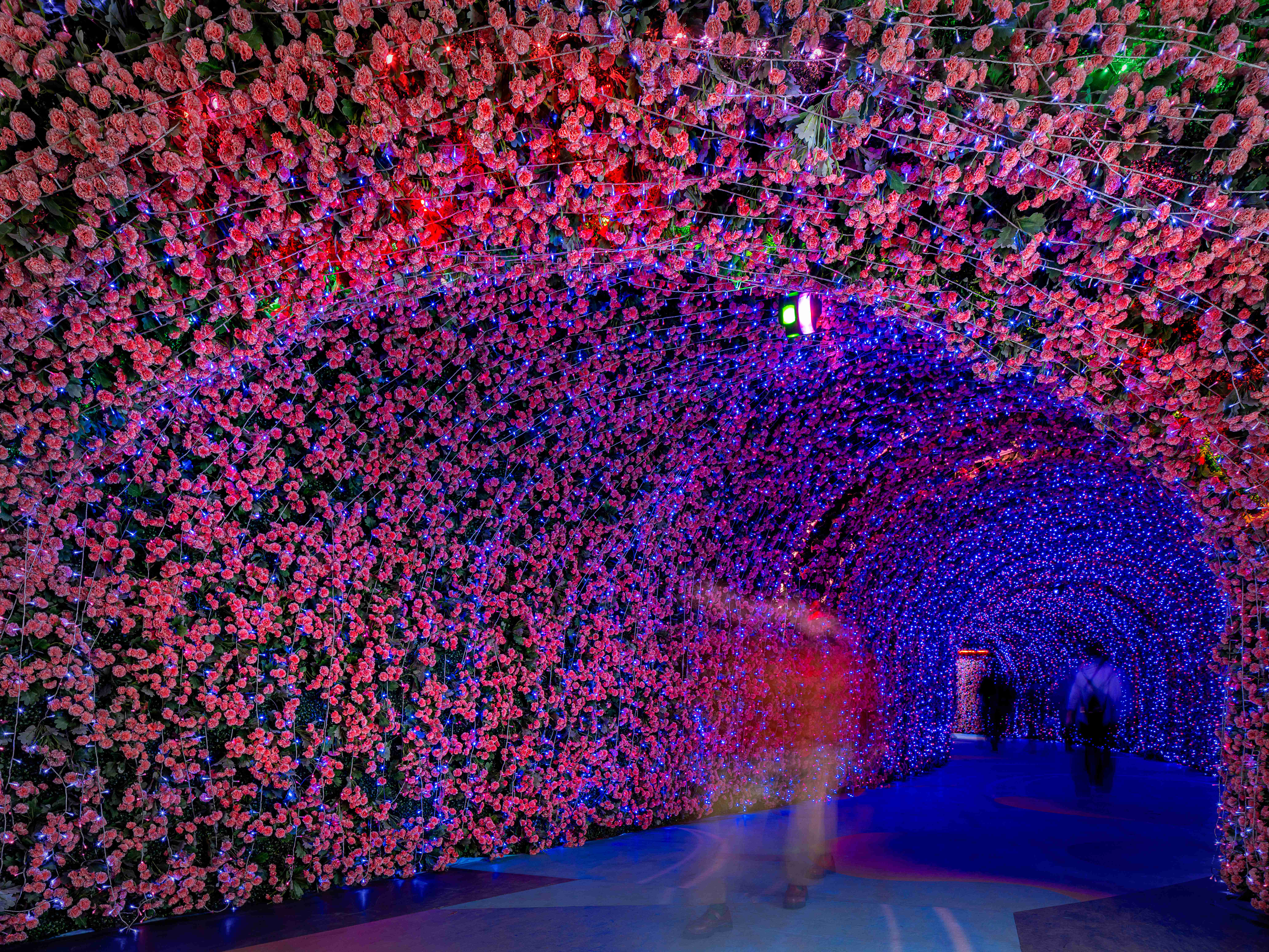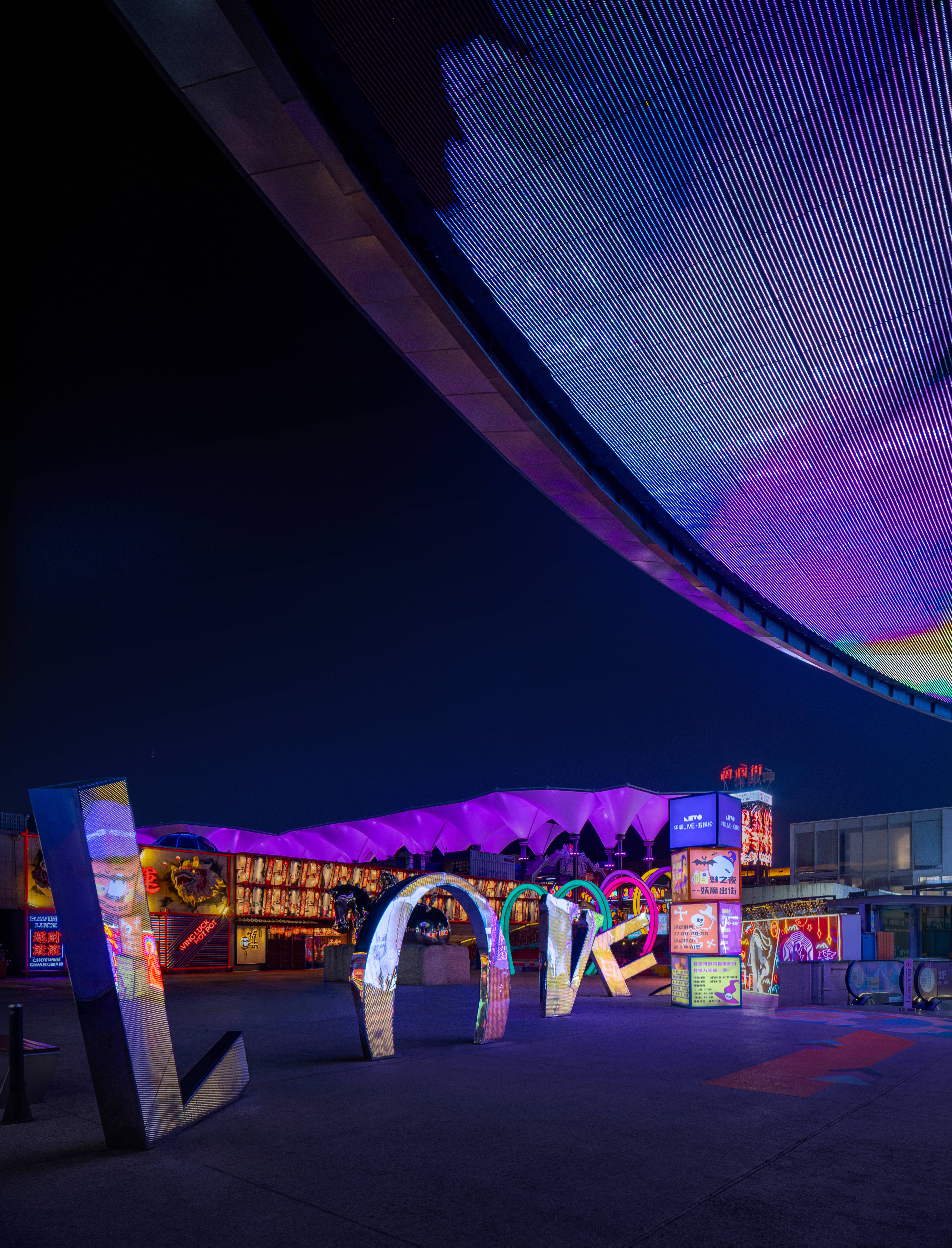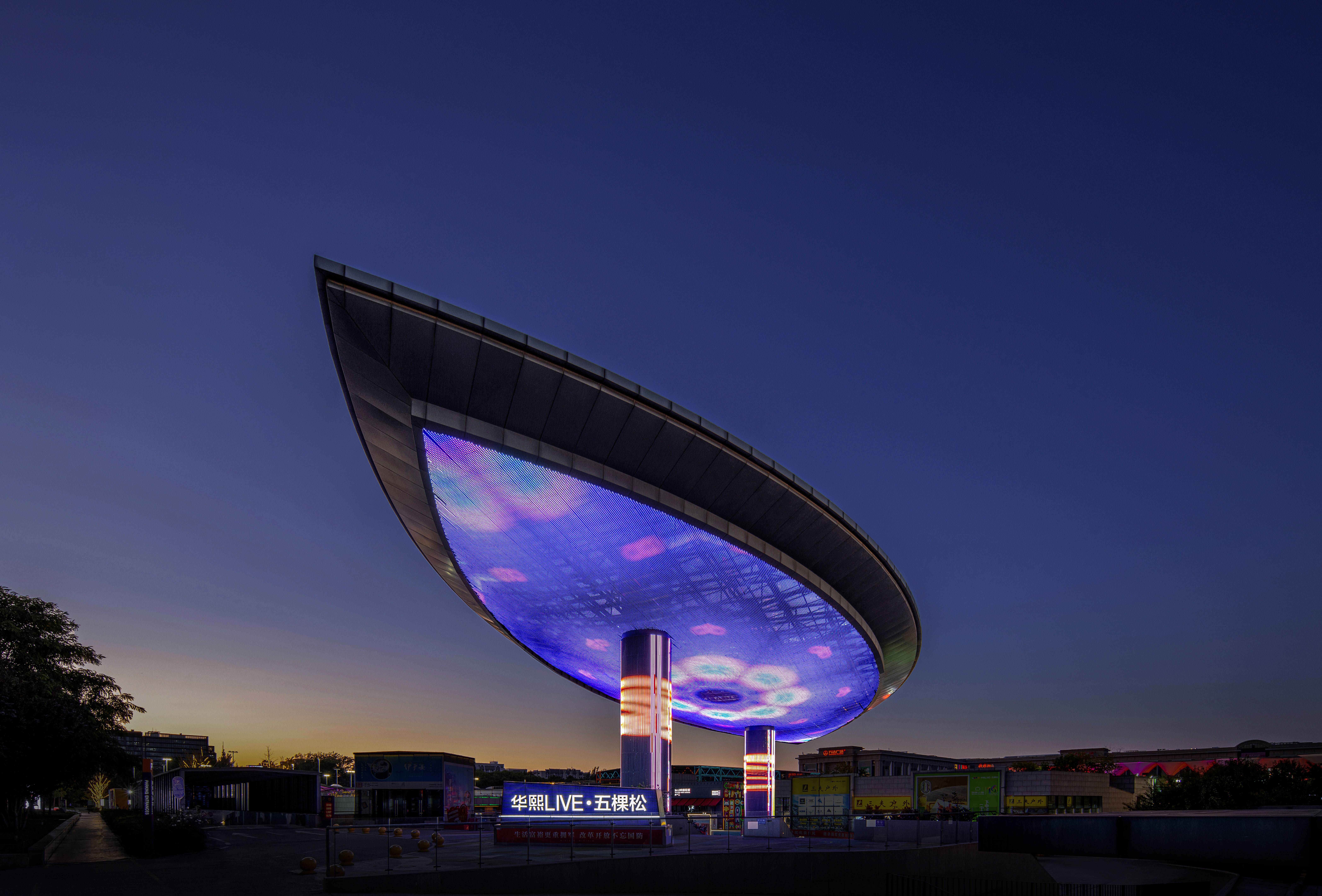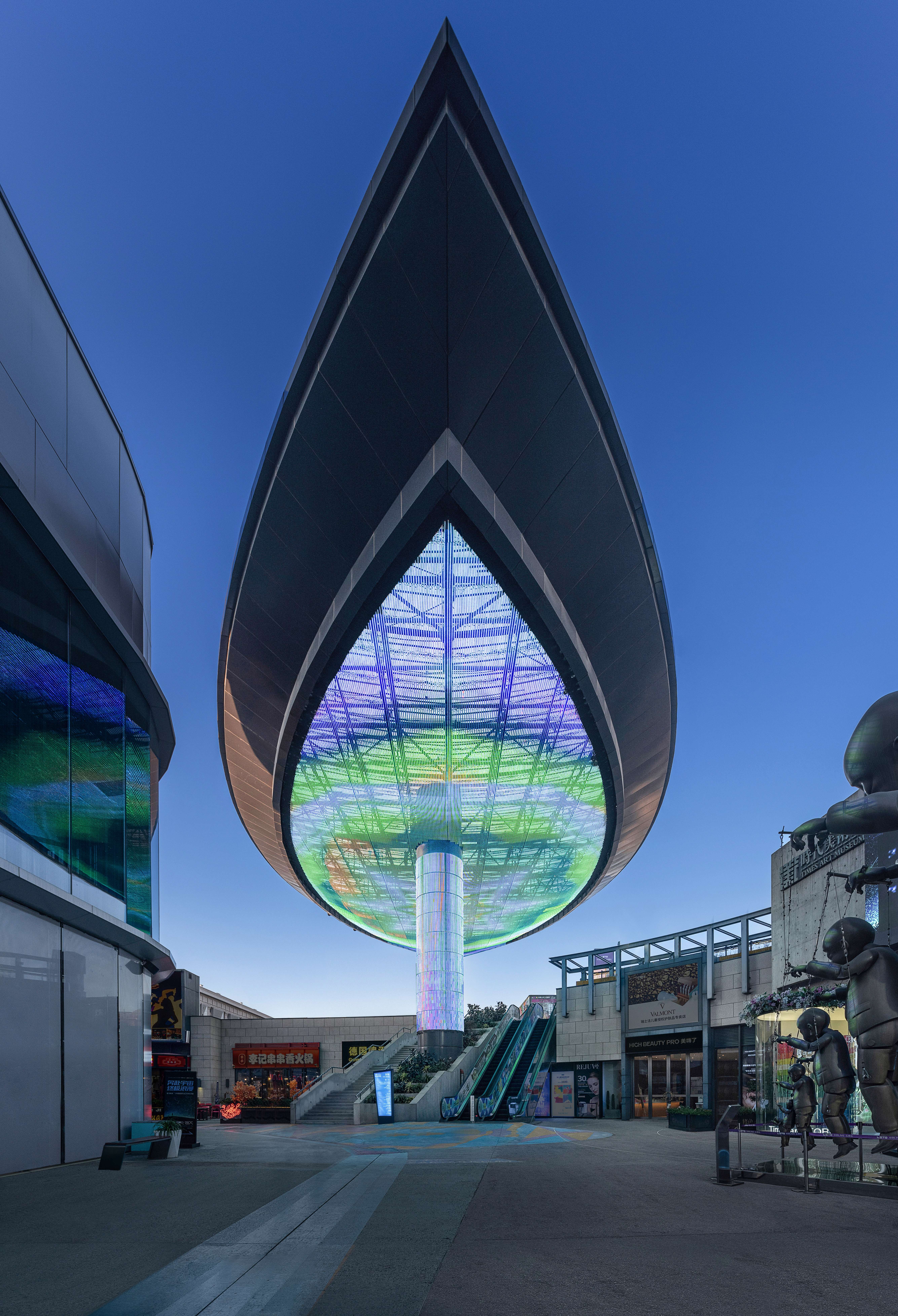 南北两侧各屹立着一片巨大的叶子,宛如悬浮在空中的未来飞船,在天际线中划出一道优雅的弧线。下方的像素屏幕以精湛的拼接技术打造,变幻出各种时尚前卫的主题内容。经过巧妙编排和创意设计,传递出年轻一代的活力与热情,如一片流动的数字海洋,将科技、艺术与商业完美融合。