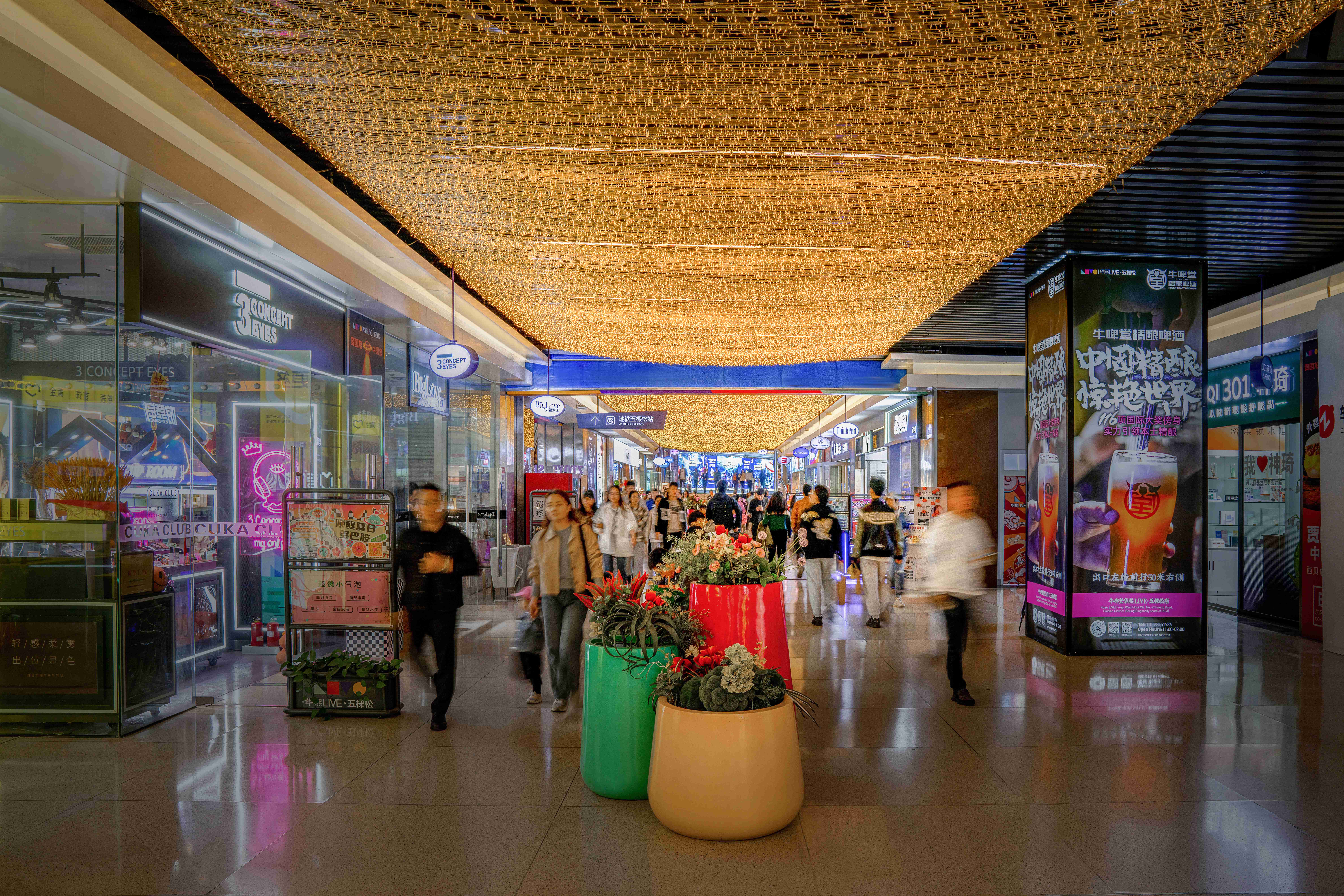 照明设计说明:坐落于北京五棵松商圈的华熙LIVE以活力、现场、体验为整体定位,为年轻人打造五小时时尚生活圈、城市活力互动体验空间。围绕着品牌核心价值与视觉调性,WWD从场景体验和氛围营造双重角度,对华熙LIVE·五棵松进行了商业场景的设计升级,营造全方位沉浸式互动体验空间和幸福能量场。