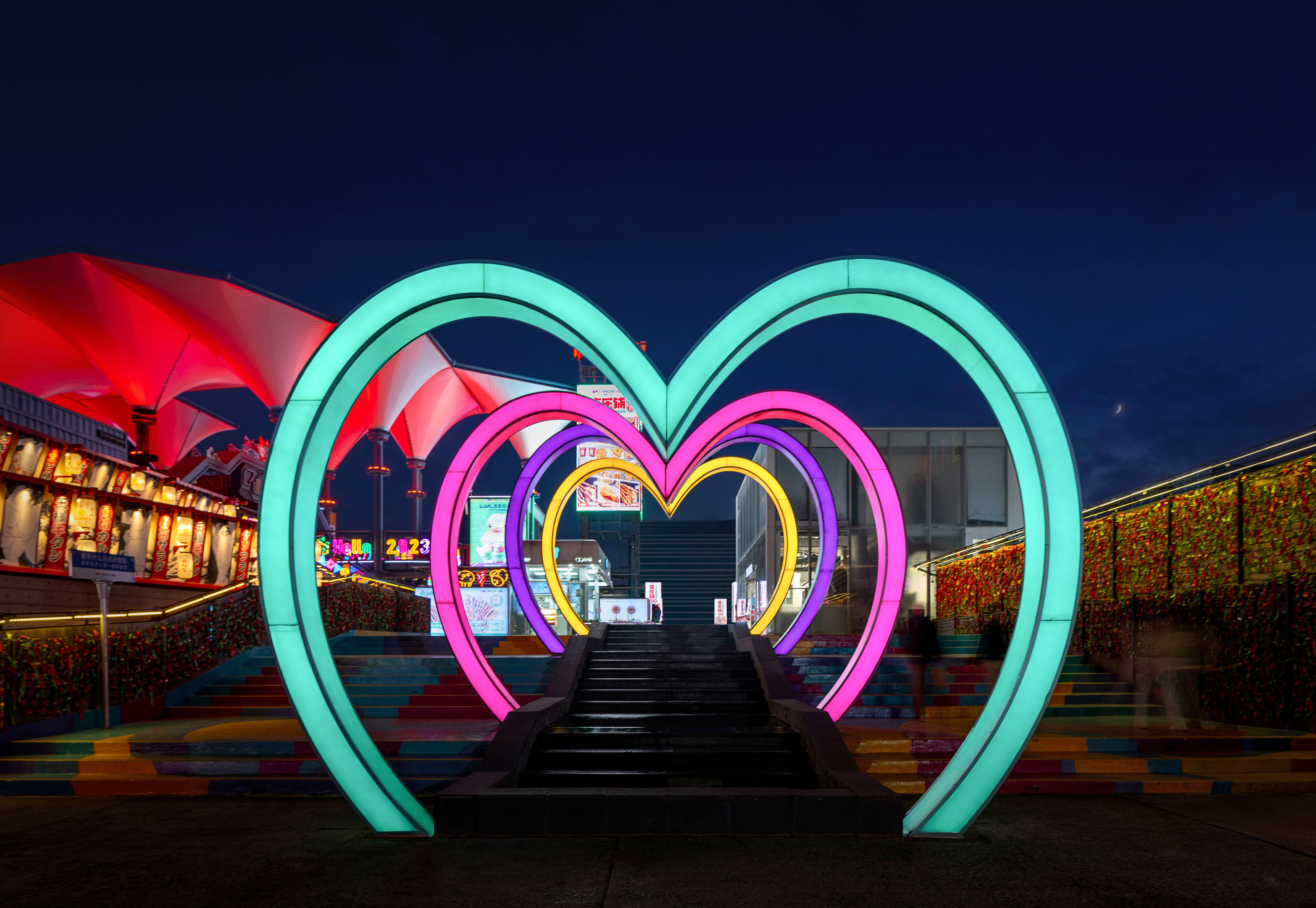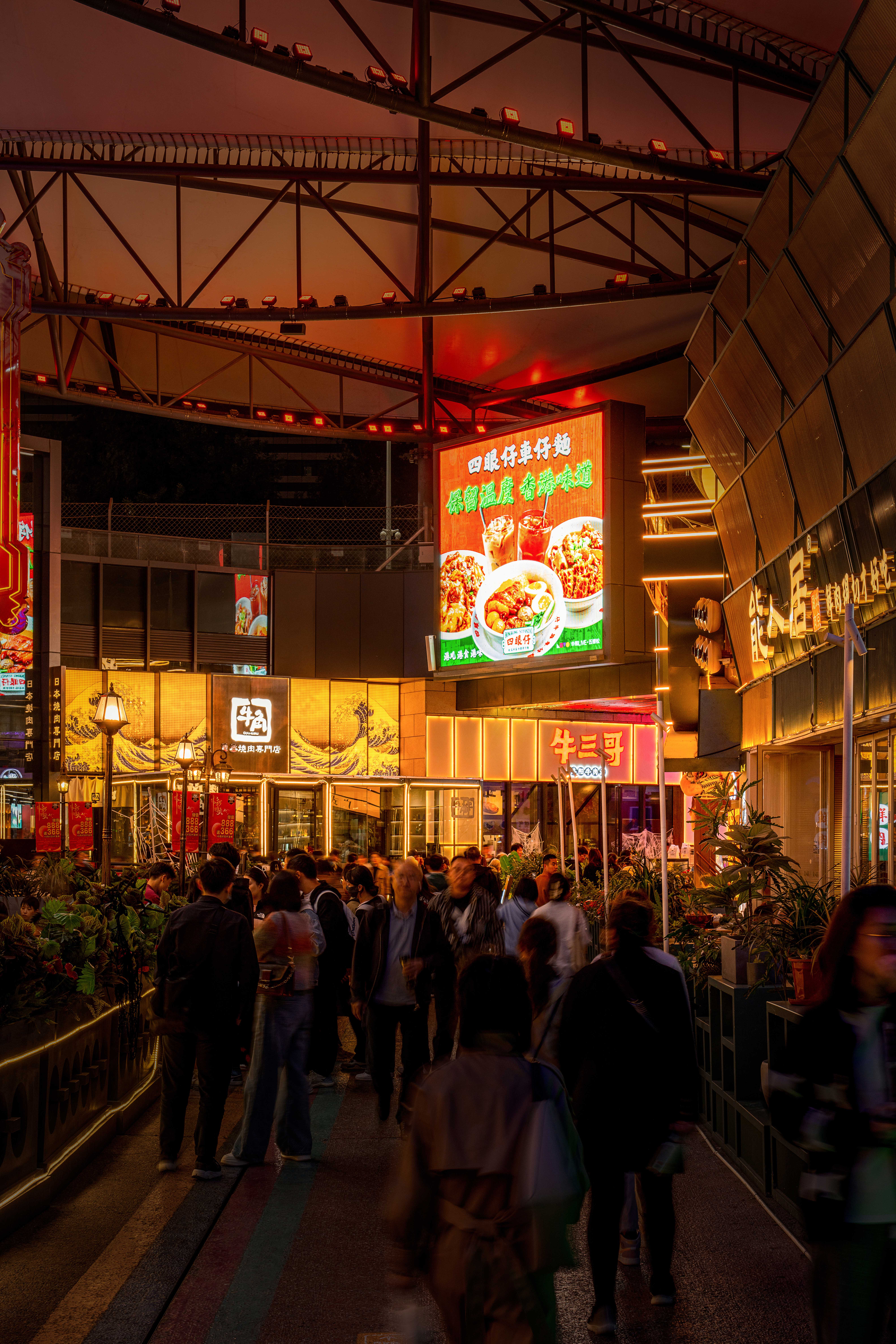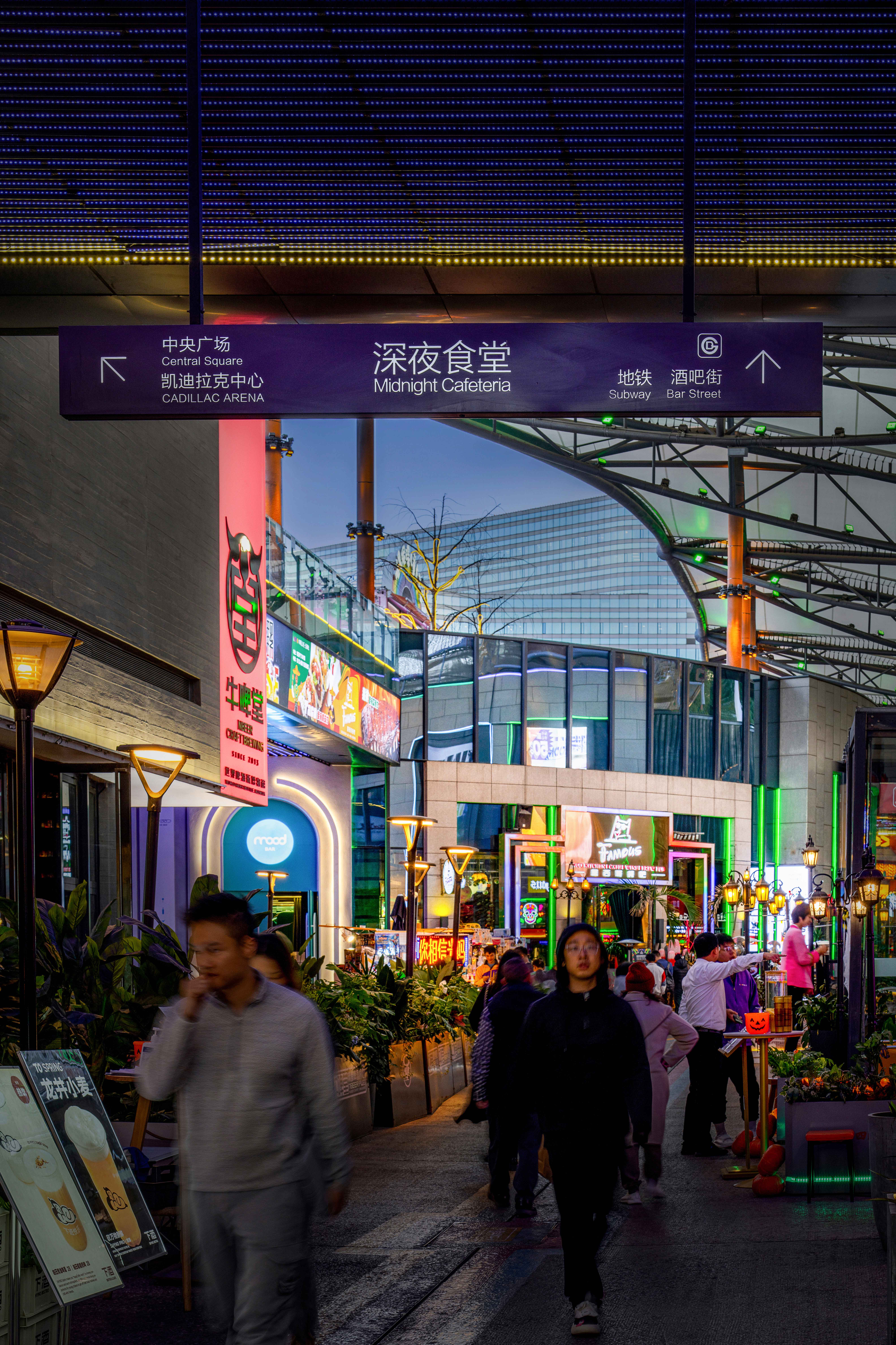 东坡道入口以四根高耸的广告柱为标志,鲜艳的广告画面和霓虹灯光形成强烈的视觉冲击,作为商业区域与场馆区域的分界线。黄昏时分,落日余晖与霓虹灯光交相辉映,使街区成为城市夜晚的焦点。