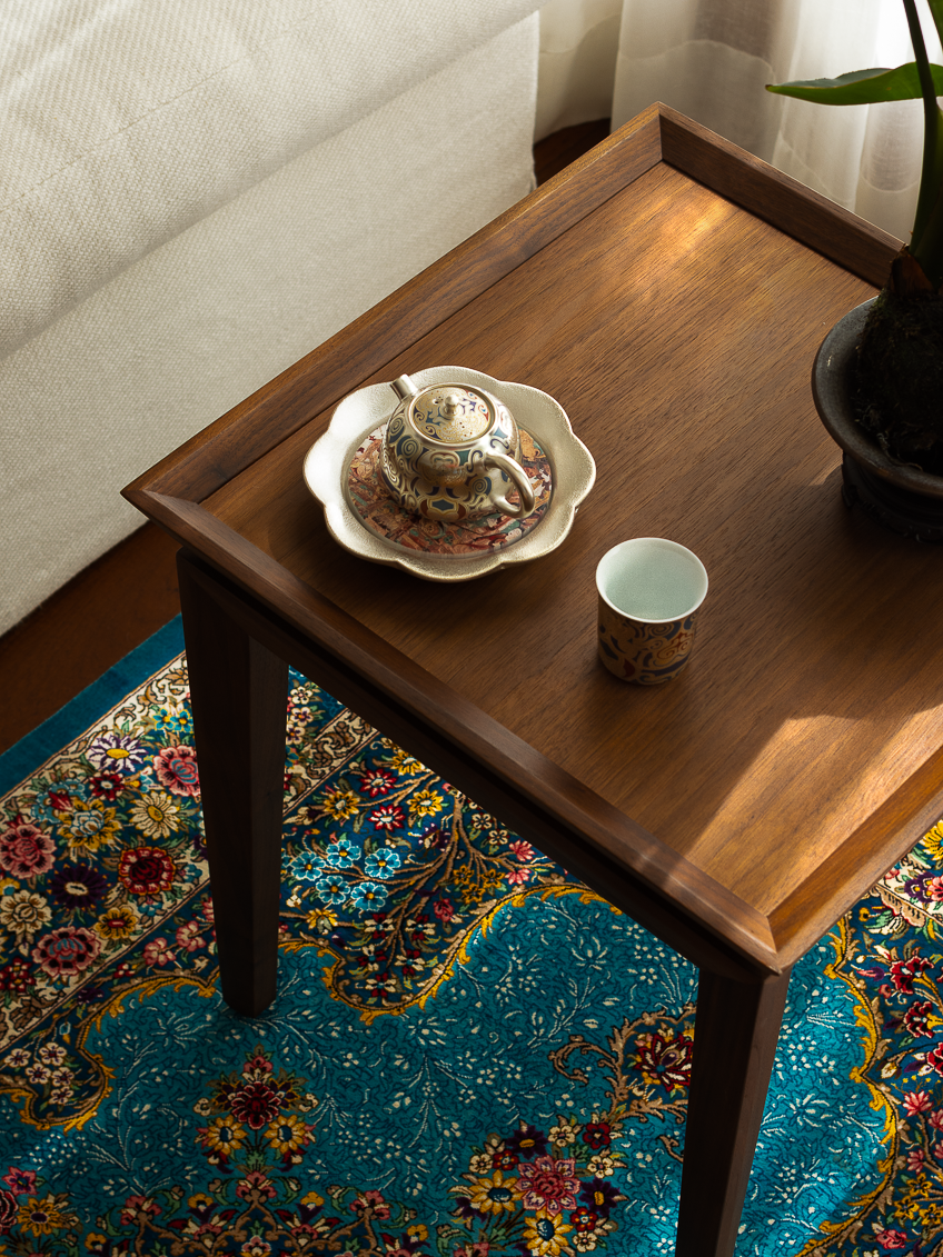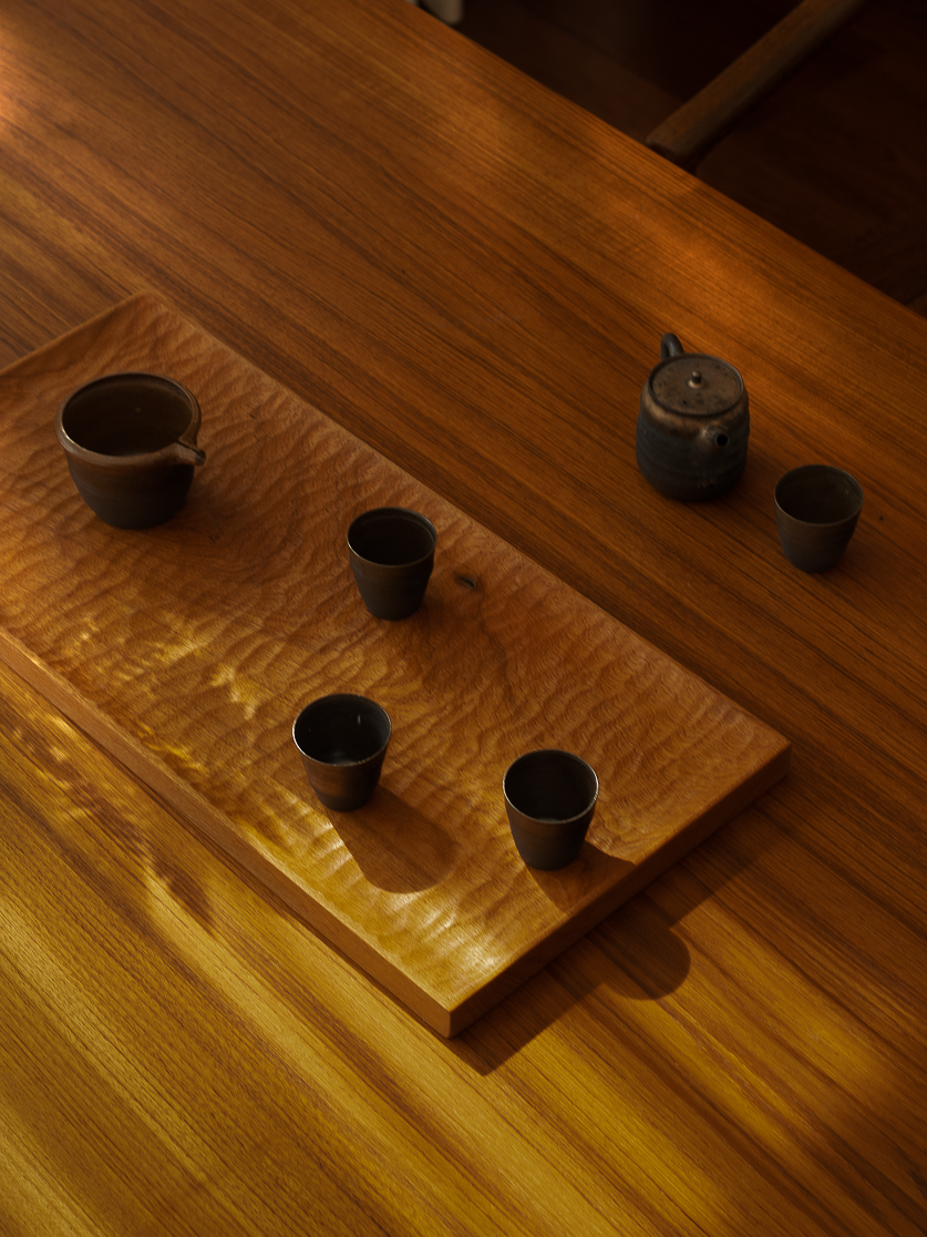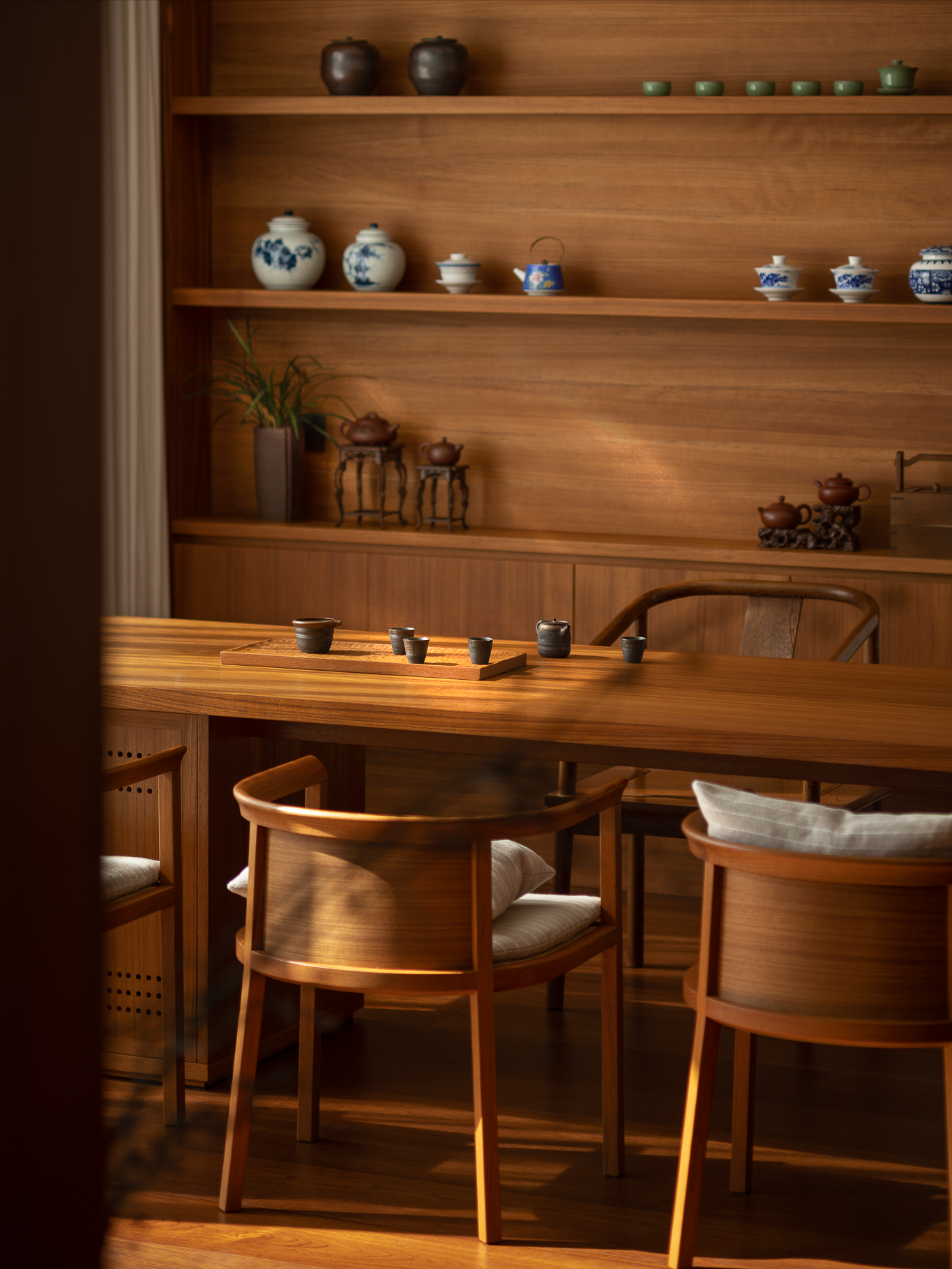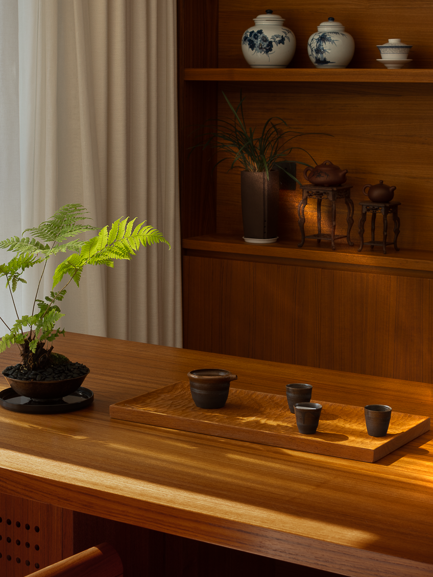 软装陈列与家具器物互成逻辑一致的设计语言,自然原木、石材肌理细腻刻画线条与体块的错落层次,静默共和自然主义的底色。