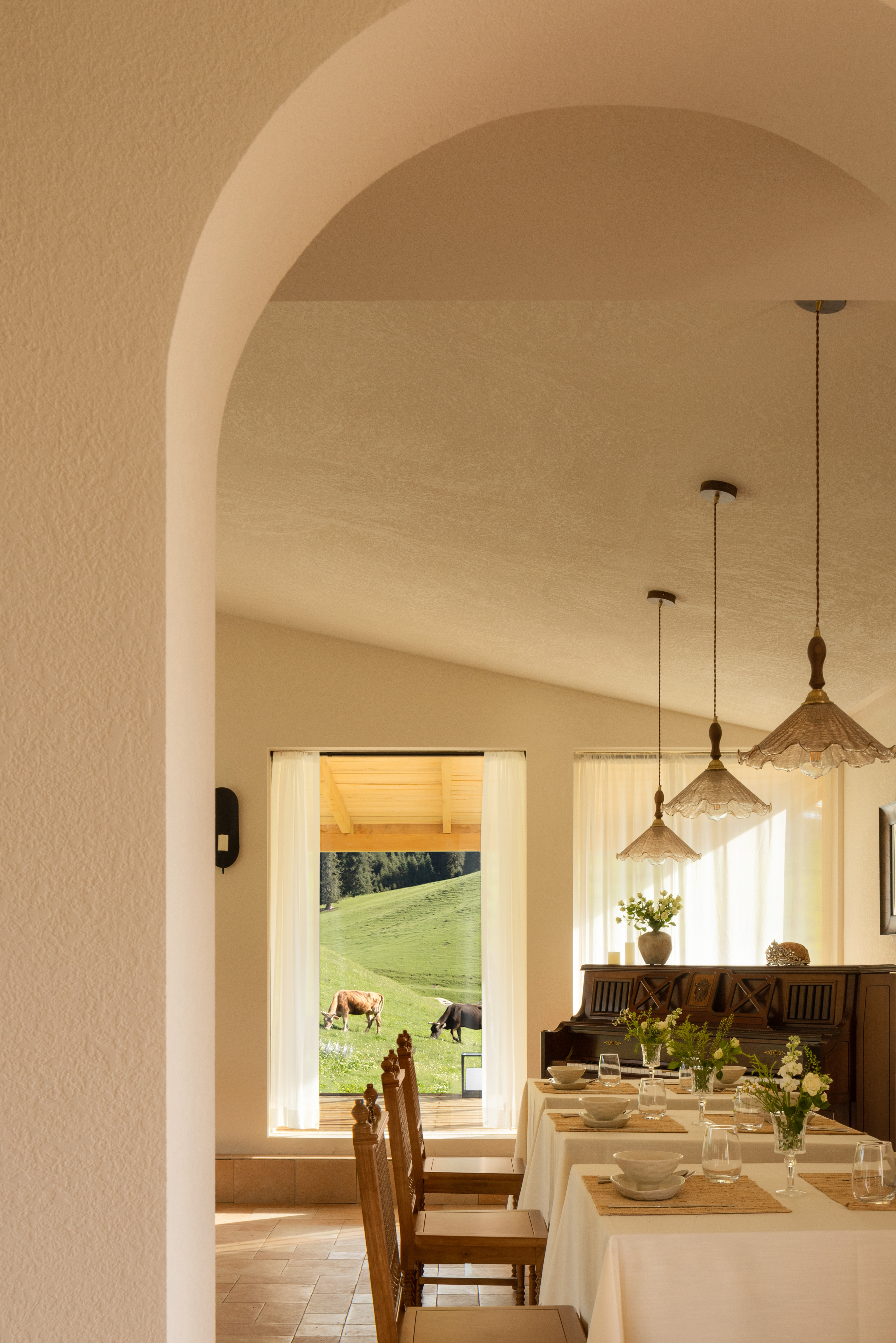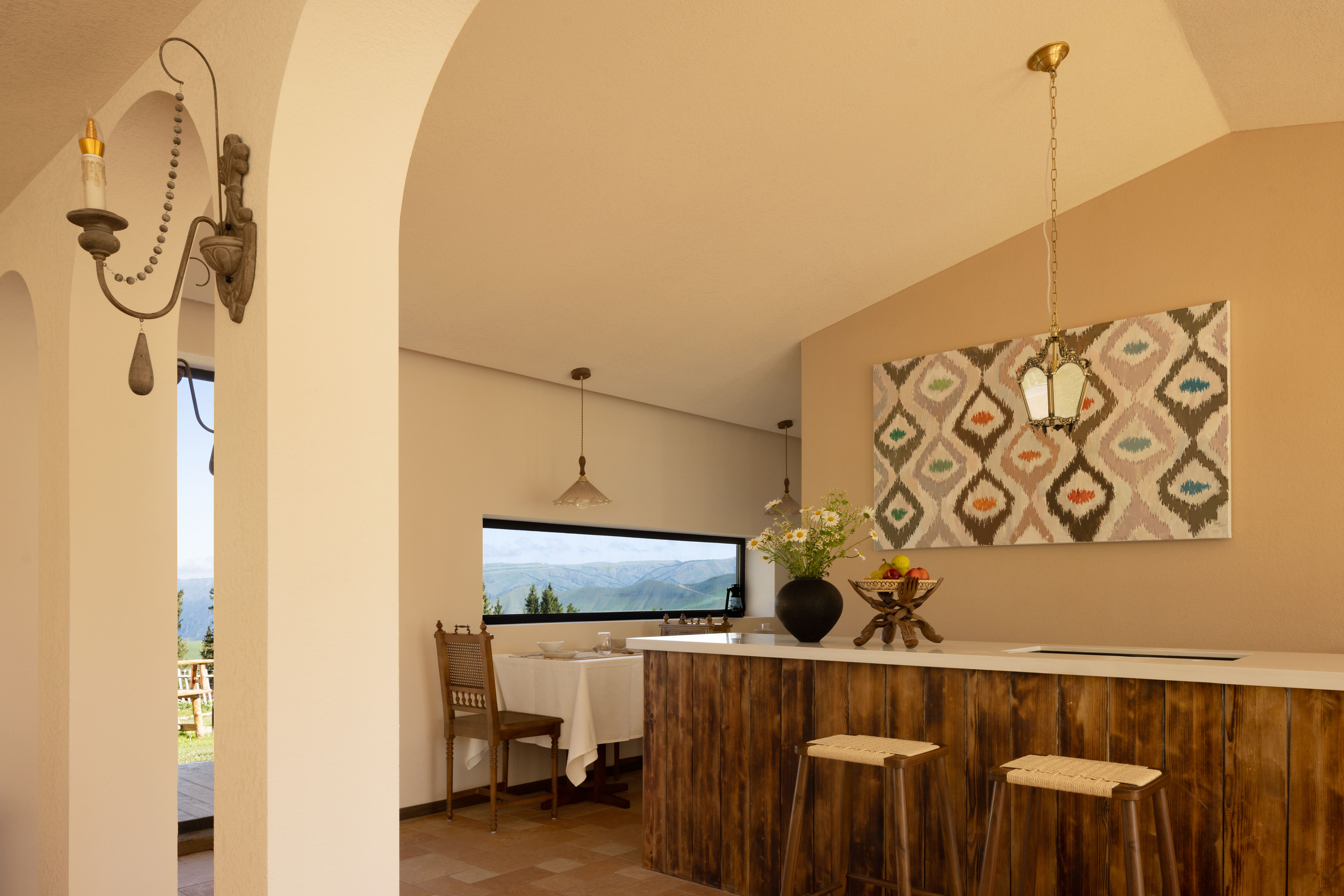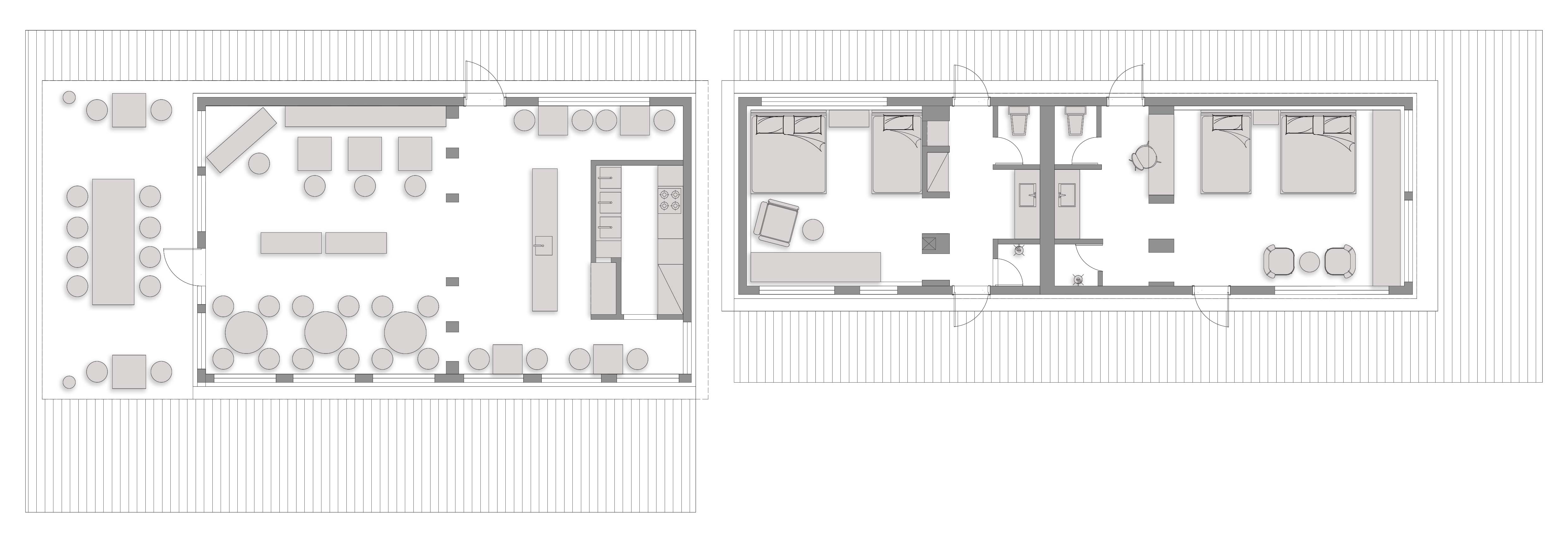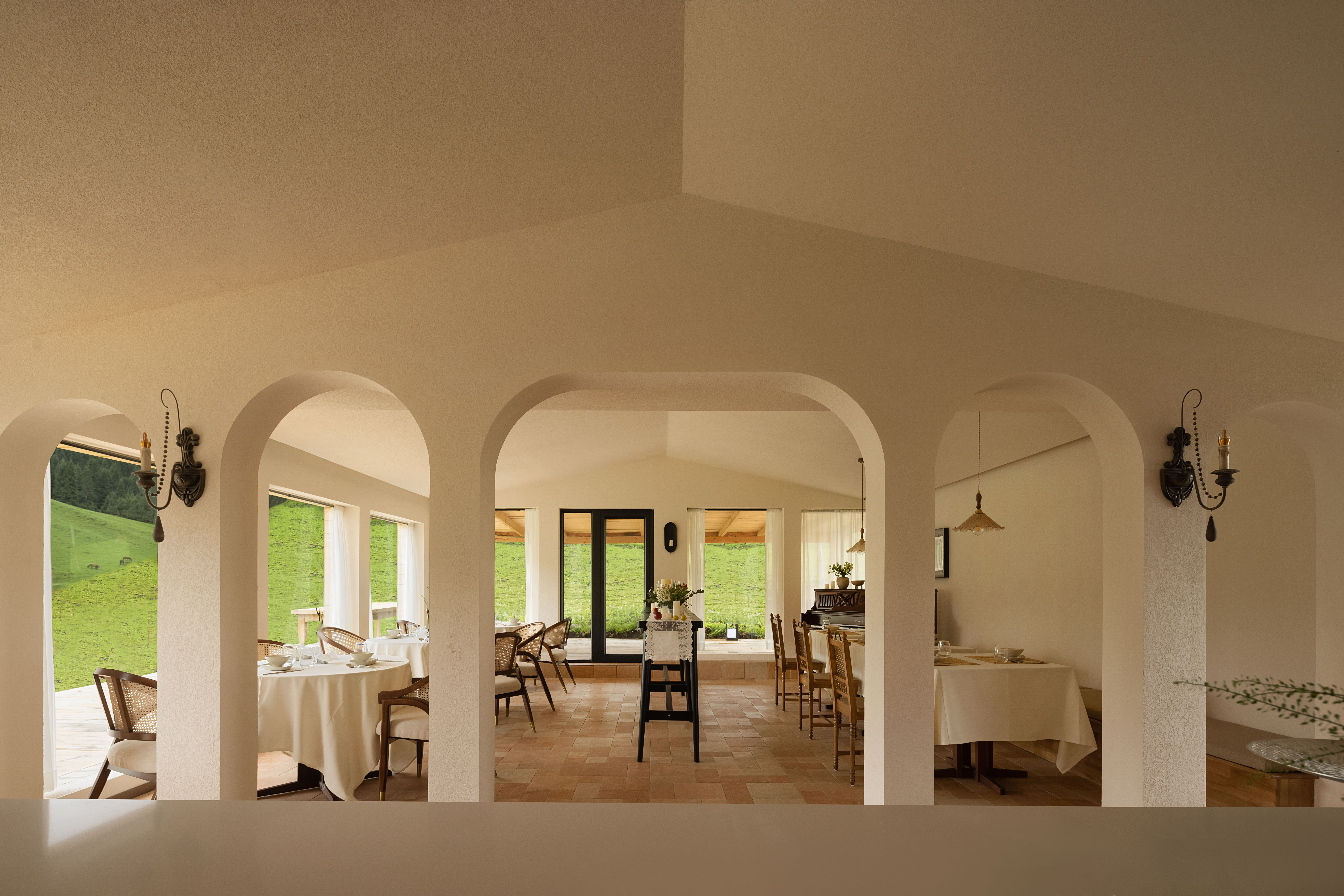 利用民宿的区位优势,设计师将业态规划为“民宿+餐饮/下午茶”的结构,把餐厅消费人群扩大到琼库什台的全部游客。岭杉二期的空间规划为1个公区(兼餐厅)+3间客房,与50米之外拥有5间客房的岭杉一期对望,形成整体8间客房+1个公区(兼餐厅)的总体量。