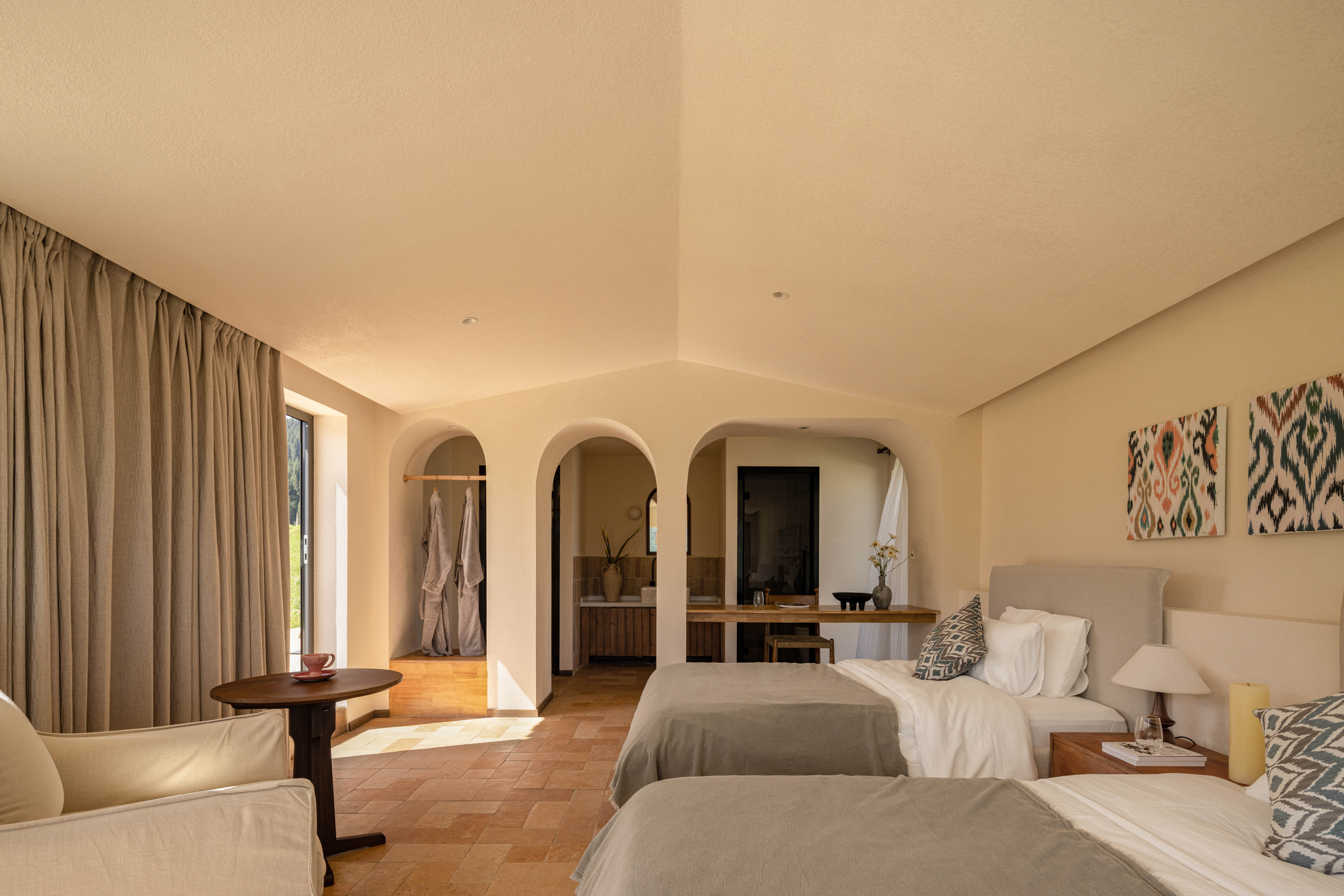 鉴于岭杉一期室内的现代侘寂风格,为了保持民宿形象的完整性,岭杉二期的客房在延续一期风格基础上,设计师力图将其呈现出更多质感和松弛感。