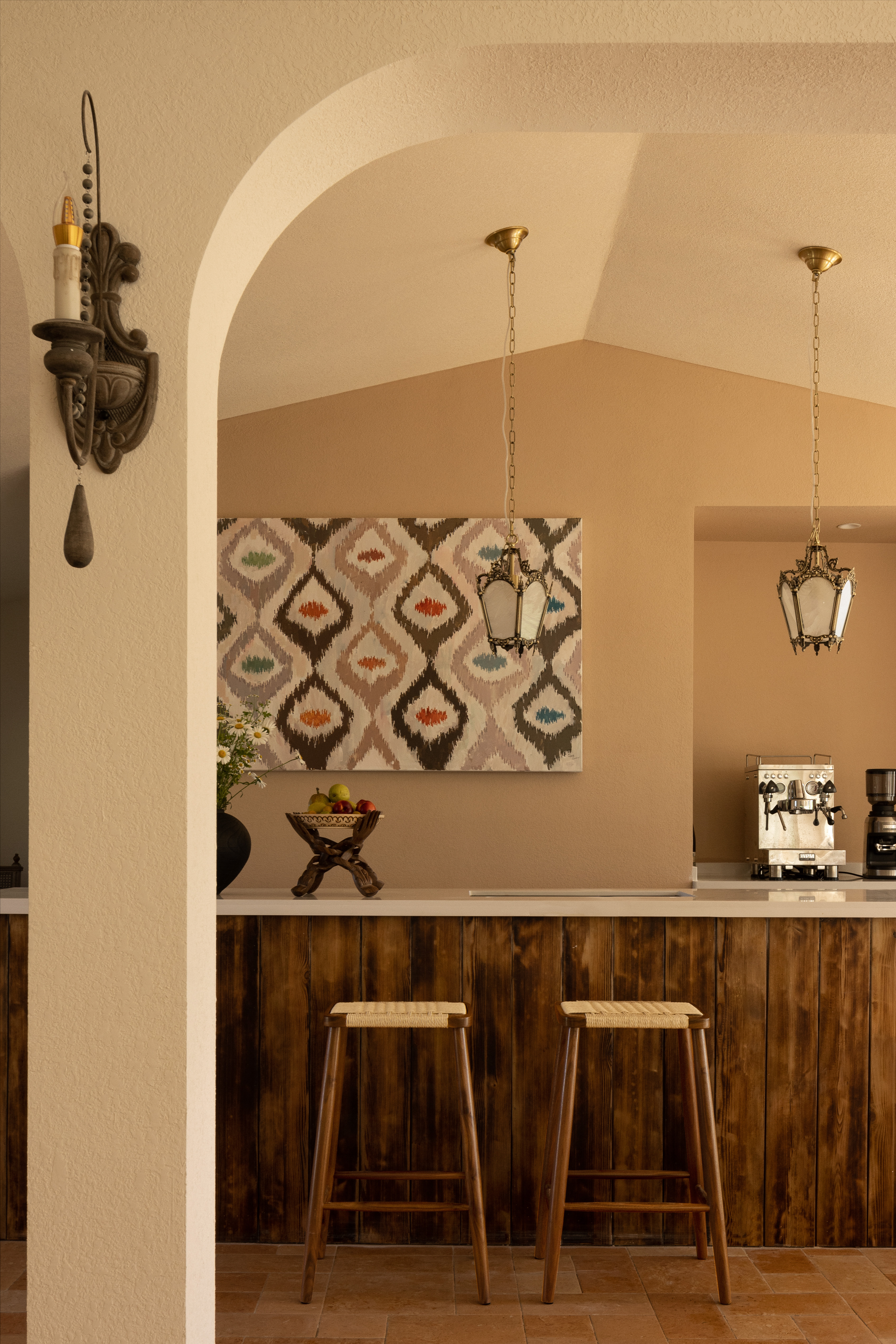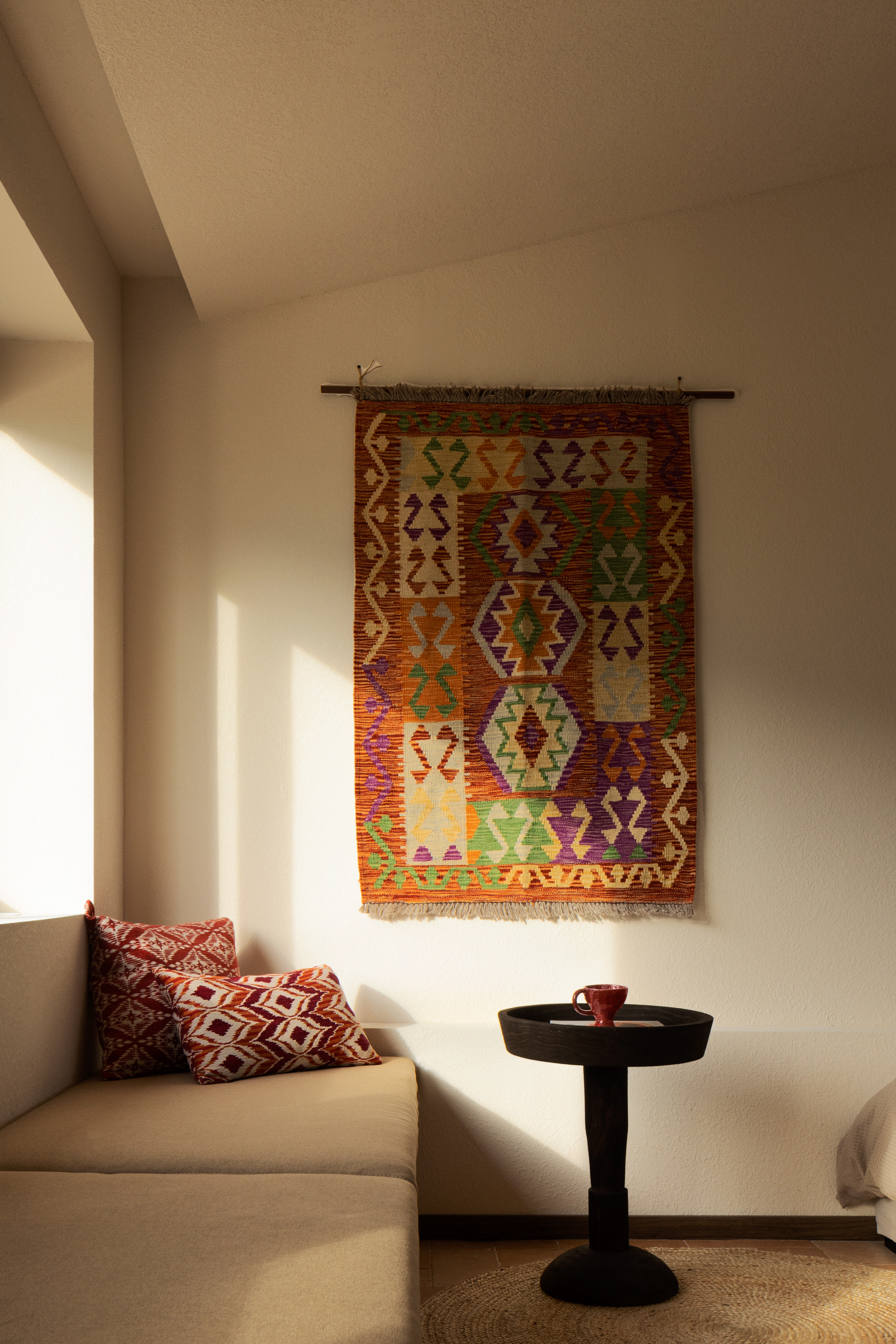马背上的哈萨克族,从居住、饮食,到服饰、节日,甚至生活哲学,都有其特有的文化特点。设计团队亲手绘制的挂画,将新疆艾德莱斯的纹样进行了转译和色彩的重新编辑。富有生命力的手绘痕迹,带给空间更多鲜活的温度。无论是手绘的艾德莱斯纹样,还是从南疆喀什寻来的地毯和摆件,这些泛新疆文化的纹样与符号,通过绘画、装饰品的方式融入到空间内,成为真实的民族元素表达。