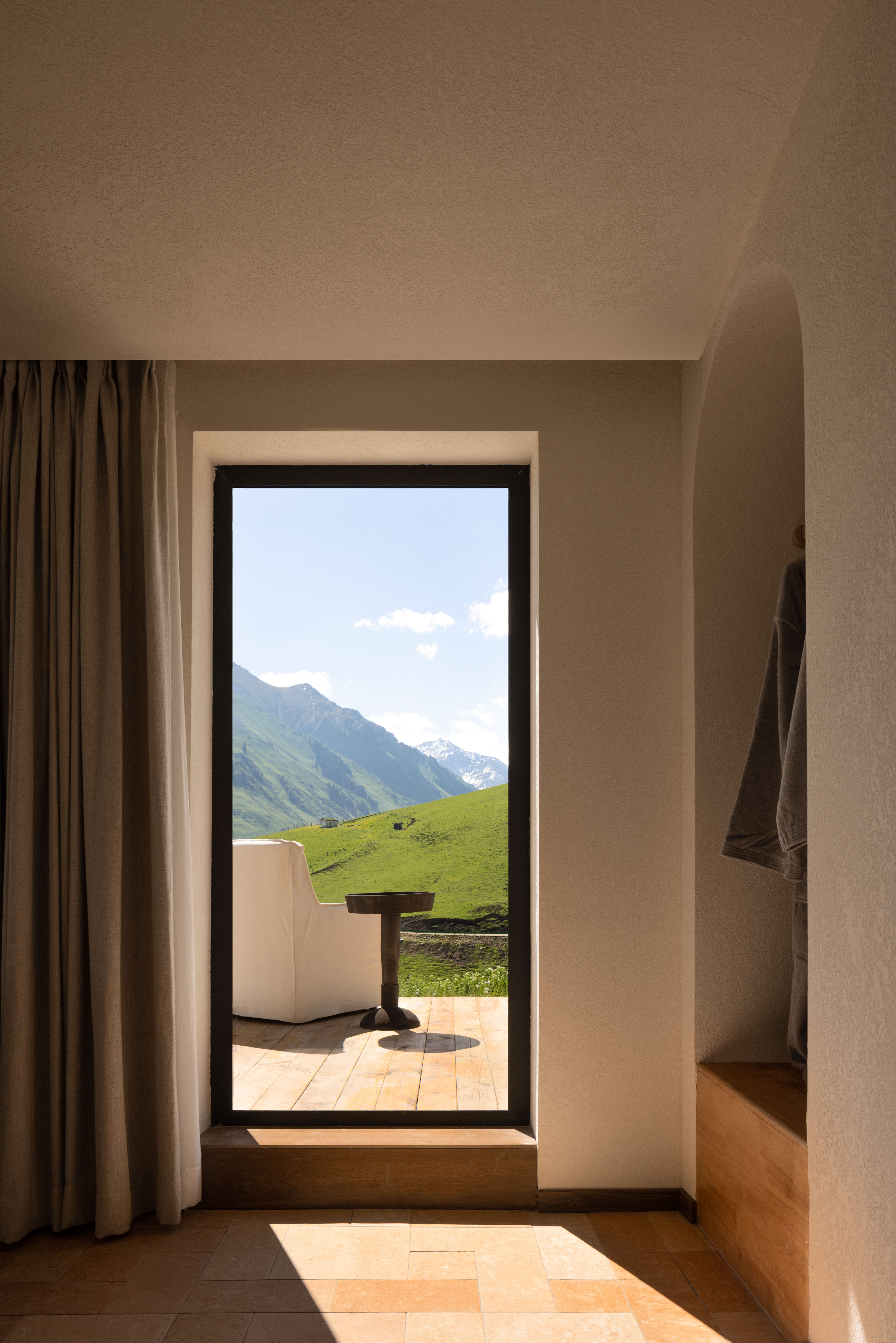 同时,包覆的木柱形成了造型隔断,为不到30㎡的客房增加了层次感,为服务性空间提供了遮挡和屏障,同时也兼顾了拍照打卡的需求,提升客人的入住期待与情绪体验。有限的空间,全部向风景展开,端头的大落地窗,与岭杉一期遥遥相望。