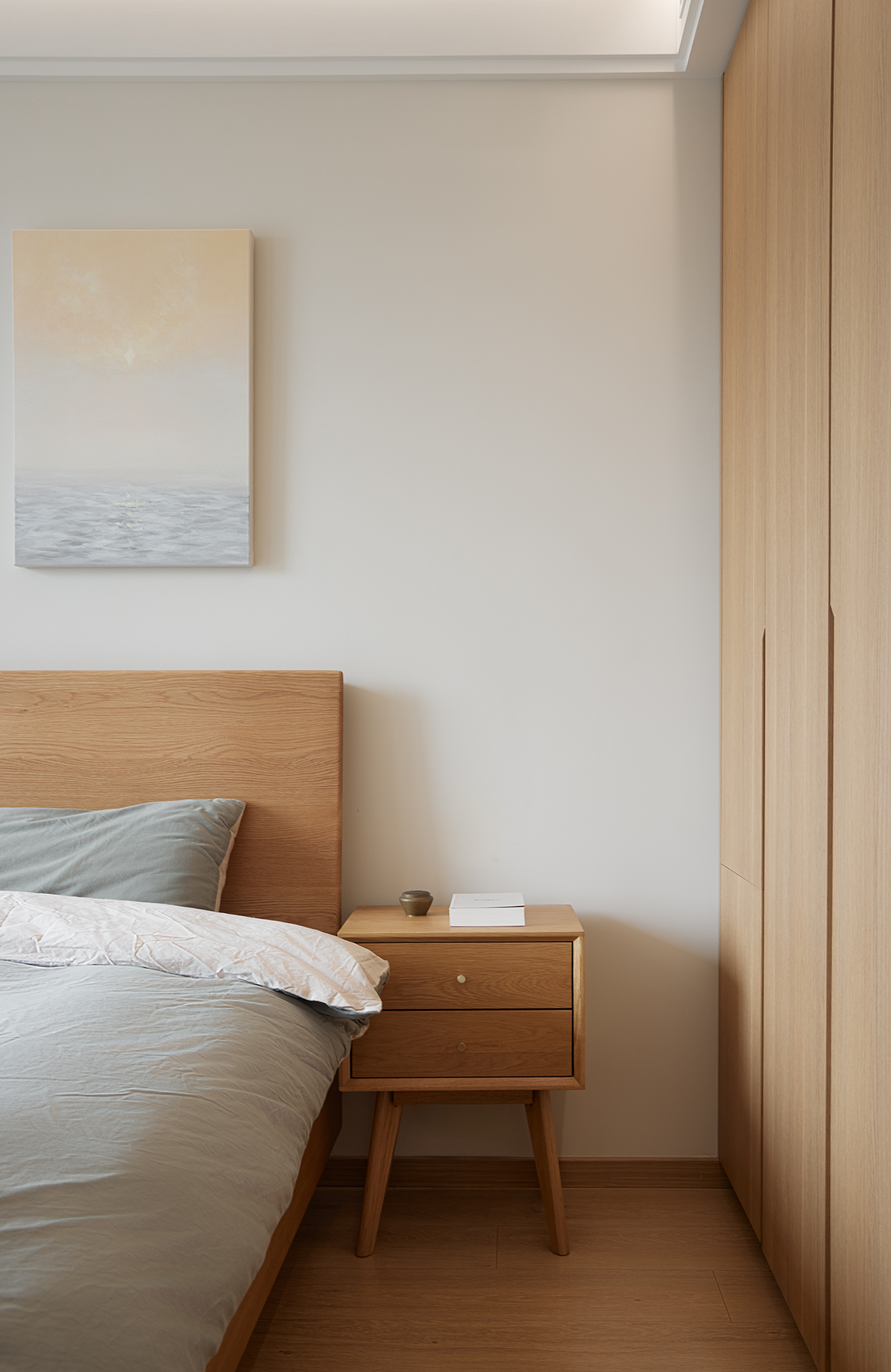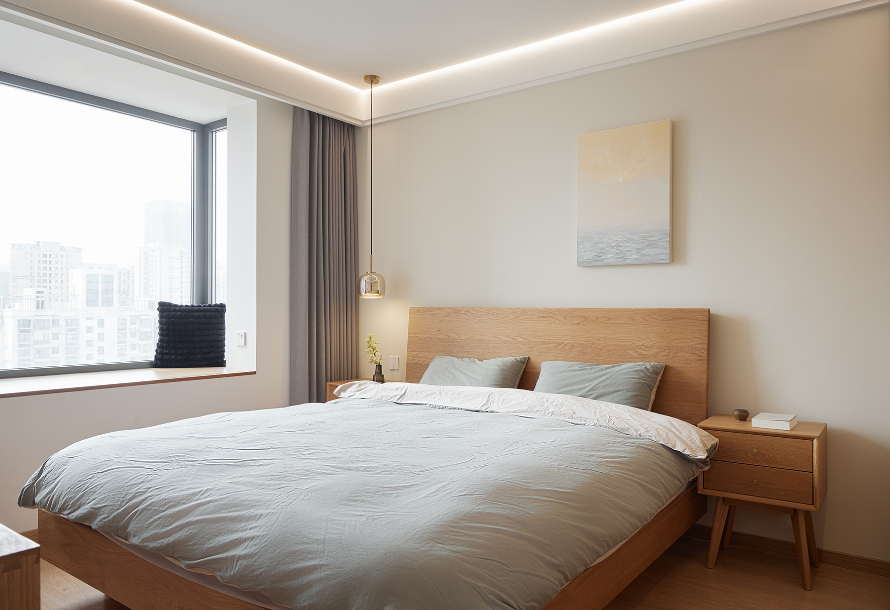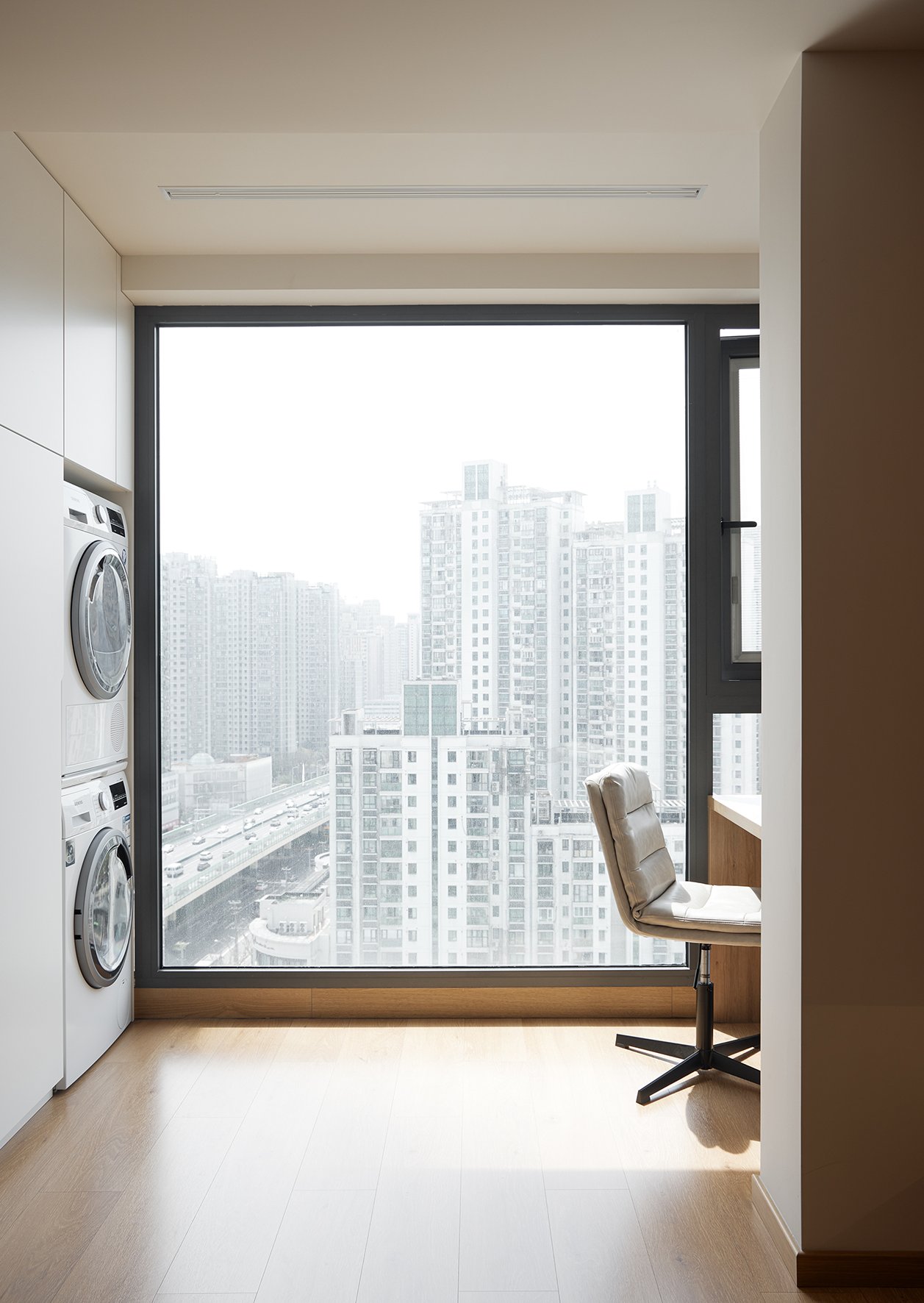 在选材上,注重实用与美观的完美结合。玄关区域采用定制悬浮中空鞋柜与吊柜,选用耐用且易于清洁的材料,既满足了收纳需求,又保持了空间的整洁与美观。LDK一体化空间则大量运用了木制定制柜,搭配纯白与米黄调的墙面,营造出温馨舒适的氛围。厨房与中央岛台选用耐磨易洁的台面材料,确保长期使用下的耐用性。同时,西厨柜的开架与吊柜设计,不仅提供了充足的储物空间,还增添了空间的层次感。阳台区域则选用了超大落地玻璃,以最大化视野,让城市风光尽收眼底。阳台内的办公桌与收纳柜均选用白色系,与洗烘套装颜色一致,整体空间感觉和谐舒适。主卧墙面选用鹅蛋青色,窗帘与床品则选用灰色与青色,营造出一种冷静而清爽的睡眠环境。衣柜与边柜的设计,既满足了收纳需求,又保持了空间的简约风格。