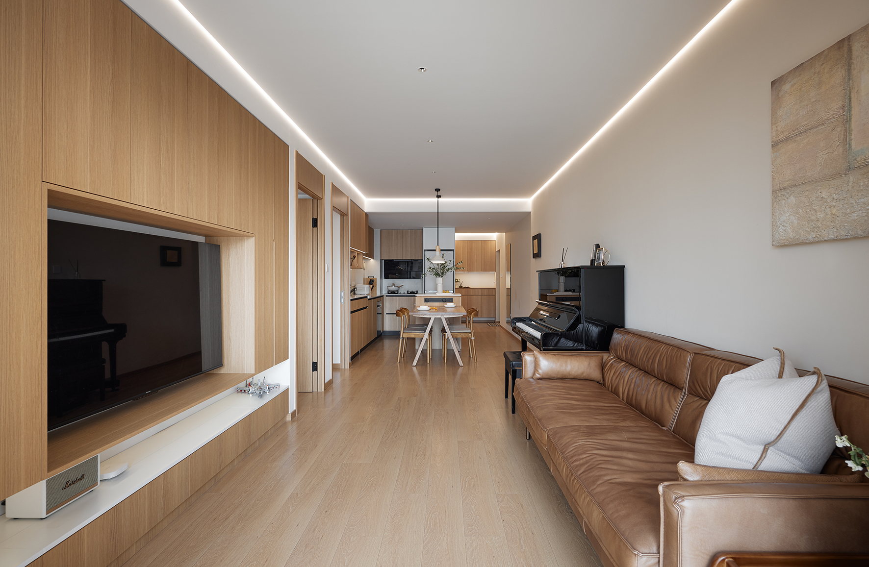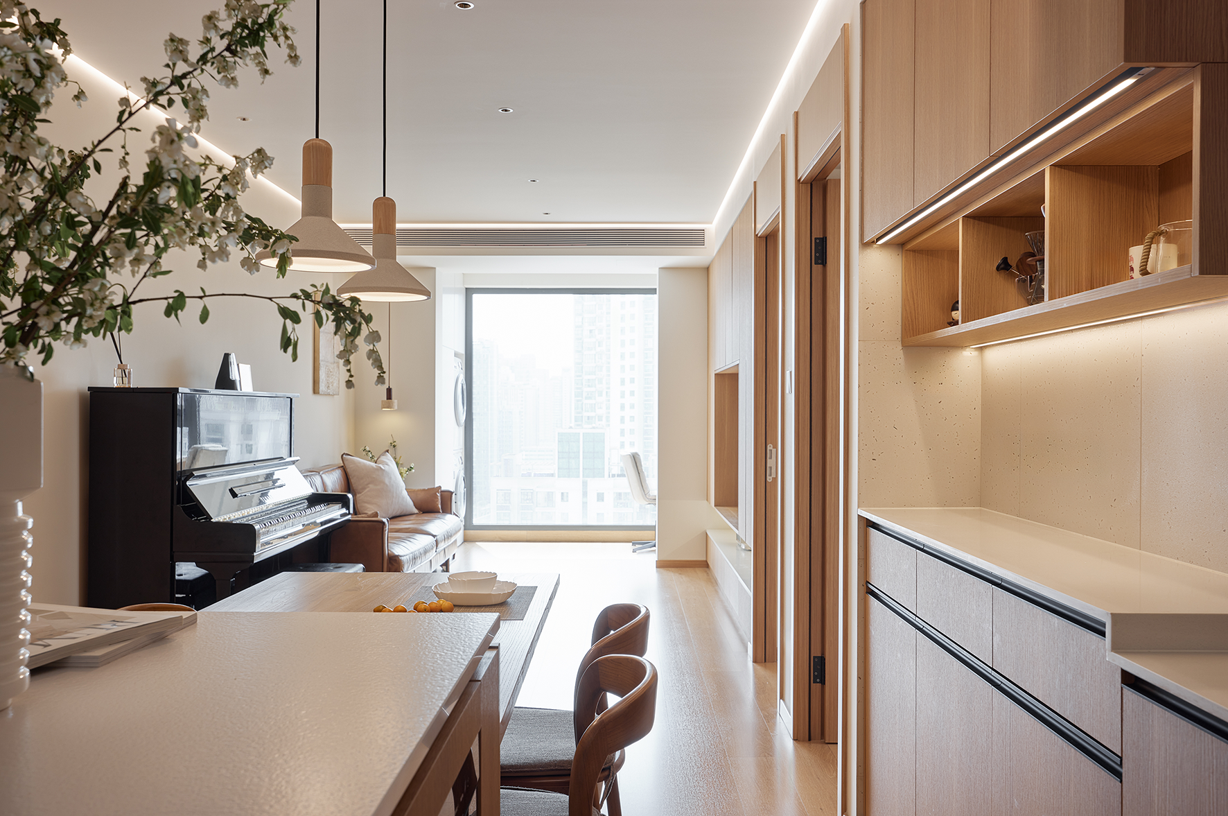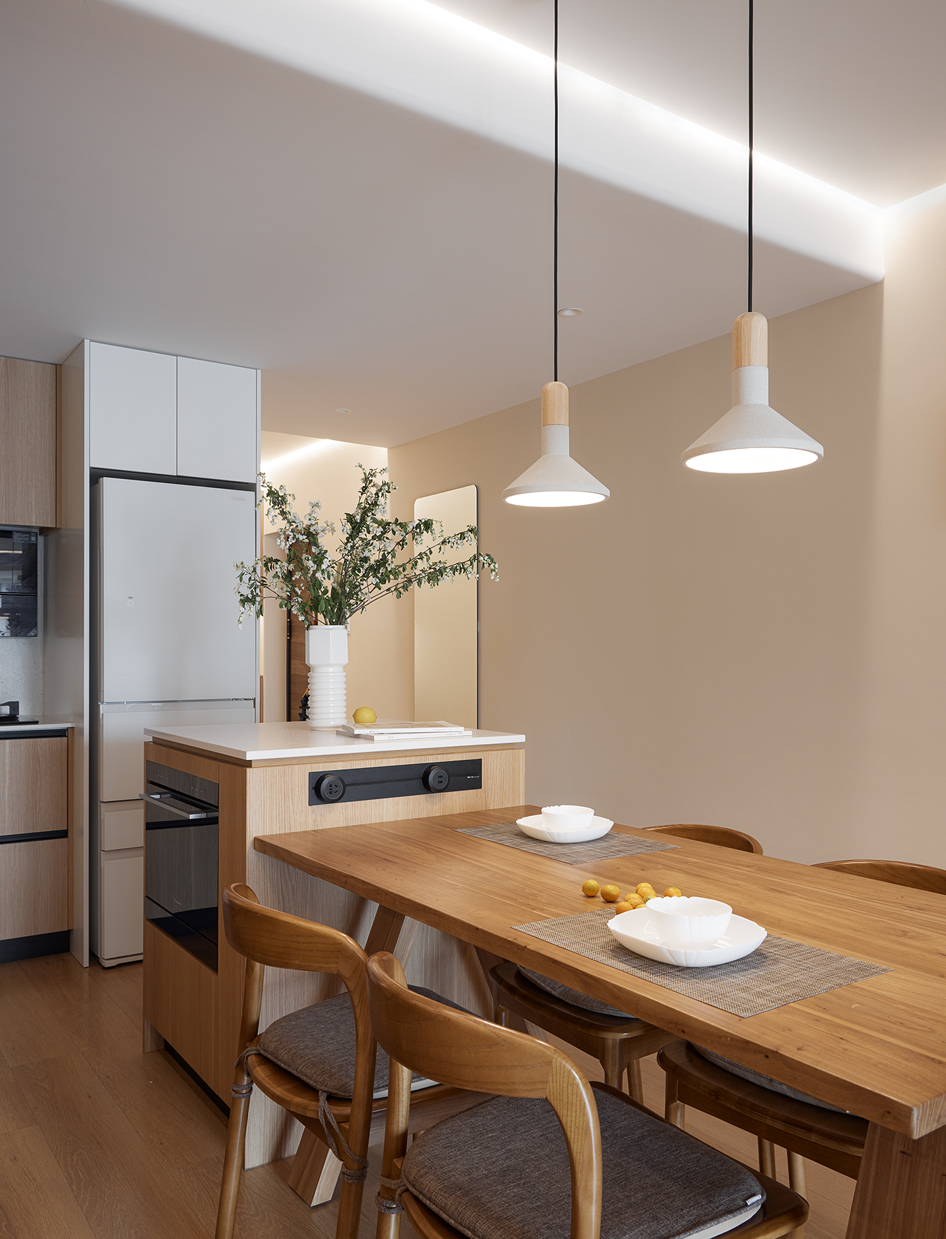 设计师通过拆除原始厨房的非承重墙体,打造开放式厨房,不仅拓宽了入口通道,增加了采光,还巧妙地将中厨、西厨柜与中央岛台融为一体,形成了流畅的洄游动线,使得整个LDK一体化空间更加开阔、明亮且实用。同时,充分利用墙面面积进行收纳设计,如定制玄关鞋柜、次净衣收纳柜、西厨收纳柜以及电视柜等,极大地提升了空间的收纳能力。