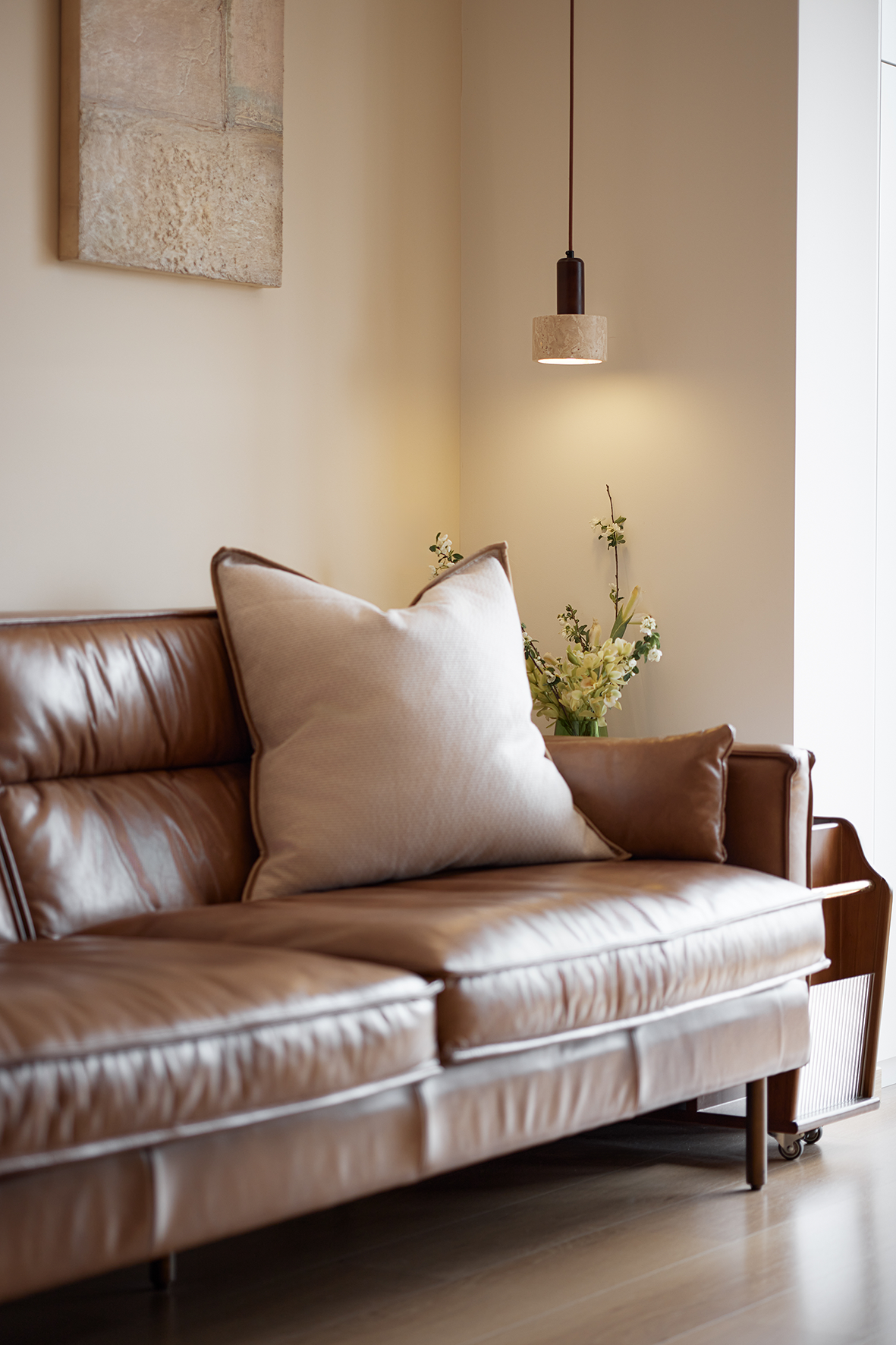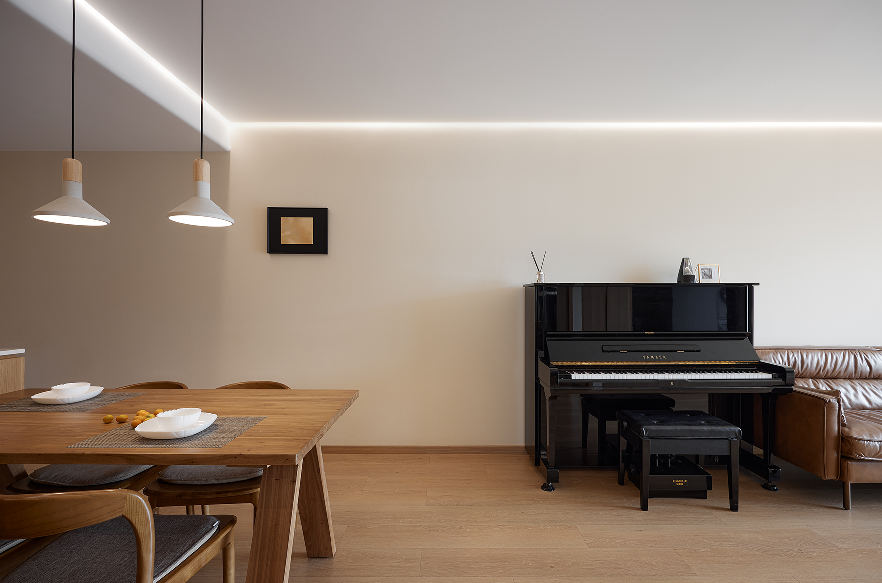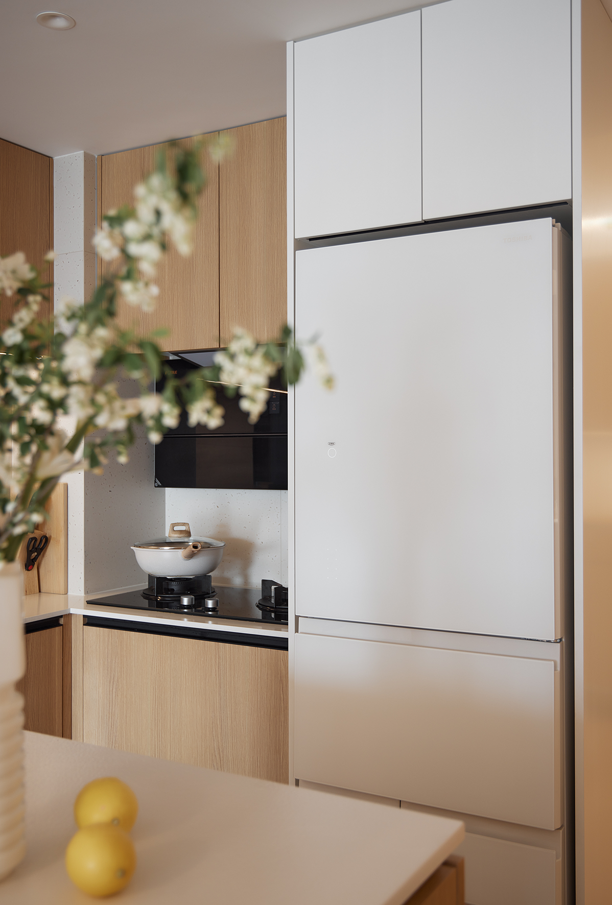 设计师通过拆除原始厨房的非承重墙体,打造开放式厨房,不仅拓宽了入口通道,增加了采光,还巧妙地将中厨、西厨柜与中央岛台融为一体,形成了流畅的洄游动线,使得整个LDK一体化空间更加开阔、明亮且实用。同时,充分利用墙面面积进行收纳设计,如定制玄关鞋柜、次净衣收纳柜、西厨收纳柜以及电视柜等,极大地提升了空间的收纳能力。