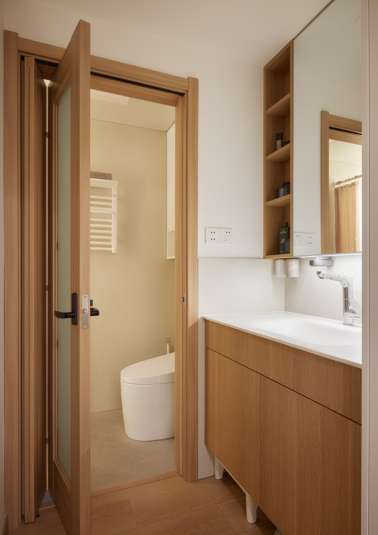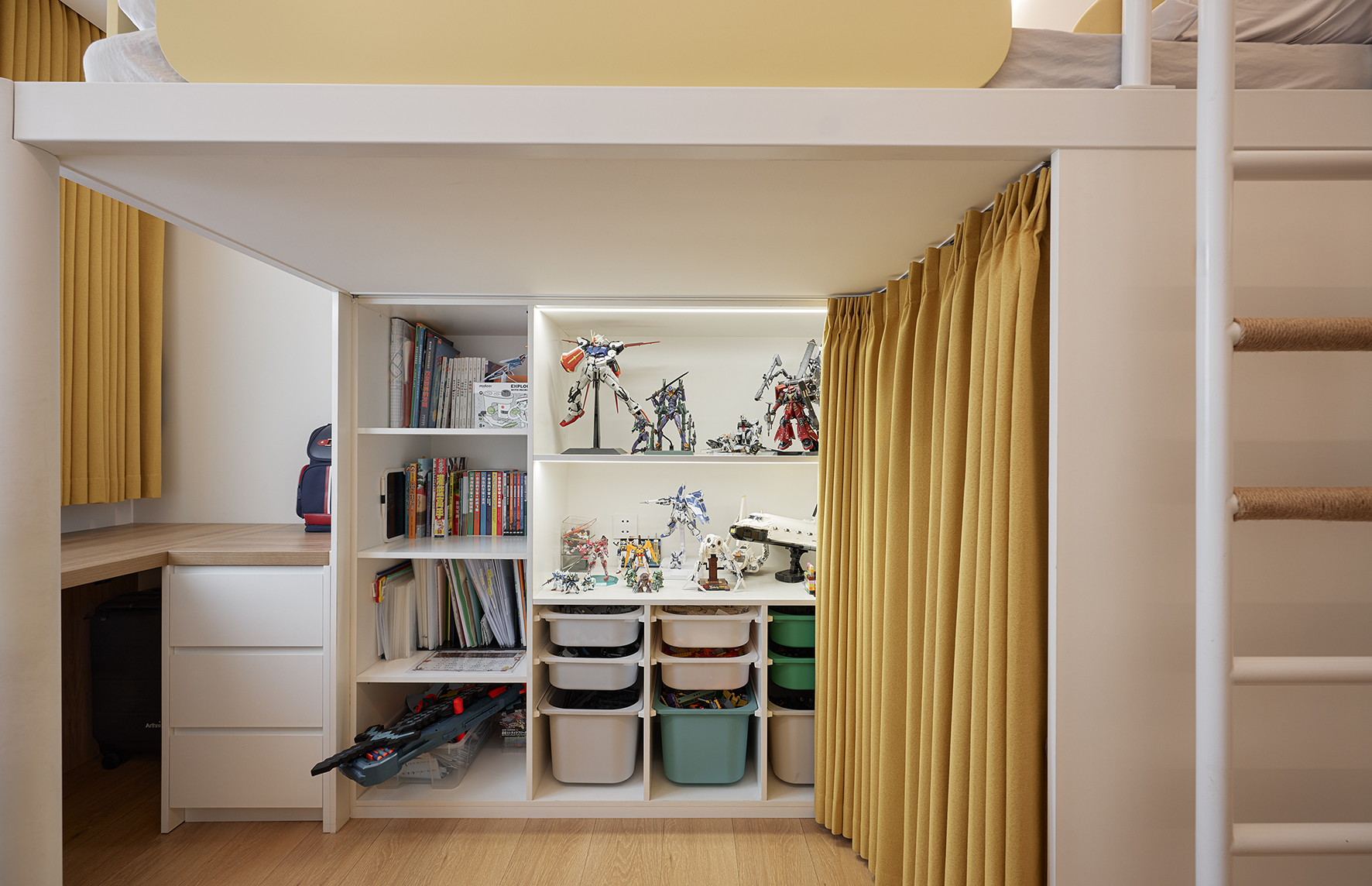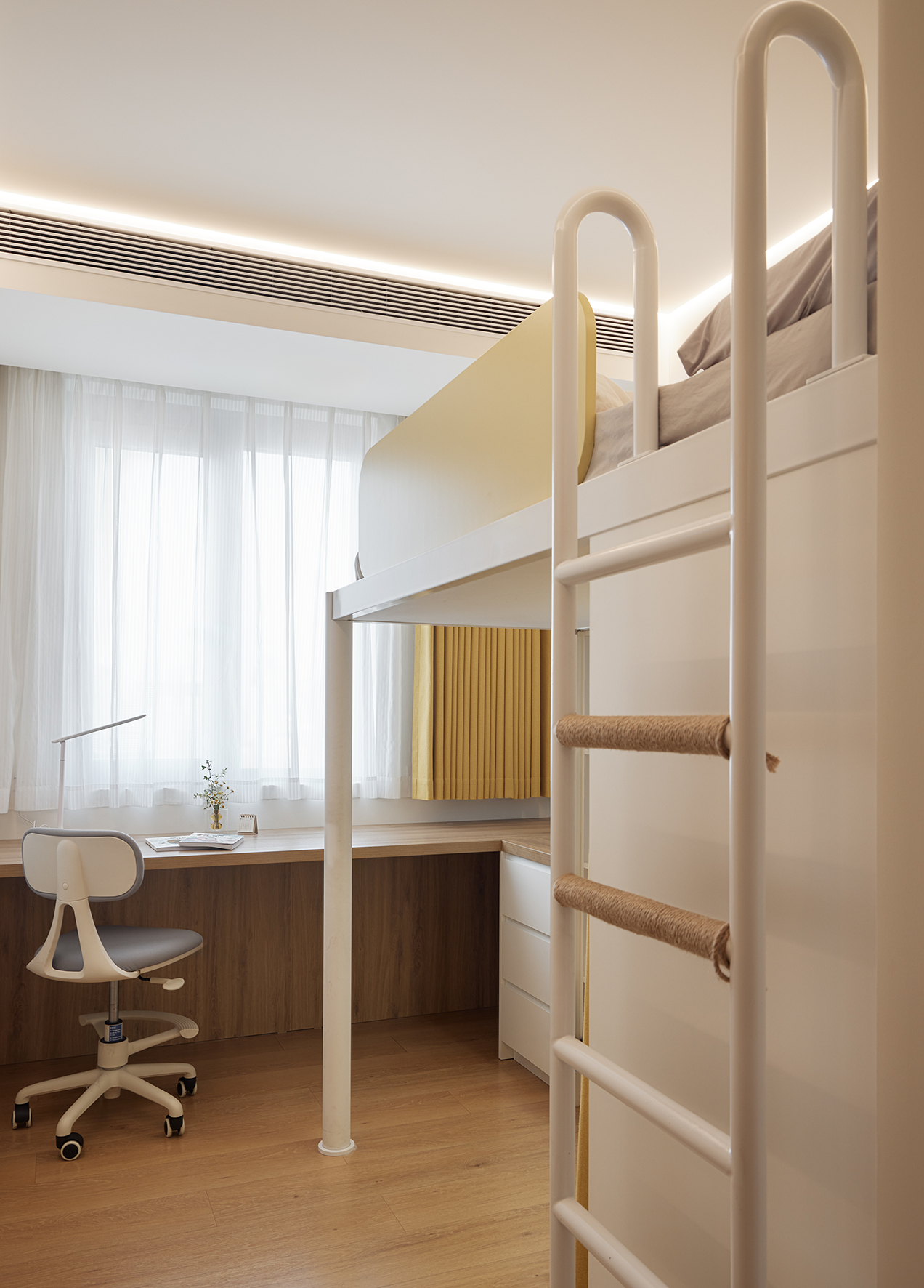 儿童房内的树屋与L型开放收纳柜选用环保且安全的材料,确保孩子的健康安全。书桌与边柜的设计,则充分利用了每一寸空间,为孩子提供了一个宽敞明亮的学习环境。卫生间则选用防滑易洁的地面材料,洗手台与镜子背后的收纳设计,既实用又美观。