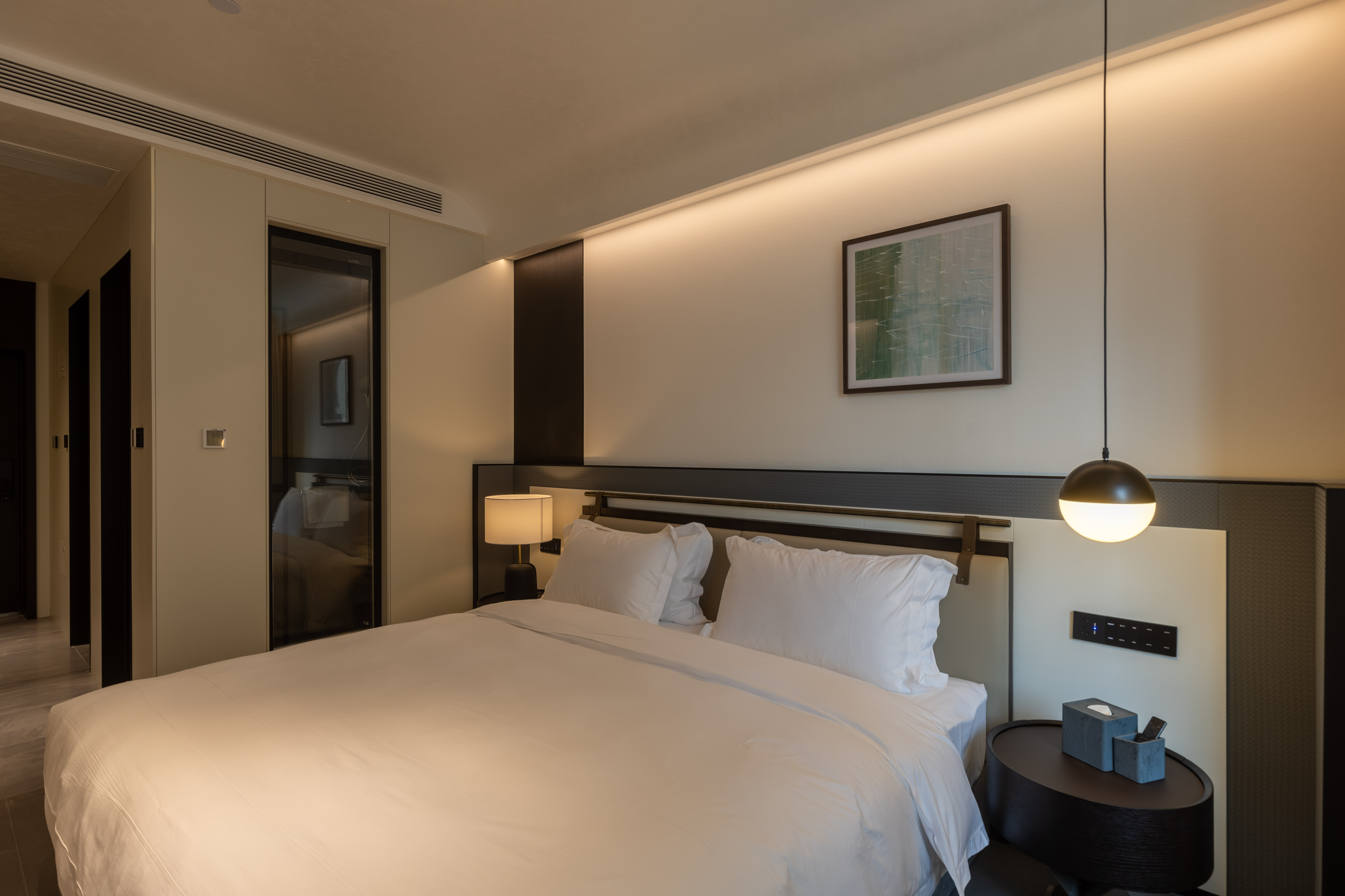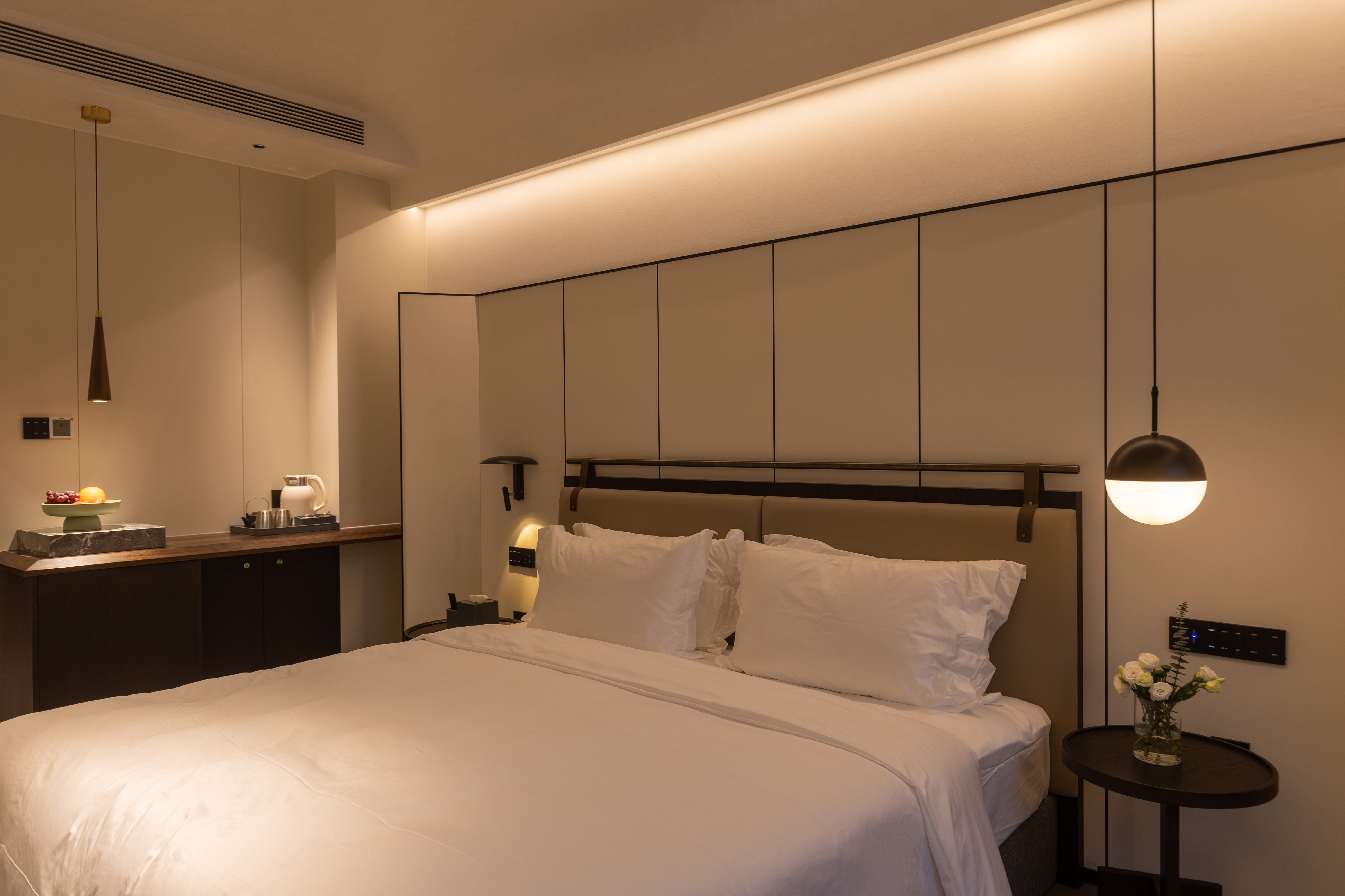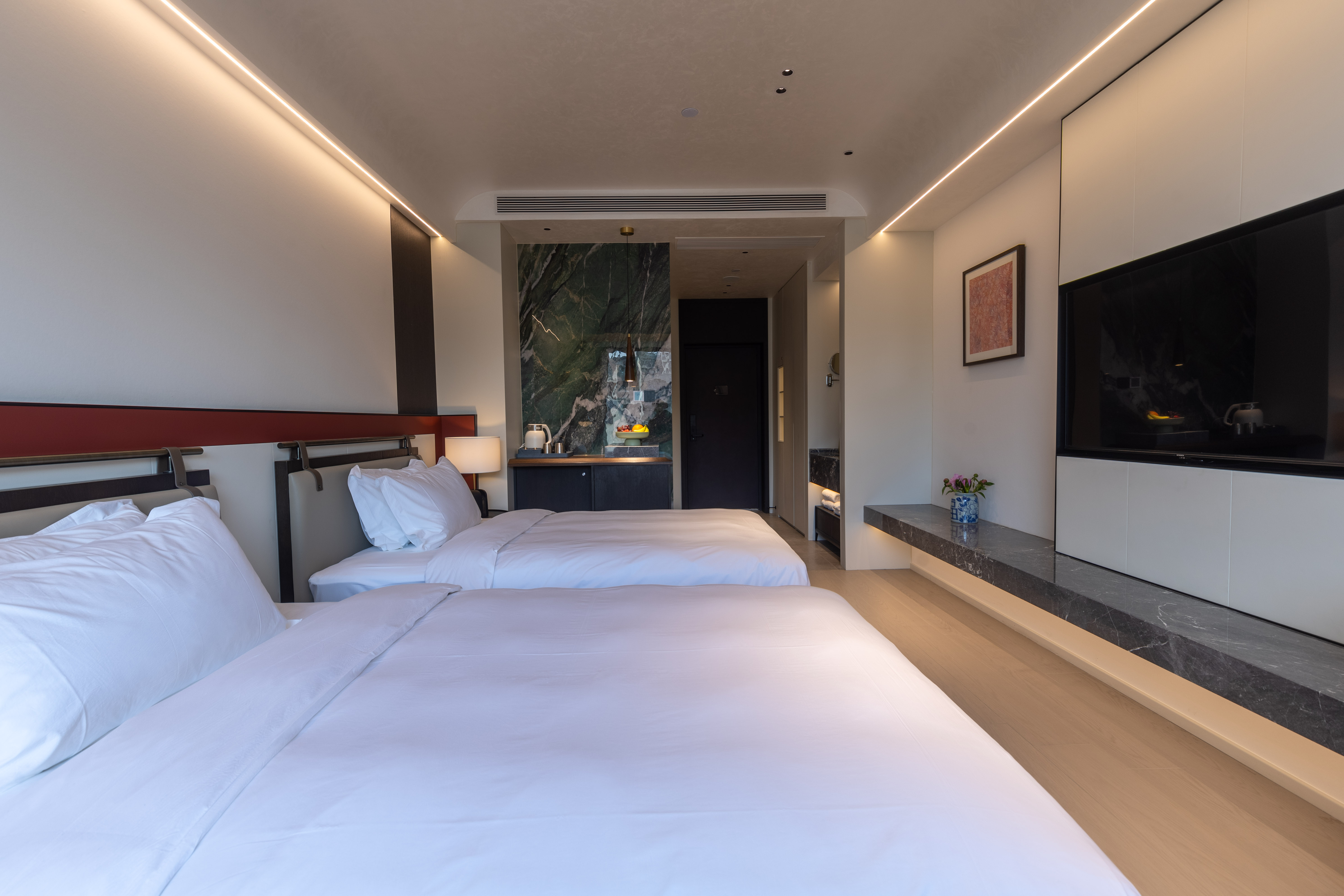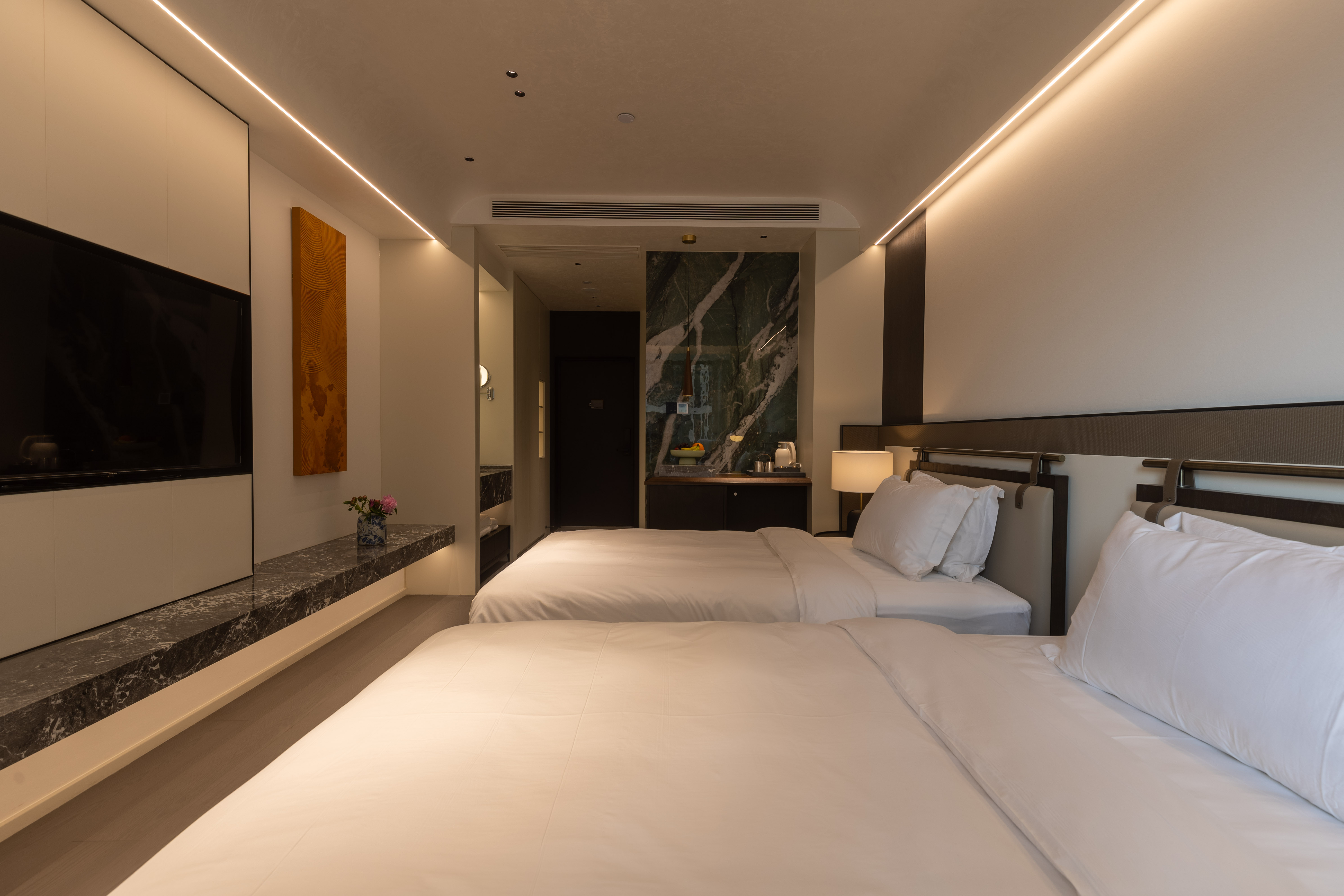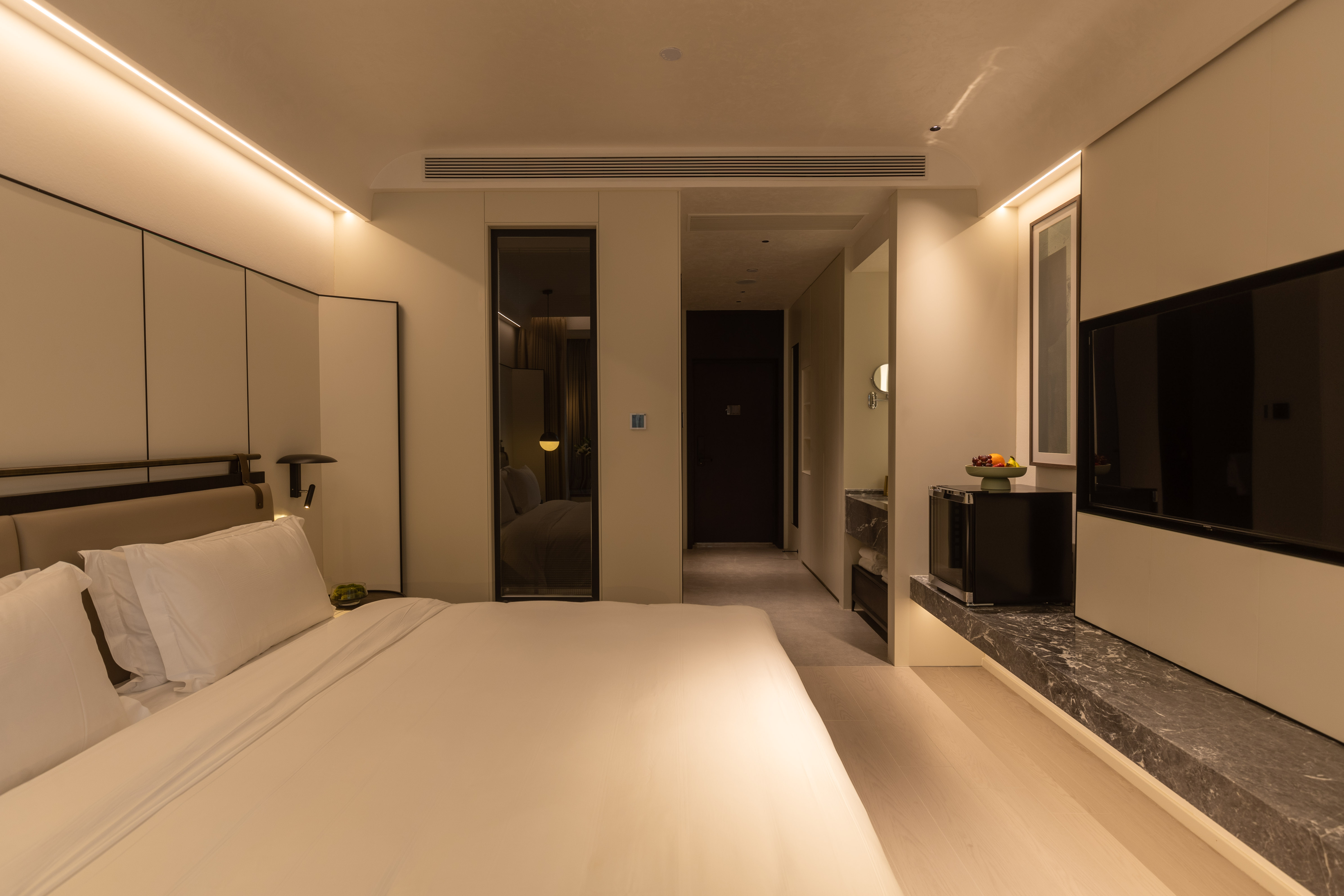 空间布局:西安古称“长安”,是十三朝古都,项目的地址距离大唐不夜城非常近,所以以现代雅致美学风来定位整体空间氛围。在结构中,保留了一个“会客厅”之外,还做了一些结构上的调整,调整出两个家庭套间,在卫生间的优化上,将洗漱空间外移至公共区域,原有空间仅保留马桶和淋浴功能,床头采用木质和皮质的包覆,倍感品质。