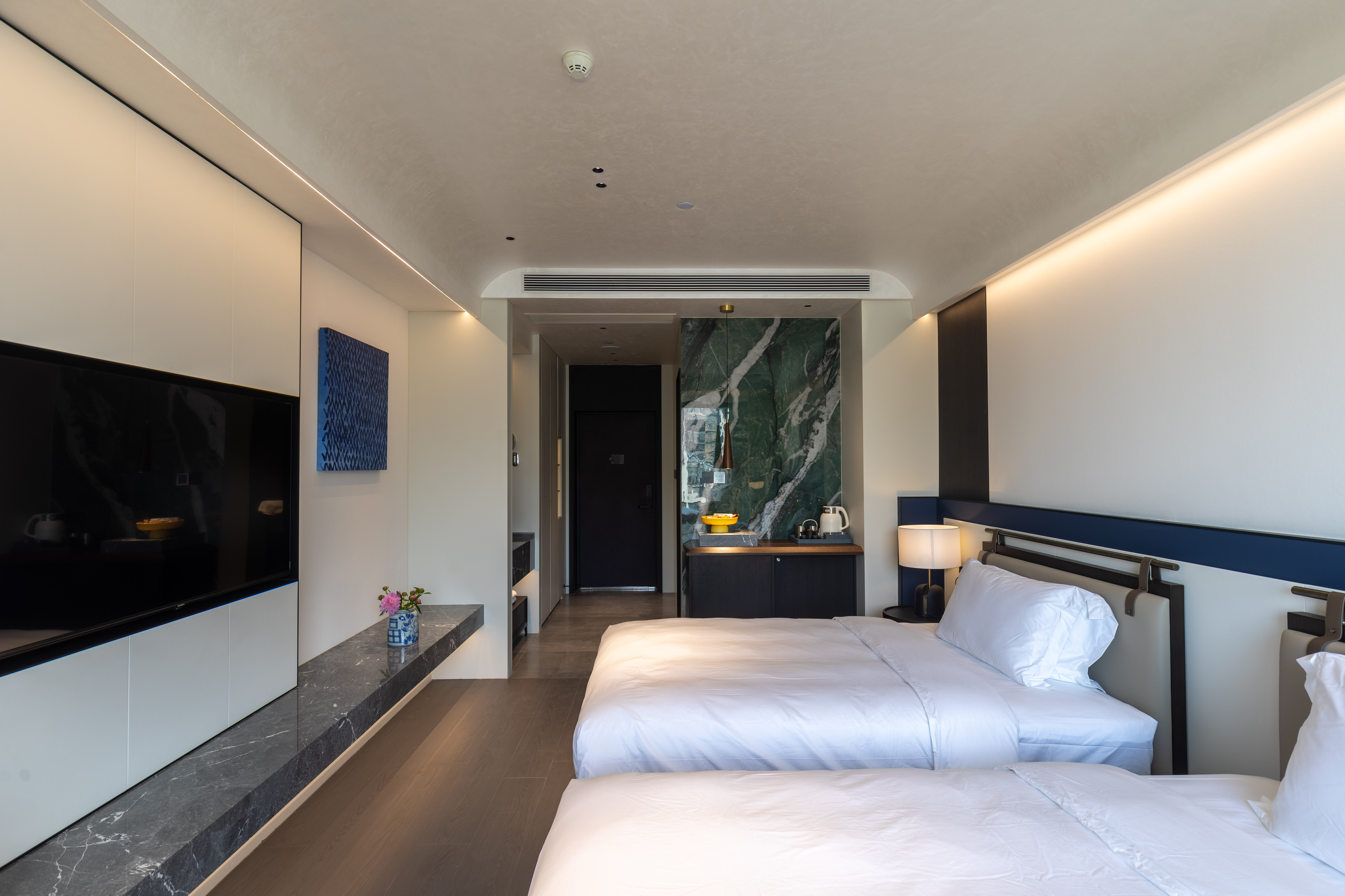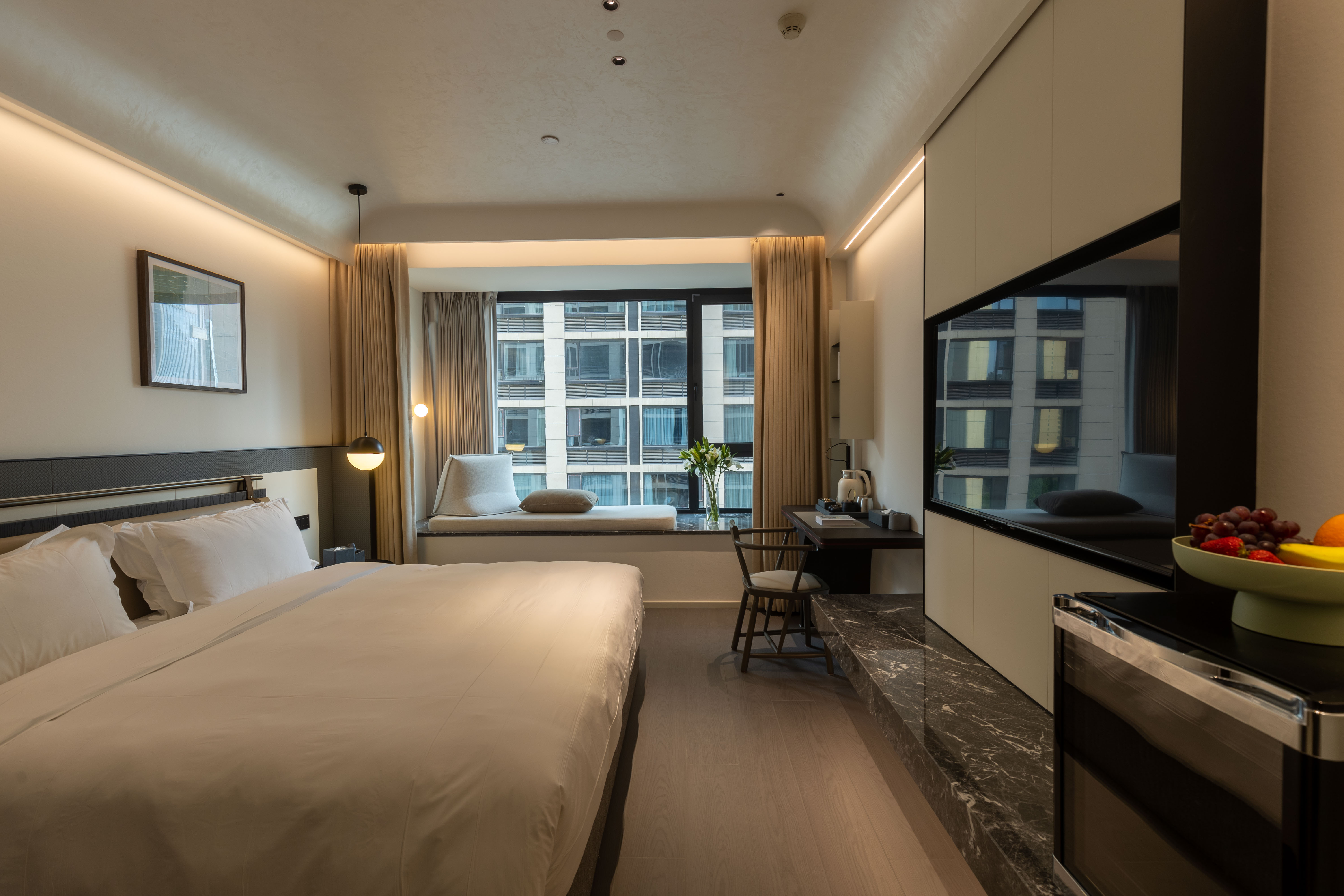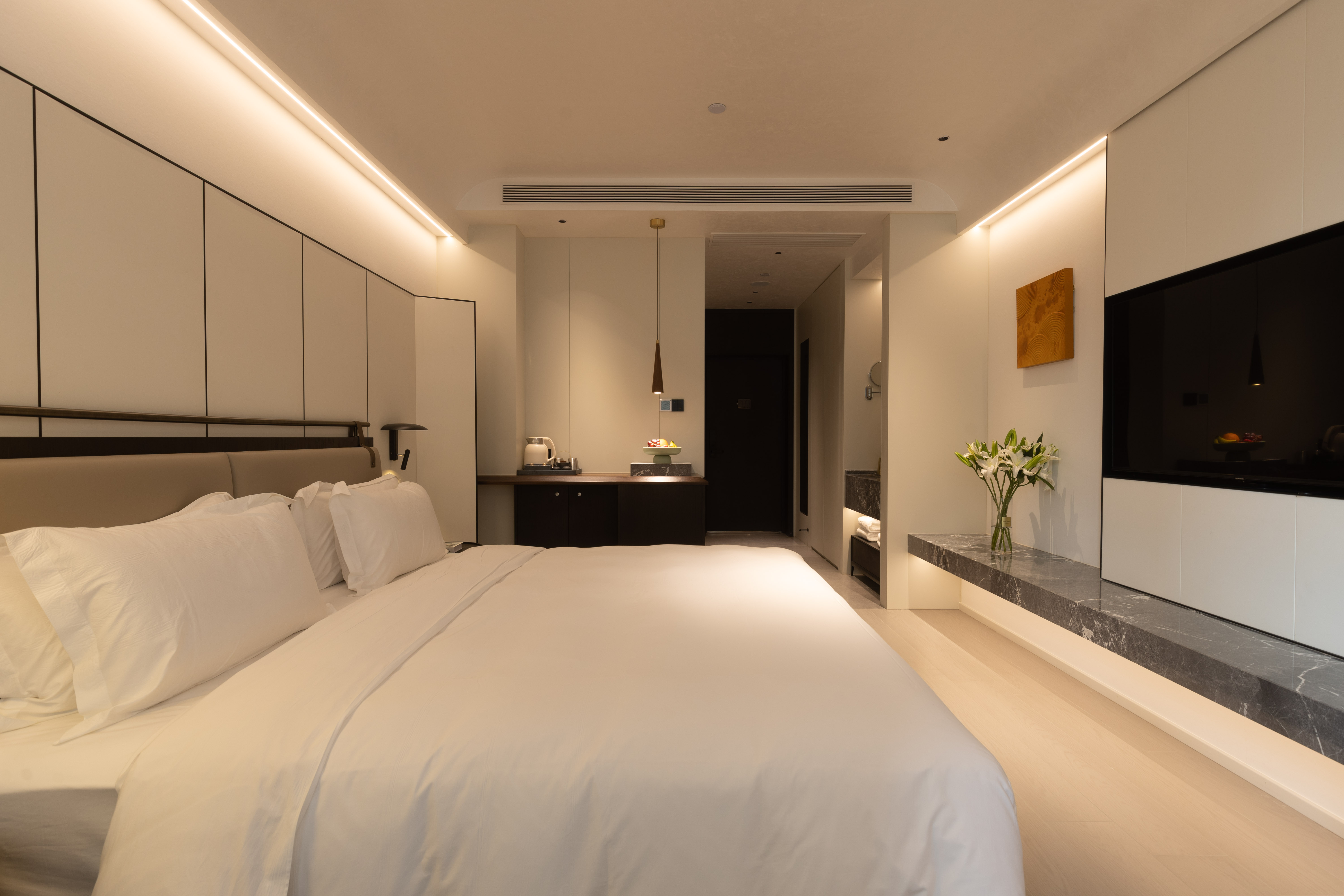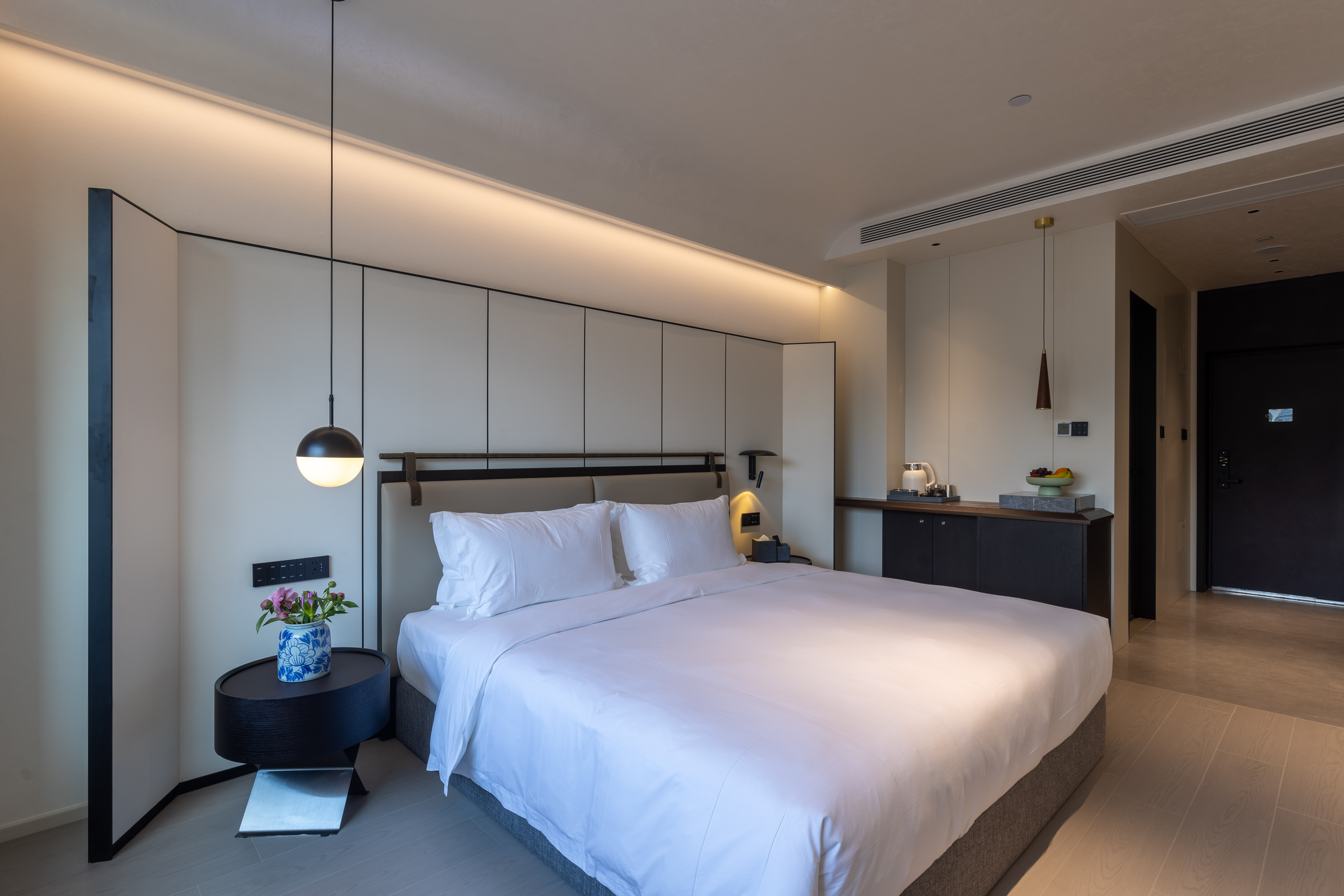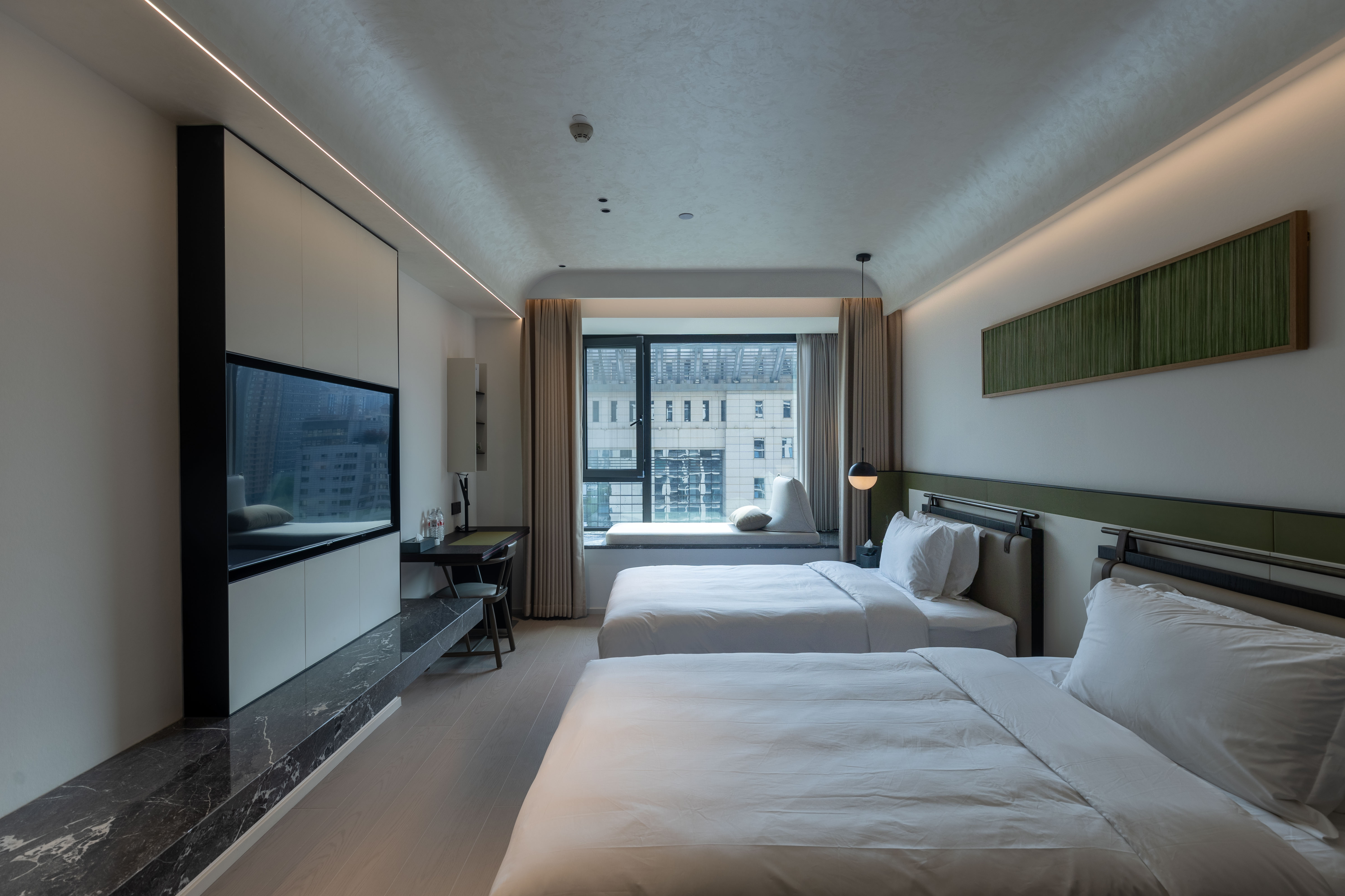 空间布局:西安古称“长安”,是十三朝古都,项目的地址距离大唐不夜城非常近,所以以现代雅致美学风来定位整体空间氛围。在结构中,保留了一个“会客厅”之外,还做了一些结构上的调整,调整出两个家庭套间,在卫生间的优化上,将洗漱空间外移至公共区域,原有空间仅保留马桶和淋浴功能,床头采用木质和皮质的包覆,倍感品质。