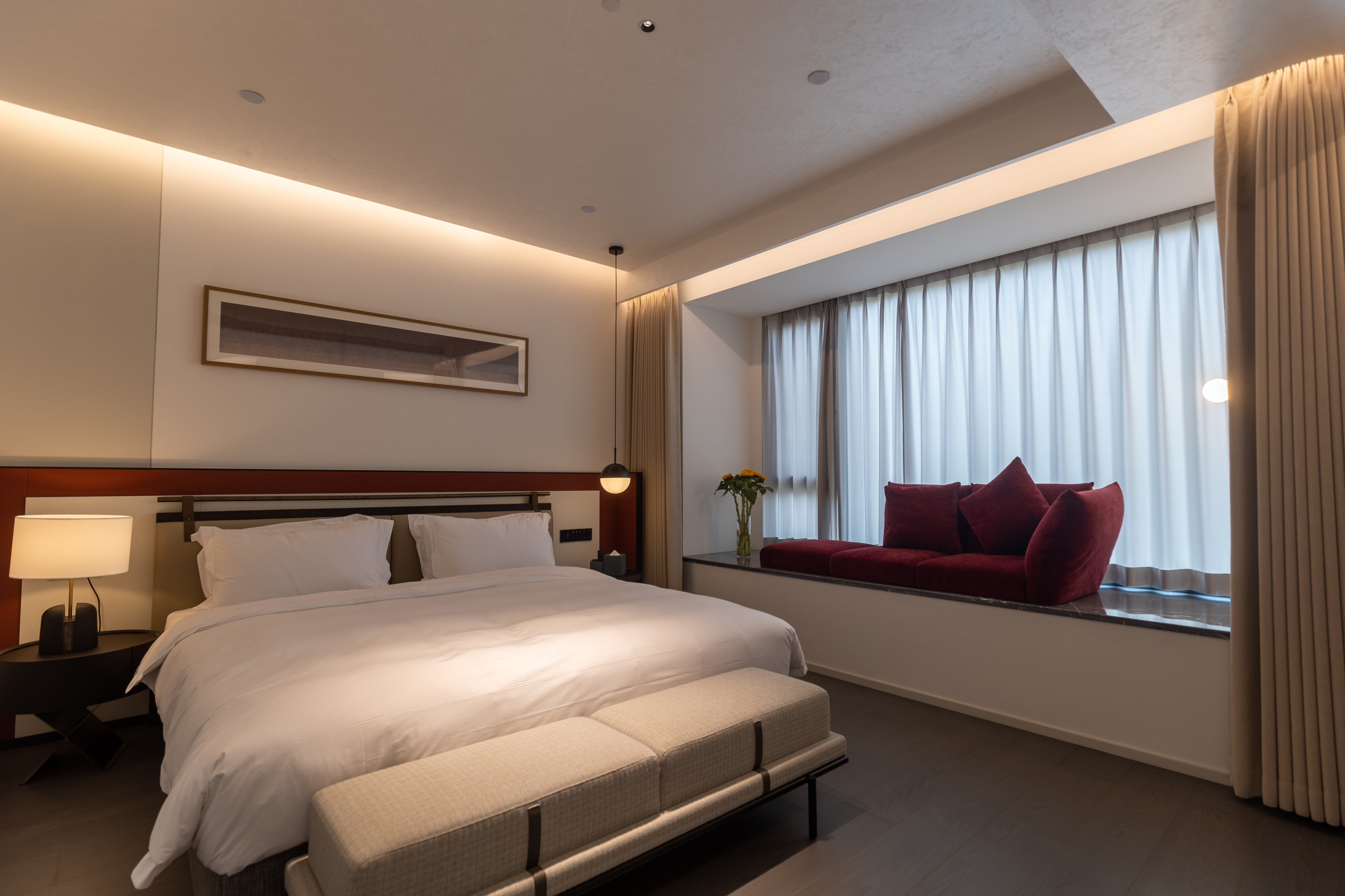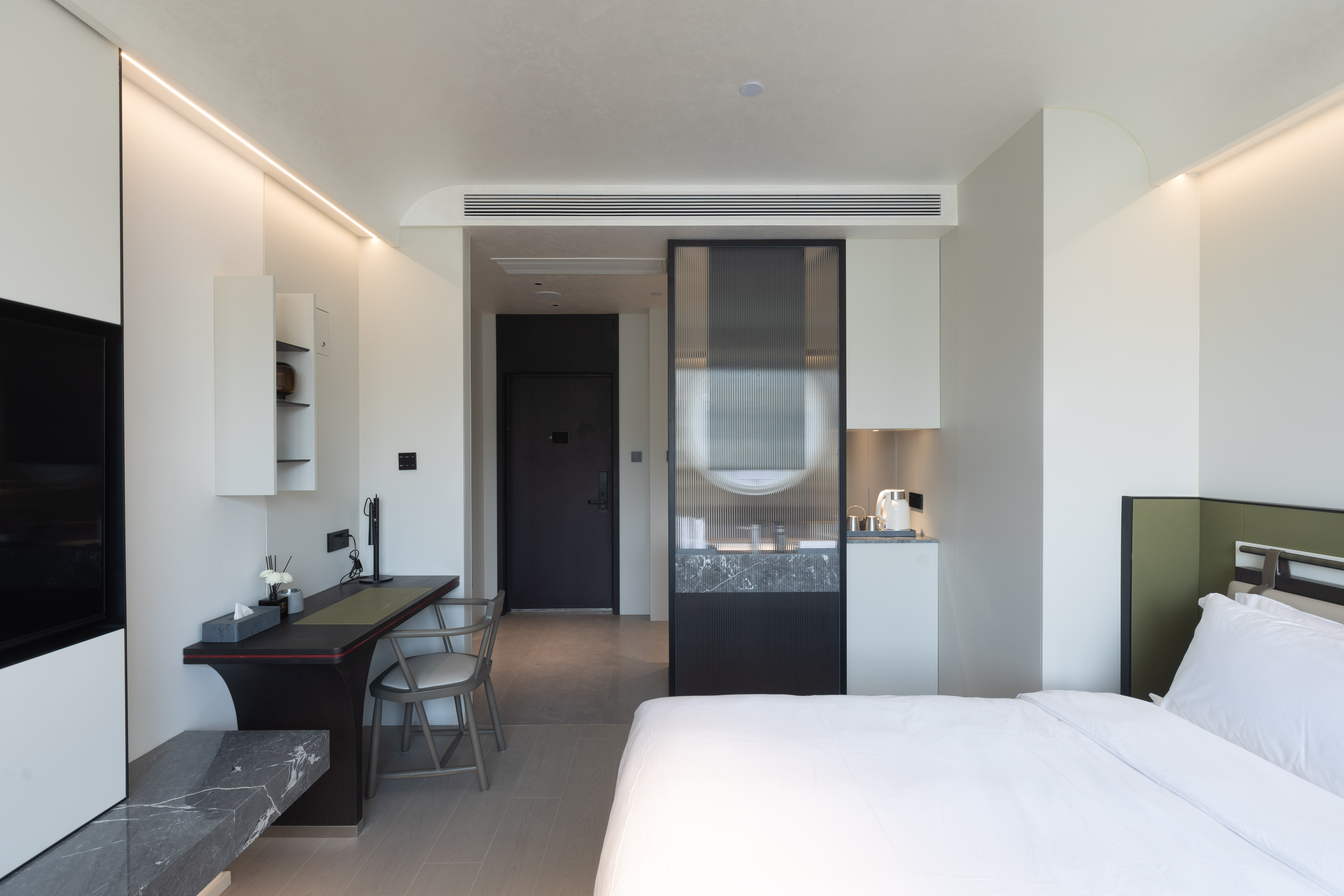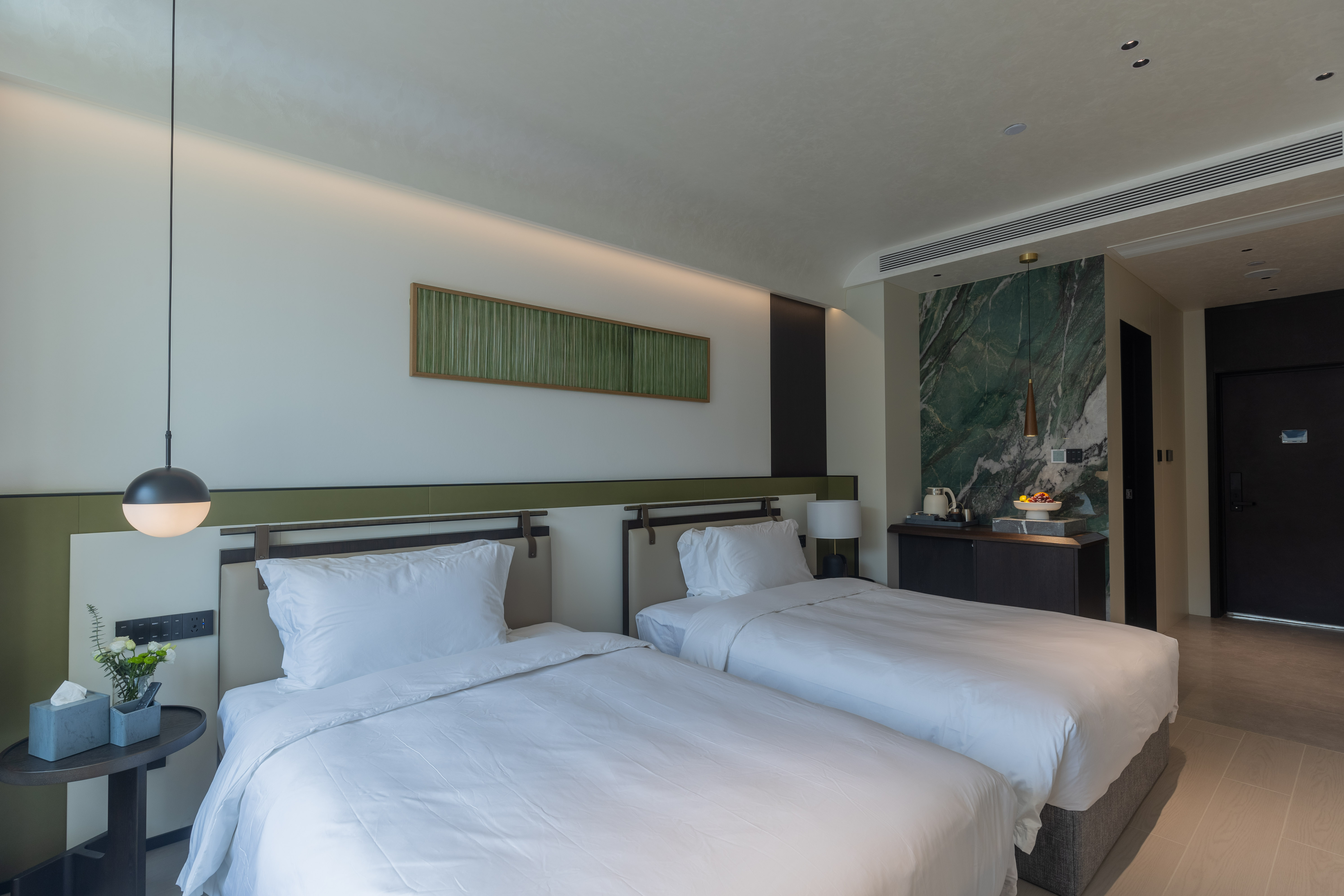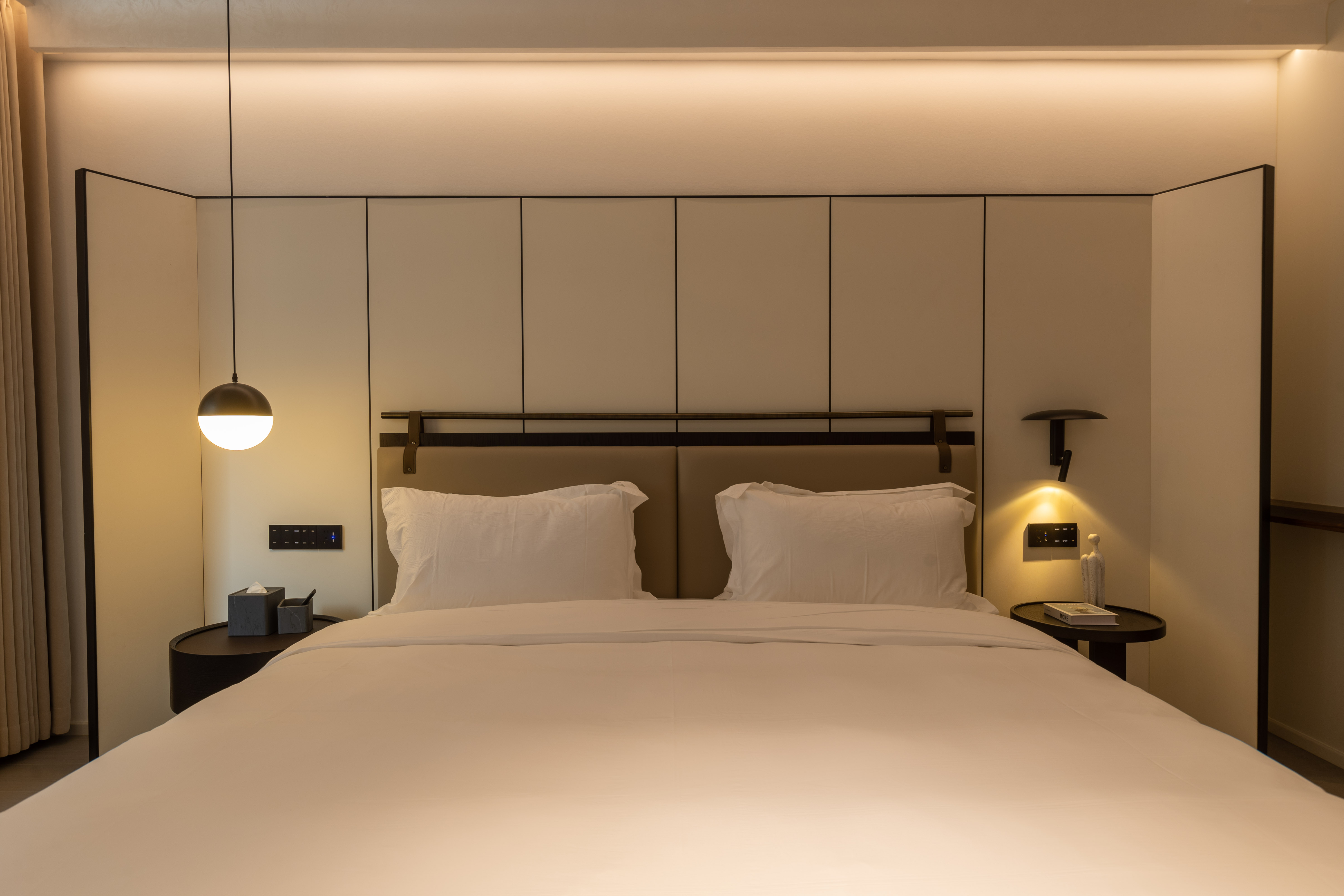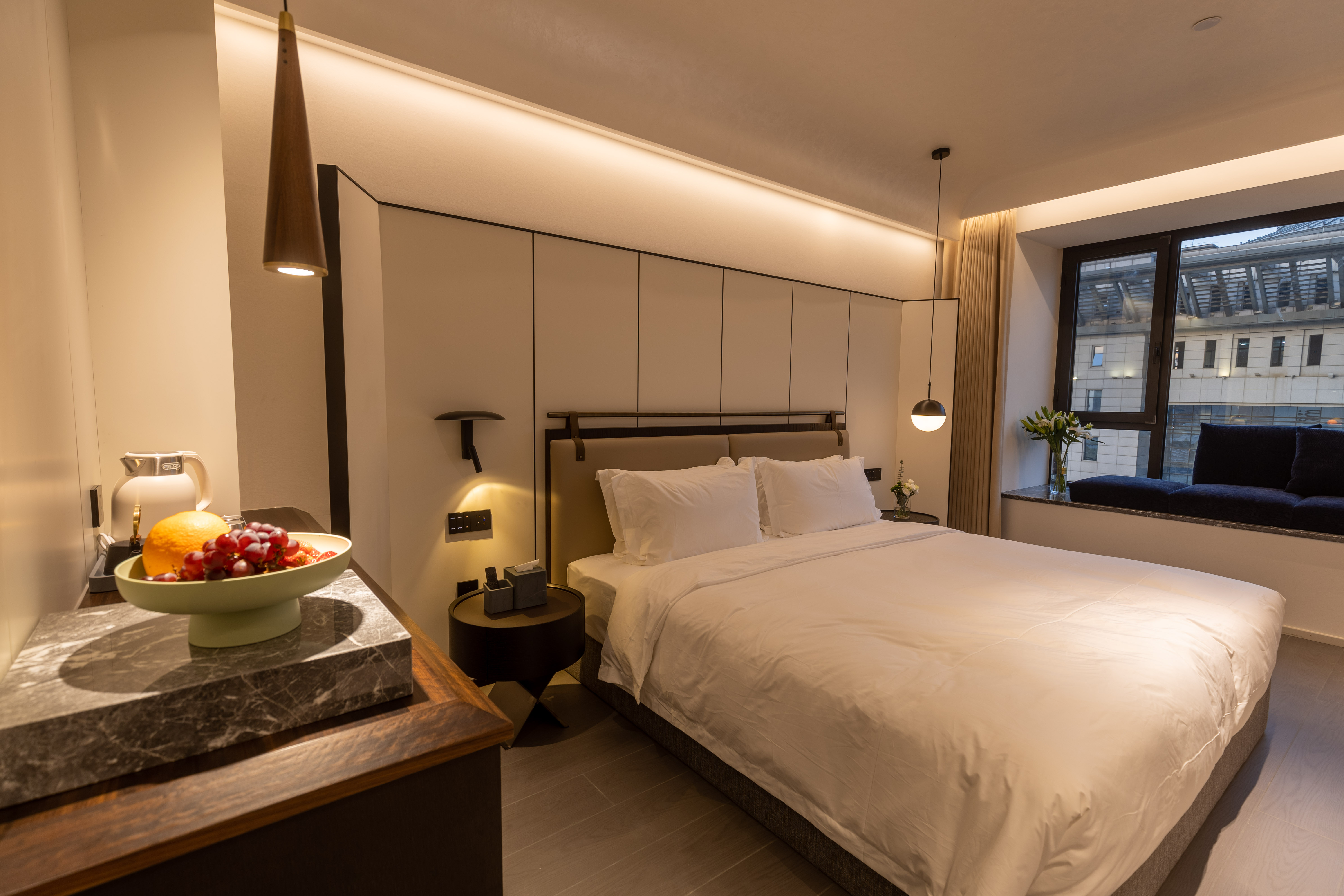 空间布局:西安古称“长安”,是十三朝古都,项目的地址距离大唐不夜城非常近,所以以现代雅致美学风来定位整体空间氛围。在结构中,保留了一个“会客厅”之外,还做了一些结构上的调整,调整出两个家庭套间,在卫生间的优化上,将洗漱空间外移至公共区域,原有空间仅保留马桶和淋浴功能,床头采用木质和皮质的包覆,倍感品质。