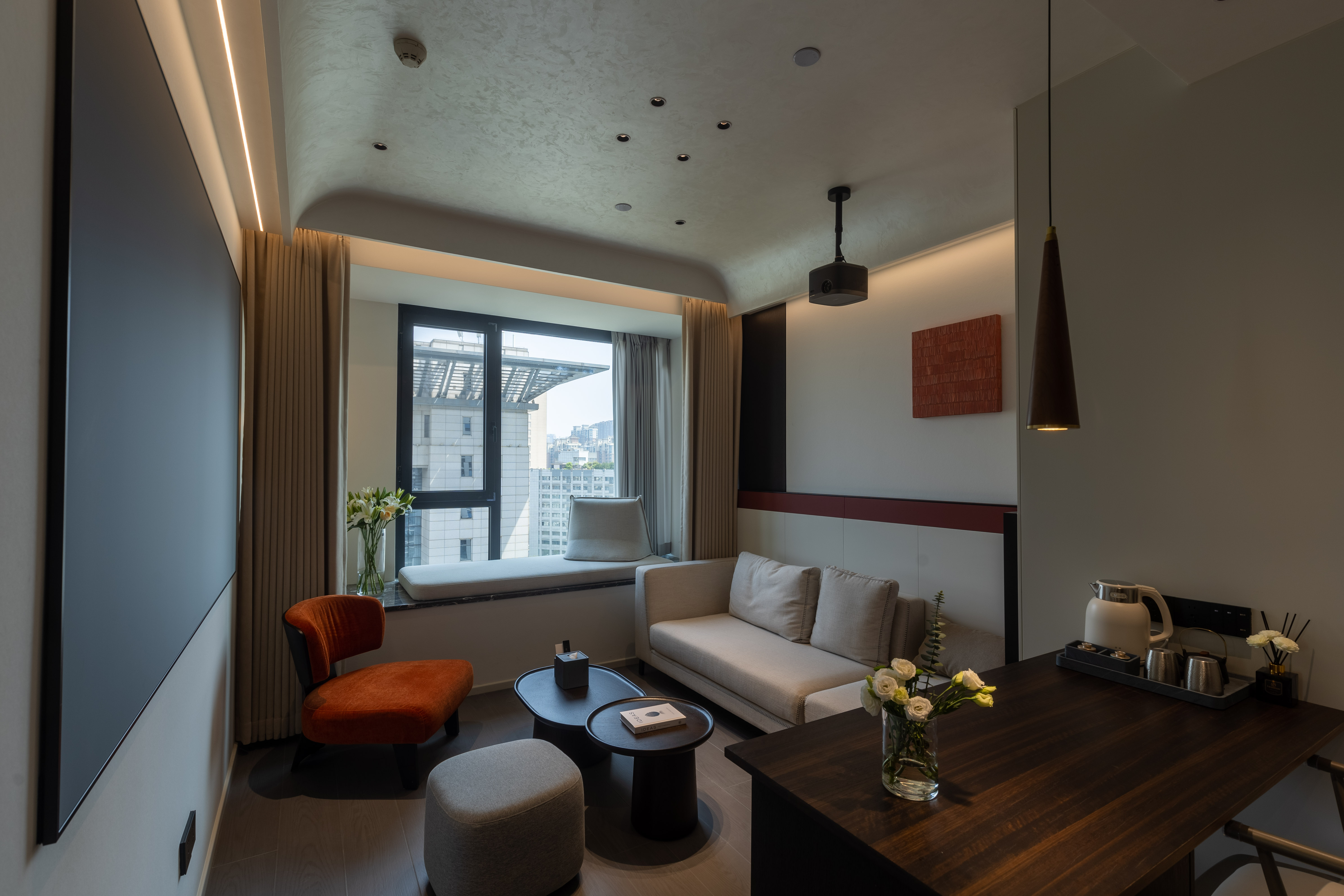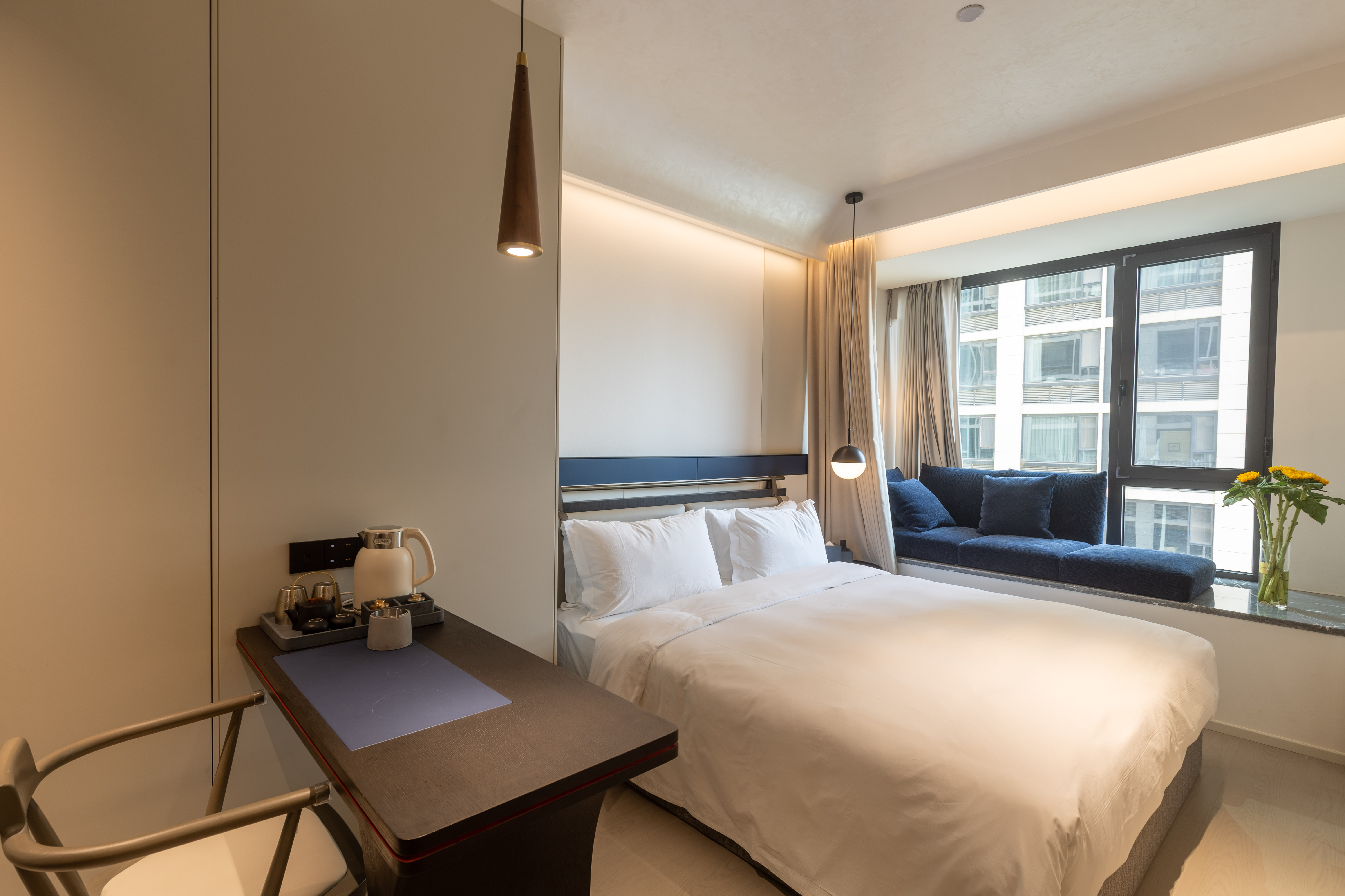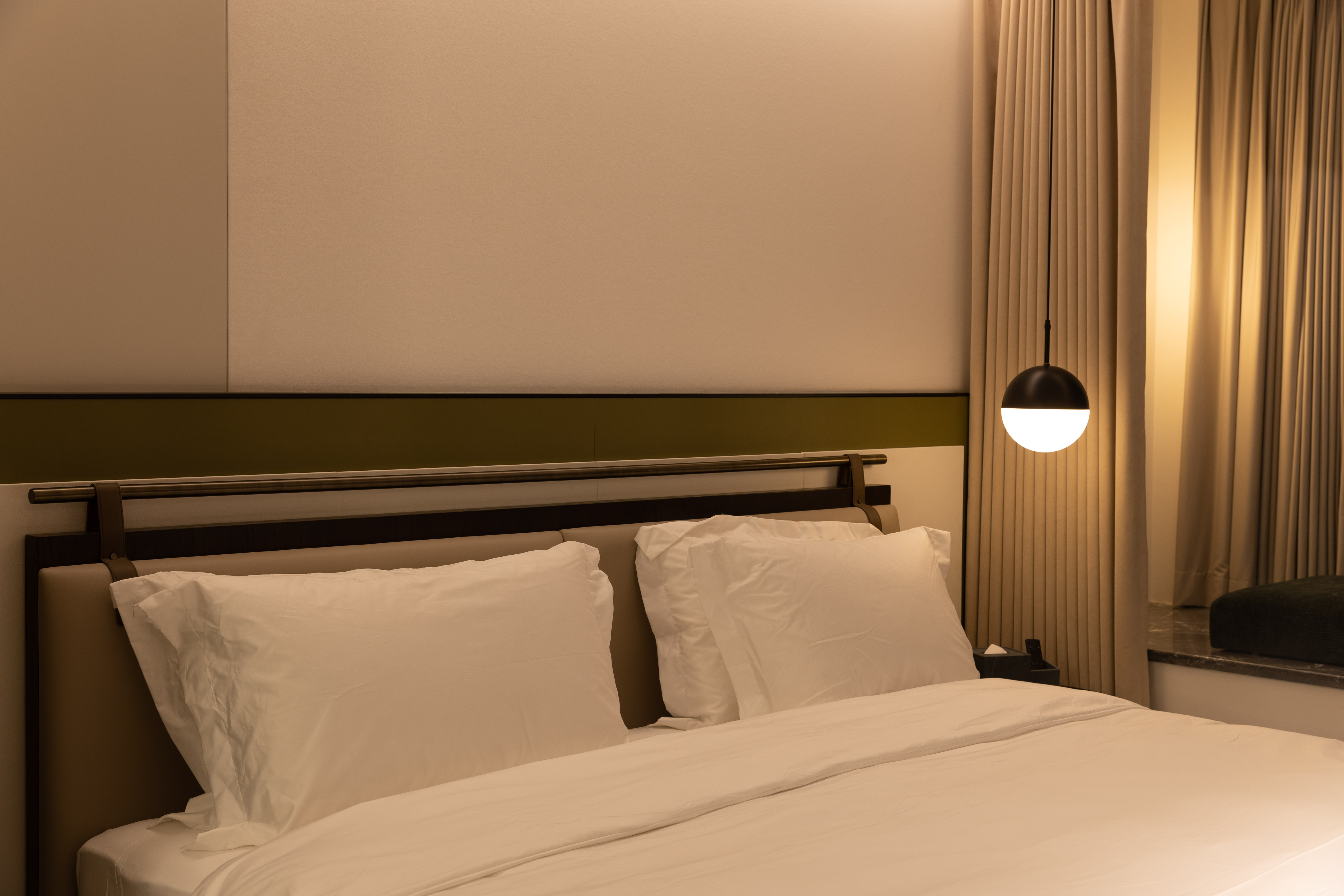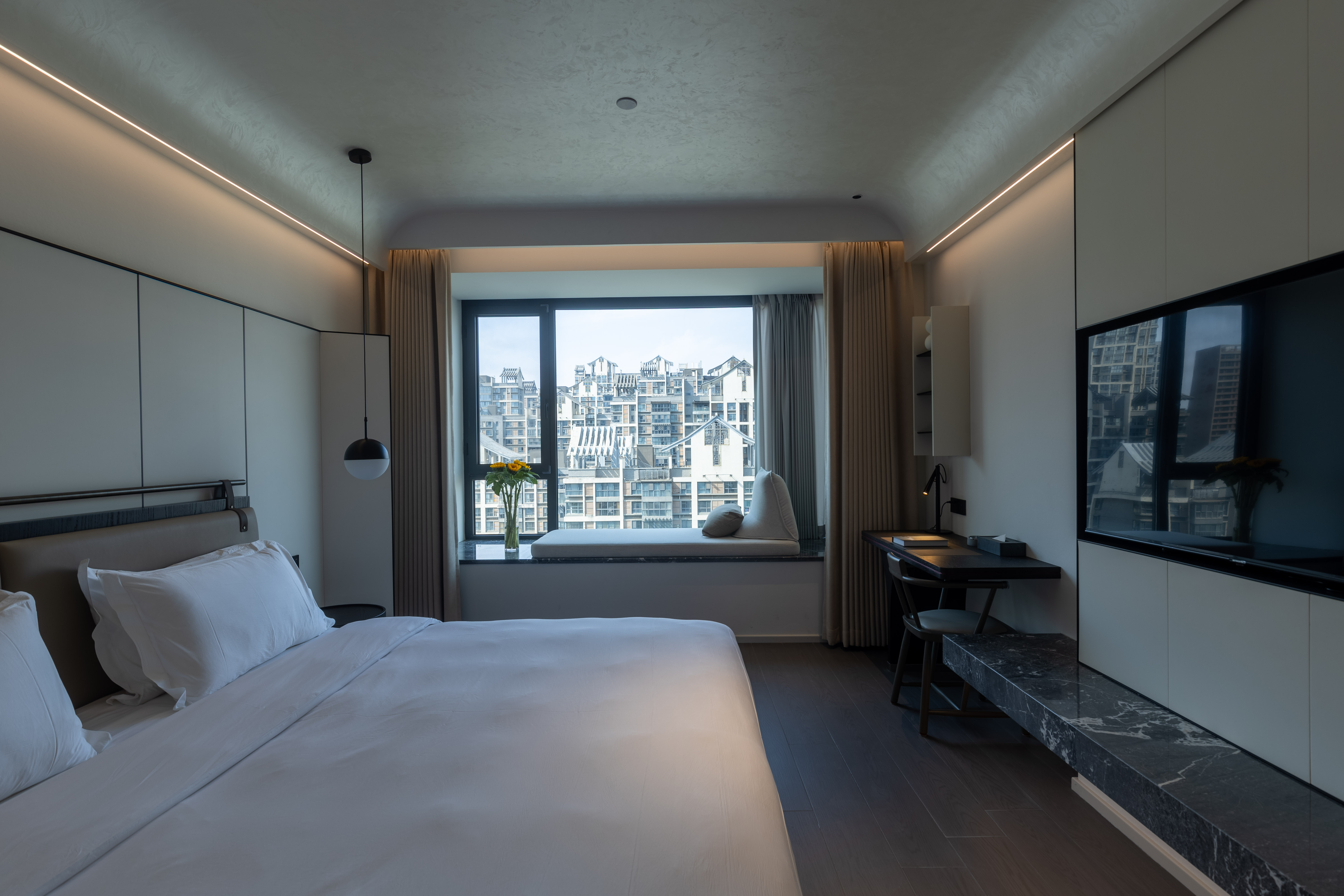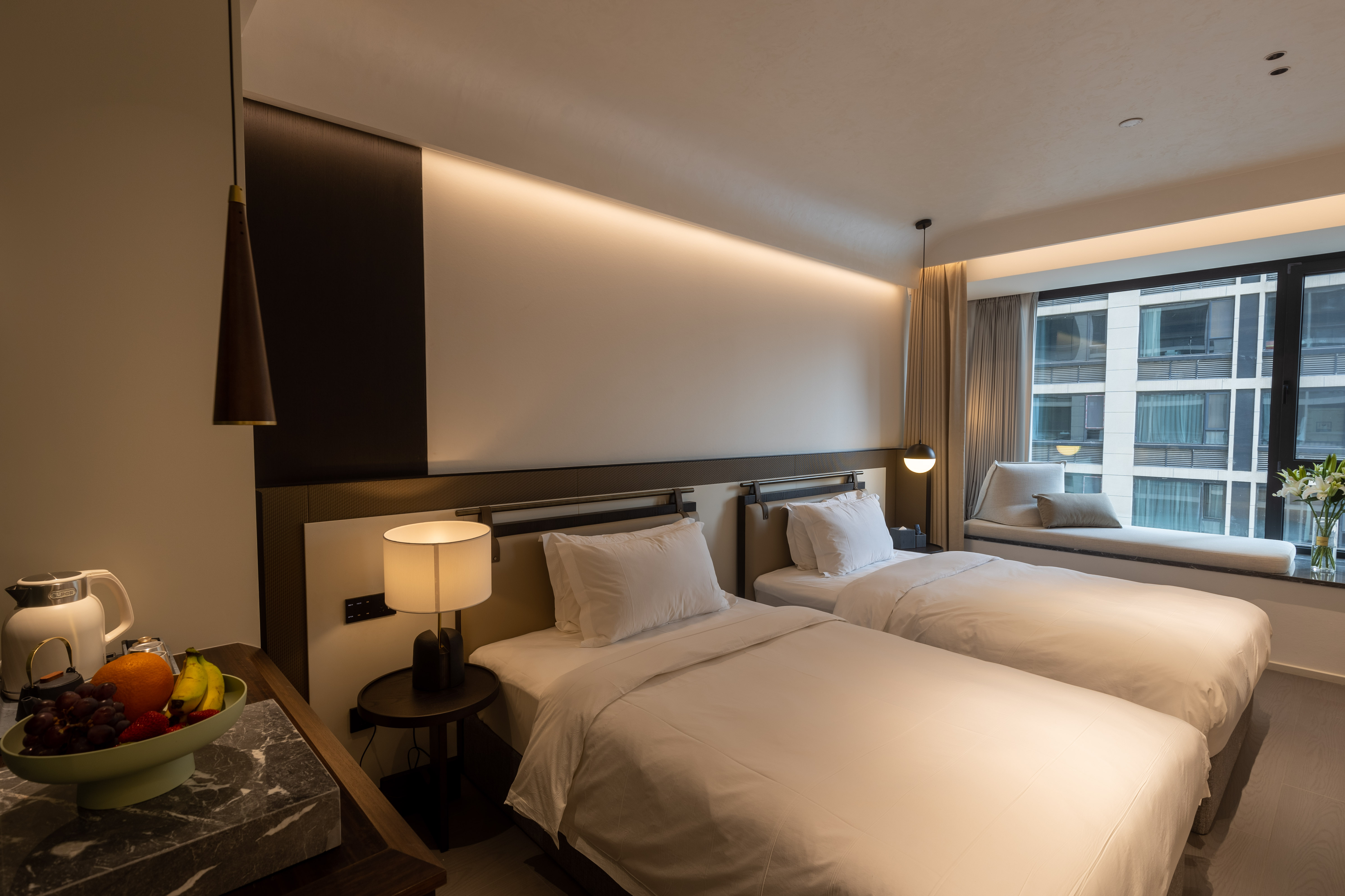 空间布局:西安古称“长安”,是十三朝古都,项目的地址距离大唐不夜城非常近,所以以现代雅致美学风来定位整体空间氛围。在结构中,保留了一个“会客厅”之外,还做了一些结构上的调整,调整出两个家庭套间,在卫生间的优化上,将洗漱空间外移至公共区域,原有空间仅保留马桶和淋浴功能,床头采用木质和皮质的包覆,倍感品质。