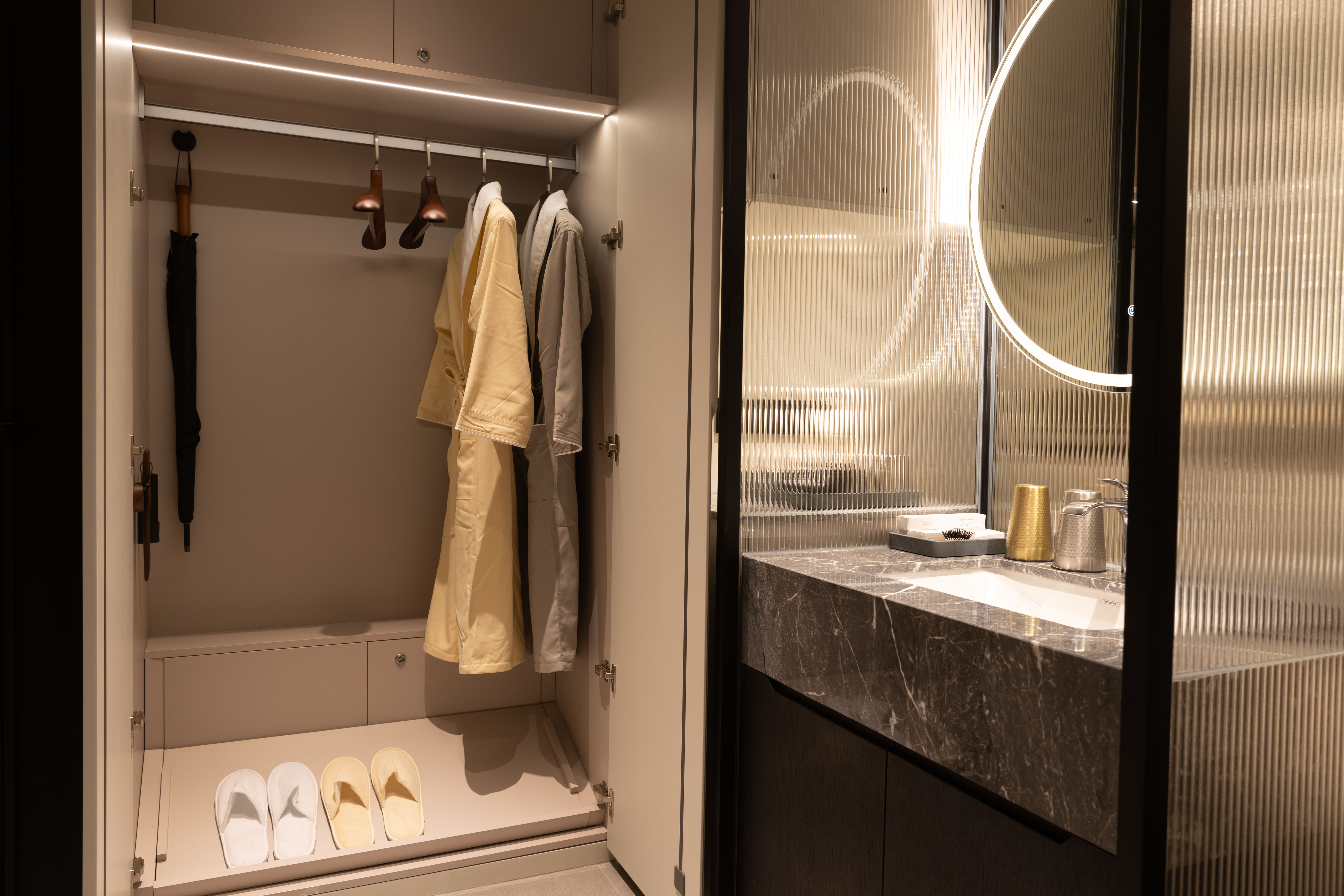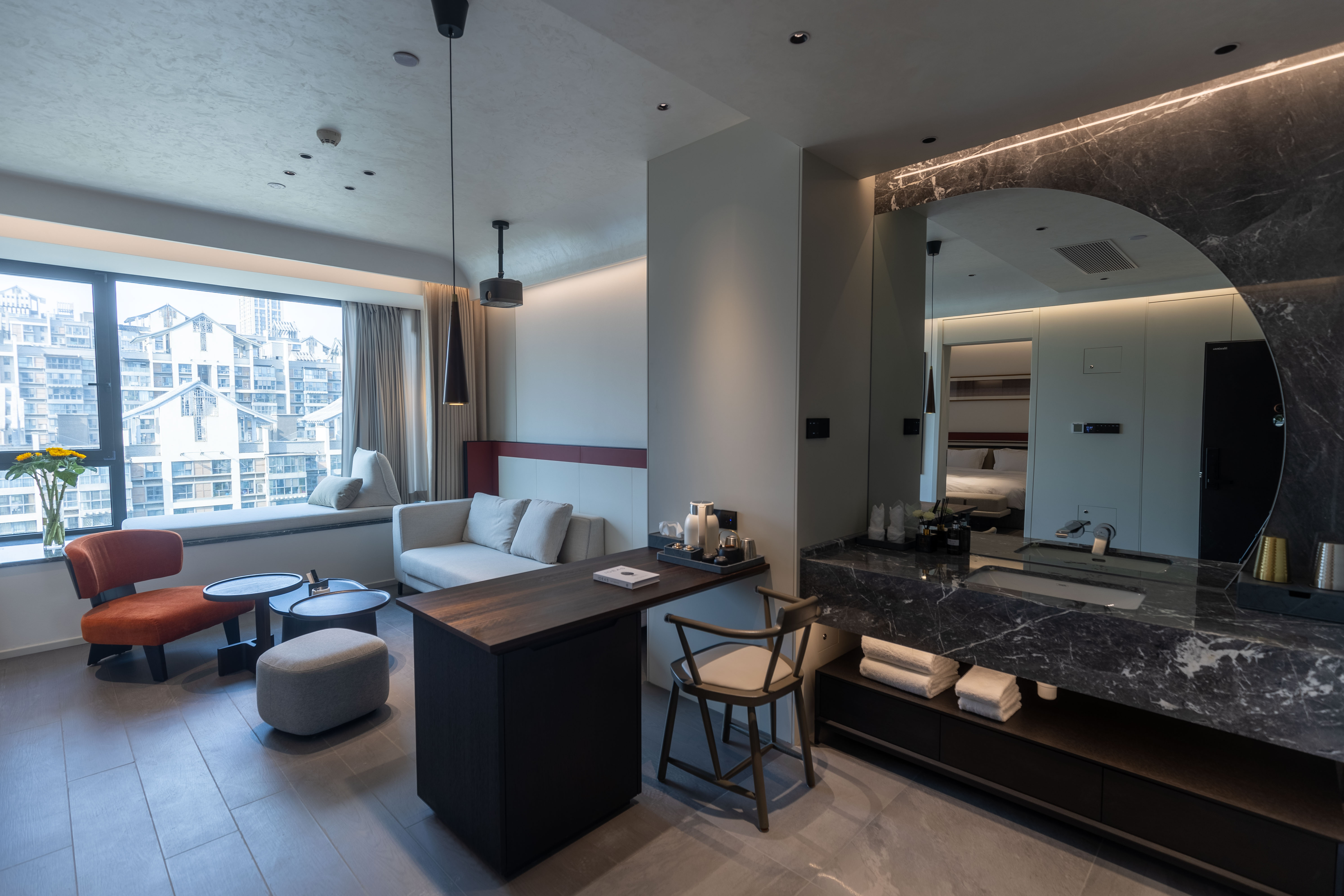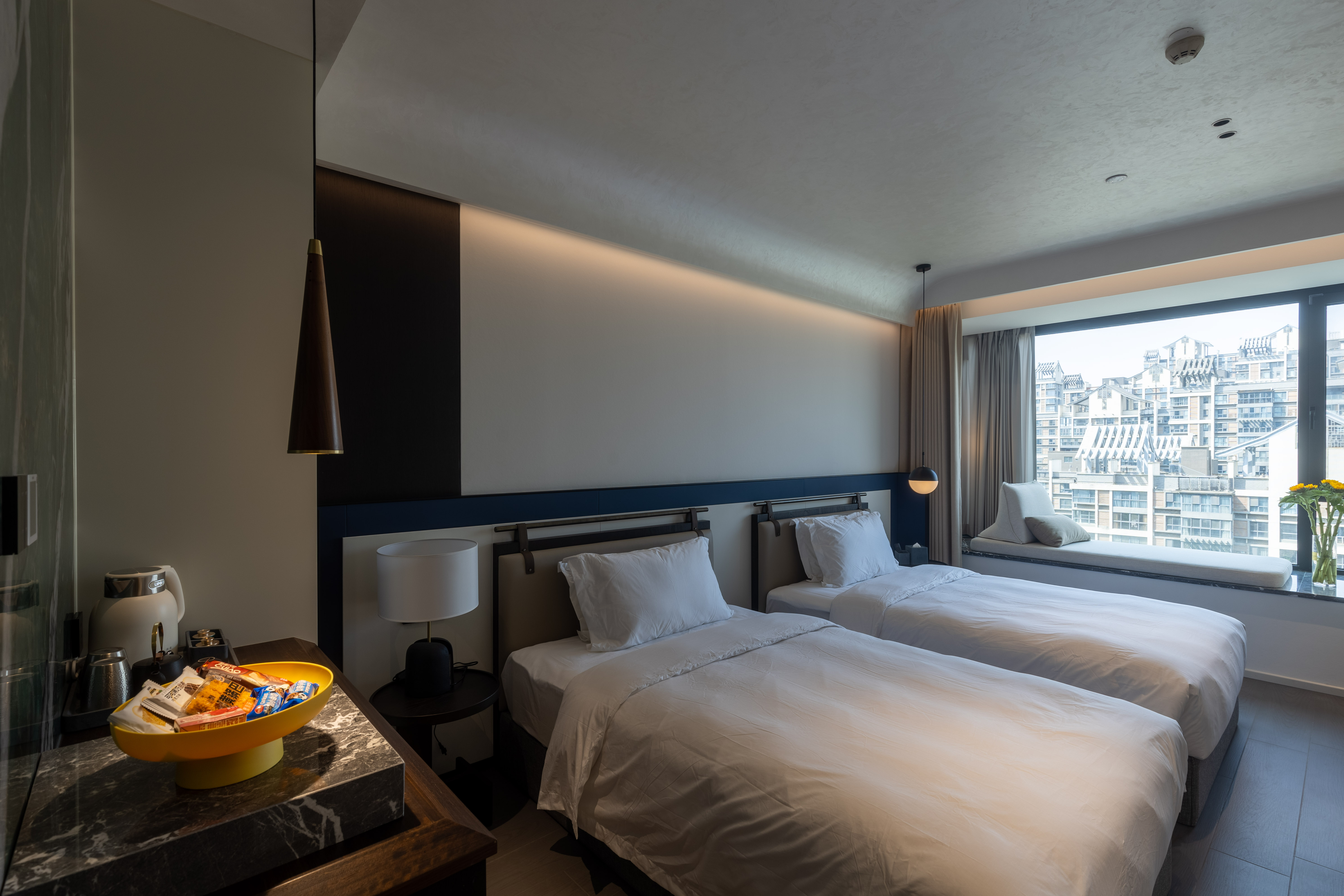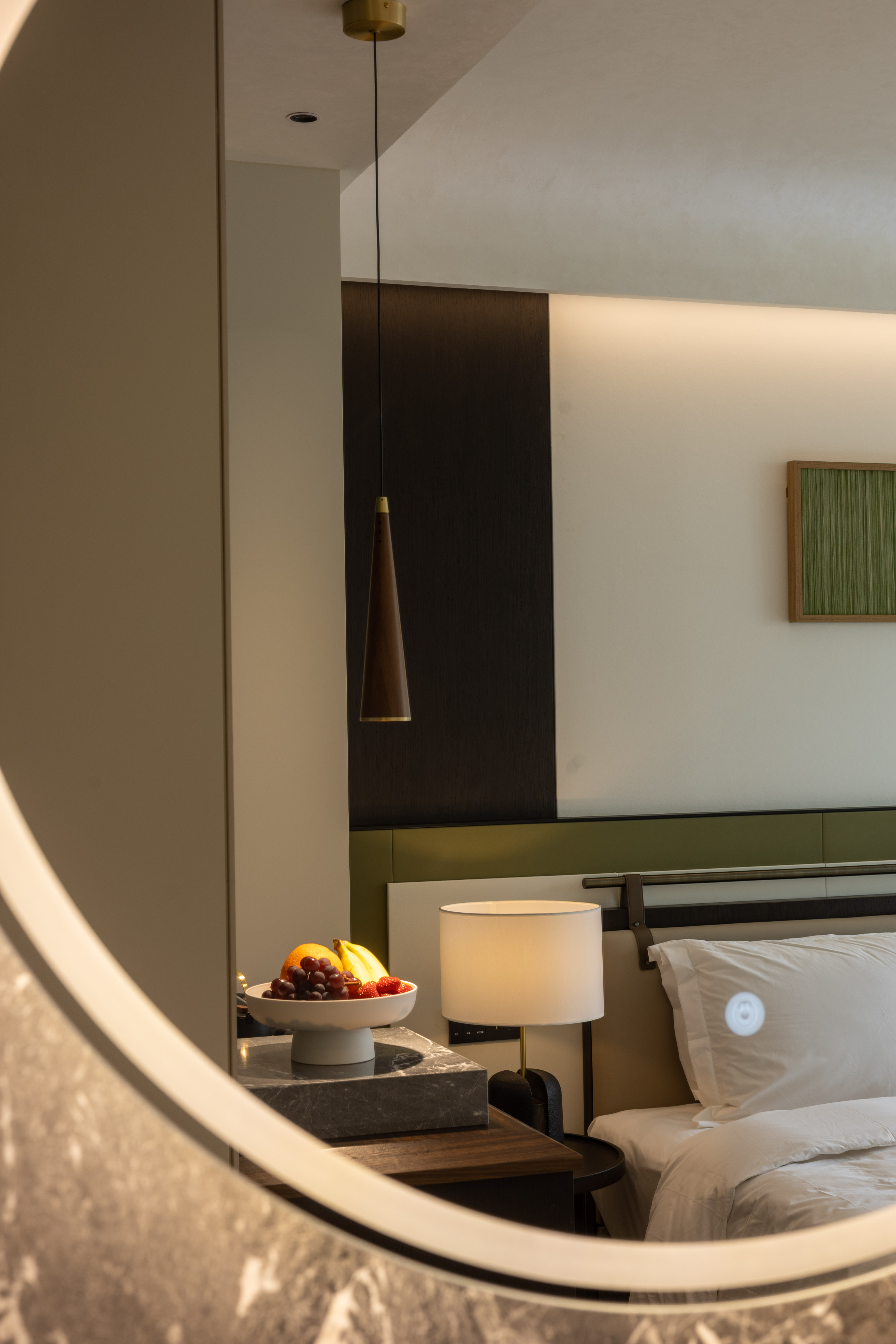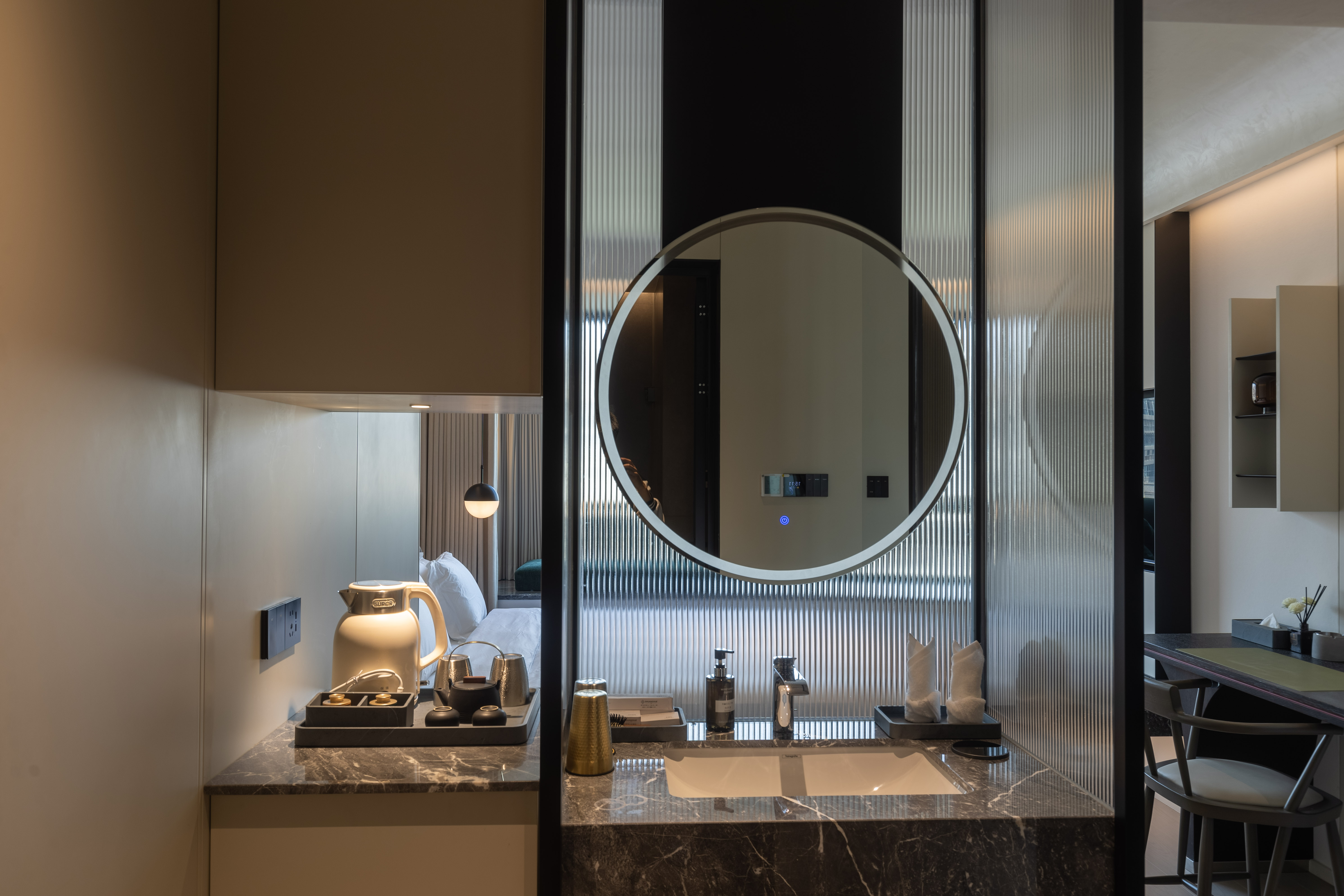 空间布局:西安古称“长安”,是十三朝古都,项目的地址距离大唐不夜城非常近,所以以现代雅致美学风来定位整体空间氛围。在结构中,保留了一个“会客厅”之外,还做了一些结构上的调整,调整出两个家庭套间,在卫生间的优化上,将洗漱空间外移至公共区域,原有空间仅保留马桶和淋浴功能,床头采用木质和皮质的包覆,倍感品质。