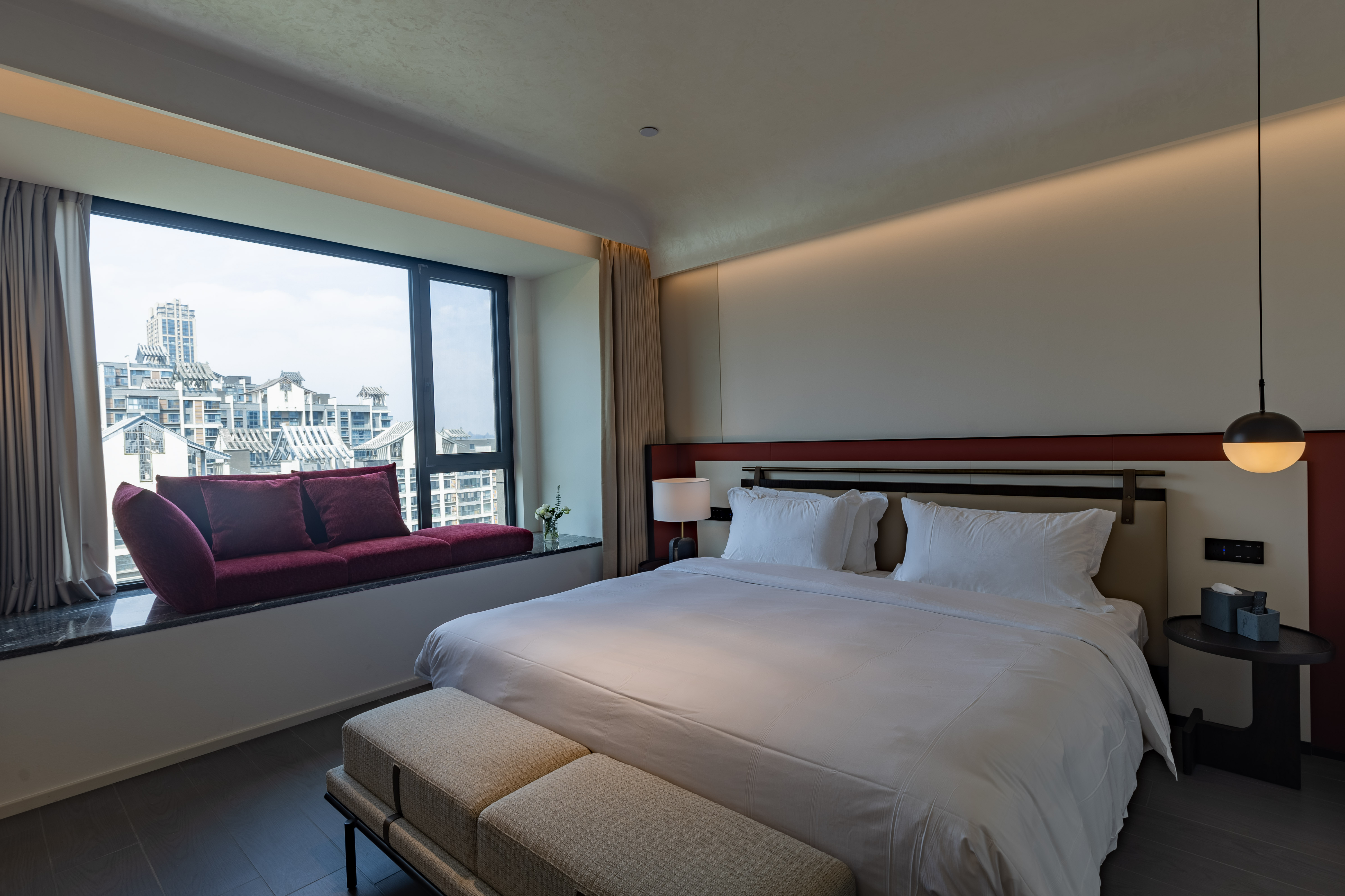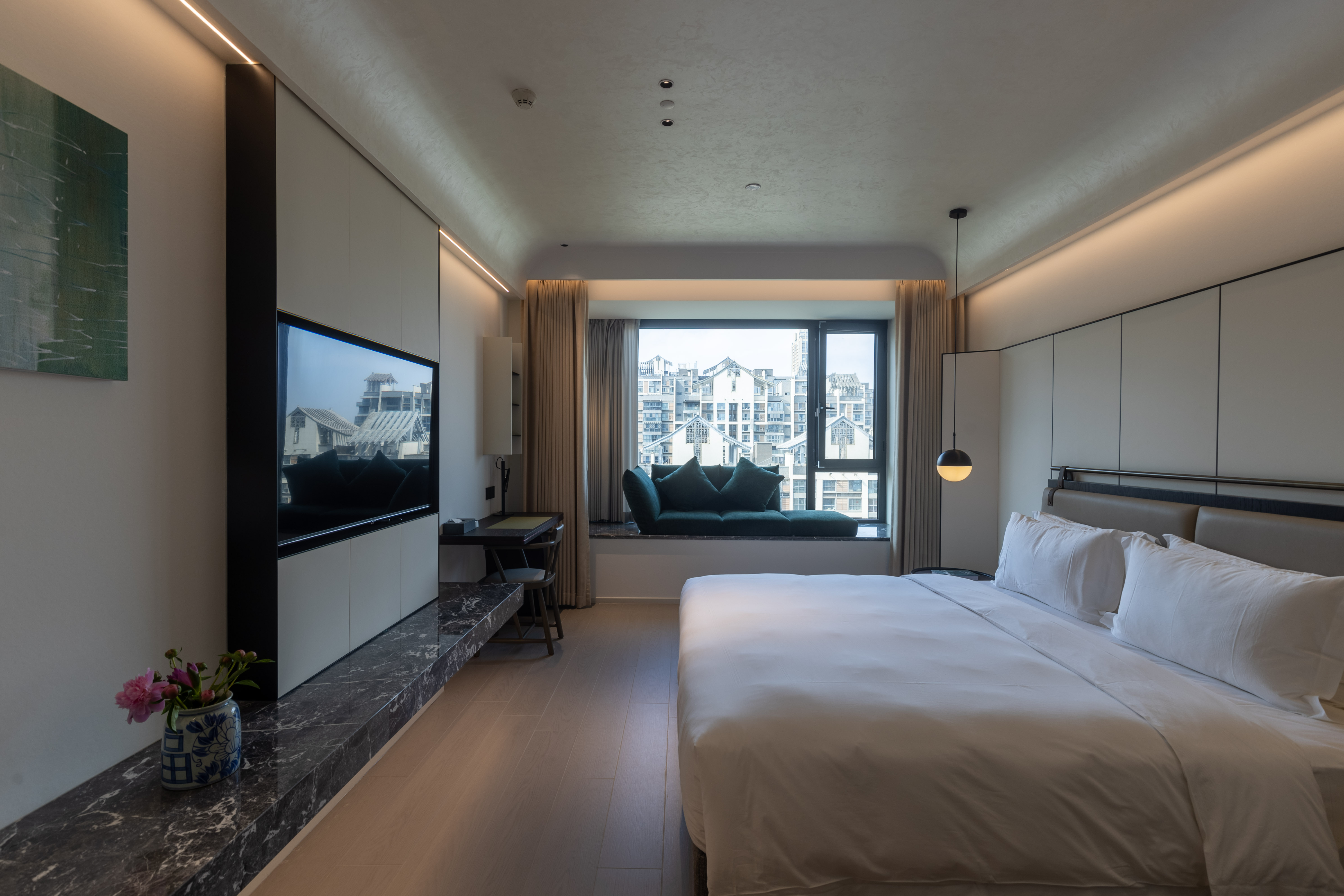 项目定位:业主是和设计师多年的挚友,这次的合作也是建立在多年的信任基础之上将项目交付与我们。业主平常也非常的忙碌,所以希望将此次项目以“全案管理系统顾问”的方式进行合作。民宿对标的是五星级酒店的配套,希望作为旅游热门城市的西安,让更多的五湖四海的朋友来到西安后,能有一个温馨的居所,感受一个浪漫、精致及商务、度假为一体的民宿酒店。