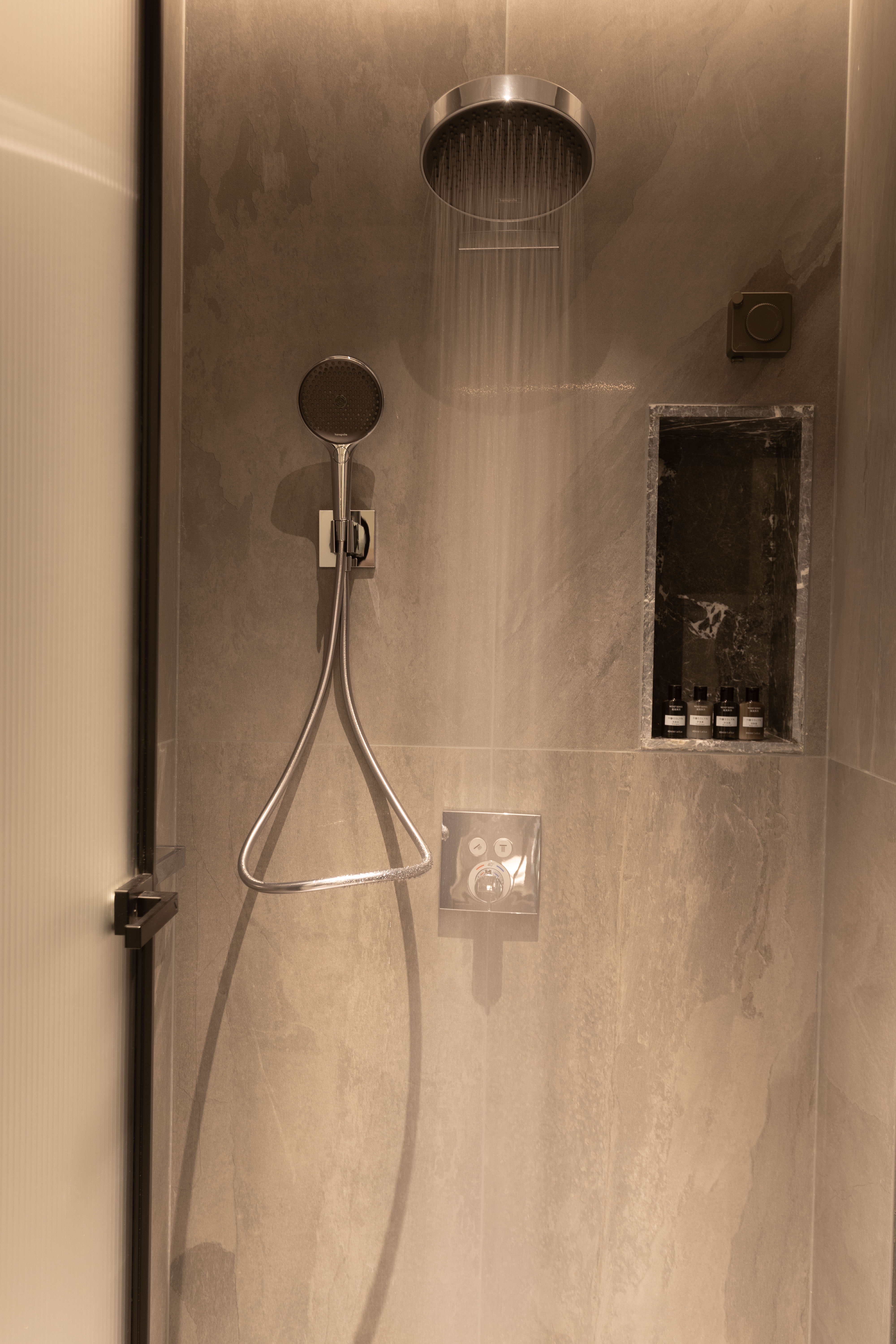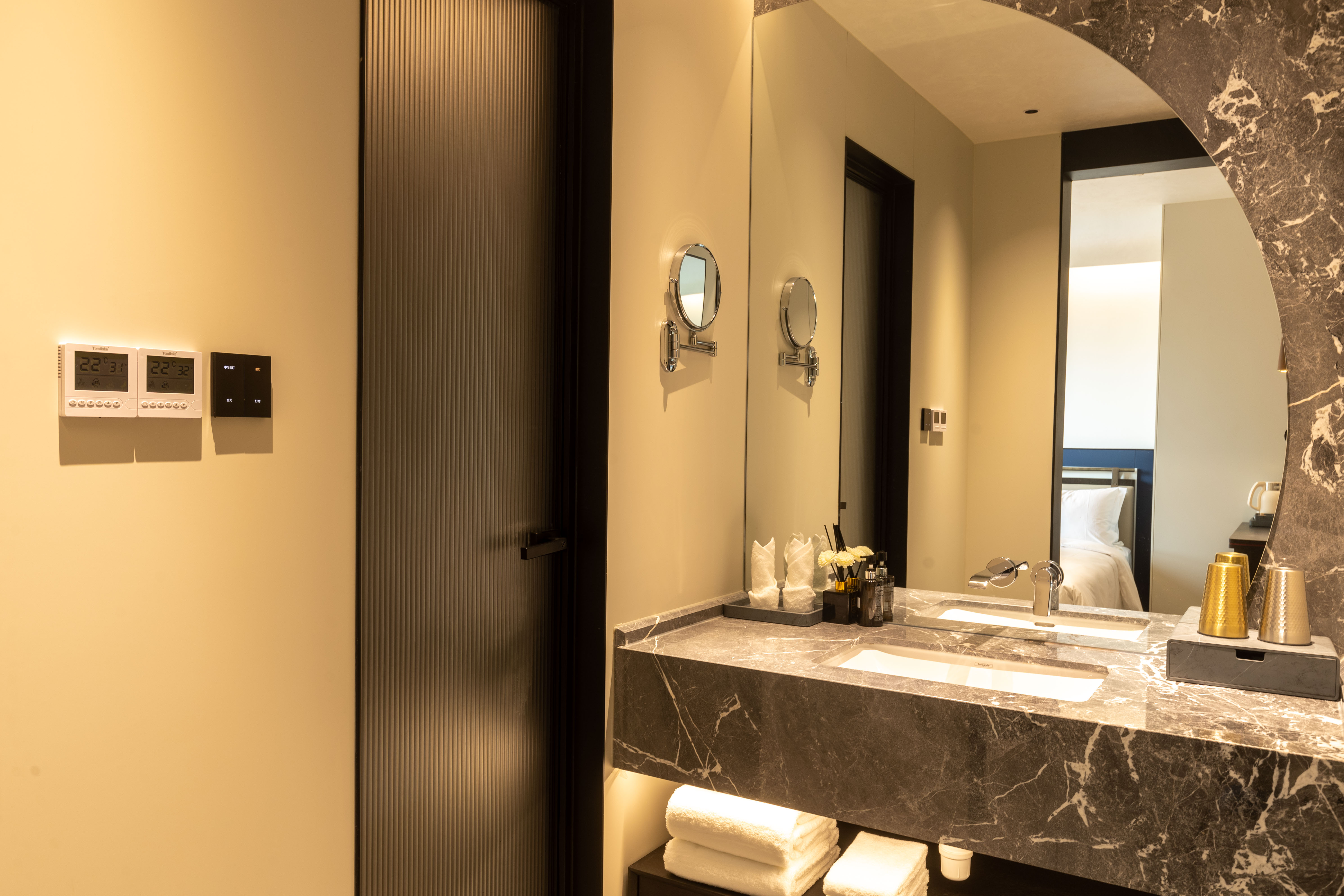 【技术层面的特殊考虑和做法】对于酒店空间住人的时间不确定性,又要考虑民宿酒店本身人员服务的成本控制,对于随时客户的入住,并保证室内空气的清新,尤其是卫生间的异味的影响,成为了我们此次必须要解决的问题,另外如何让空间的设计功能可以更好的与人之间更加友好的使用,也是此次设计的一个重点。所以我们在和系统工程师详细沟通后:1、采用了智能控制的形式,采用交互式的设计,让客人可以更加友好的使用全屋的智能灯光。2、通过智能化设计,开启定时换气,保证空间的空气清新,并且不会打扰到客人。 -