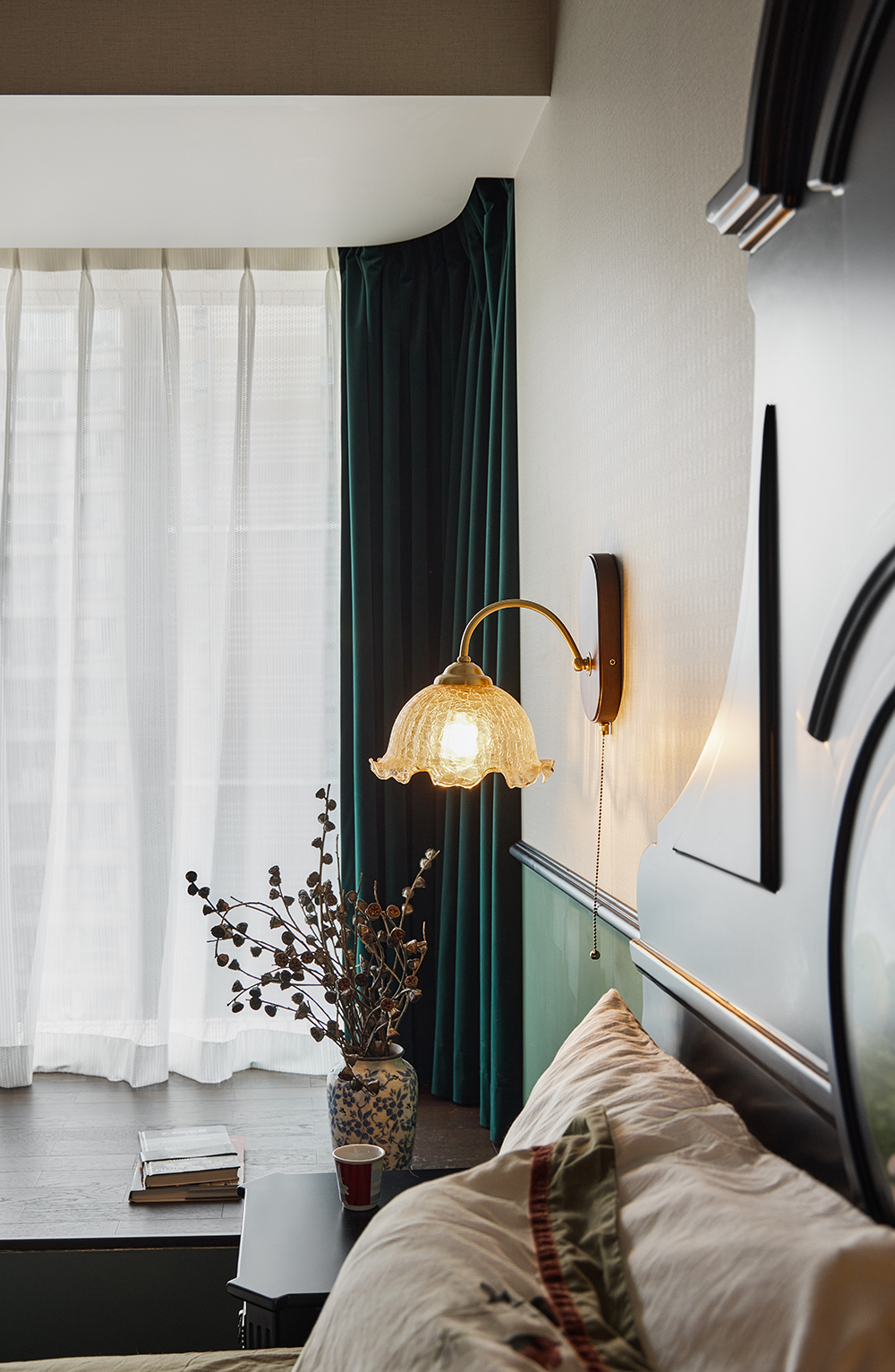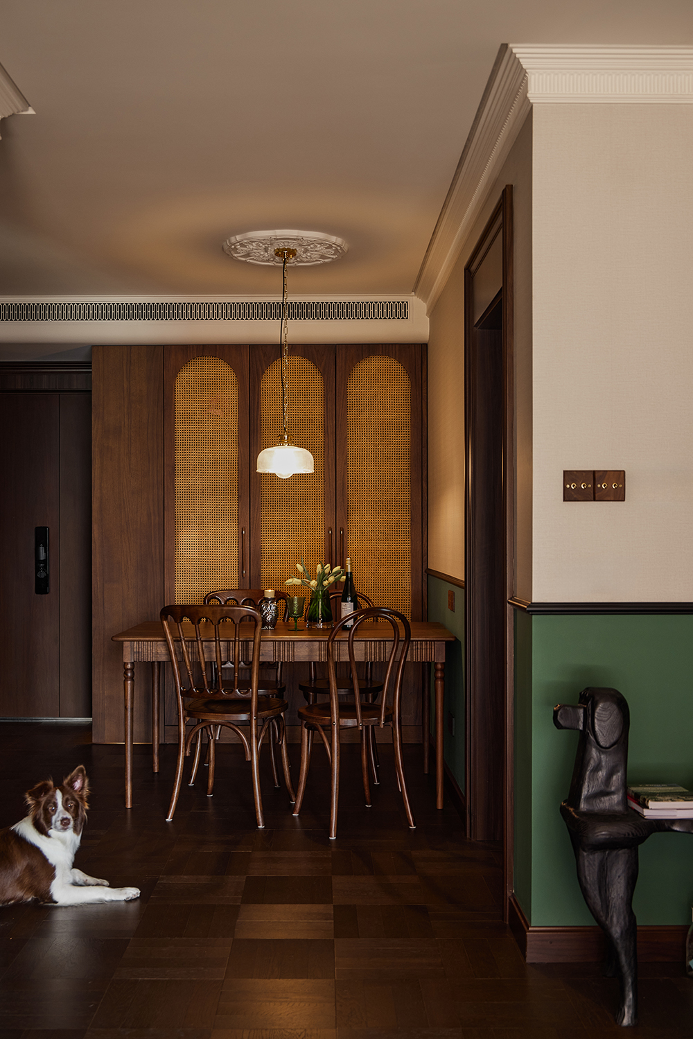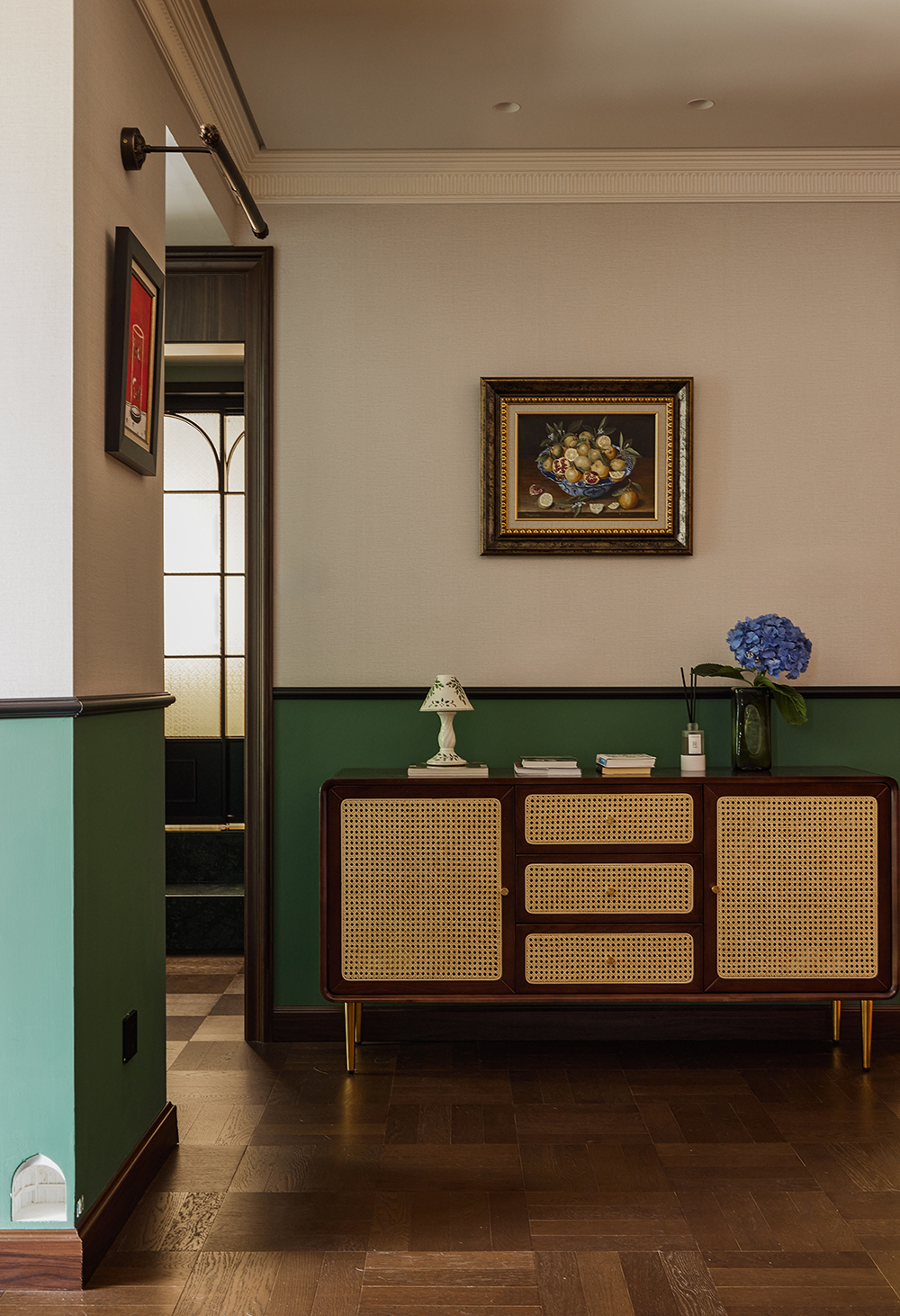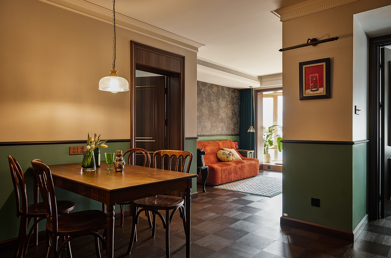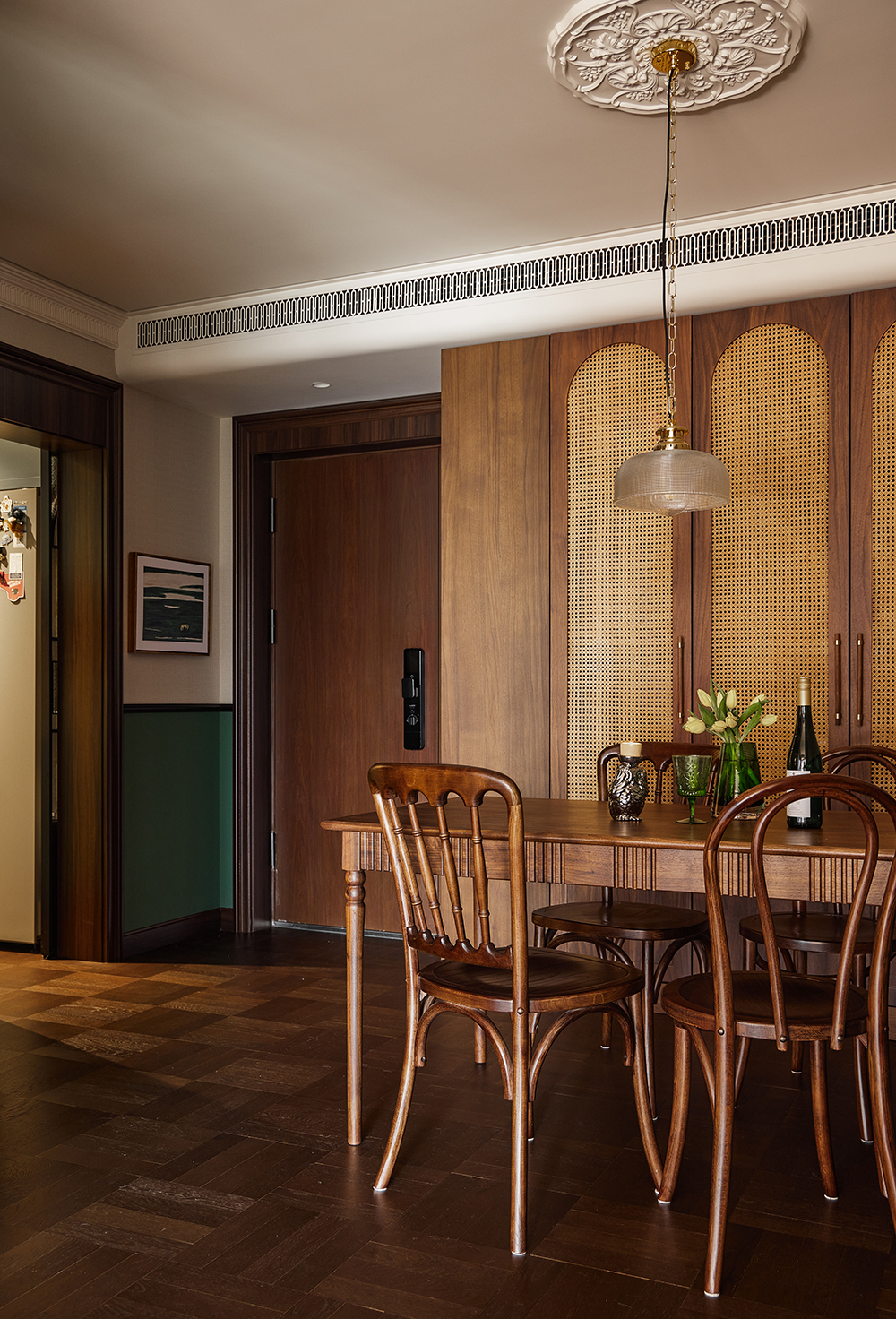 我们精心挑选了多种材料以打造他们梦寐以求的复古海派风格。全屋下半段采用暗绿色主题色,搭配黑色线条和胡桃木色定制家具,营造出沉稳而富有质感的复古氛围。厨房和卫生间则选用了奶油绿和牛油果绿,为空间增添活泼与活力。地面铺设了模仿老上海民居地板拼装方式的三层复合实木地板,不仅形式仿古,技术先进,稳定性强,还能满足地暖要求。家具方面,我们选择了胡桃木、藤编和黄铜元素,这些材质与复古风格相得益彰。此外,我们还特别挑选了复古玻璃吊灯、ArtDeco风格的灯具、以及具有装饰性的壁纸和窗帘,为整个家增添了艺术感和生活气息。在阳台区域,我们使用了榻榻米形式,抬高的地面和半透的竹帘营造出轻松舒适的氛围。通过这些精心挑选的材料和设计,我们成功打造了一个既复古又充满生活情趣的新家。