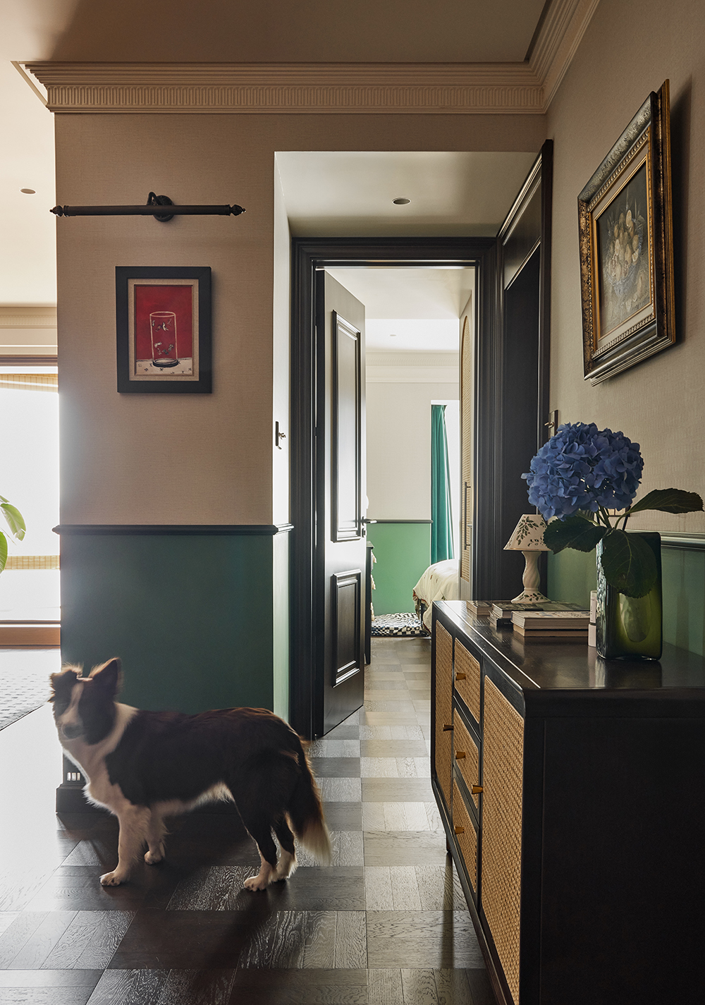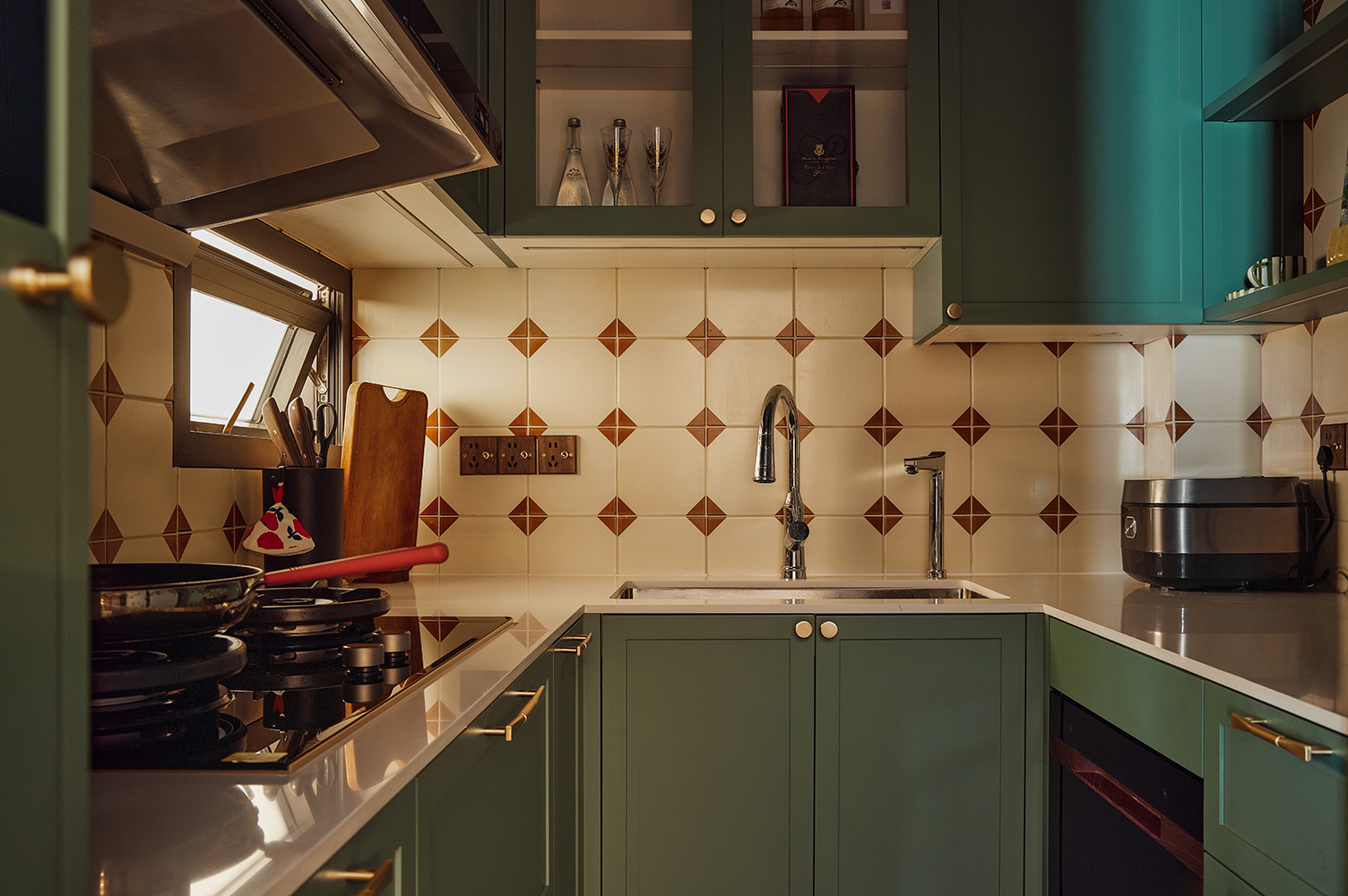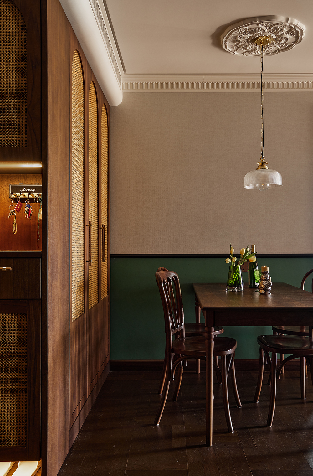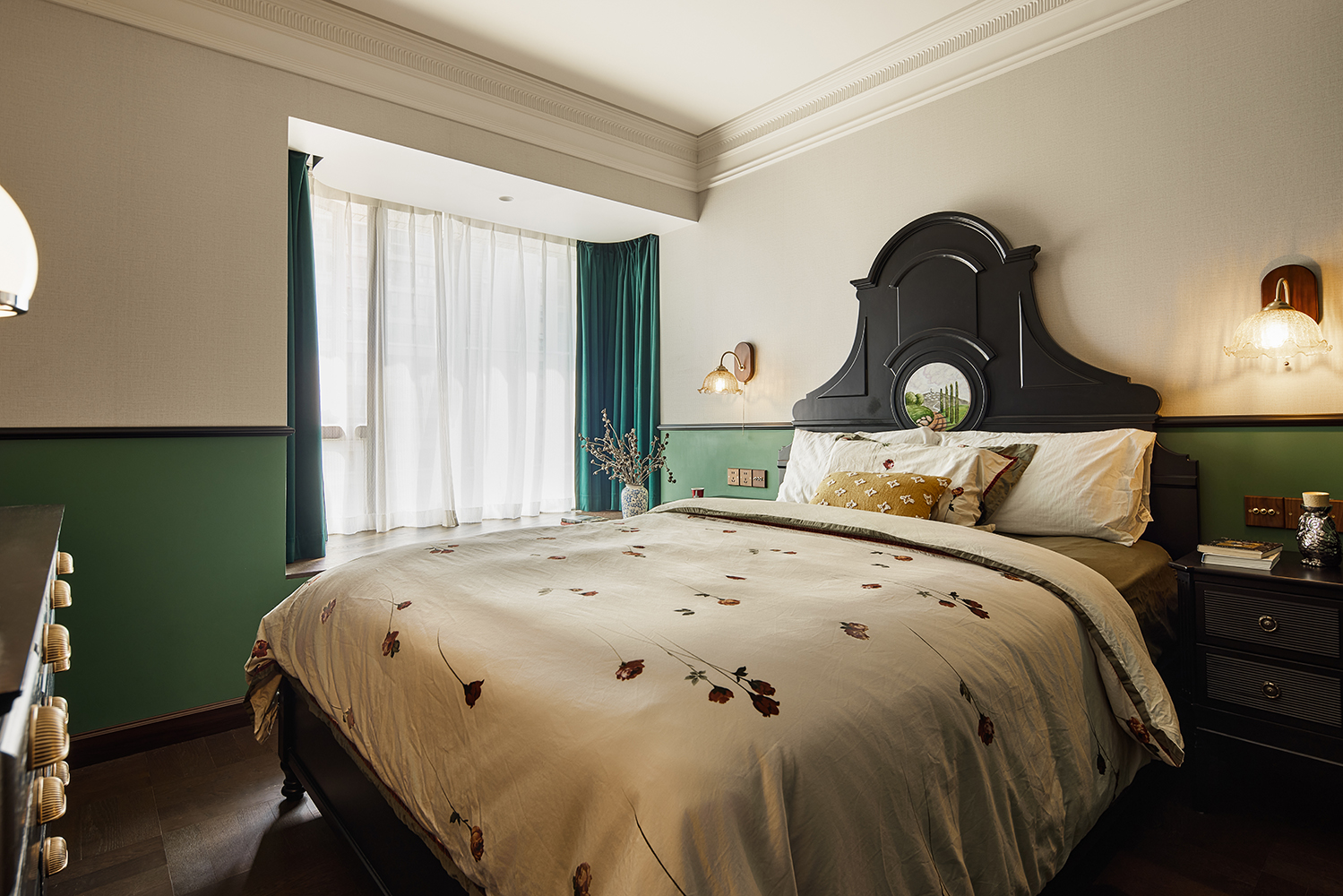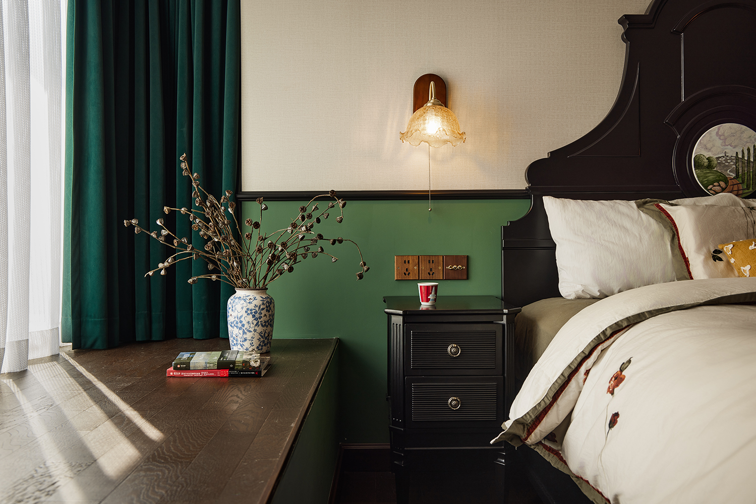 我们精心挑选了多种材料以打造他们梦寐以求的复古海派风格。全屋下半段采用暗绿色主题色,搭配黑色线条和胡桃木色定制家具,营造出沉稳而富有质感的复古氛围。厨房和卫生间则选用了奶油绿和牛油果绿,为空间增添活泼与活力。地面铺设了模仿老上海民居地板拼装方式的三层复合实木地板,不仅形式仿古,技术先进,稳定性强,还能满足地暖要求。家具方面,我们选择了胡桃木、藤编和黄铜元素,这些材质与复古风格相得益彰。此外,我们还特别挑选了复古玻璃吊灯、ArtDeco风格的灯具、以及具有装饰性的壁纸和窗帘,为整个家增添了艺术感和生活气息。在阳台区域,我们使用了榻榻米形式,抬高的地面和半透的竹帘营造出轻松舒适的氛围。通过这些精心挑选的材料和设计,我们成功打造了一个既复古又充满生活情趣的新家。