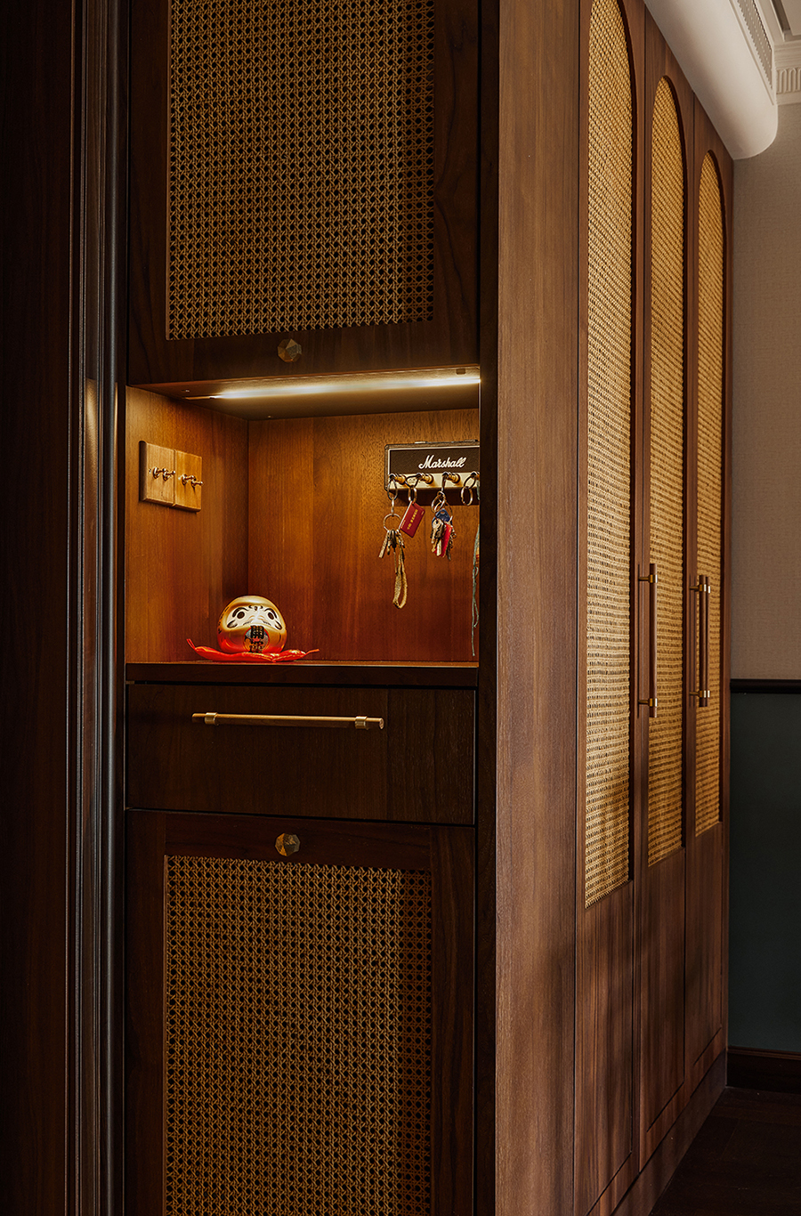 在空间布局上,本案设计创新点主要体现在对既有空间的高效利用与风格化重塑。设计师巧妙应对了原房屋采光不足、配电限制及功能布局不合理等挑战,特别是针对客餐厅进深问题,利用光线变化增添空间层次感;厨房改为C形布局优化动线,卫生间实现三分离提升使用效率。此外,设计师还充分利用墙面面积增设收纳空间,如玄关柜、餐边柜及书房的金属衣帽架等,既满足了储物需求又保持了空间的开阔感。阳台则被打造成一个与室内风格迥异的居心地,采用榻榻米形式结合半透竹帘,营造出轻松惬意的休闲氛围。这些创新布局不仅解决了实际居住问题,更赋予了空间独特的个性与魅力,完美契合了屋主对复古海派生活的美好向往。