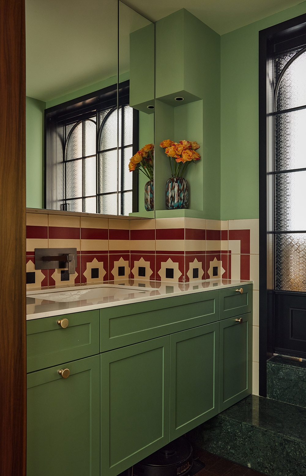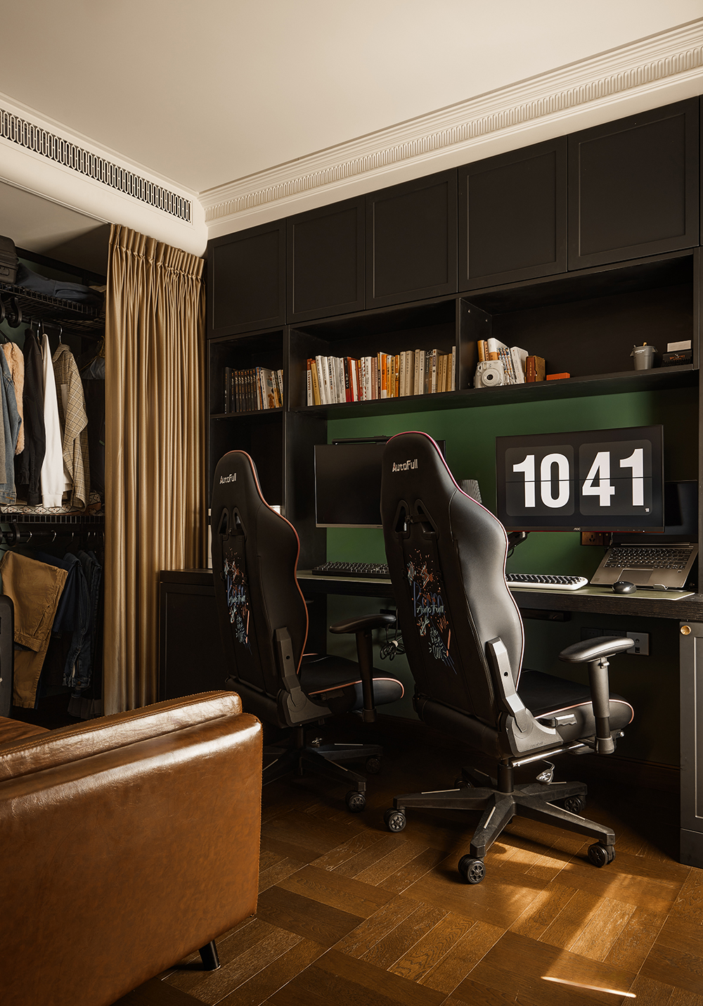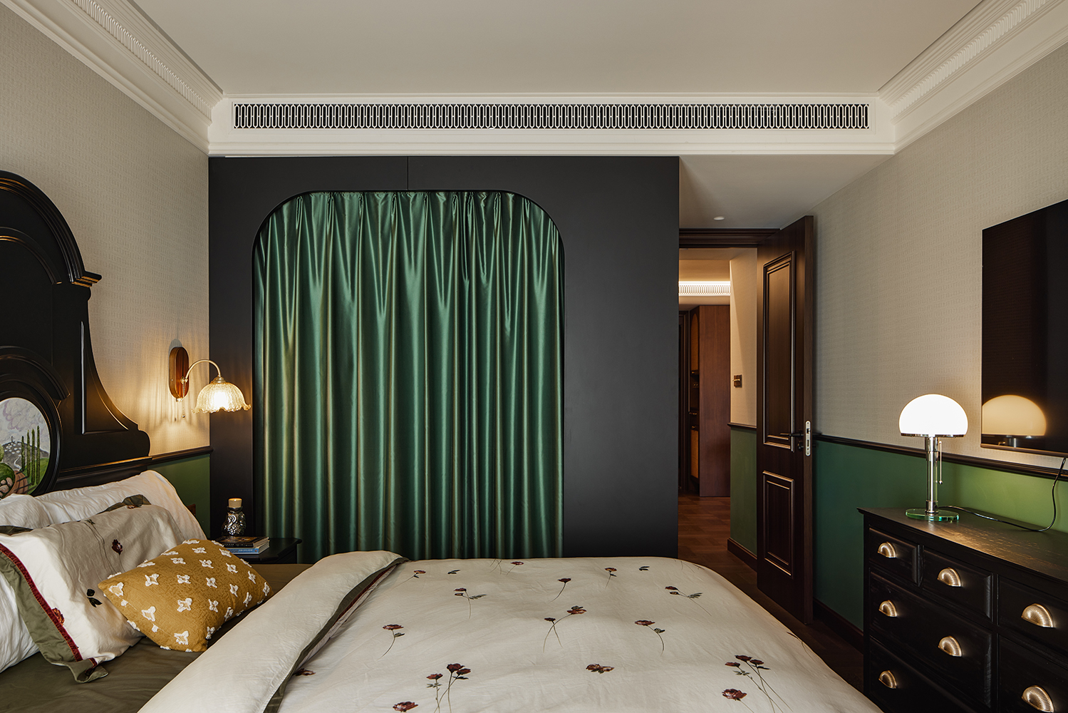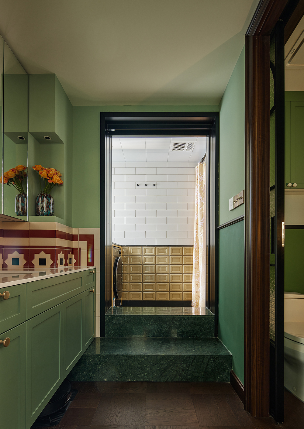 卧室黑色基调搭配金色与红色床品,彰显个性与品味。书房以哑光黑为主,粉色滚线椅子成为亮点,既实用又舒适。厨房奶油绿清新雅致,卫生间牛油果绿与黑色腰线复古韵味十足。