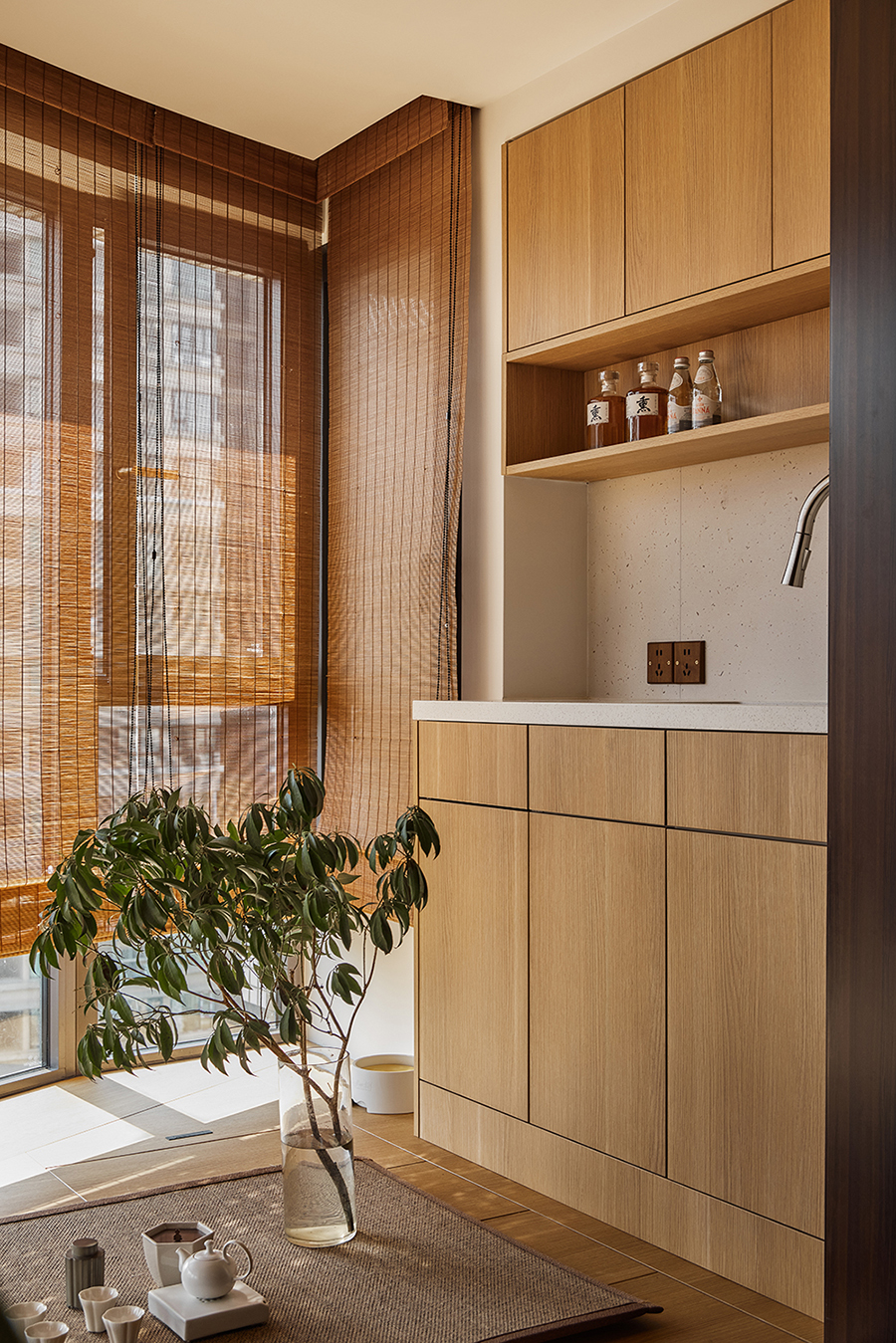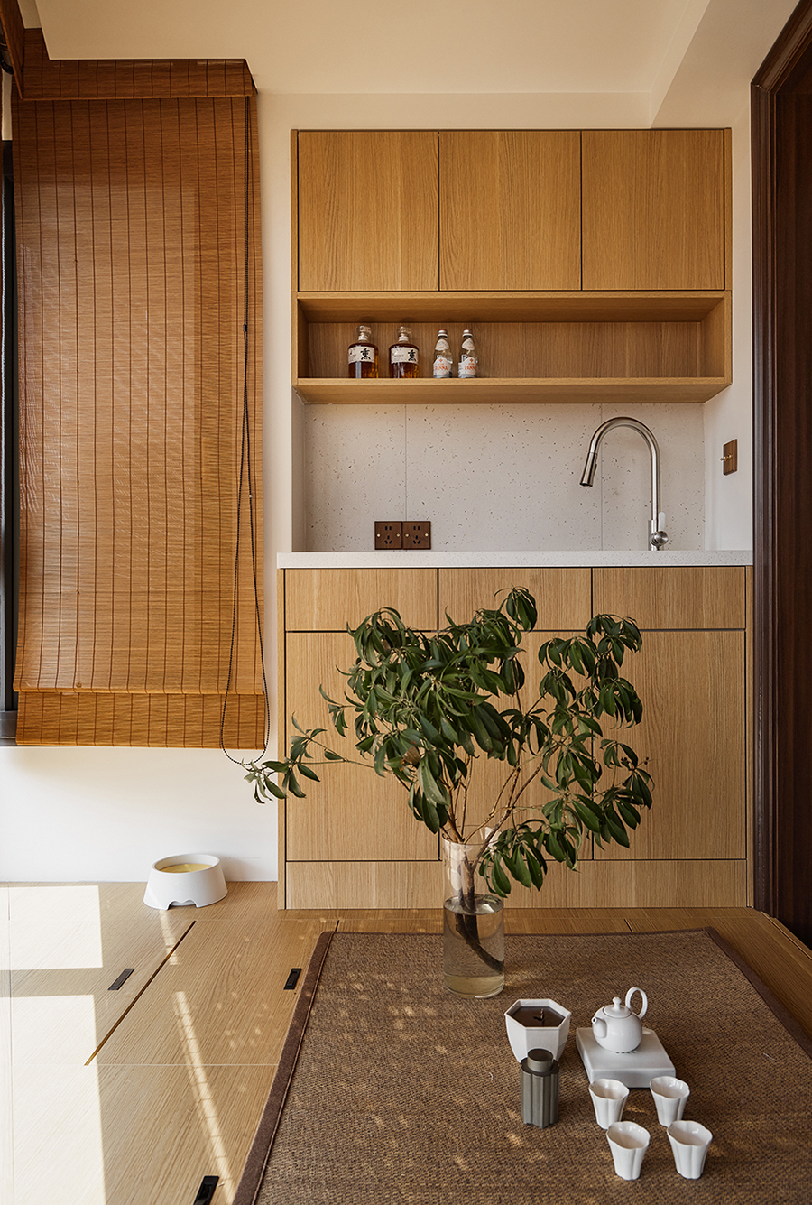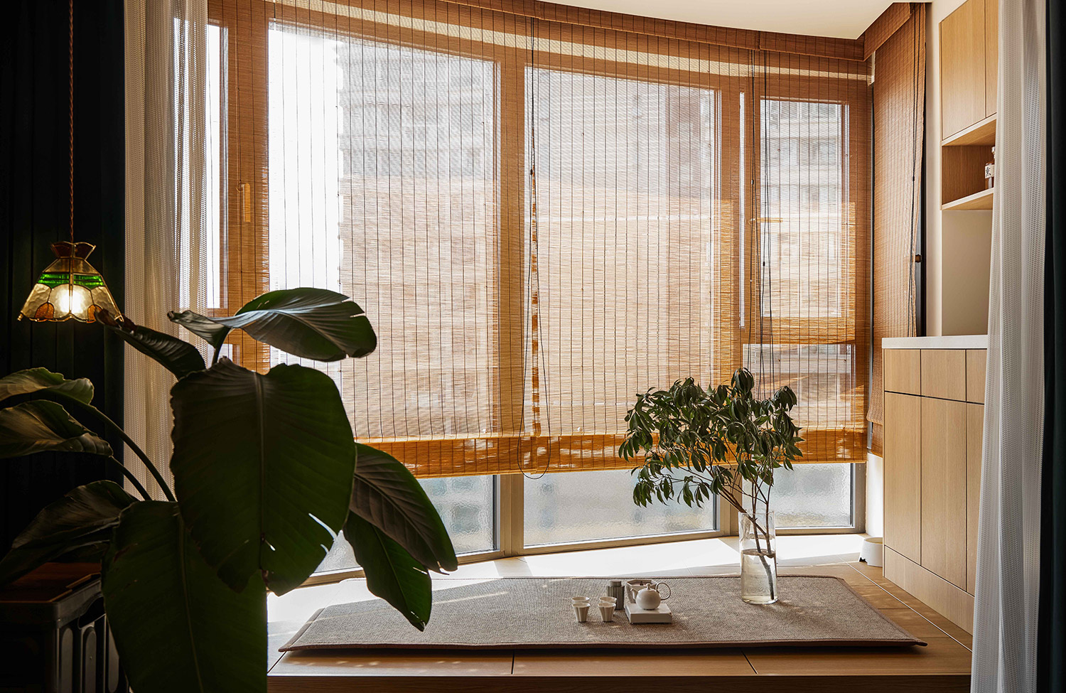 阳台更是惊喜,榻榻米、竹帘与原木色饰面,营造出轻松惬意的世外桃源。整个空间不仅满足居住需求,更融入屋主的个性与品味,复古与现代交织,生活情趣满满。