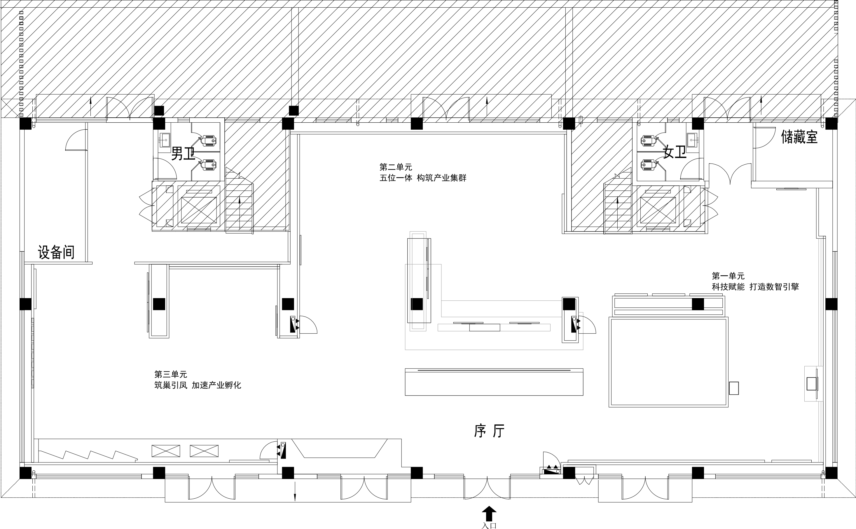 空间布局:展厅的空间布局与流线设计对于参观者的体验至关重要。入口序厅我们设计了一个整体的开敞空间。采用单向、逆时针的参观流线。