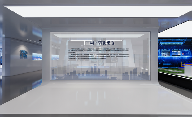 进入序厅,迎面而来是相对通透和开敞的空间,契合整个展厅的主基调。展标“三局·智能建造”结合前言文字,揭示展览主题。