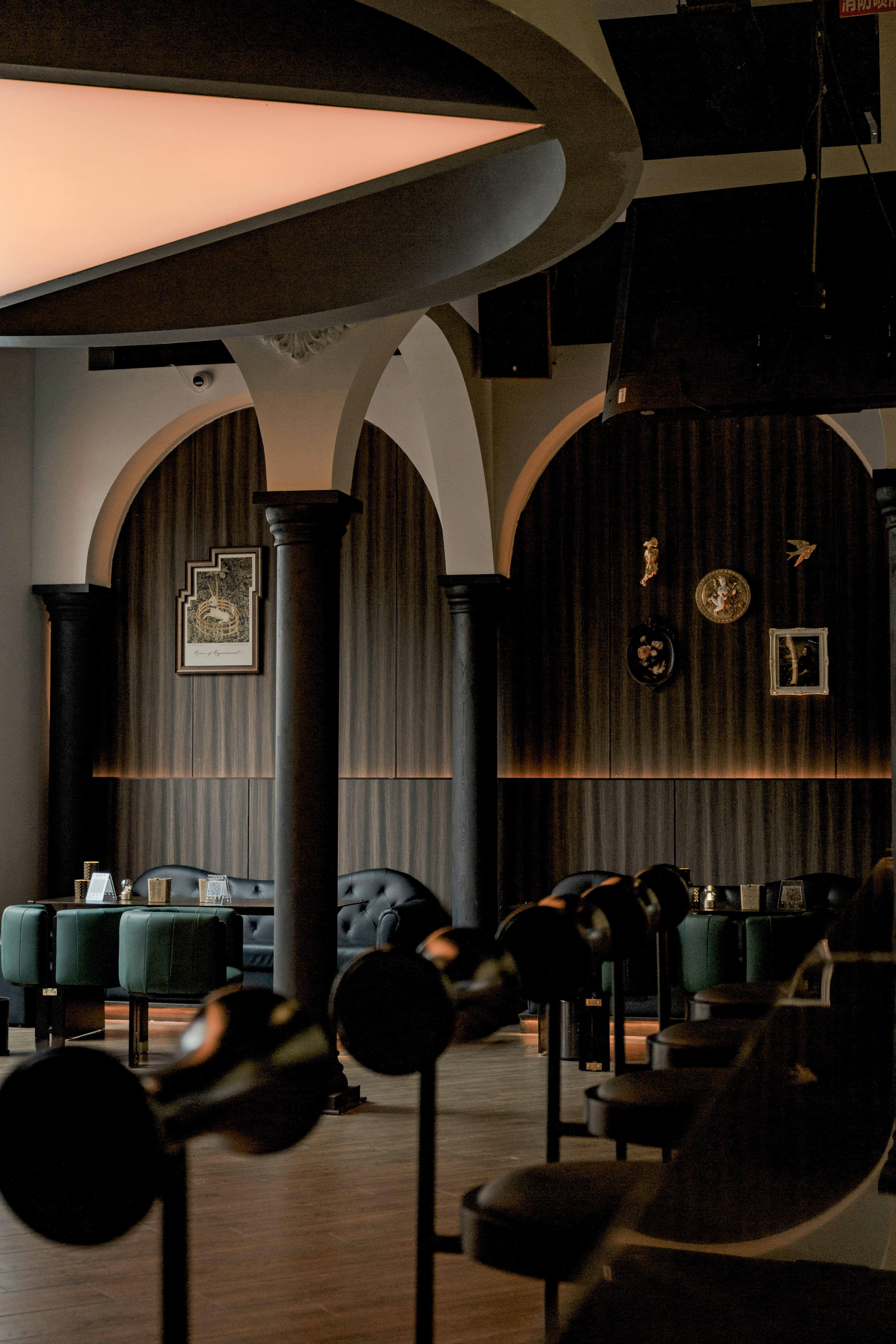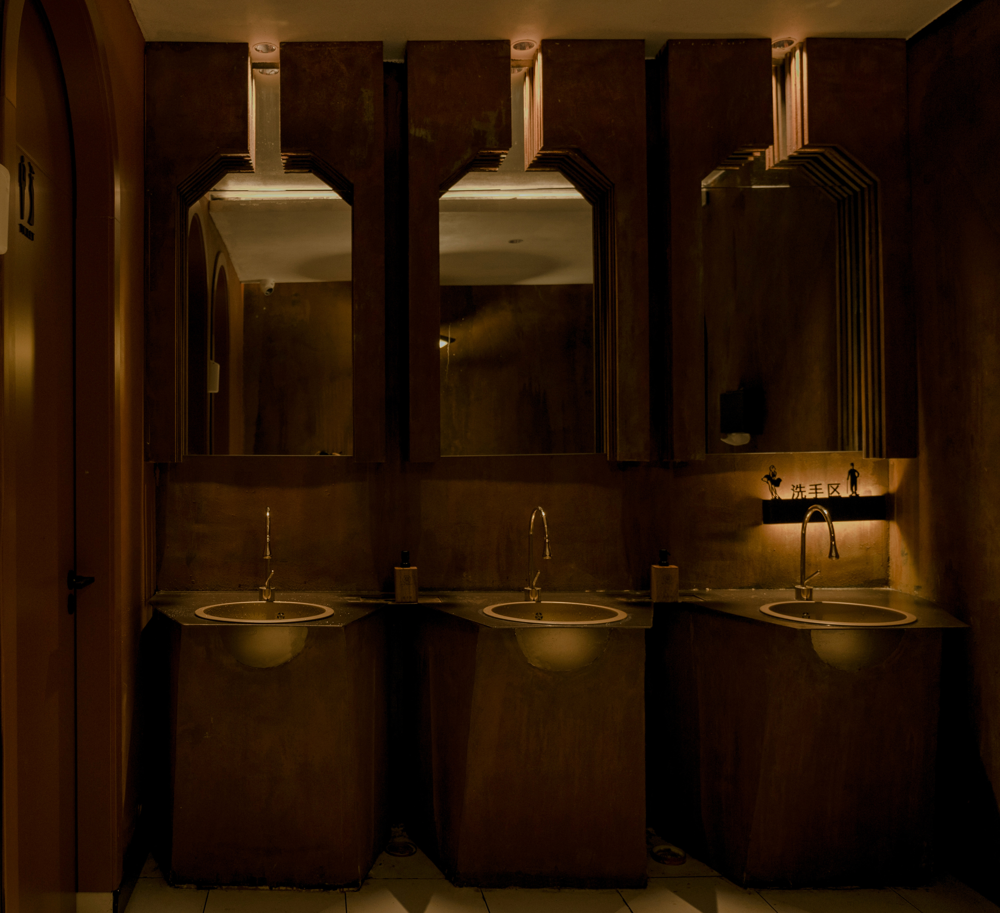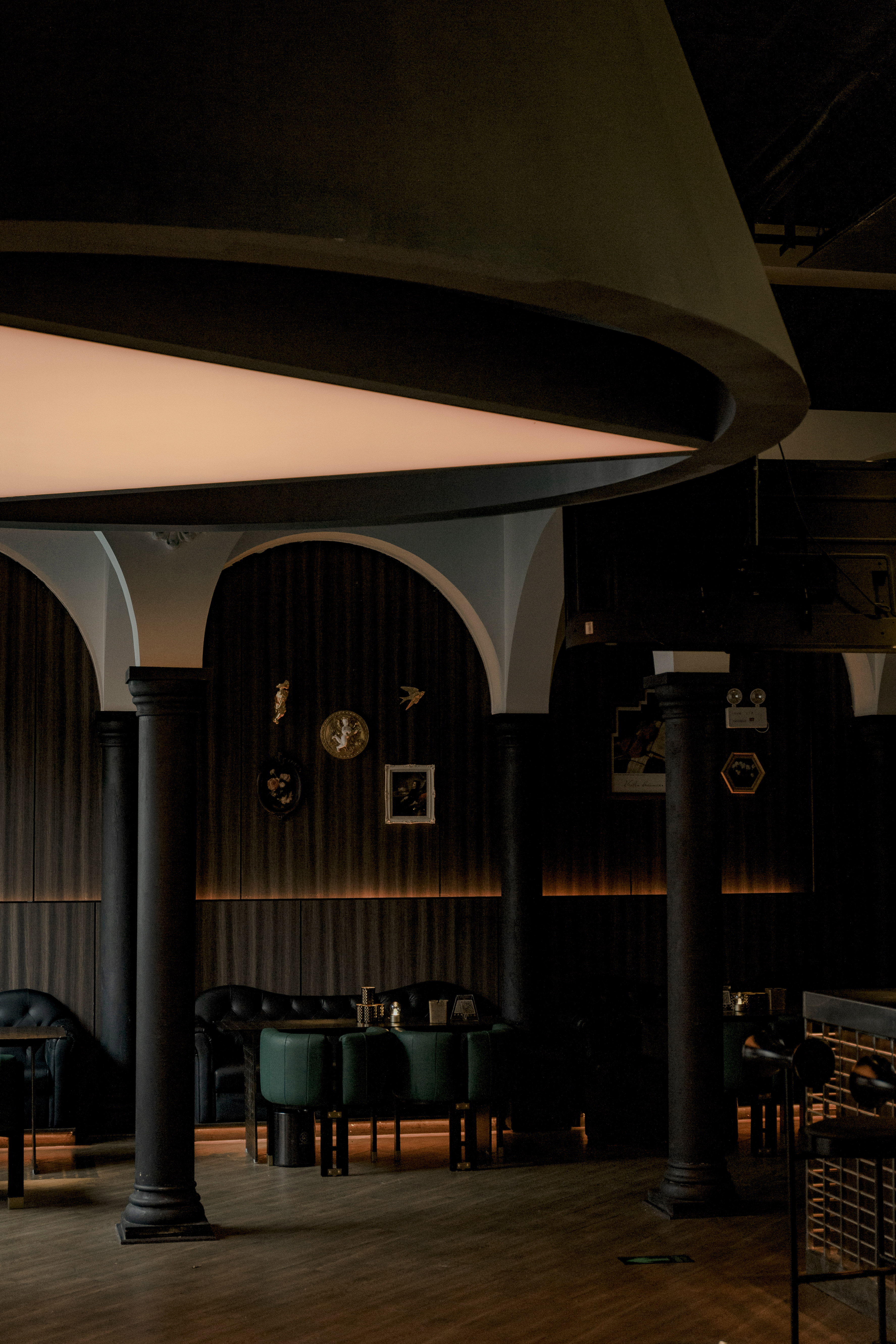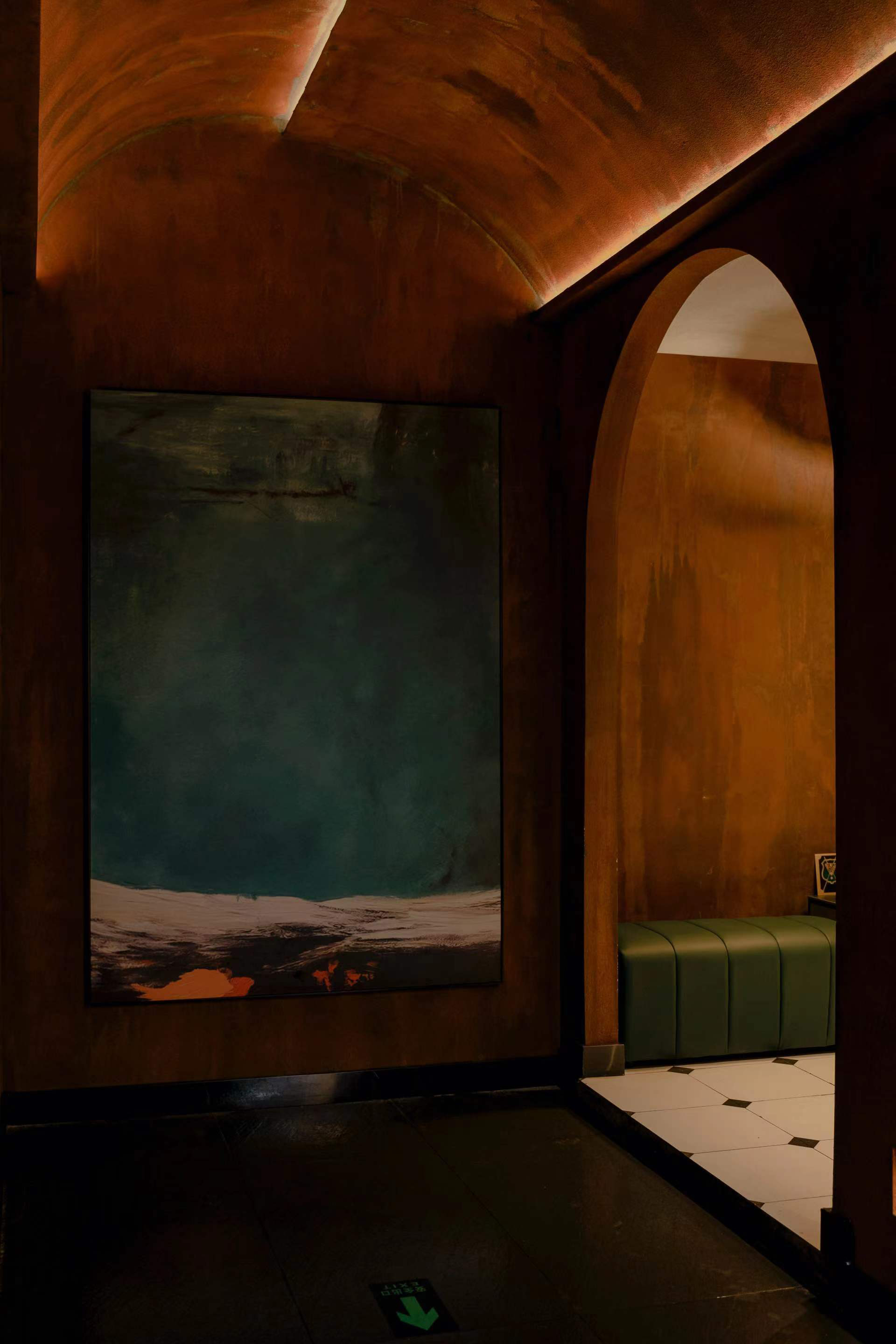 空间以深色木质墙板与做旧的斑驳锈色漆为基调,局部点缀金属材质、水泥板;运用黑色罗马柱和拱形造型奠定空间的调性.