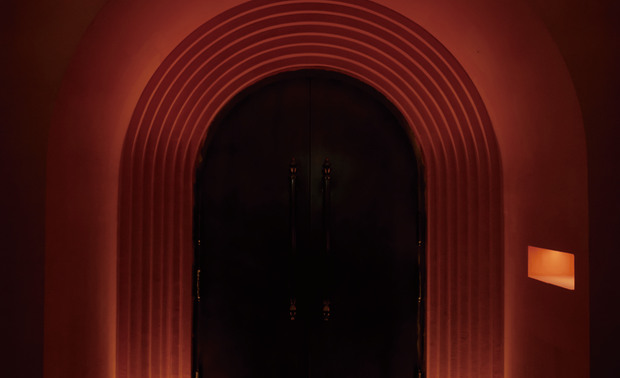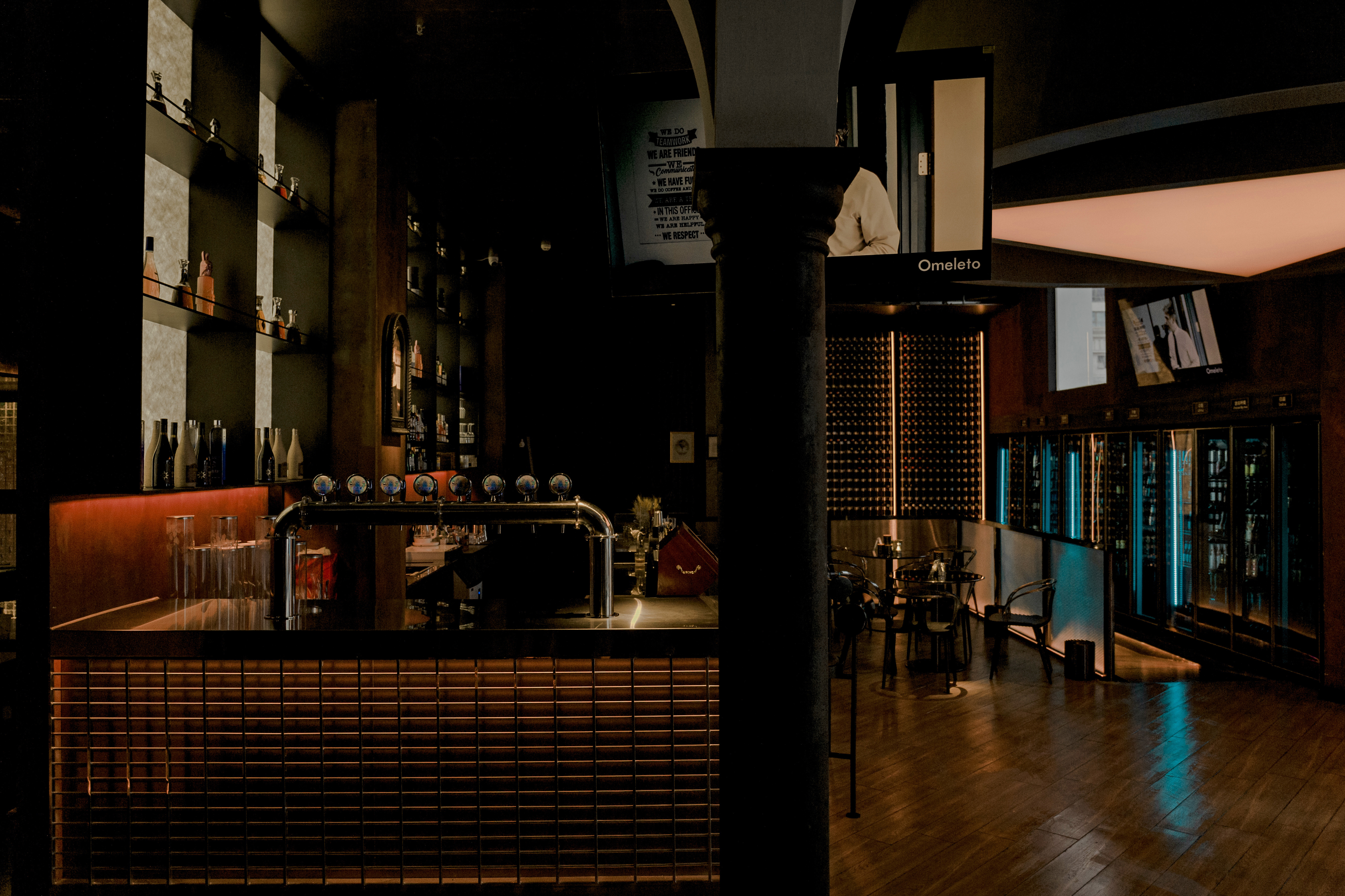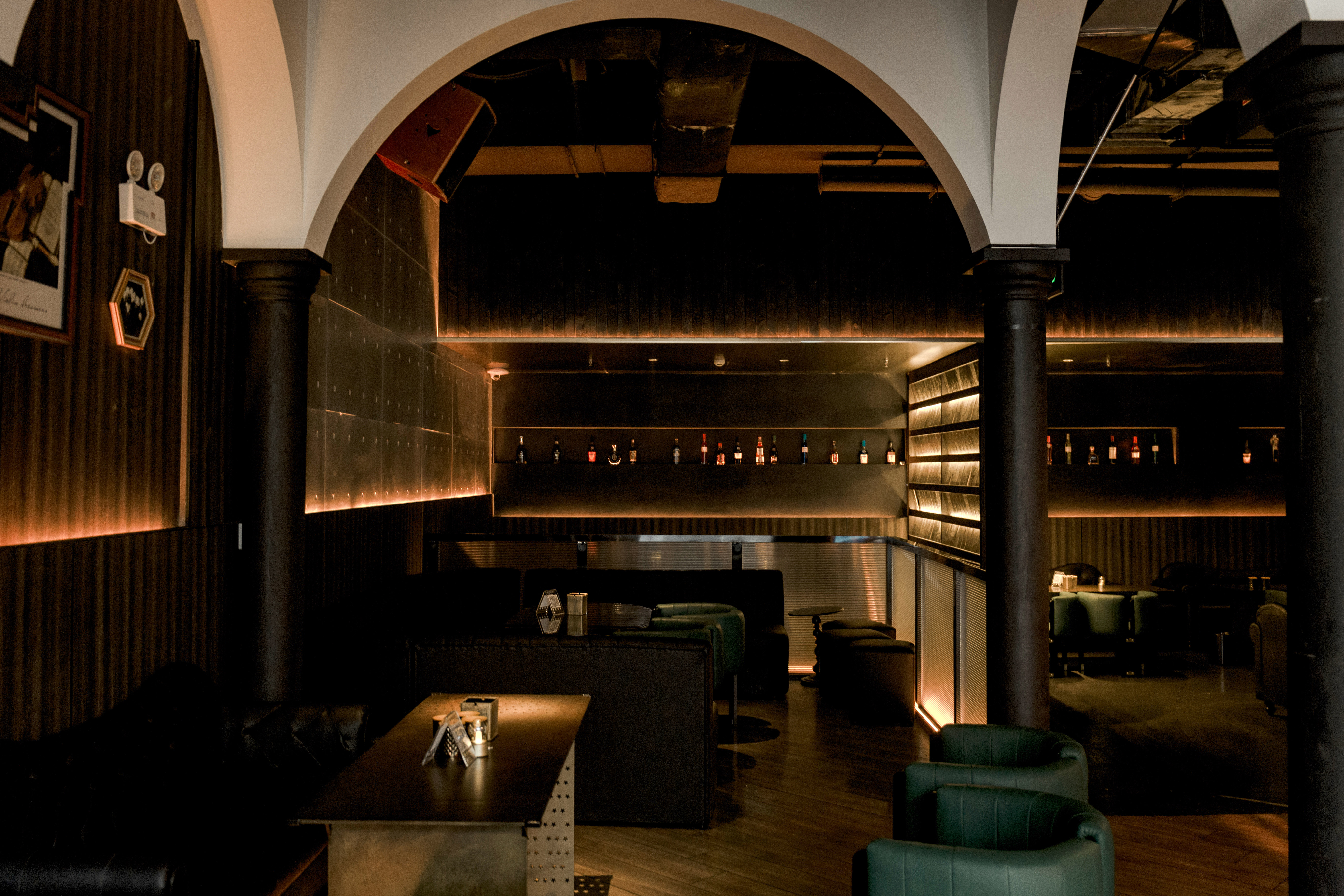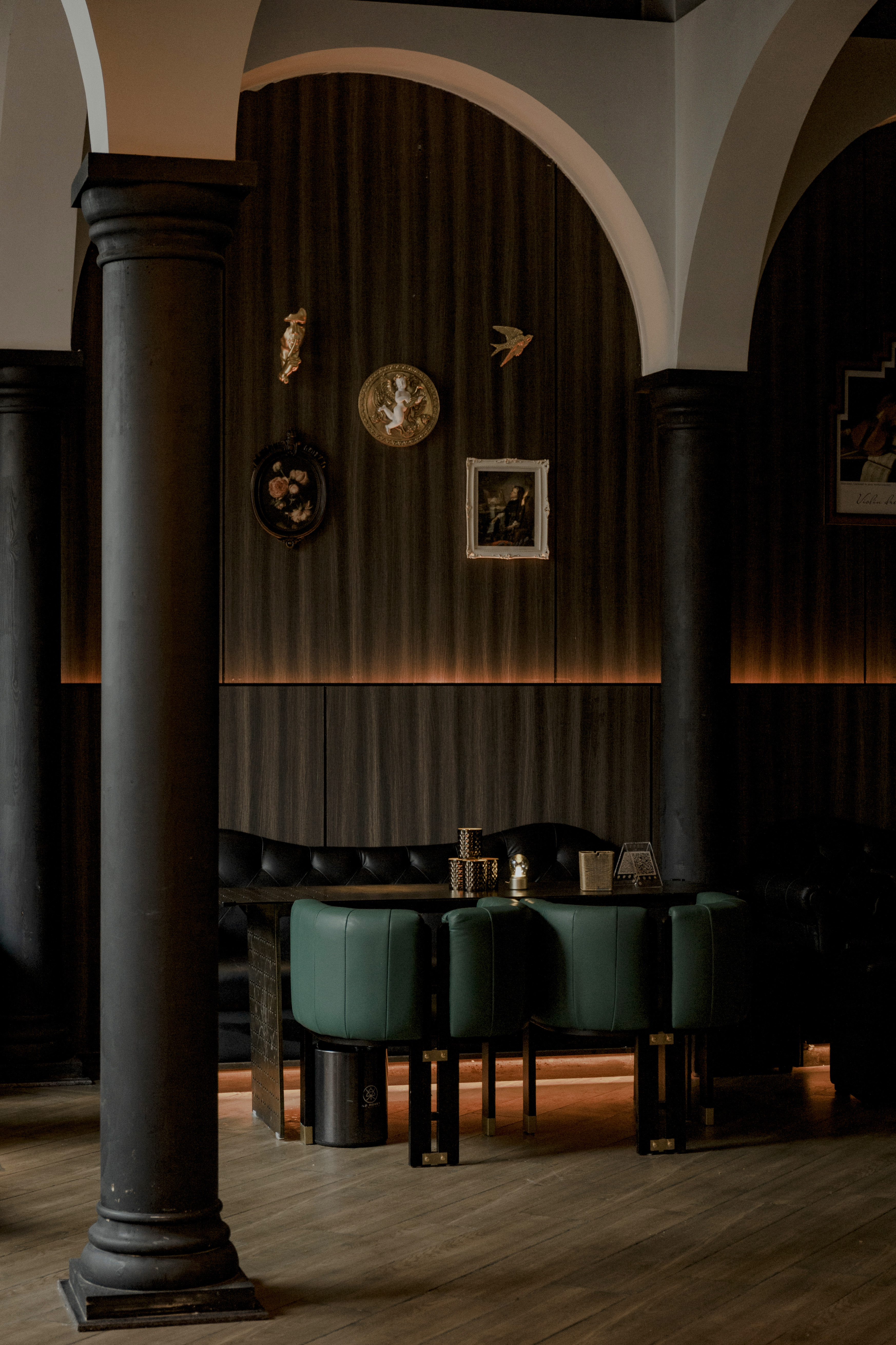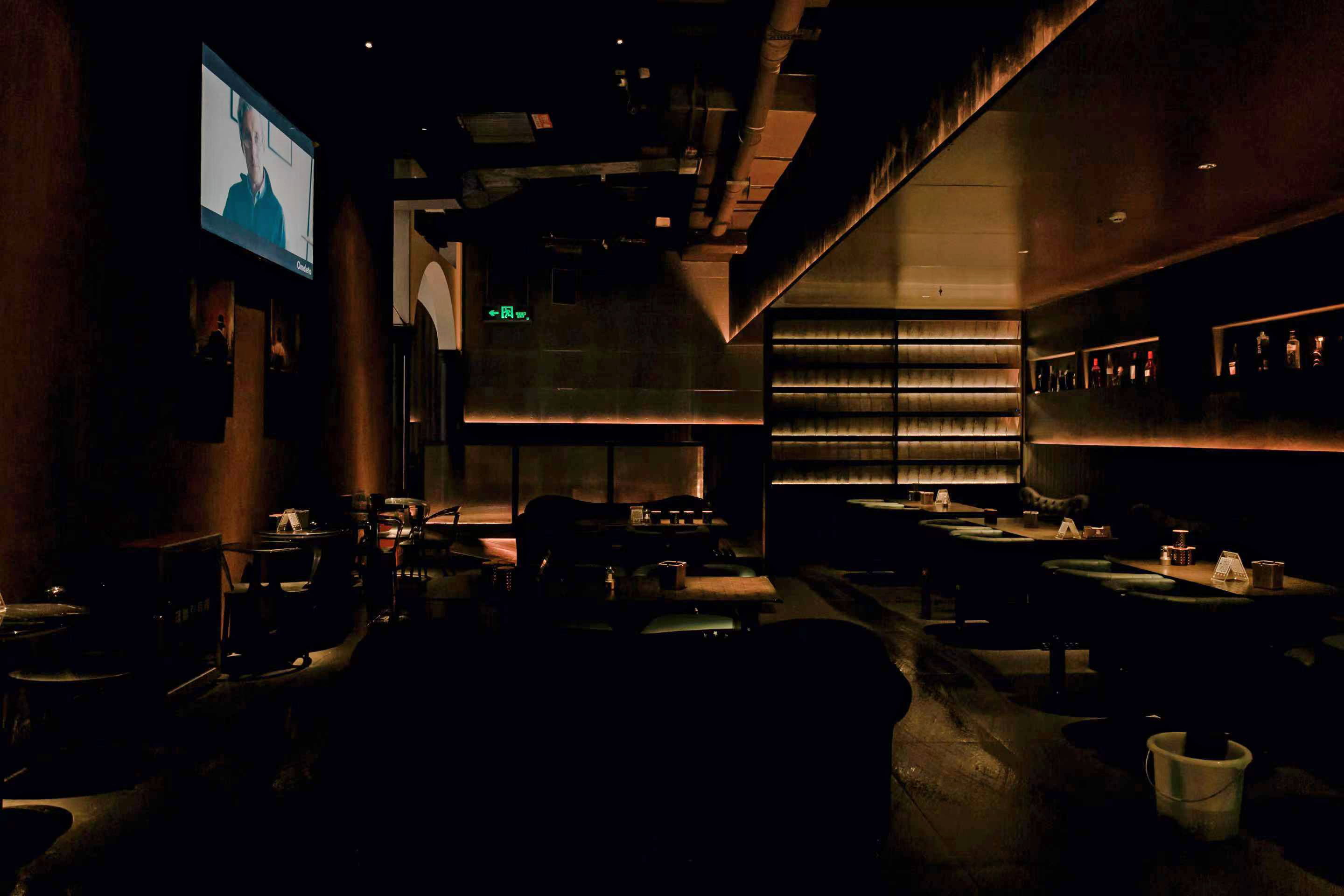 空间以深色木质墙板与做旧的斑驳锈色漆为基调,局部点缀金属材质、水泥板;运用黑色罗马柱和拱形造型奠定空间的调性.