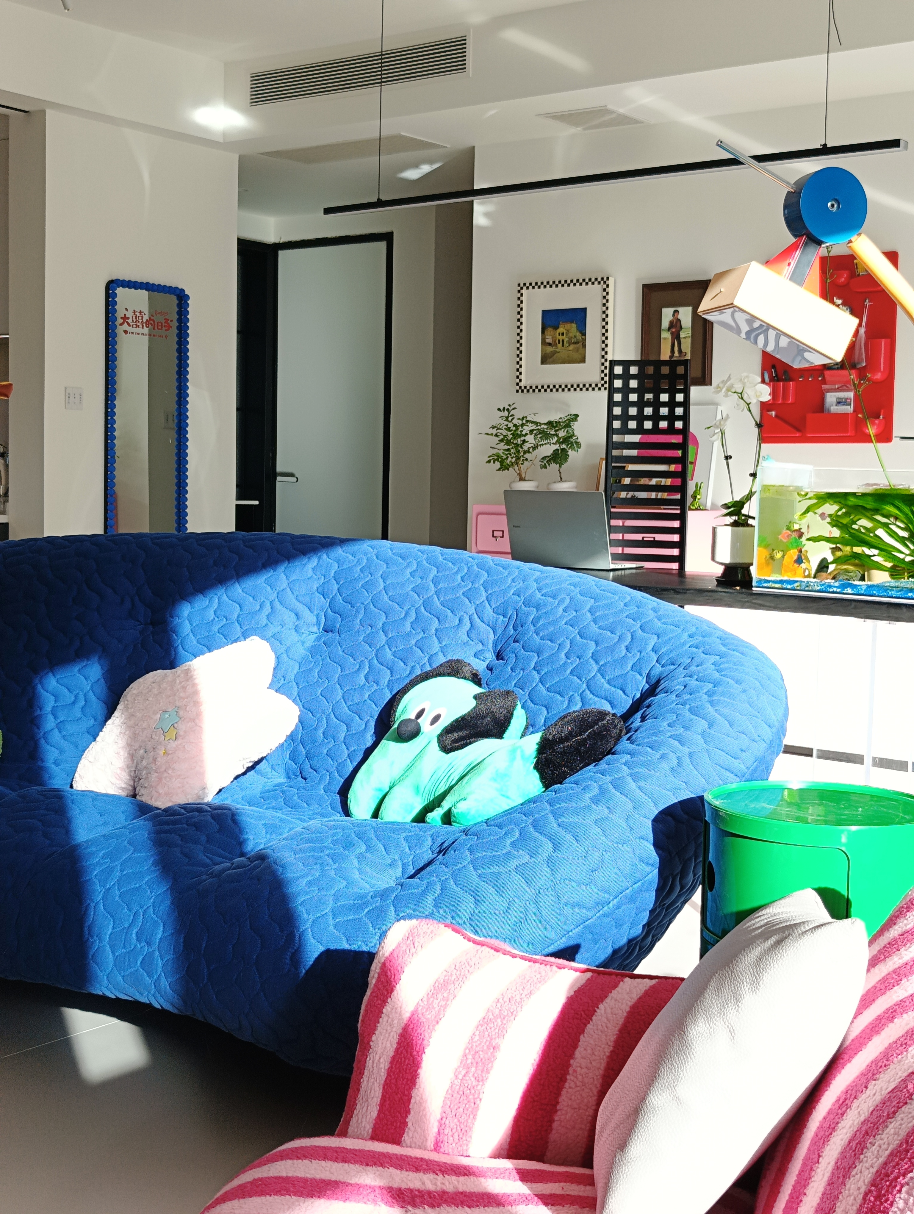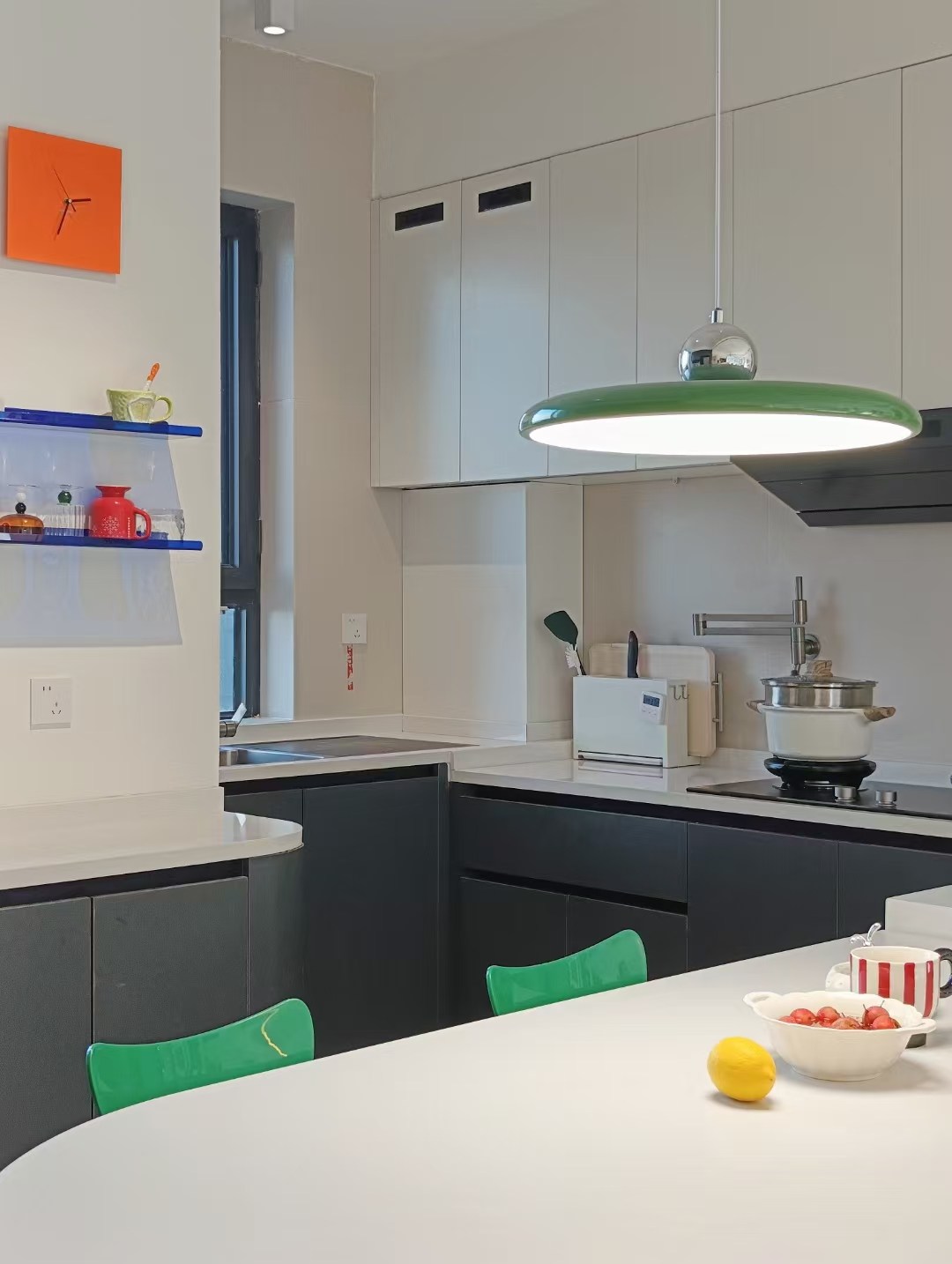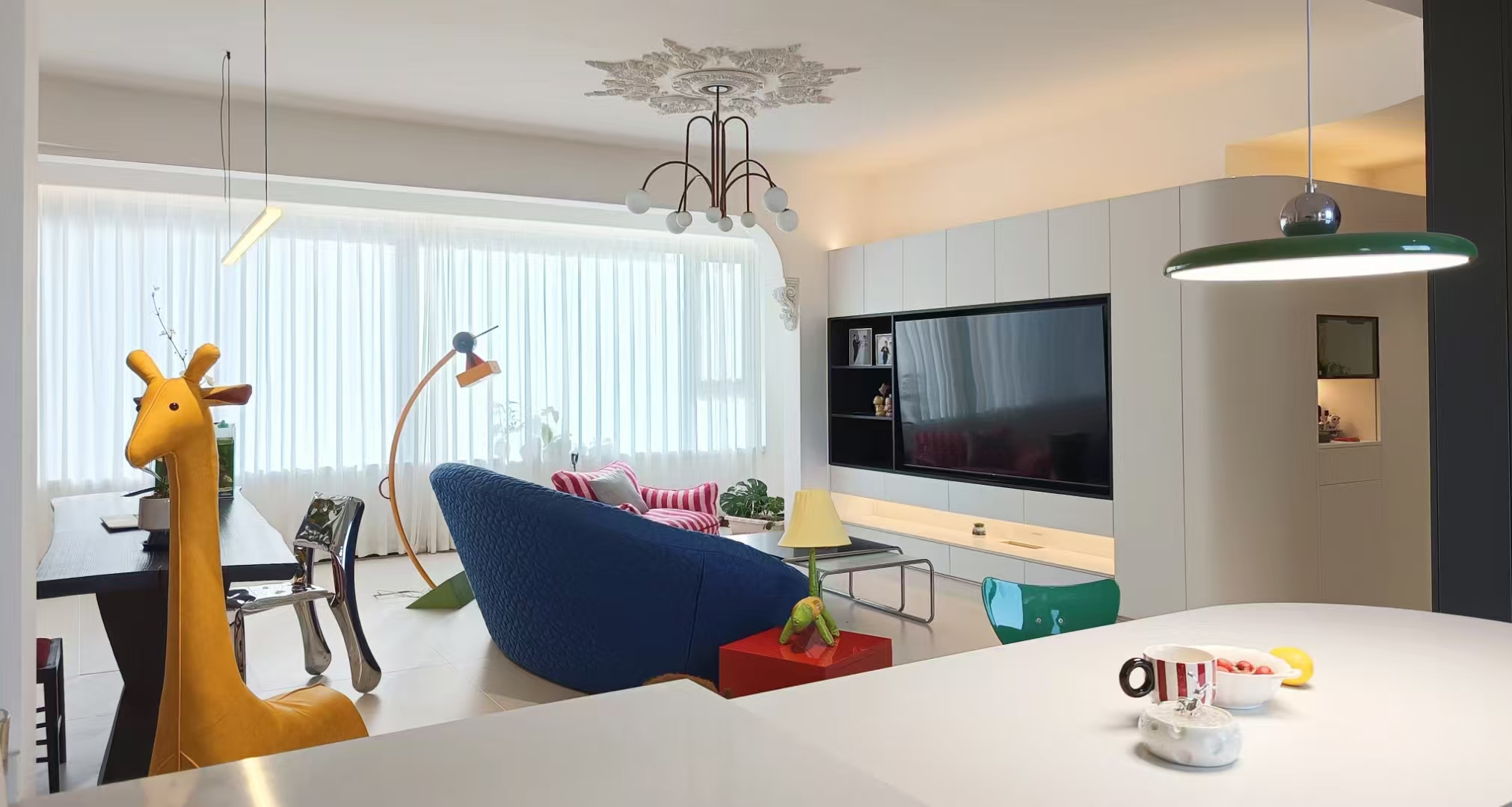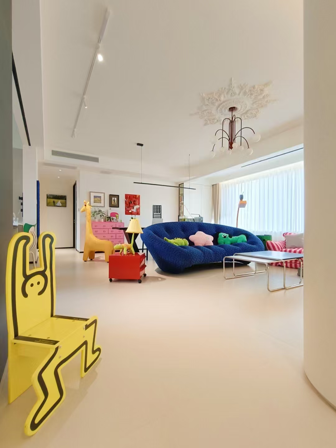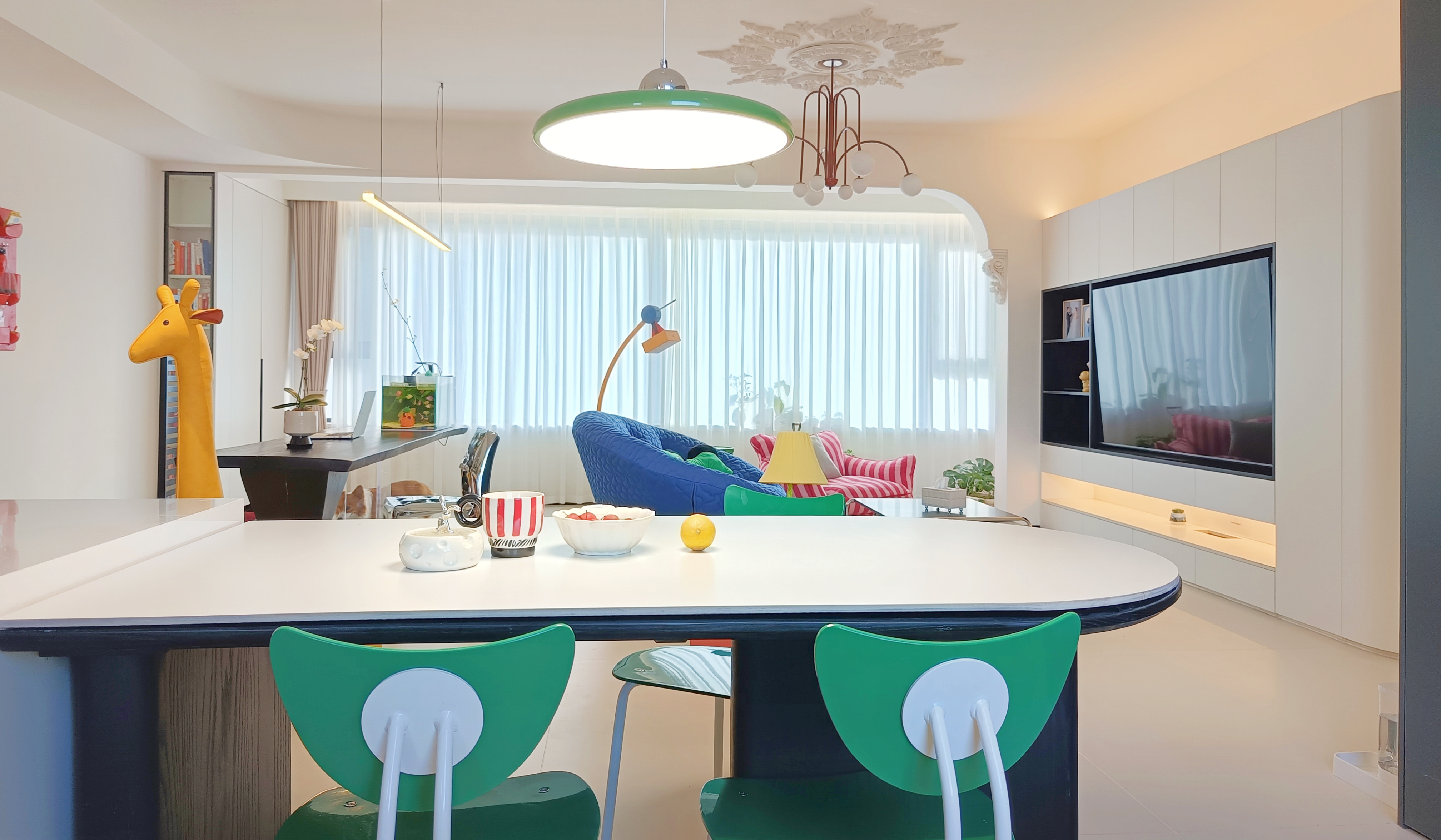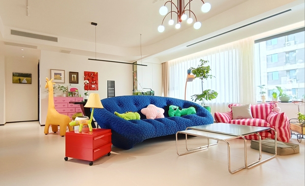 空间意境:本案在风格抛弃了固有的风格限制,并没有给空间限制一种什么样的“风格”,而是希望回归生活的本质:“居住性”,“生活本该丰富多彩”,通过简洁的硬装+搭配丰富的软装,营造一种活泼,可爱,多彩的感觉。