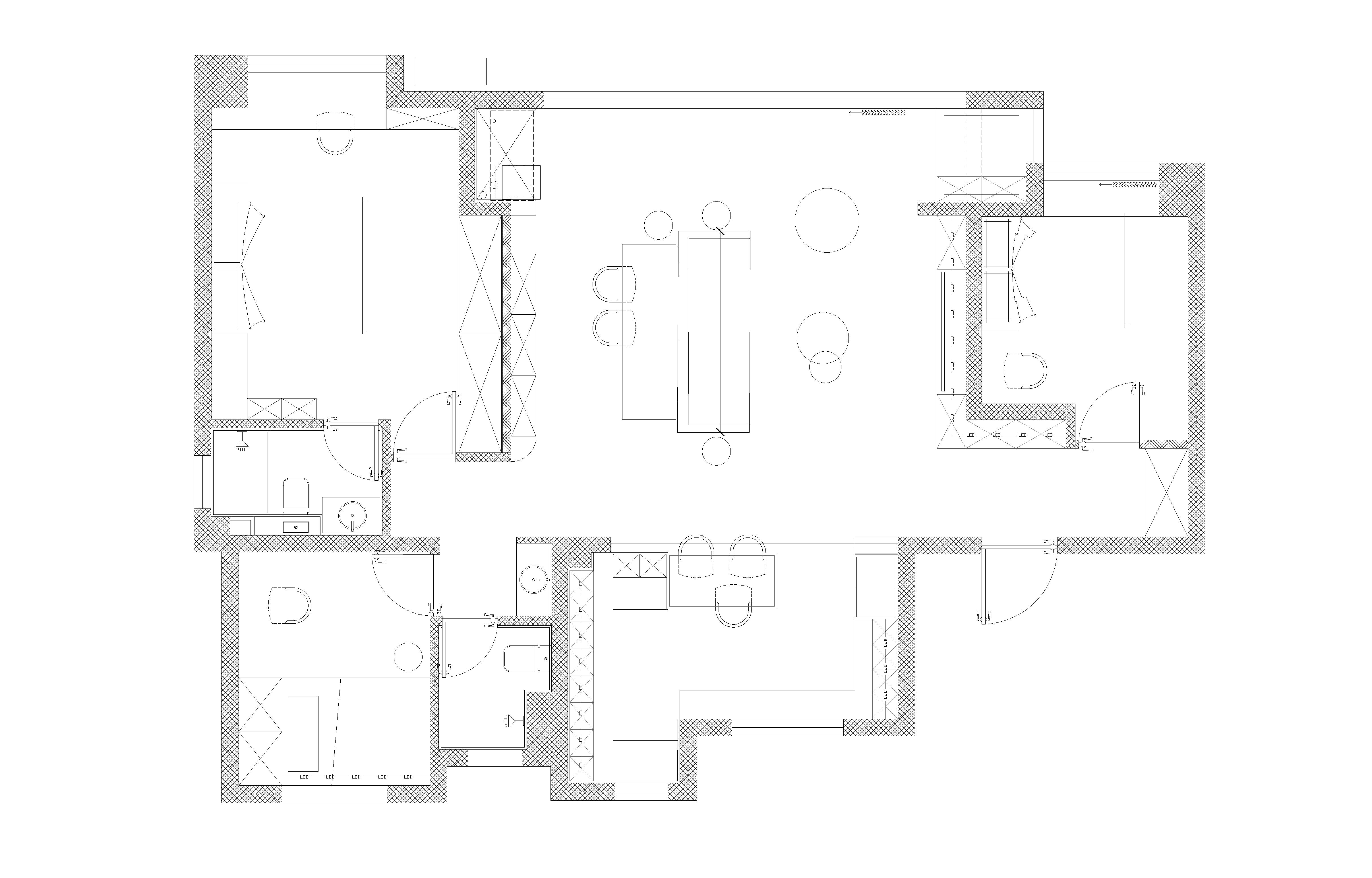 空间布局:原有房屋为四室格局,夫妻两口人居住,我们将其中一个卧室打通划给客厅,增加了公共区域的尺度感,同时设计了餐厨一体,开放式厨房,更加符合居主人的生活习惯。