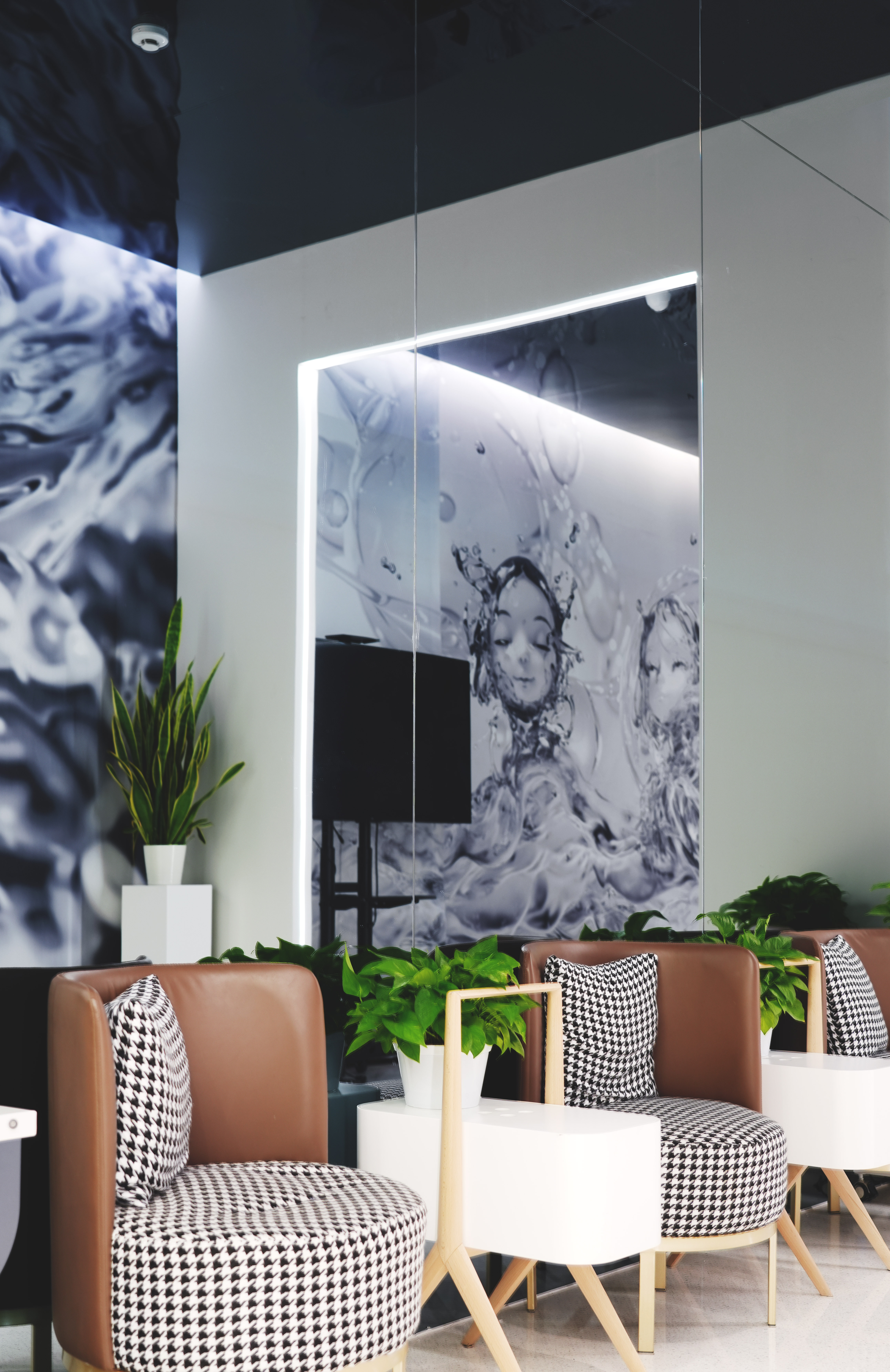 空间意境:空间以奶油白色为主调,营造温馨氛围。弧形与流线型造型贯穿其中,搭配柔和灯光,契合女性心理。镜面反射拓展视野,铂晶元素增添奢华感,AI 艺术墙画与仿真绢花交织出艺术之美,独特的环境风格吸引众多女性前来打卡,开创了医美空间的艺术新风尚。