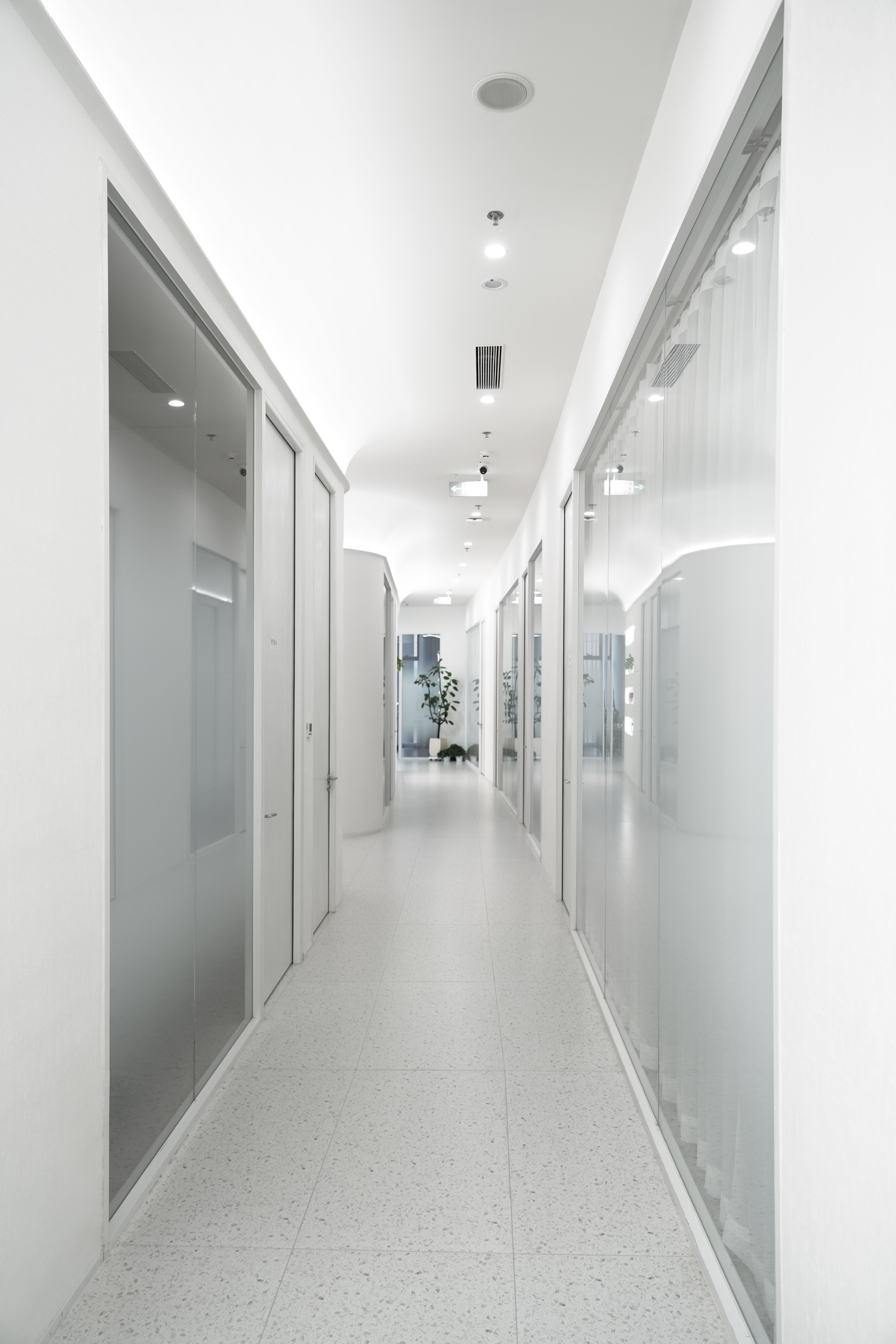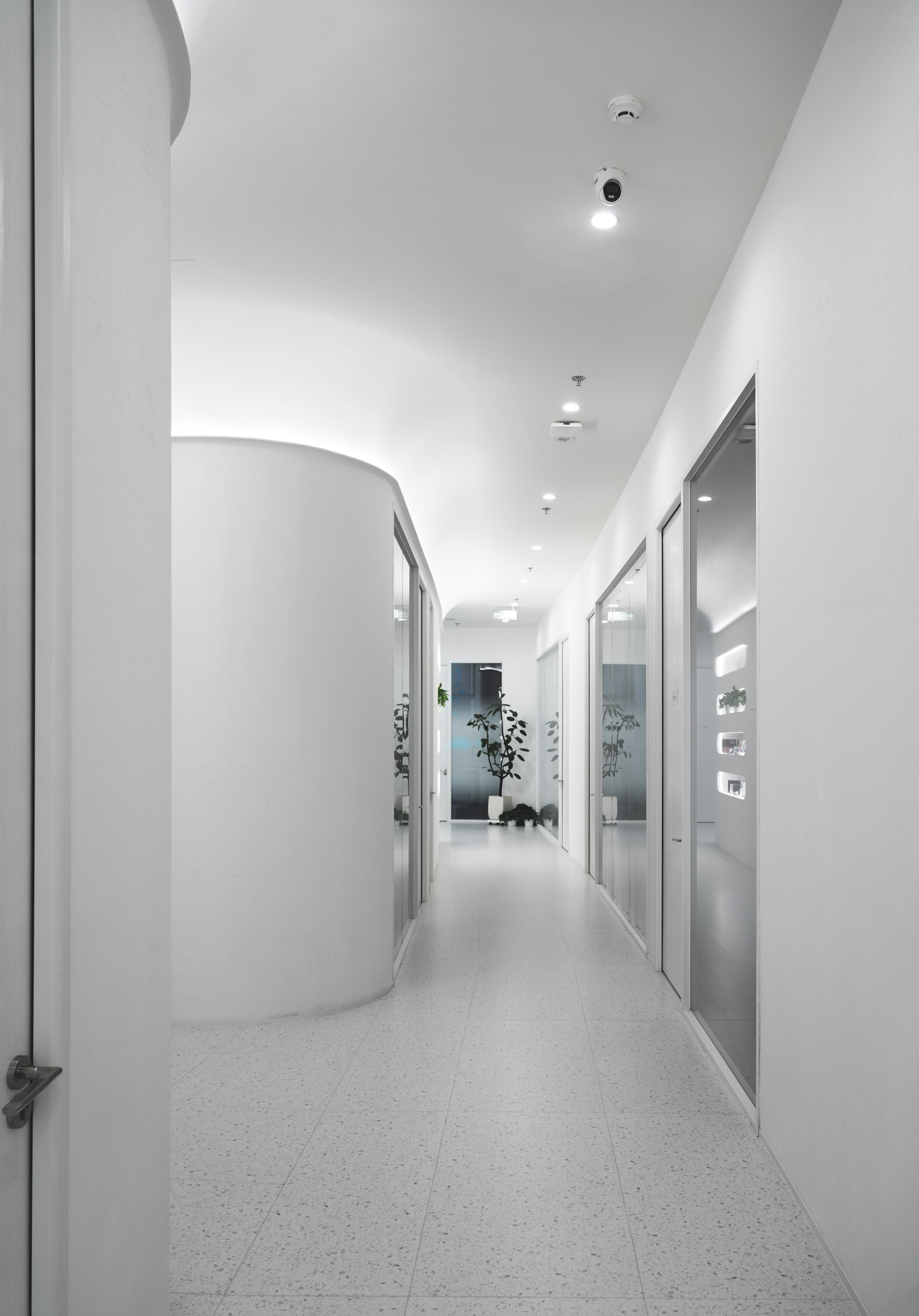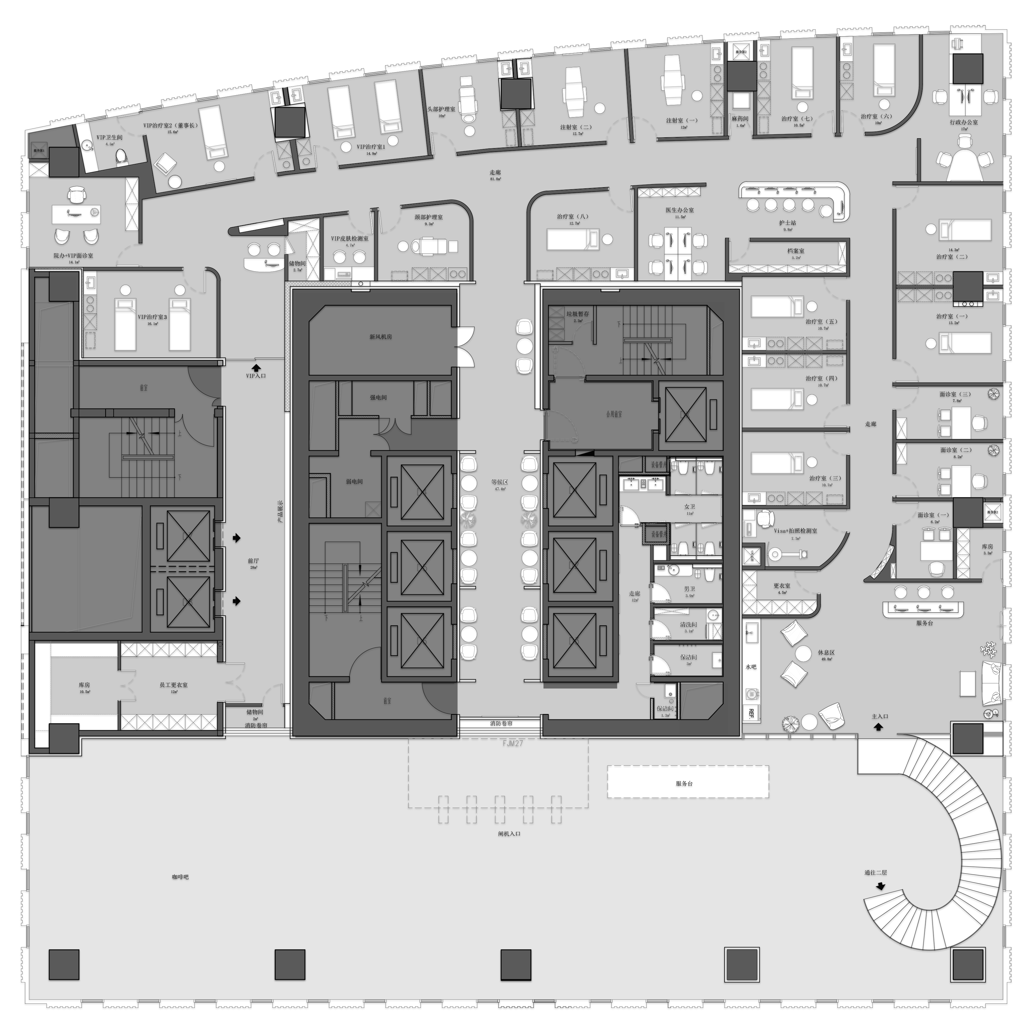 空间布局:在空间布局上,该医美空间展现出诸多创新亮点。整体采用弧形与流线型设计进行区域划分,既保证了各功能区的独立性,又使空间连贯流畅,极具美感。动线上,普通客人的旋转楼梯与 vip 客人的电梯分离,提升了服务的针对性与私密性。全透明悬浮白色圆形转梯作为视觉焦点,彰显独特品味。中心 3.6 米高走廊开阔大气,两侧治疗室布局规整。流线型嵌入式镜面展橱巧妙利用空间,增加了展示功能与空间层次感。vip 治疗室靠近采光优渥的外幕墙,营造舒适就医环境。同时,同层上排水及两个治疗区共用污水提升泵的设计,合理规划了管道走向,优化了空间利用,确保了高效排水,是实用性与创新性的完美结合。
