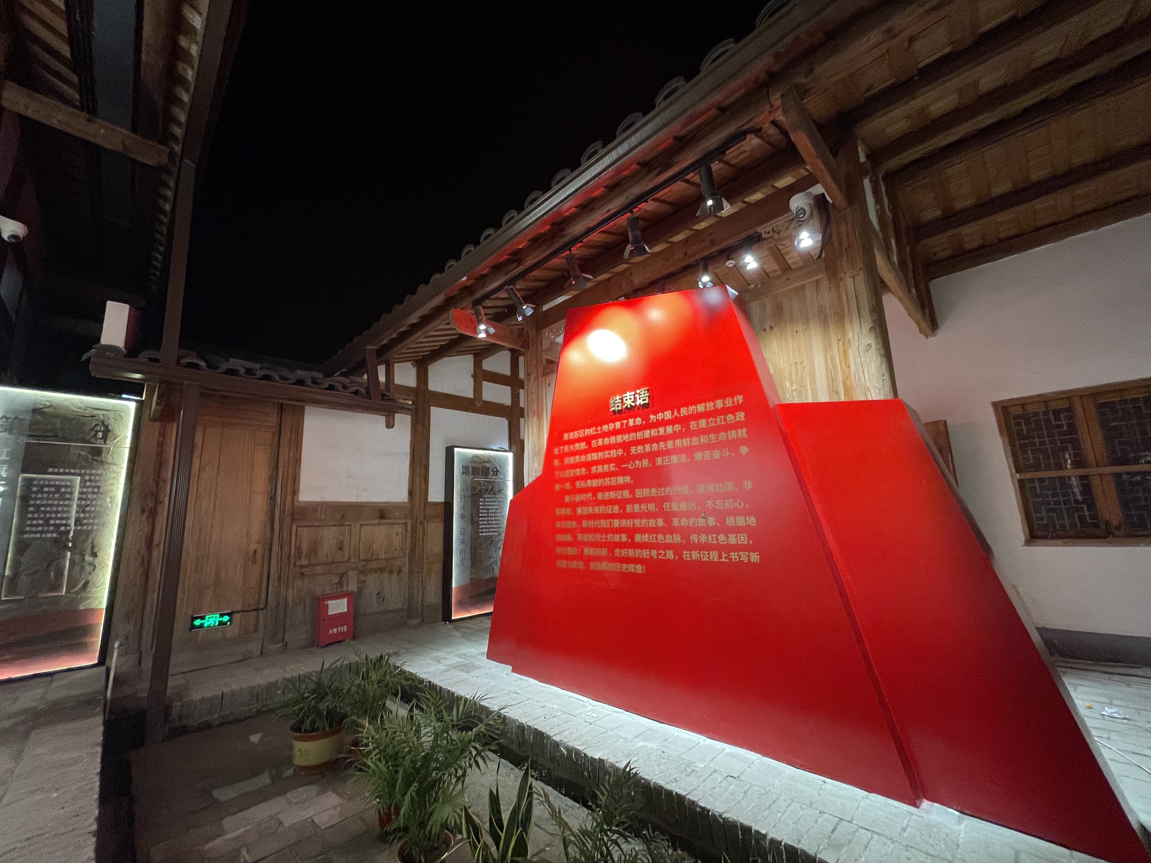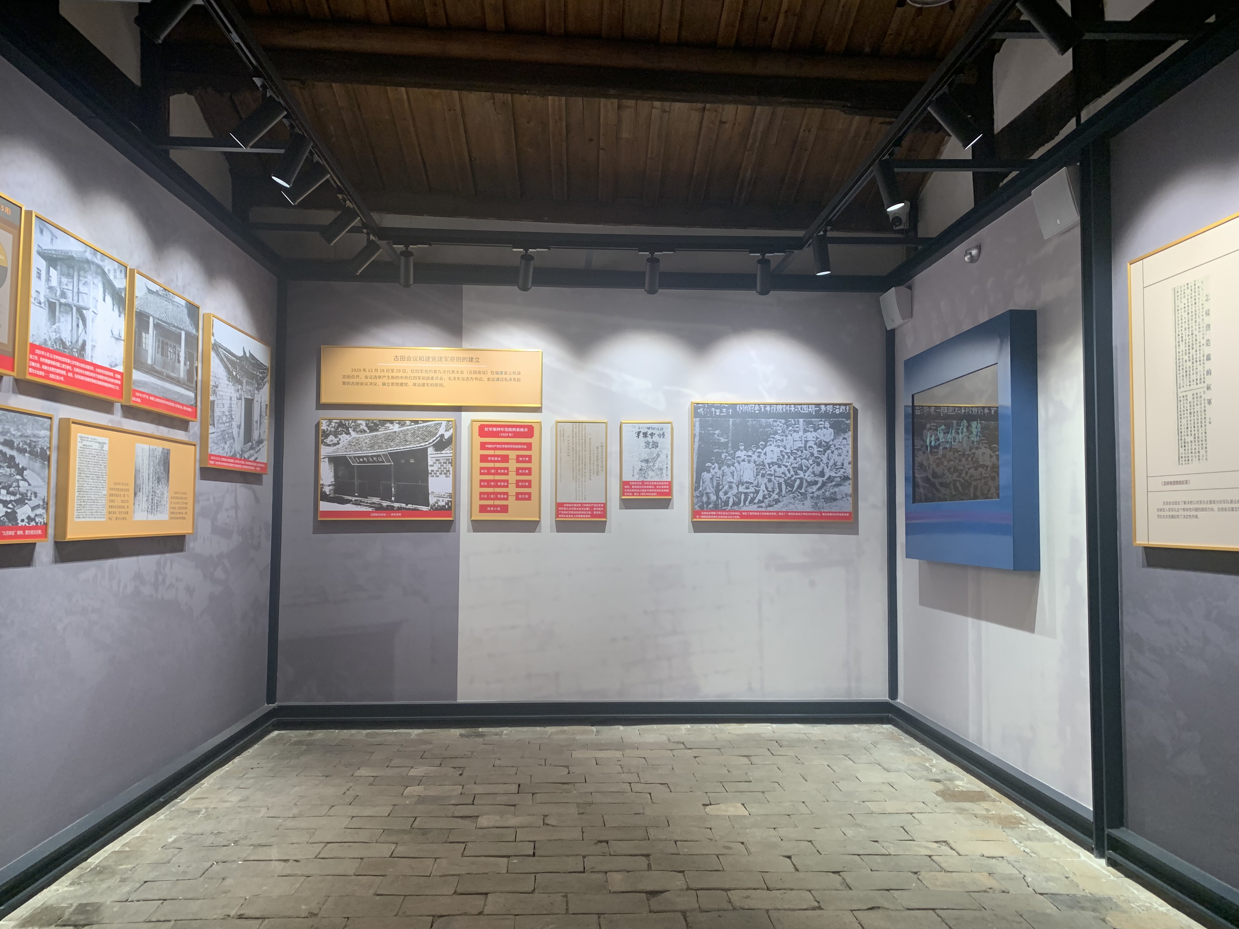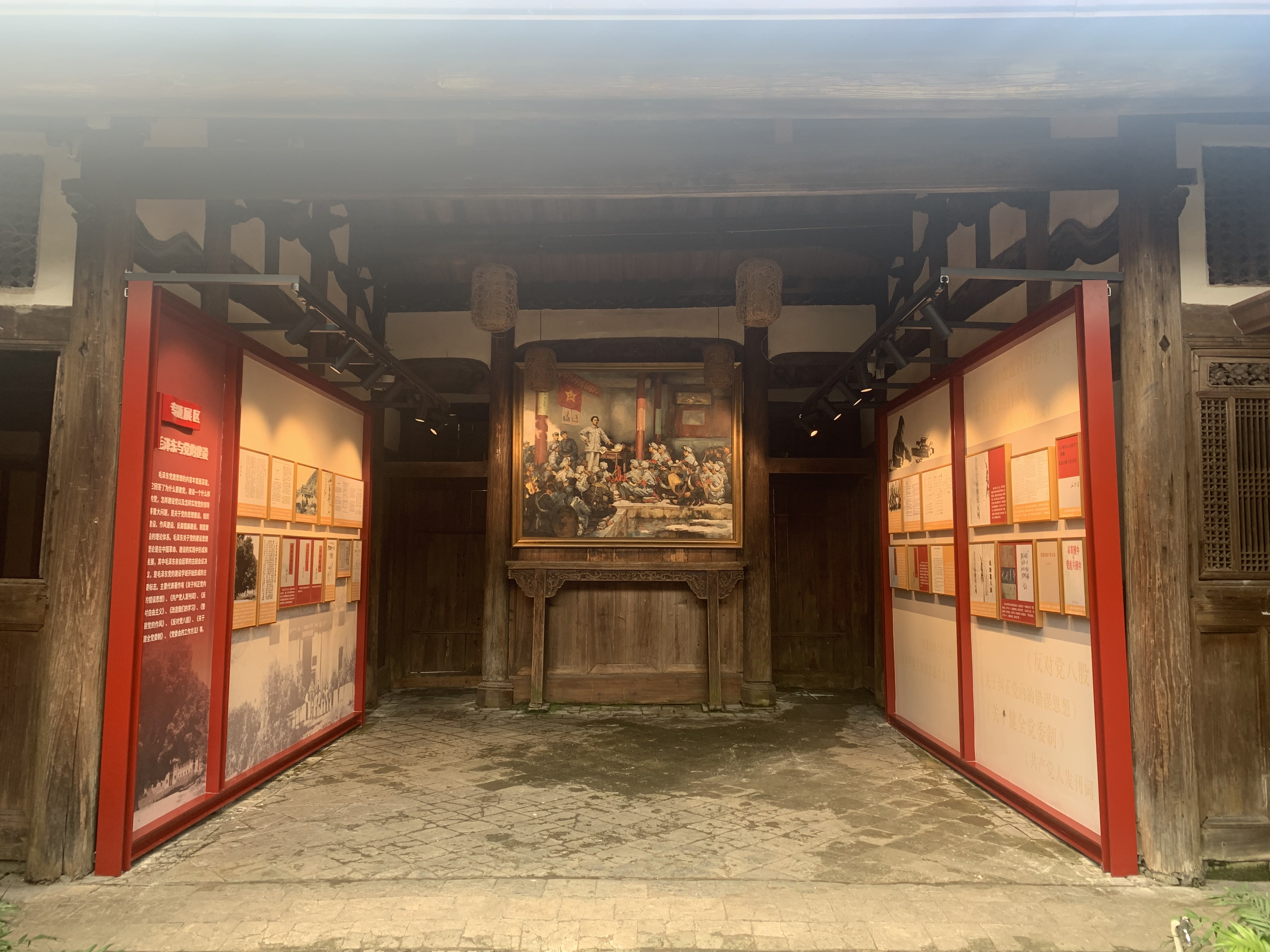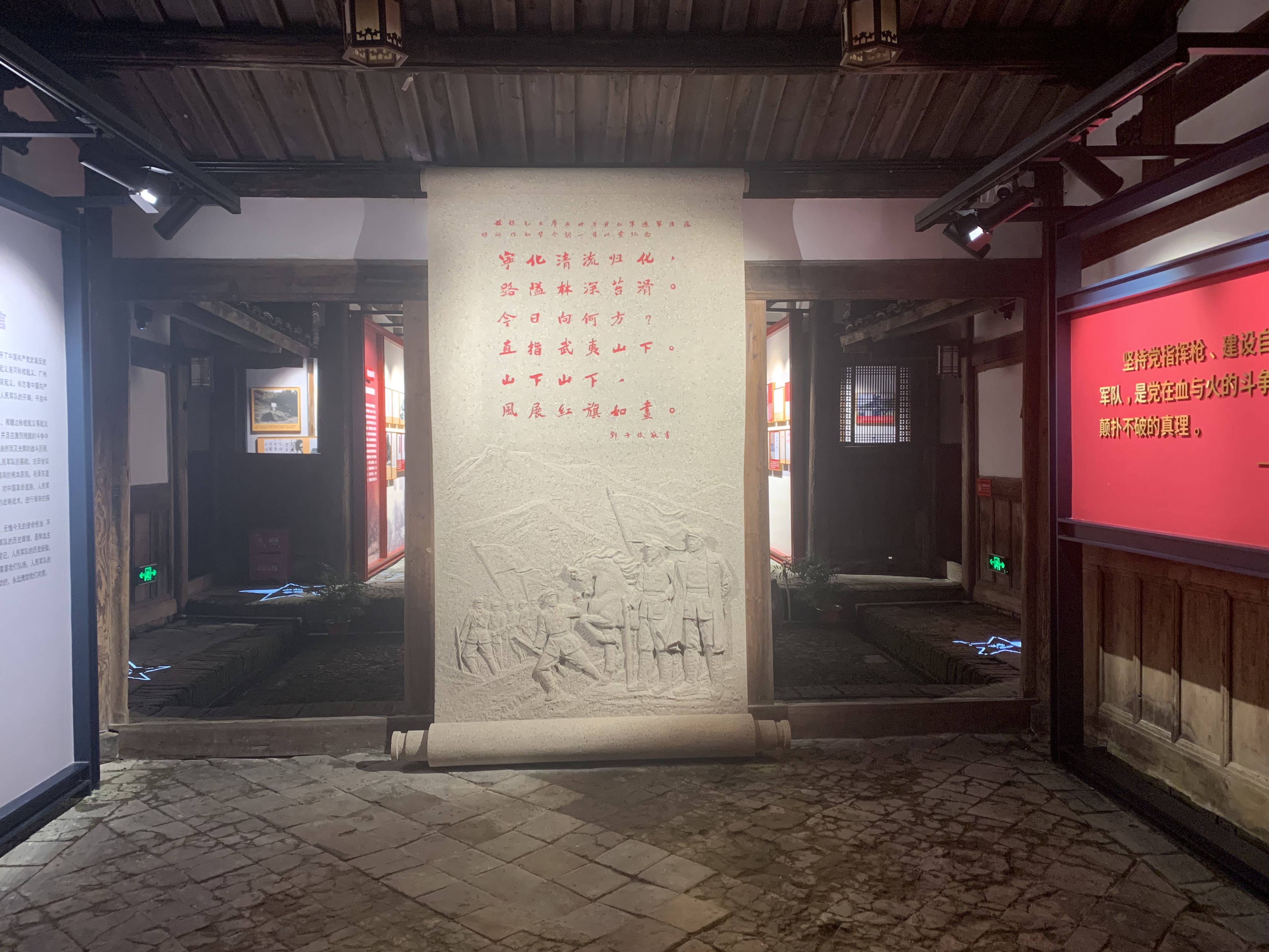 空间意境:清流林畲毛泽东旧居位于福建省清流县林窗乡塘掘村,系邱氏祖厝,堂名“治燕第”。始建于清光绪三年,为两进三厅式木构建筑,属于闽西客家较常见的“五凤楼”式民居建筑。占地面积1836平方米。由于项目工期短,且为保护好文保建筑,管内展架需“无火焊接”,导致项目施工进展缓慢。为进一步缩短施工周期,施工人员在材料进场后便提前安排建筑材料的摆放和规划,并对展架进行二次优化,在保护文物建筑的基础上,解决了定制时间长,安装时间久等问题,大幅缩短施工周期。