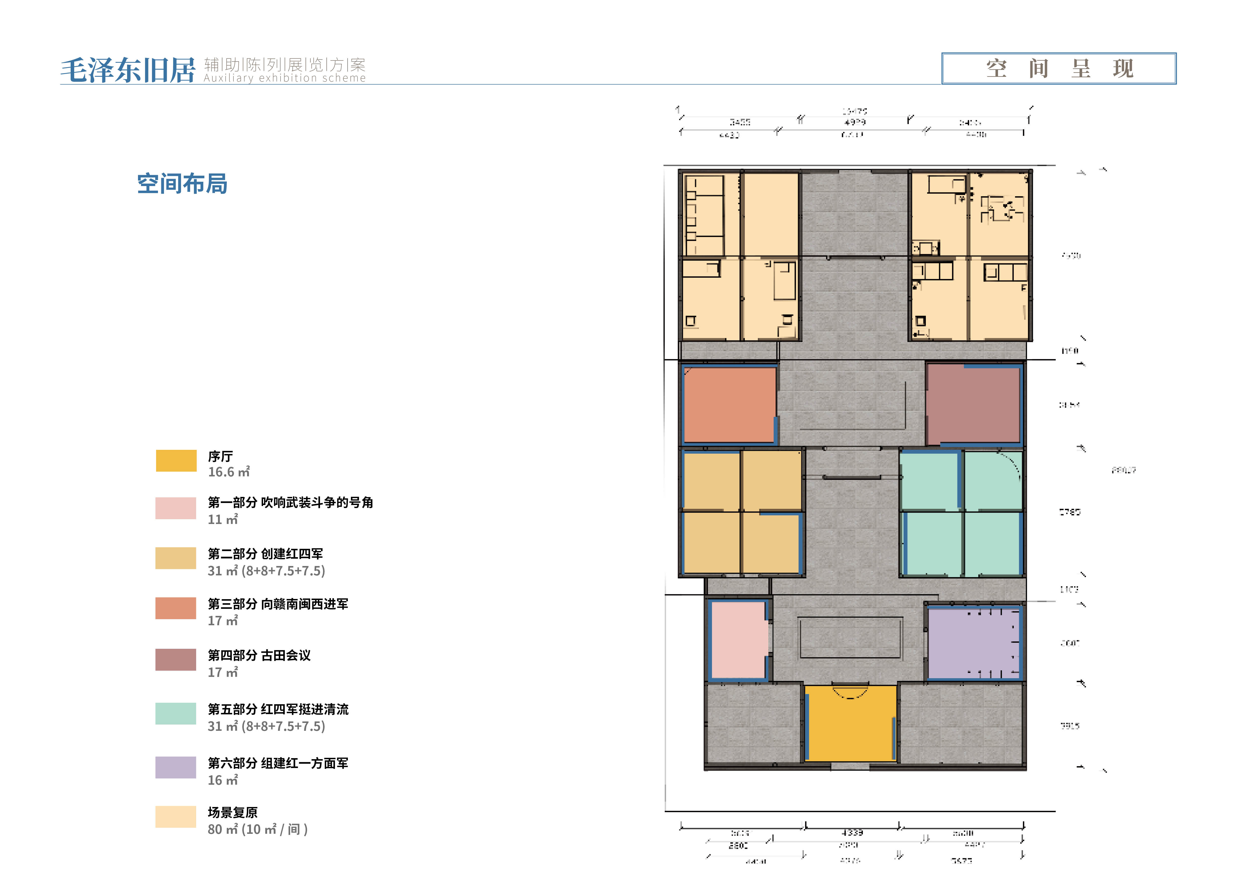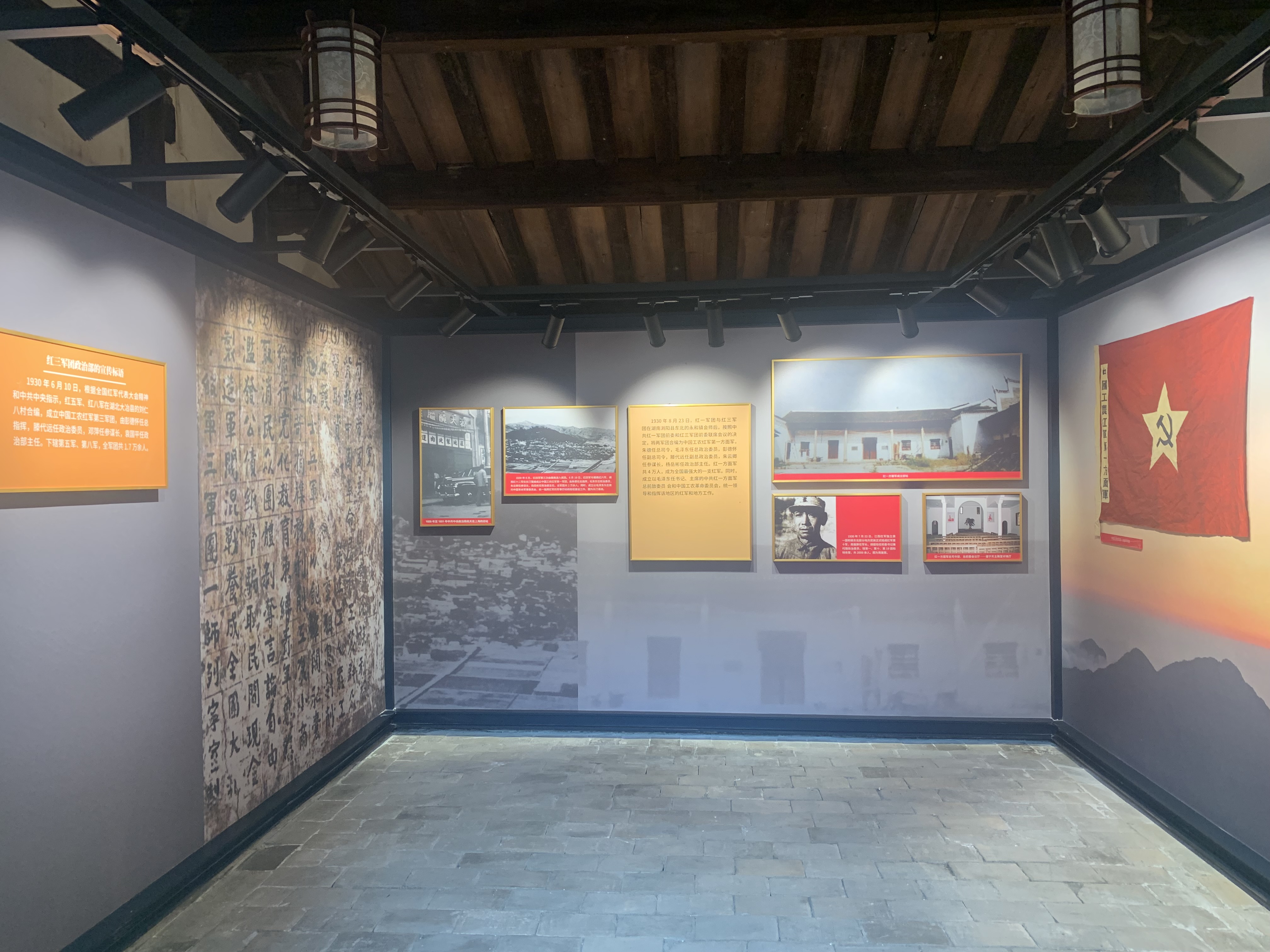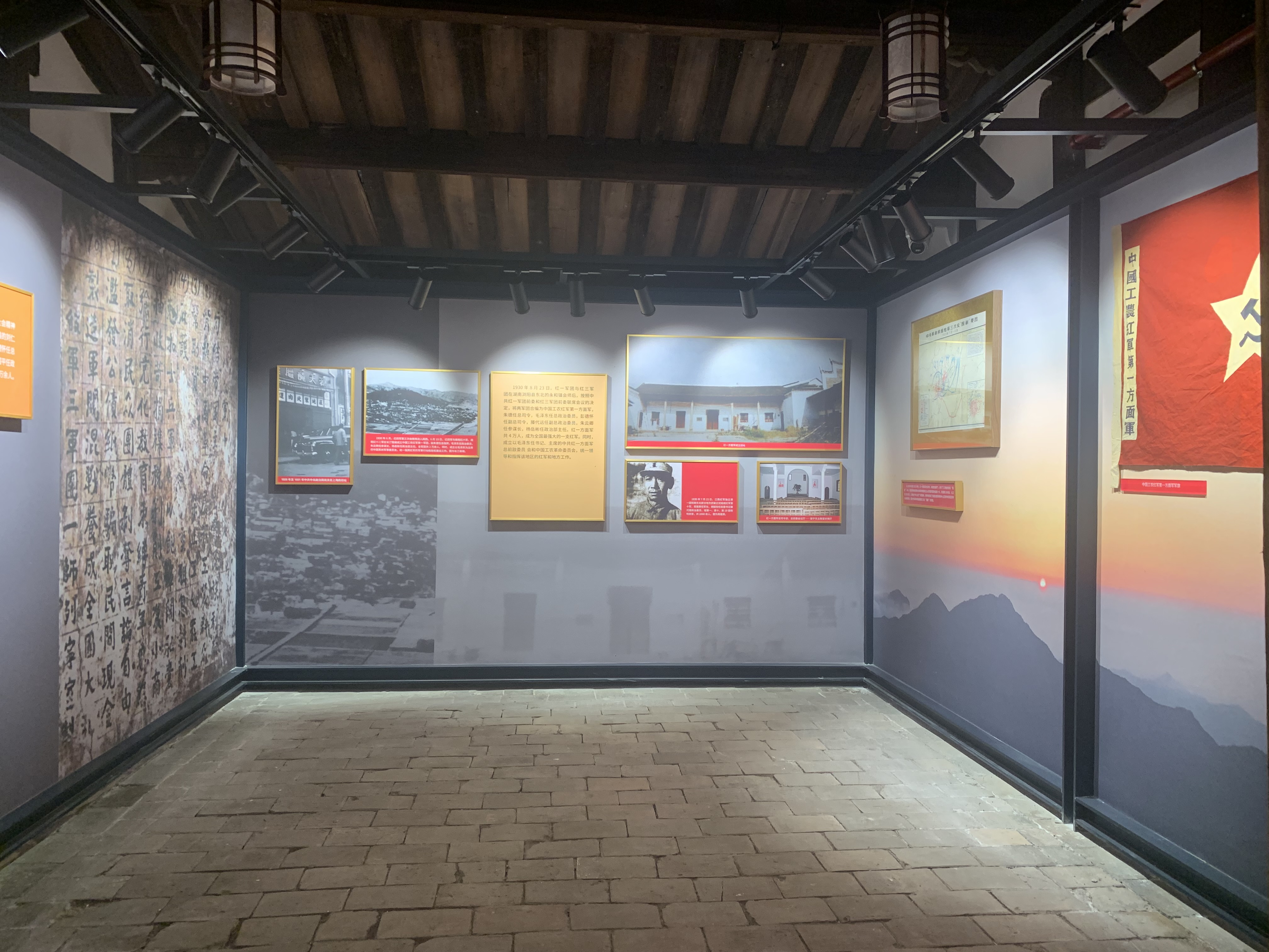 空间布局:在前期策划及设计中,紧紧围绕在进军途中毛泽东描绘的“风展红旗如画”的革命前景。红色文化主题,有效地整合红军的战斗要素,并将其化繁为简呈现出来。直观、简洁、大方色调相互融合,烘托主体,增加展示的视觉体验。提炼出“薪火红”“军装蓝”“曙光黄”“苦色灰”四个主色,并搭配多媒体、艺术品和文物辅助,续写老区新荣光。
