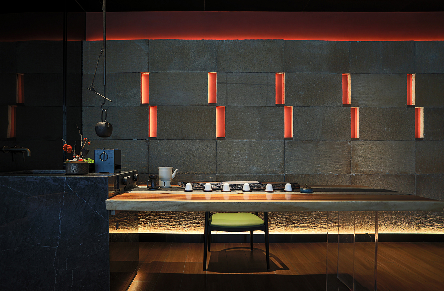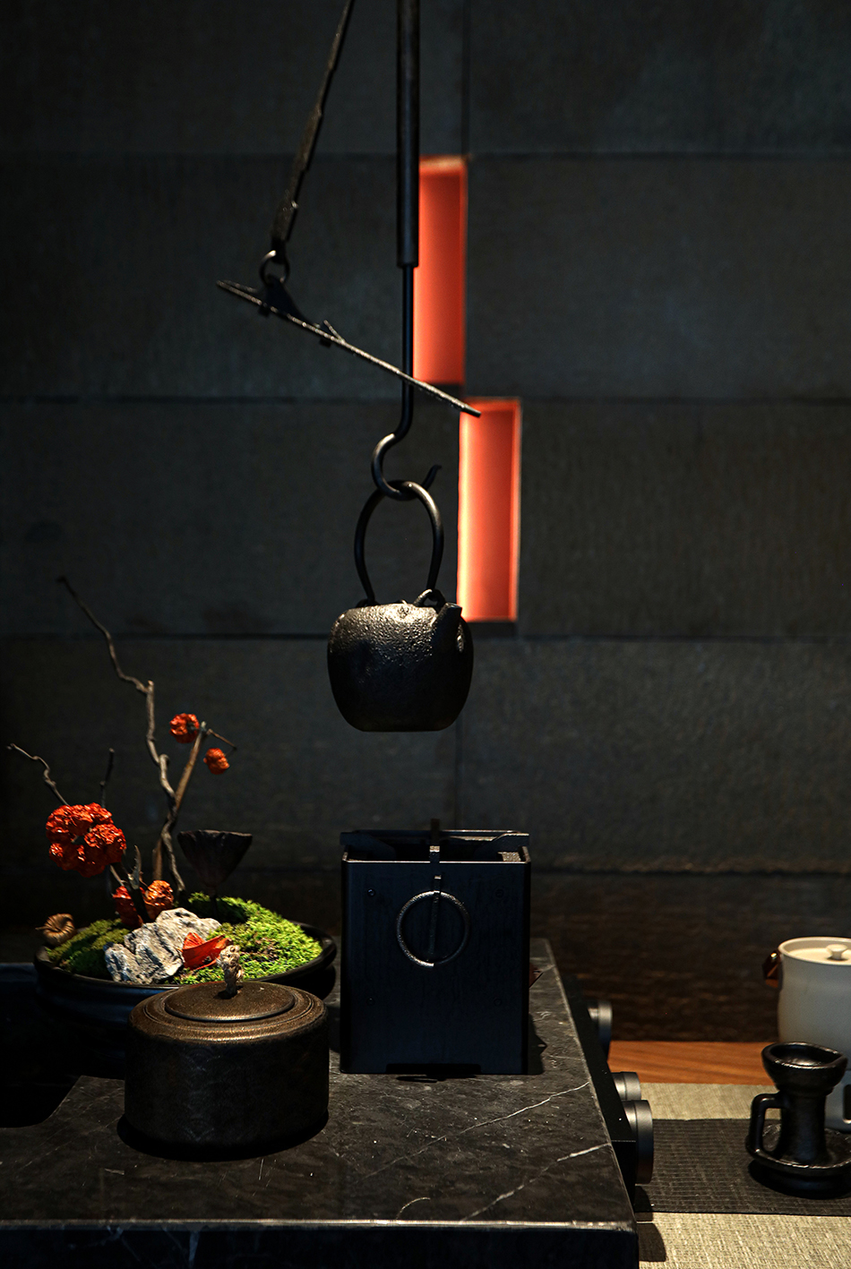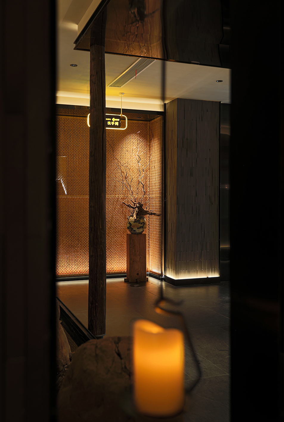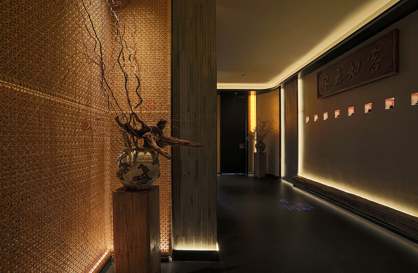 空间内提取有江南符号的元素,如竹编、席编、老木头,老石板等自然材料进行精致化演绎,以写意概括的空间语言构建具有当代性的民俗文化体验感和设计感,营造轻松雅致的氛围。