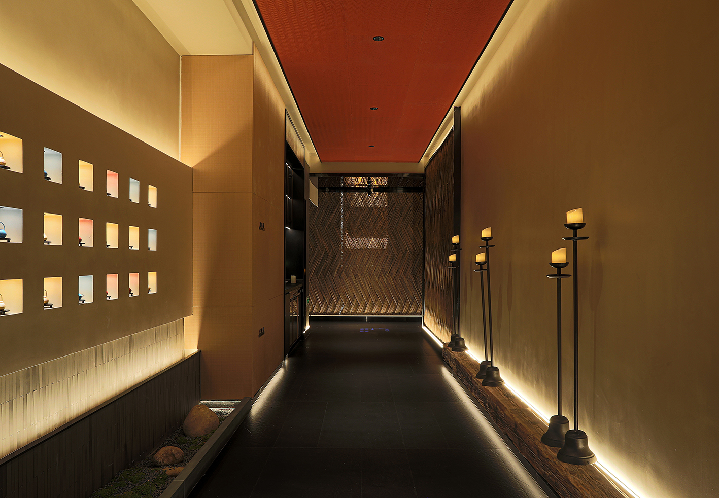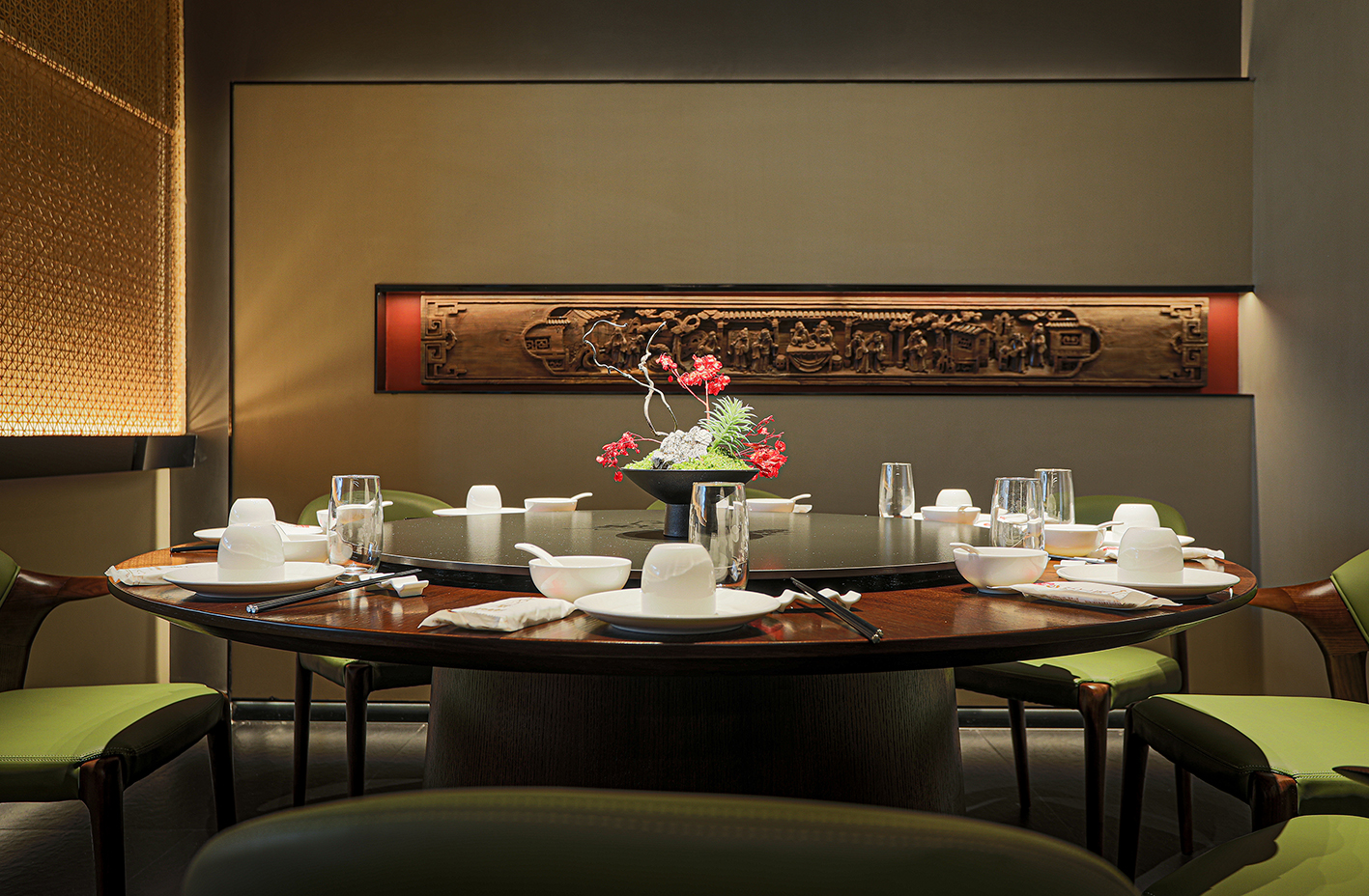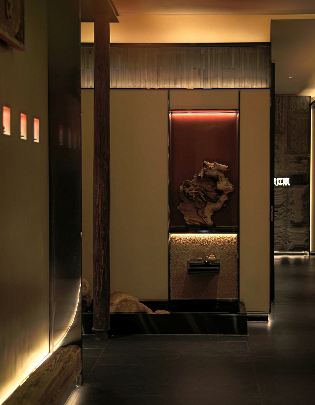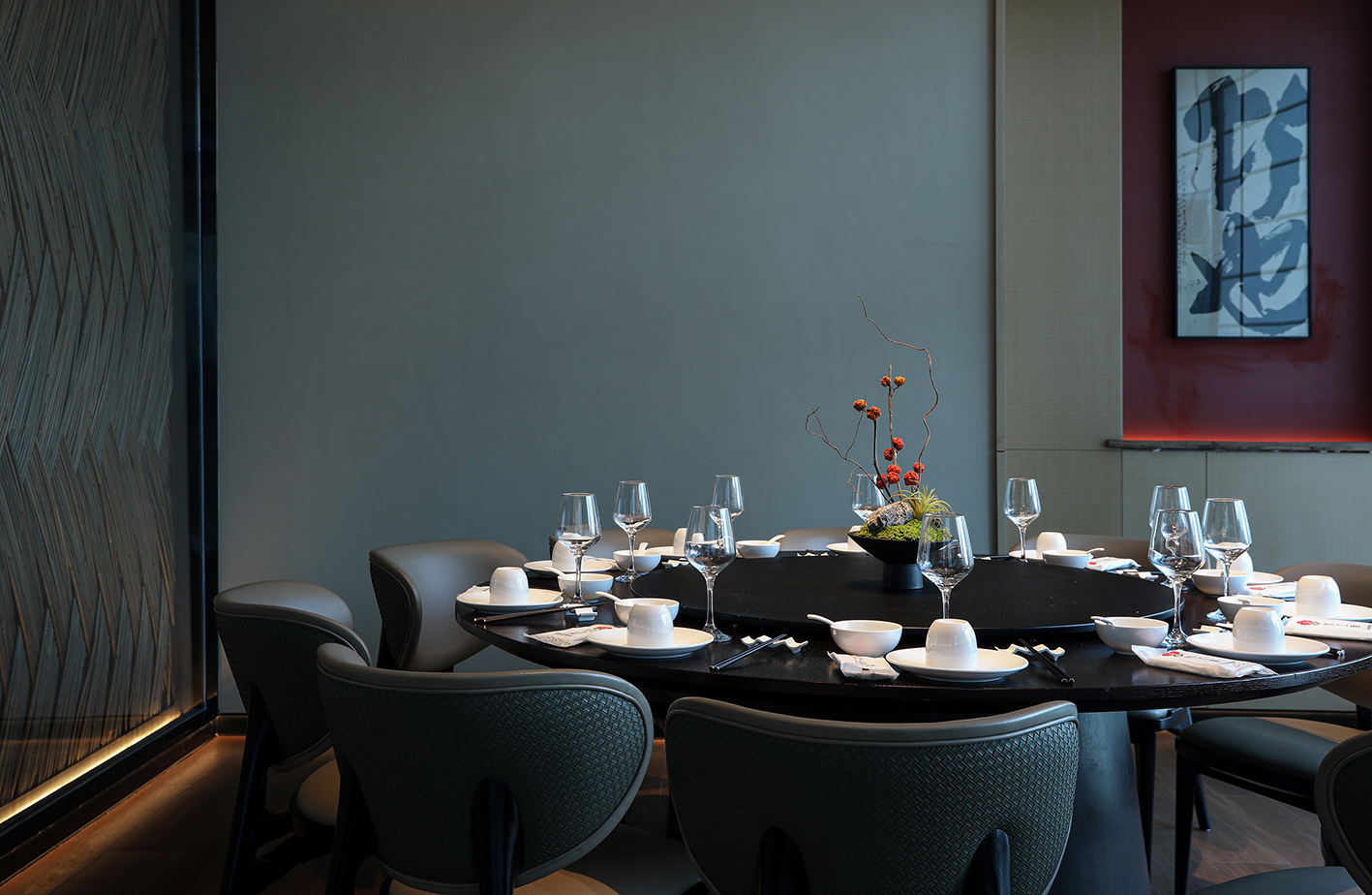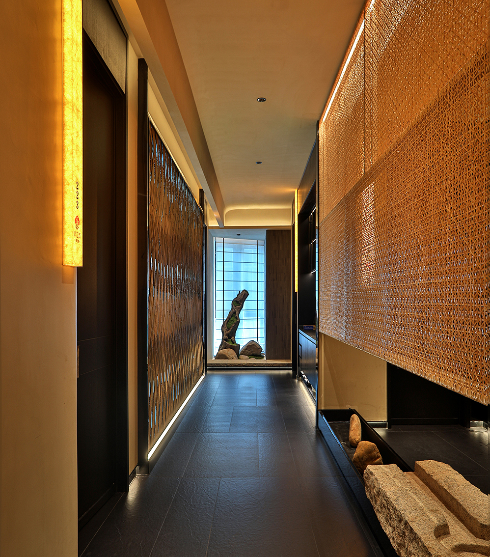 在满足餐饮空间基本功能的基础上采用游廊式的布局手法,移步一景,进入餐厅,一眼看去不见绿瓦红墙,也无落英缤纷,仅有素净空间中深咖木饰与文艺气息,赋予空间精致有内涵的沉稳大气。聚焦于本地品质家宴、轻商务宴请、外地游客、商旅人士打卡需求,餐位设计主要以包房为主,注重打造舒适、雅致、高端的品质格调。