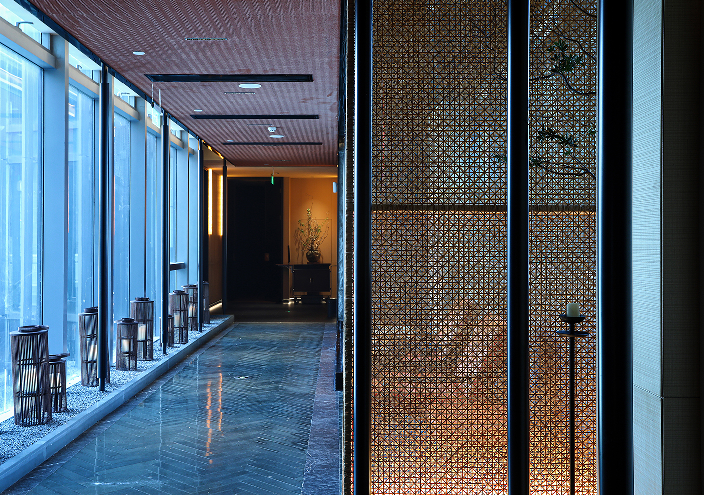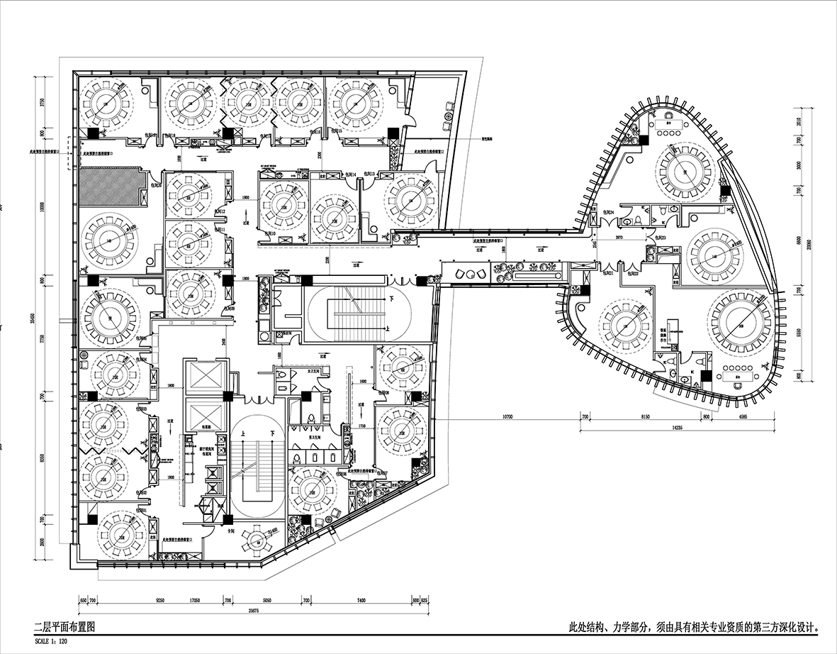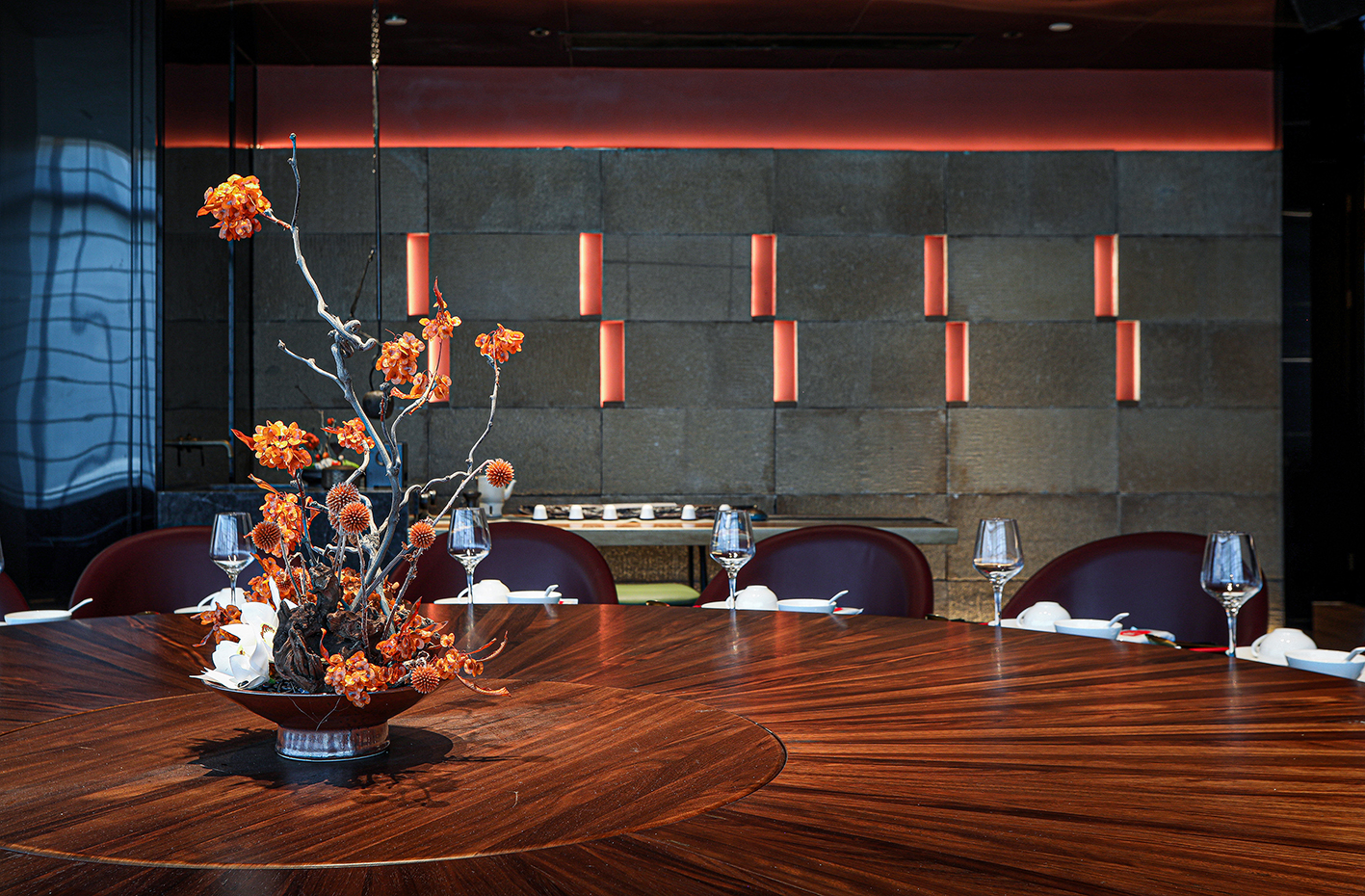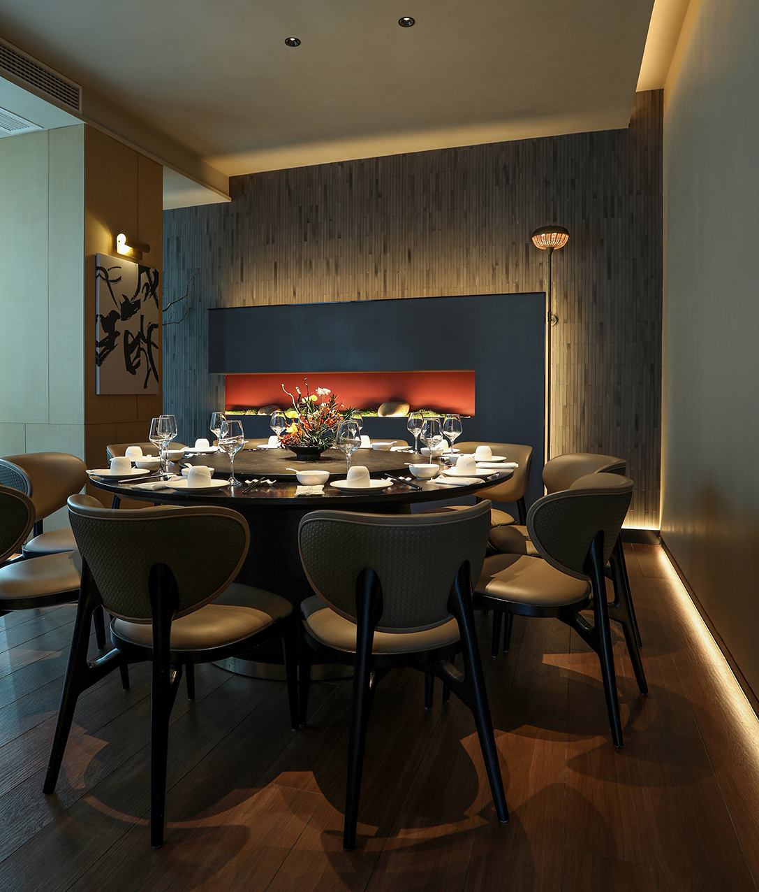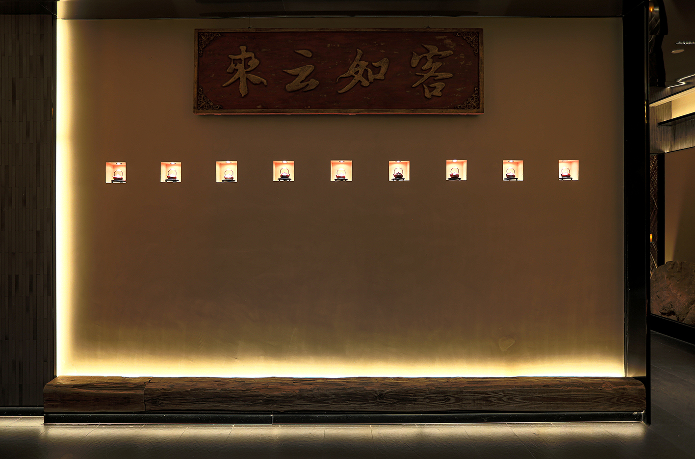 在满足餐饮空间基本功能的基础上采用游廊式的布局手法,移步一景,进入餐厅,一眼看去不见绿瓦红墙,也无落英缤纷,仅有素净空间中深咖木饰与文艺气息,赋予空间精致有内涵的沉稳大气。聚焦于本地品质家宴、轻商务宴请、外地游客、商旅人士打卡需求,餐位设计主要以包房为主,注重打造舒适、雅致、高端的品质格调。