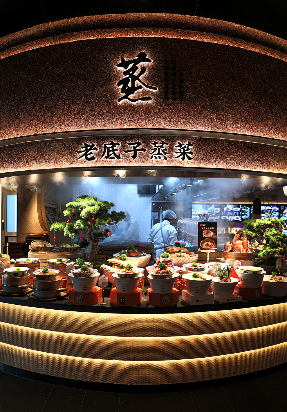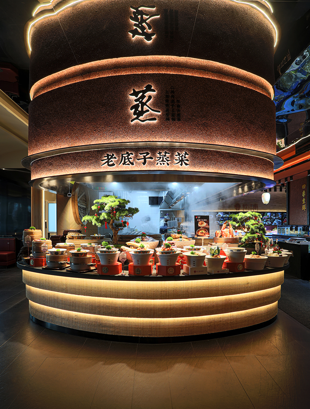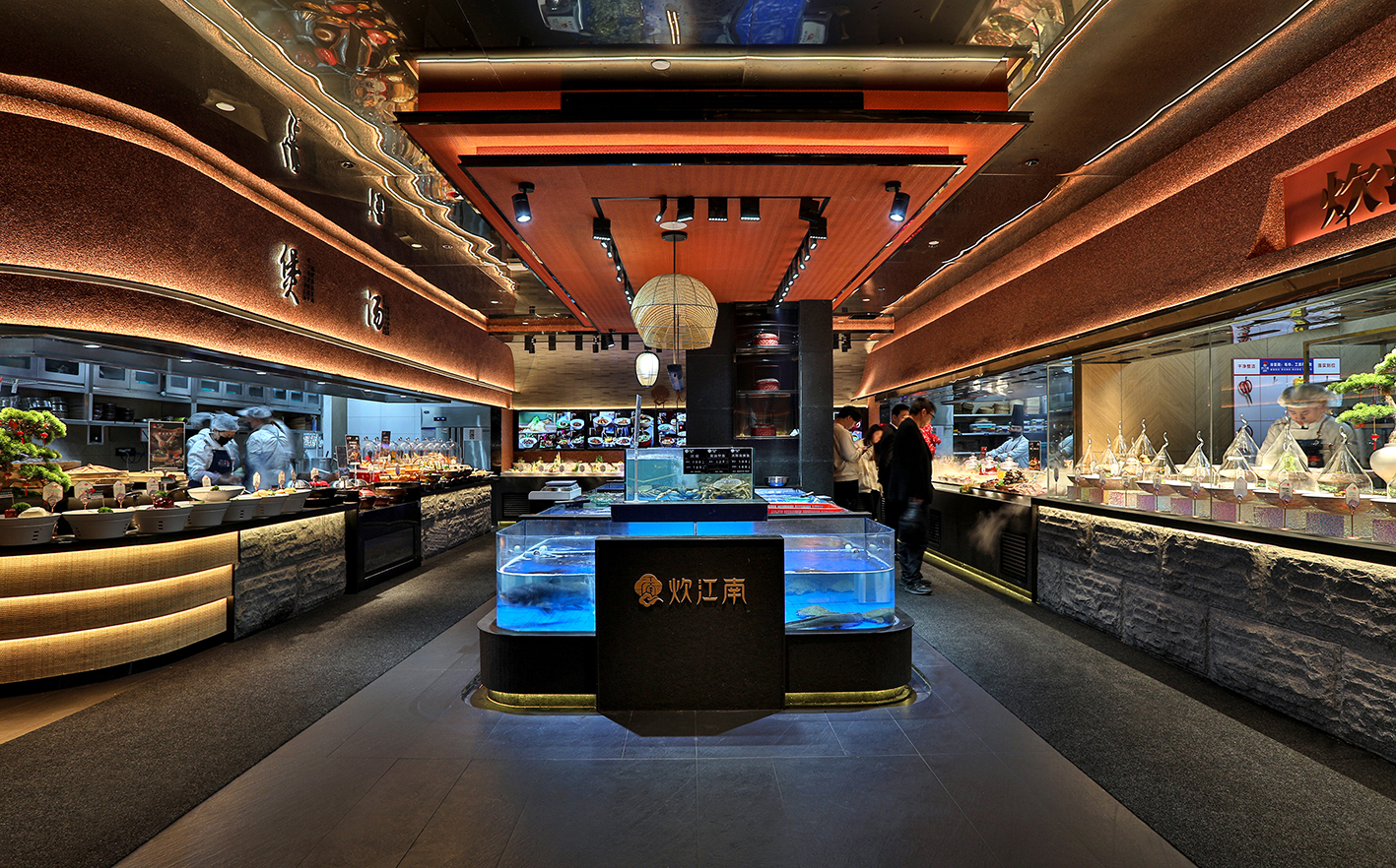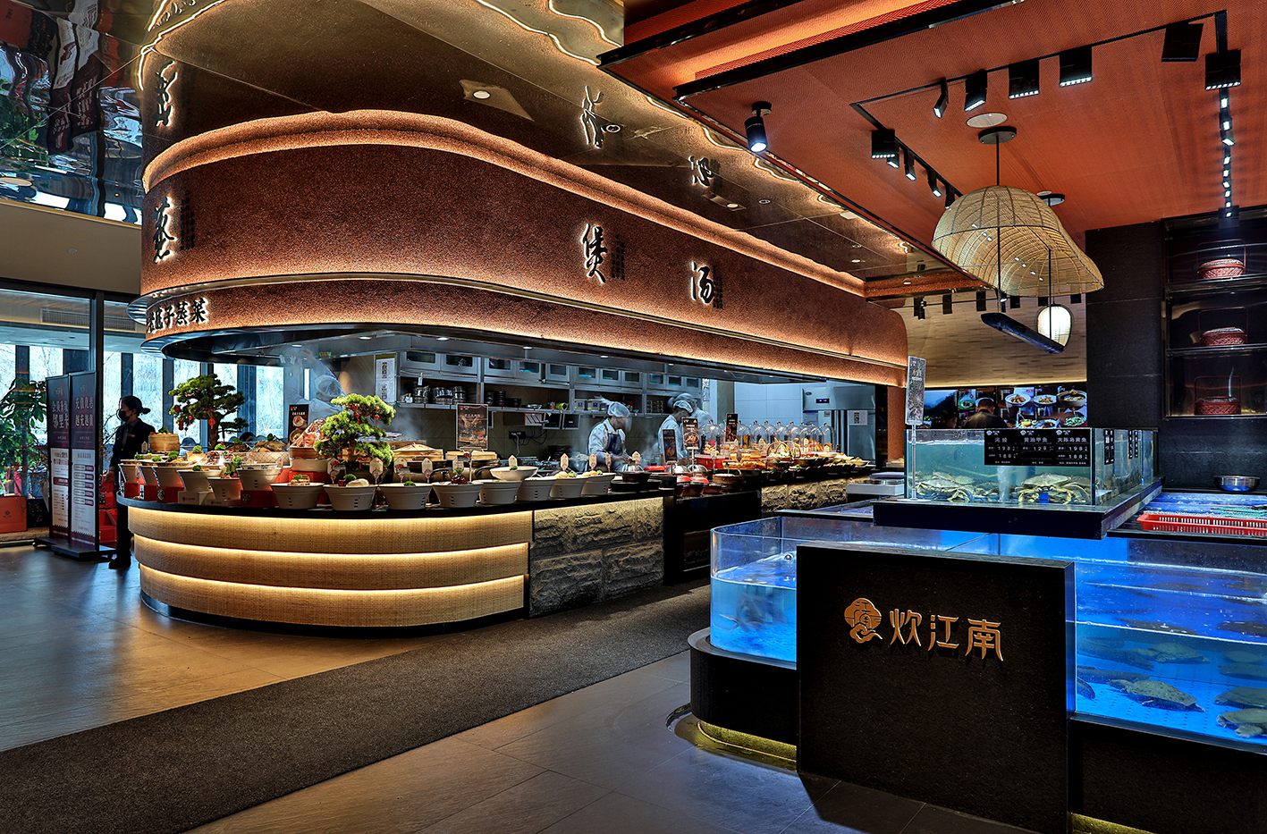餐厅一层整个空间以明档为主,多维度创建精致烟火气的消费体验。让客人充分感受到新鲜感、精致感、特色感,以构建消费生动信任状。
