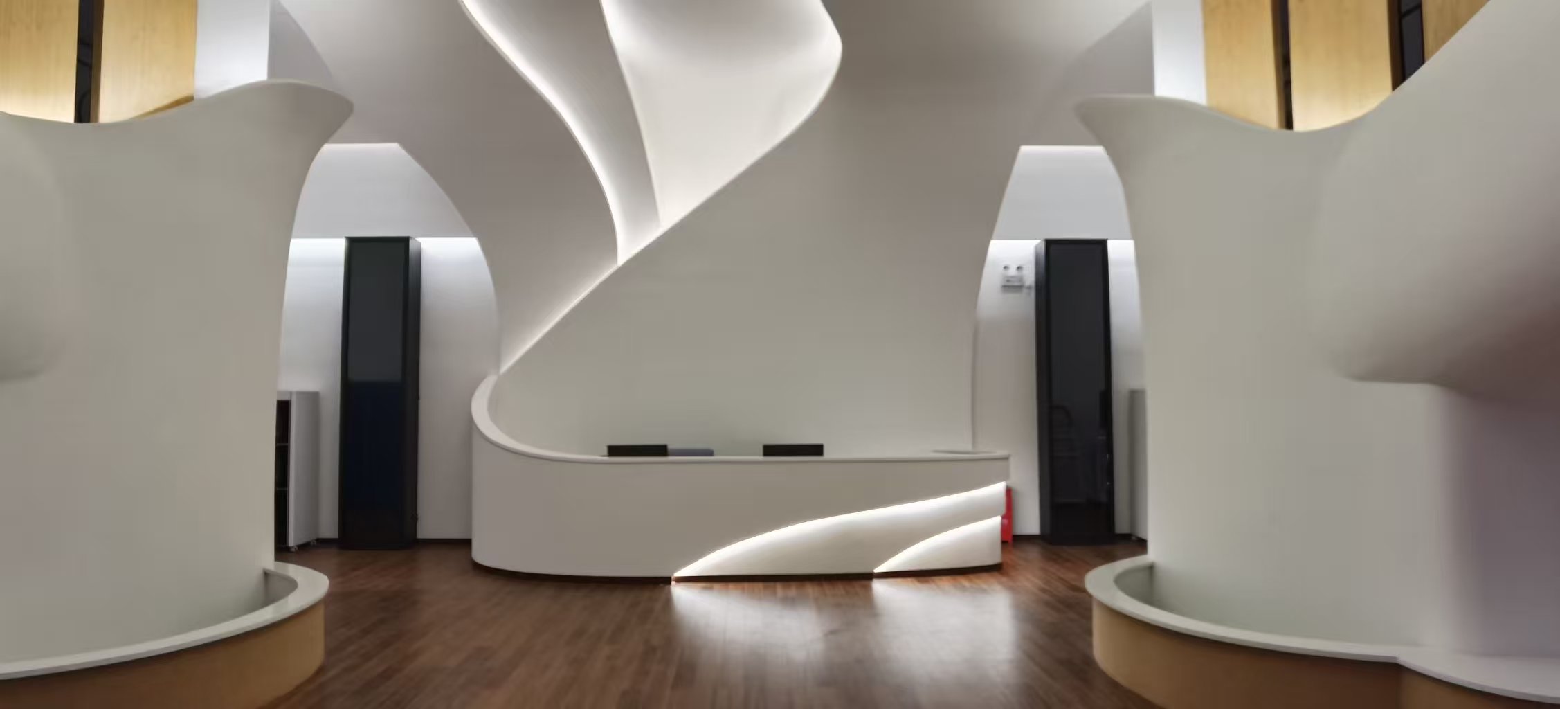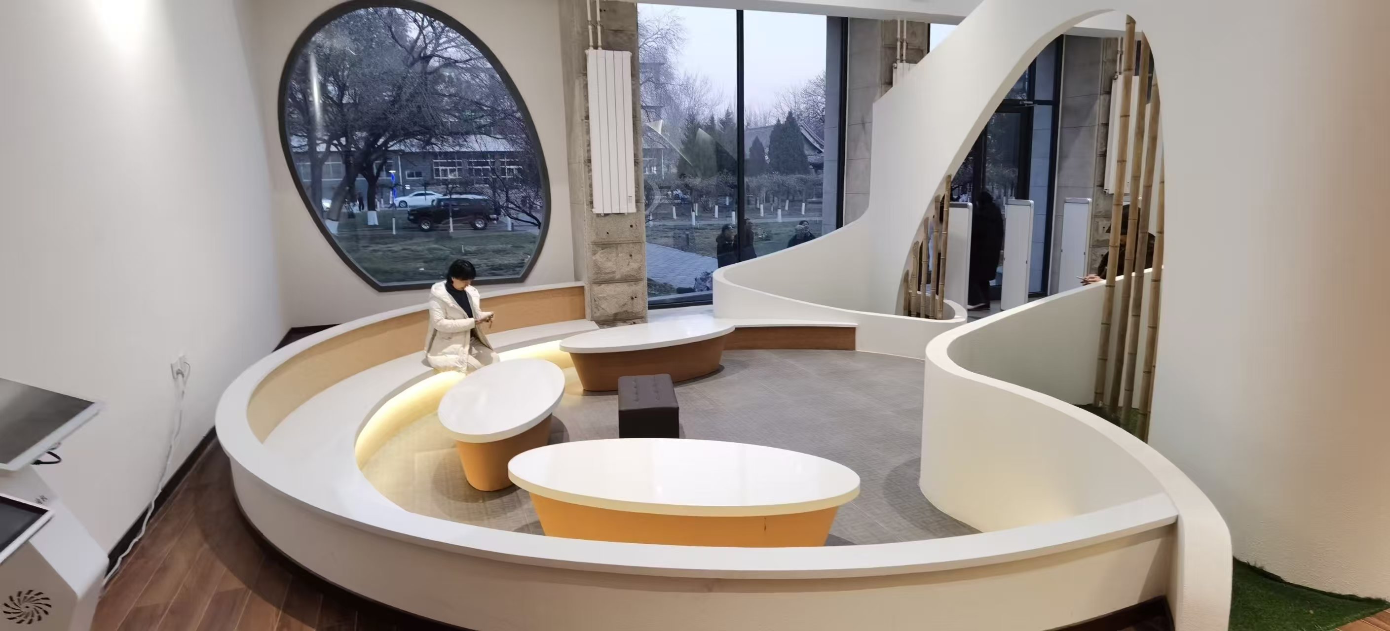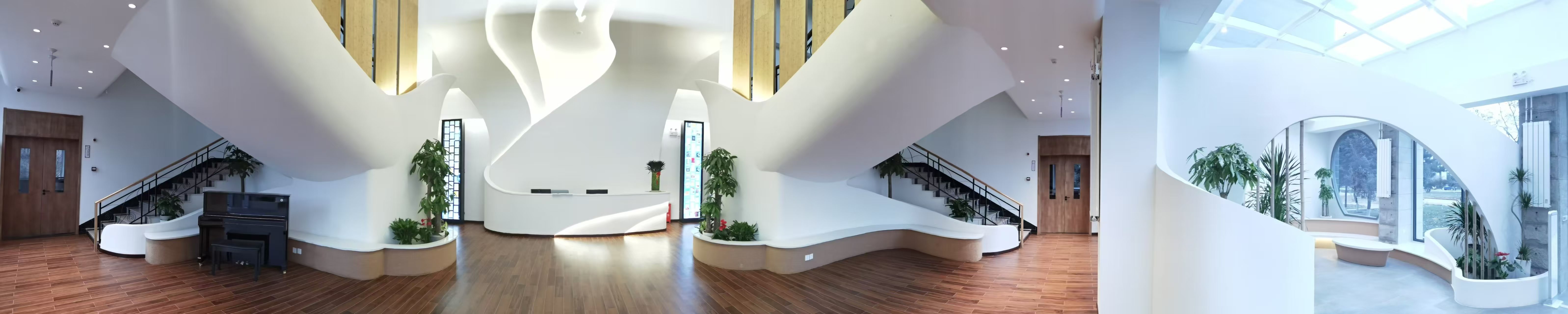 空间布局:图书馆内部空间布局合理,功能分区明确。中央大厅采用开放式设计,以弧形天花板营造出温馨舒适的氛围。大厅两侧设置阅读区和休息区,通过弧形墙壁和书架分隔,形成相对独立的空间。图书馆的上层为藏书区,藏书区采用开放式书架和智能检索系统,方便读者查找书籍。弧形设计不仅美观大方,还能增加空间的层次感和立体感。弧形屋顶和墙壁的设计能够引导自然光线进入室内,营造出柔和、温暖的氛围。