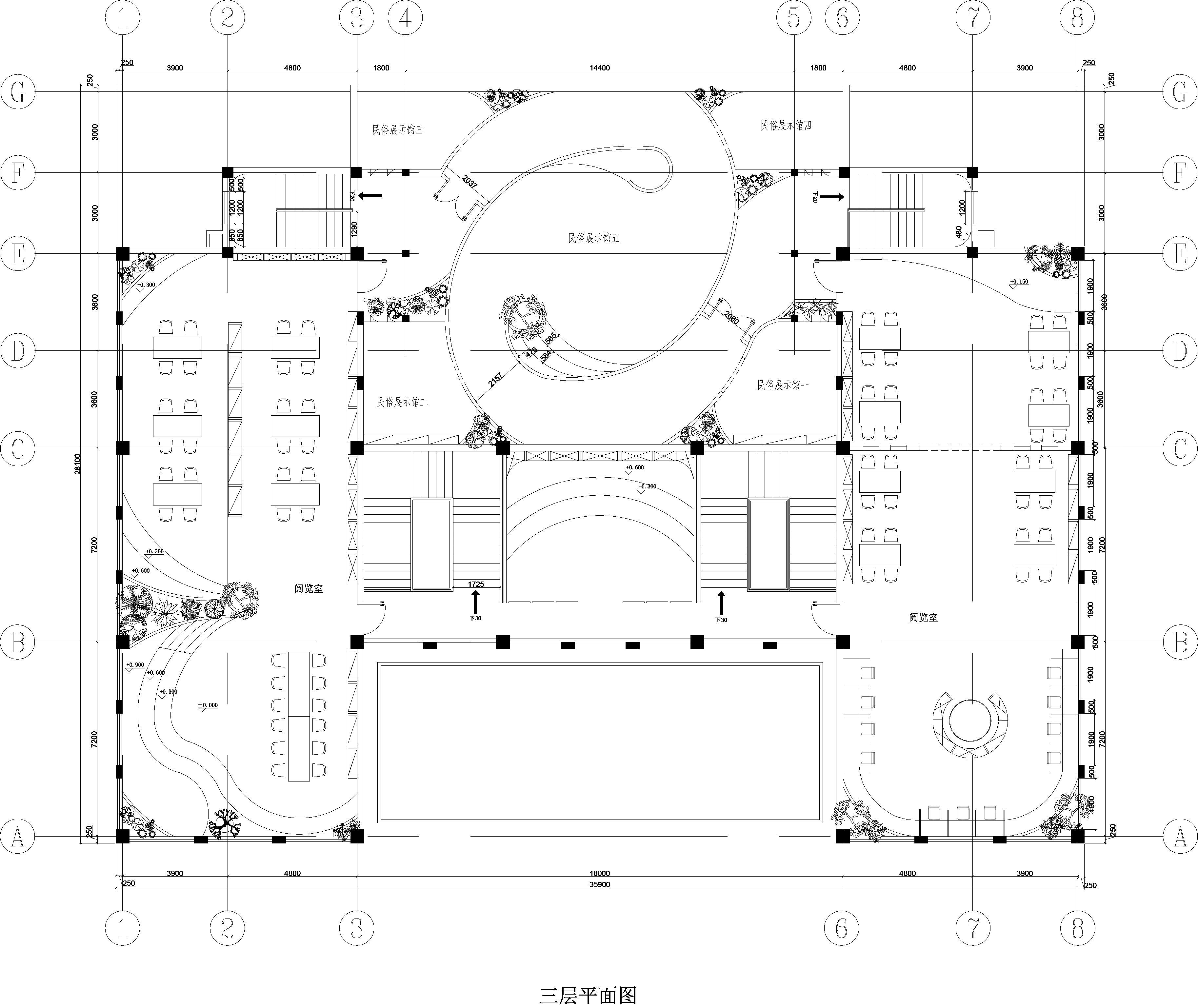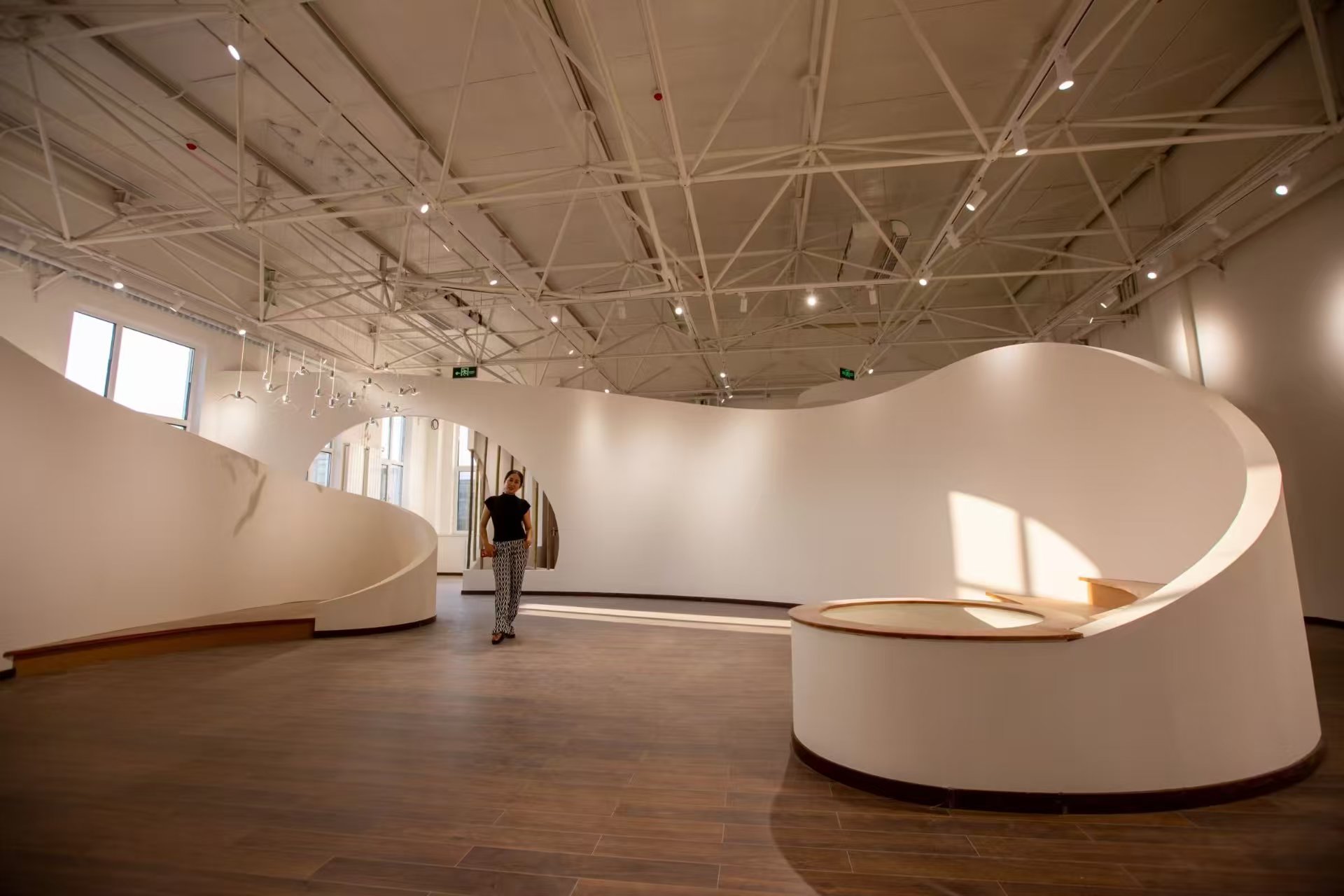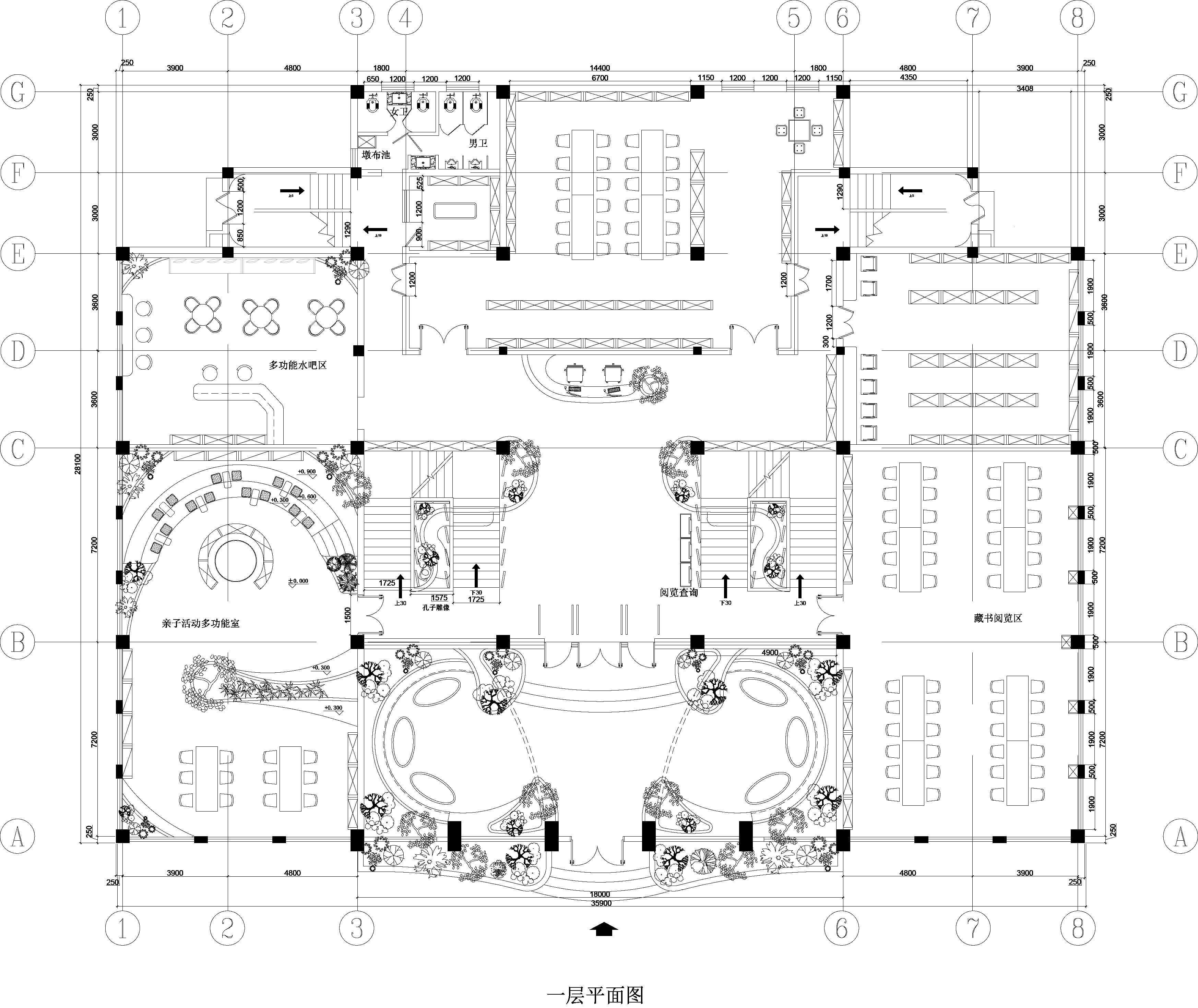 空间布局:图书馆内部空间布局合理,功能分区明确。中央大厅采用开放式设计,以弧形天花板营造出温馨舒适的氛围。大厅两侧设置阅读区和休息区,通过弧形墙壁和书架分隔,形成相对独立的空间。图书馆的上层为藏书区,藏书区采用开放式书架和智能检索系统,方便读者查找书籍。弧形设计不仅美观大方,还能增加空间的层次感和立体感。弧形屋顶和墙壁的设计能够引导自然光线进入室内,营造出柔和、温暖的氛围。